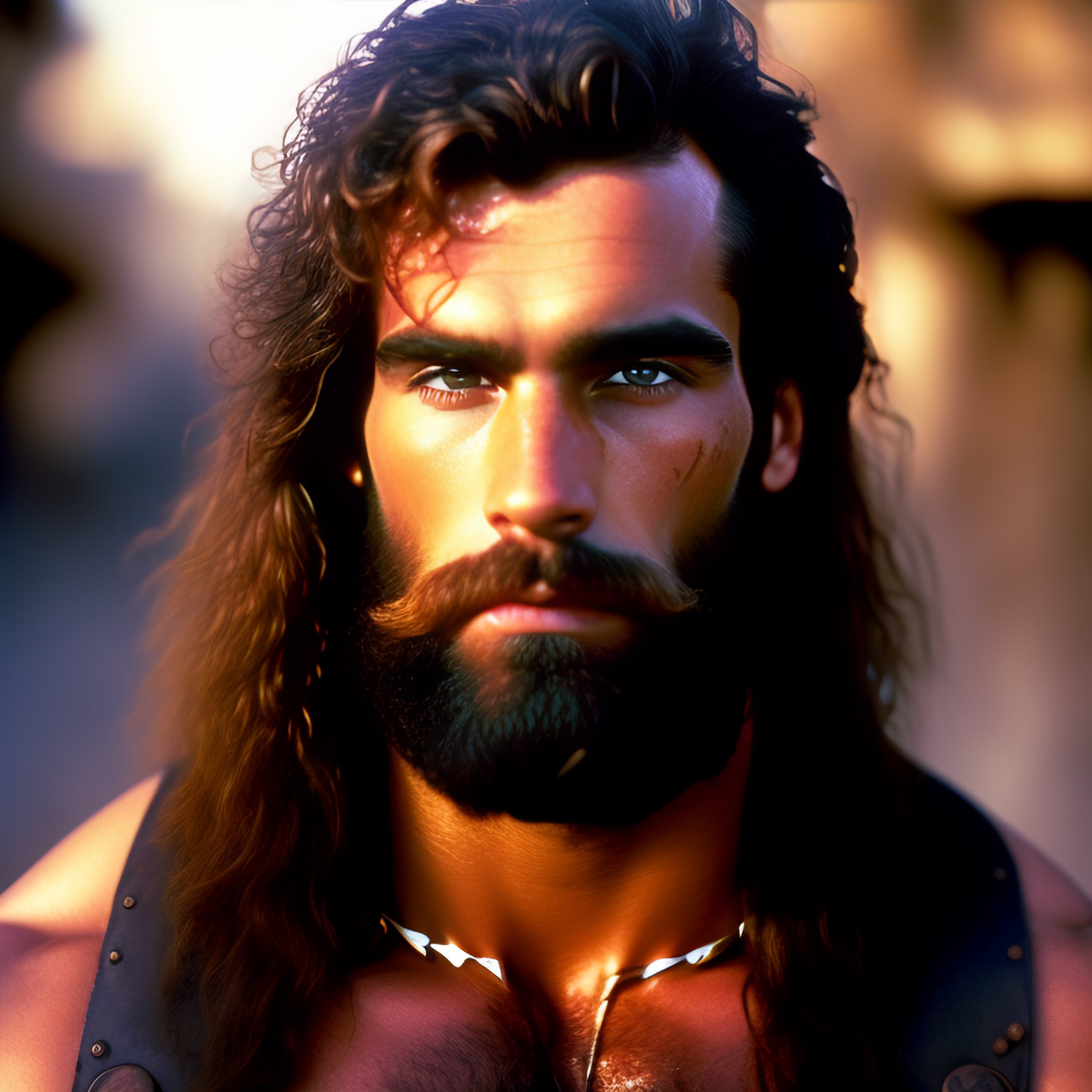 Male barbarian, burly, rugged, messy long curly hair, unkempt beard, black hair, honey brown eyes, close up, happy, blood soaked armor, professional photo, by henri cartier-bresson