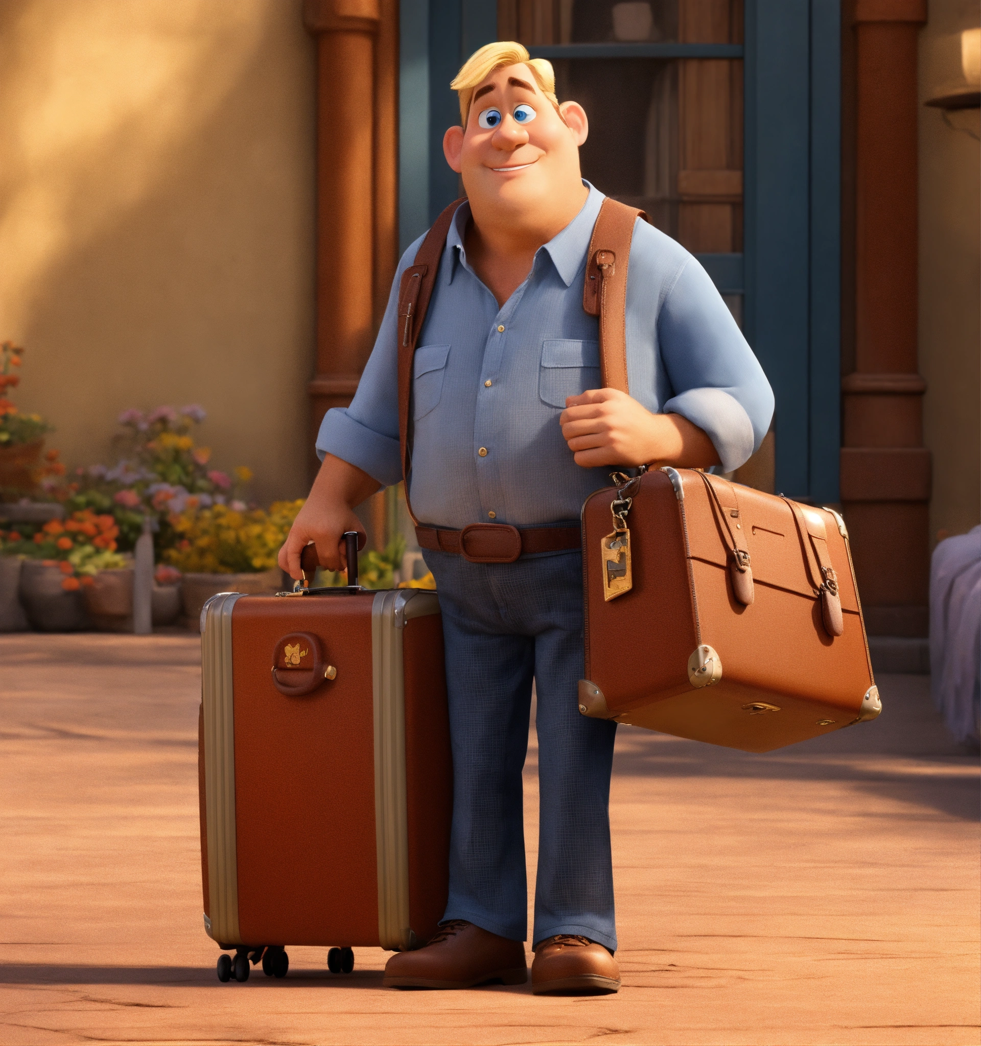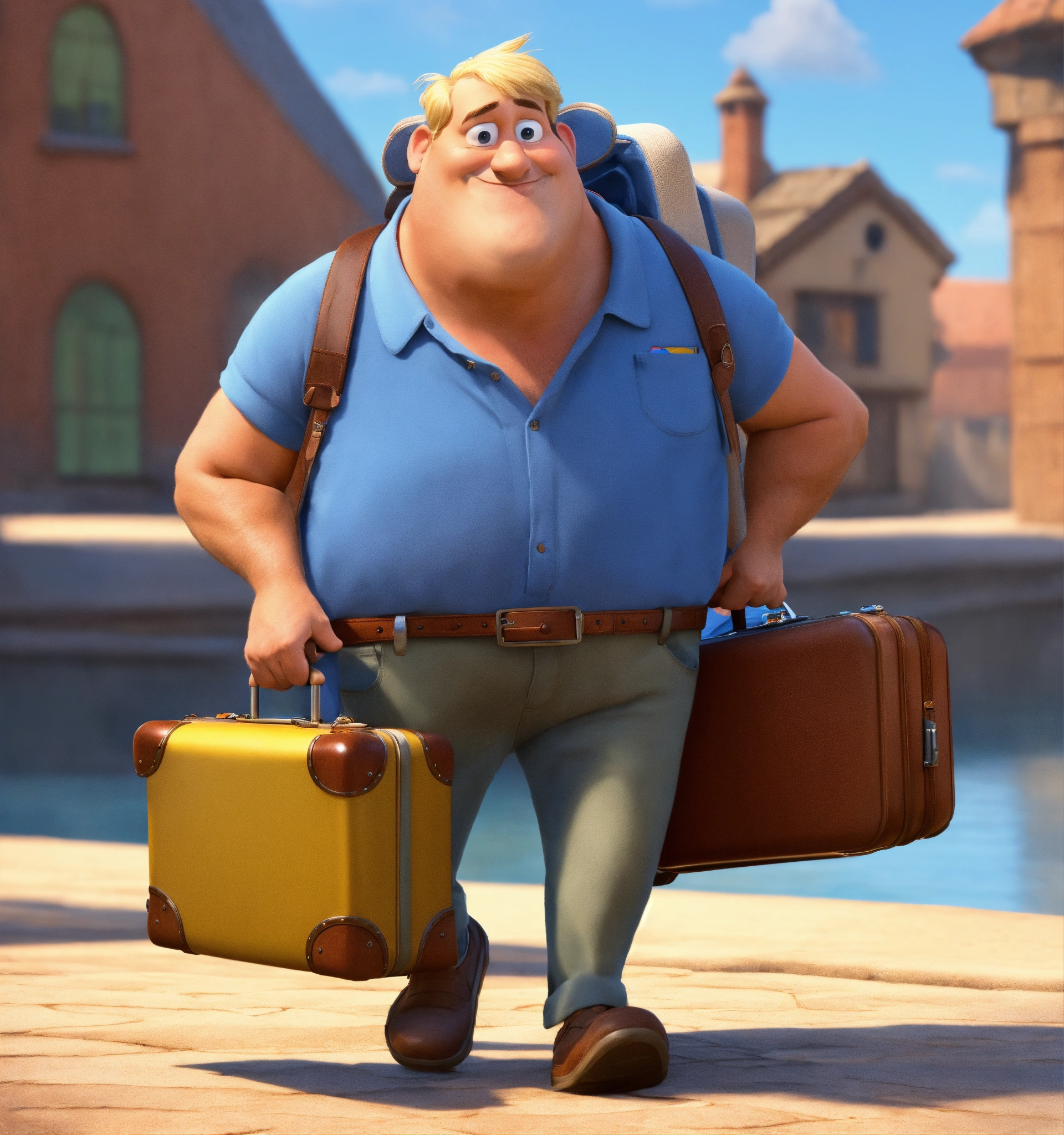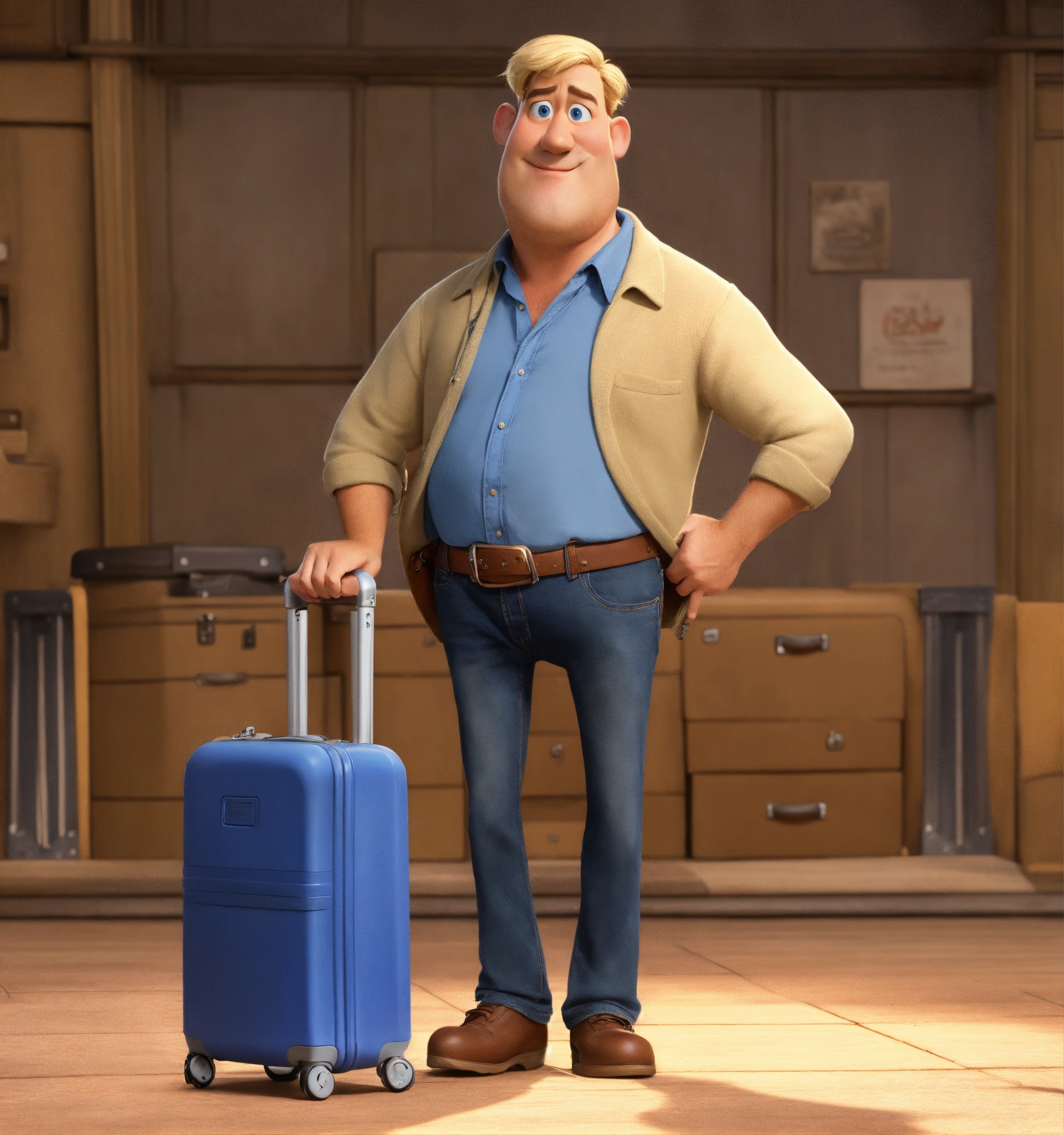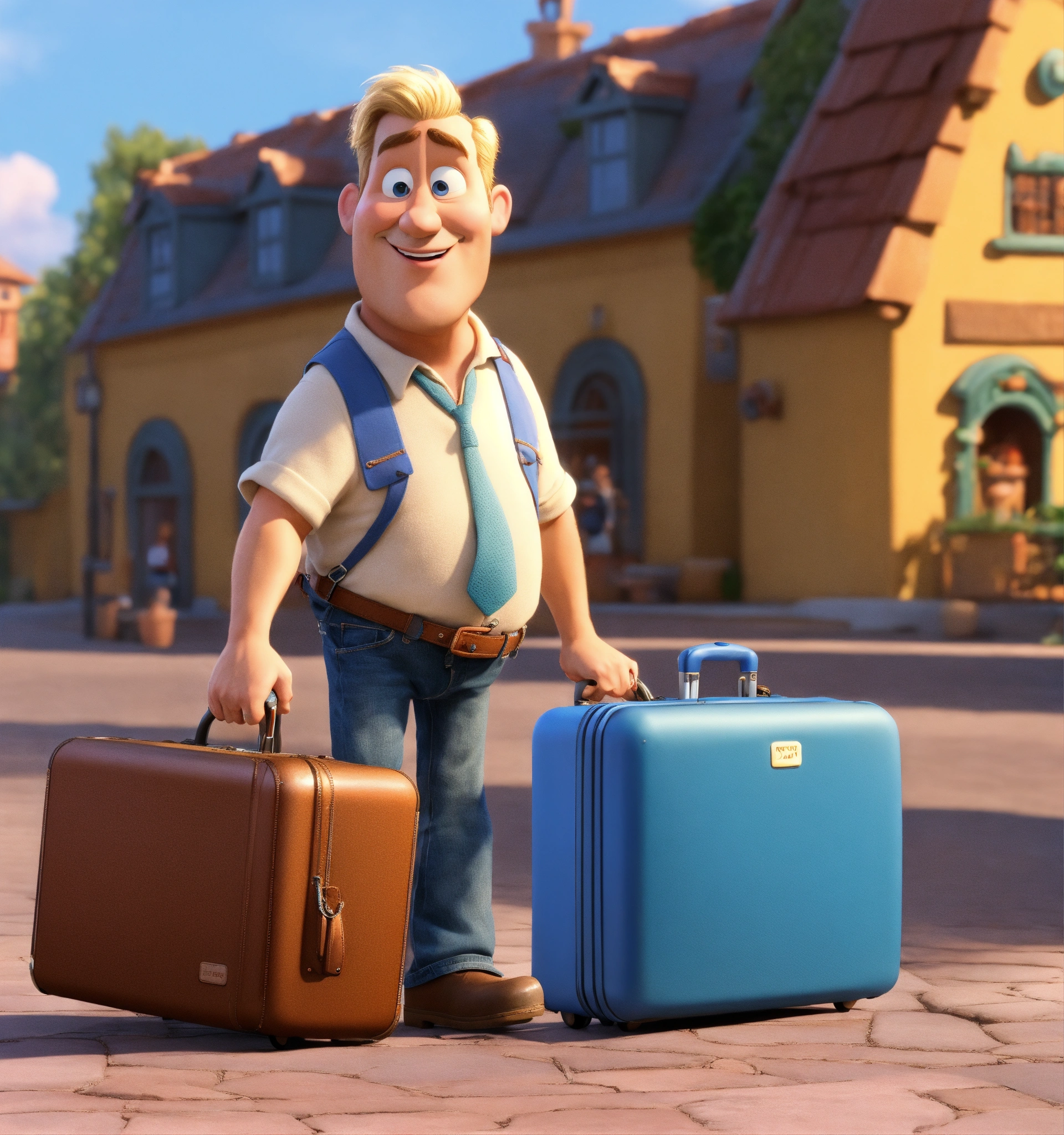 Pixar middle-aged man blonde full body blue eyes big nouse suitcase cartoon