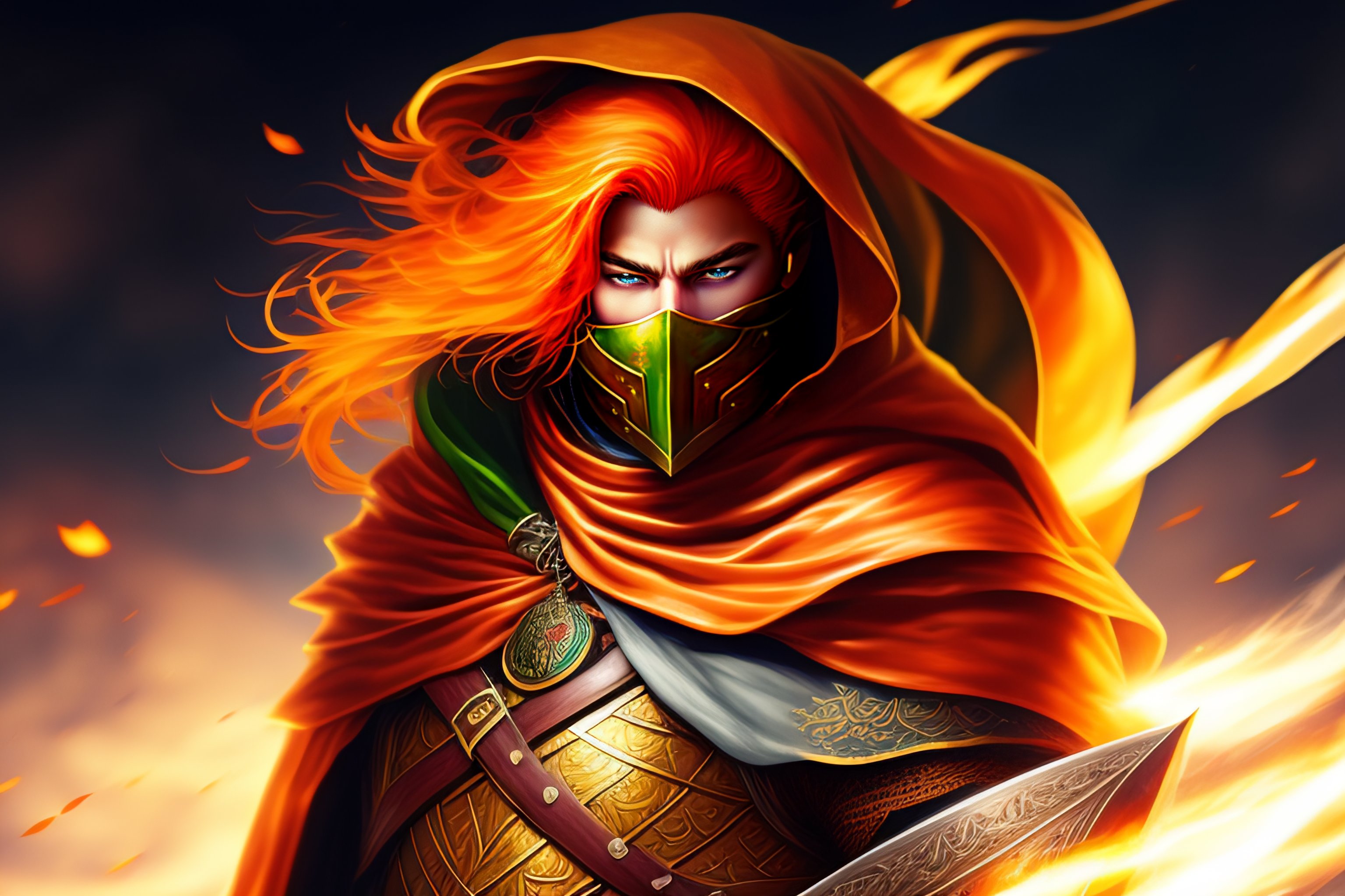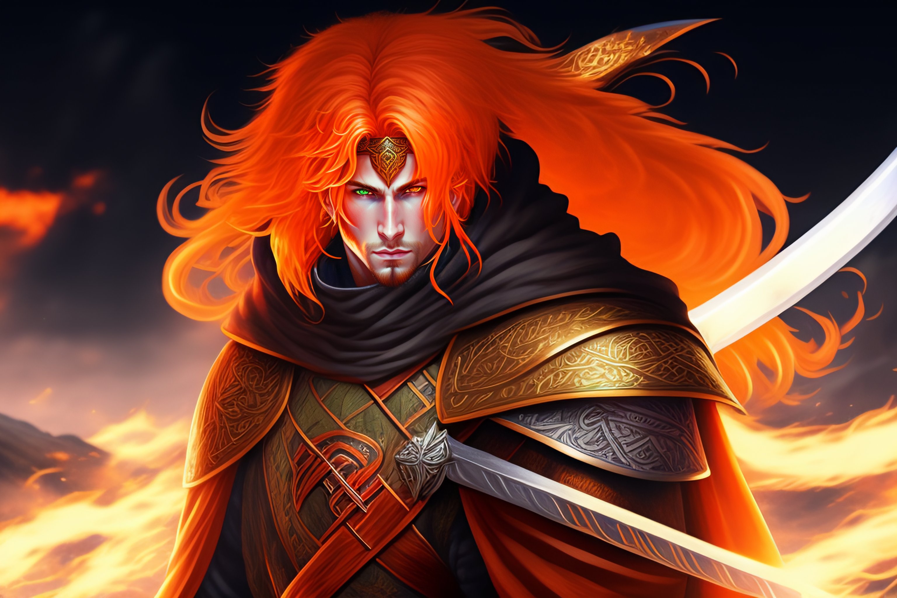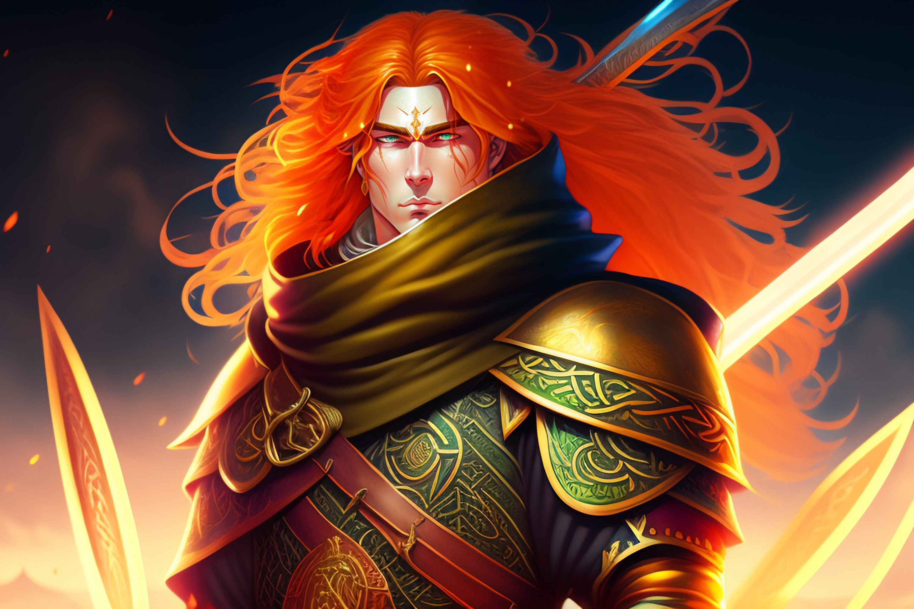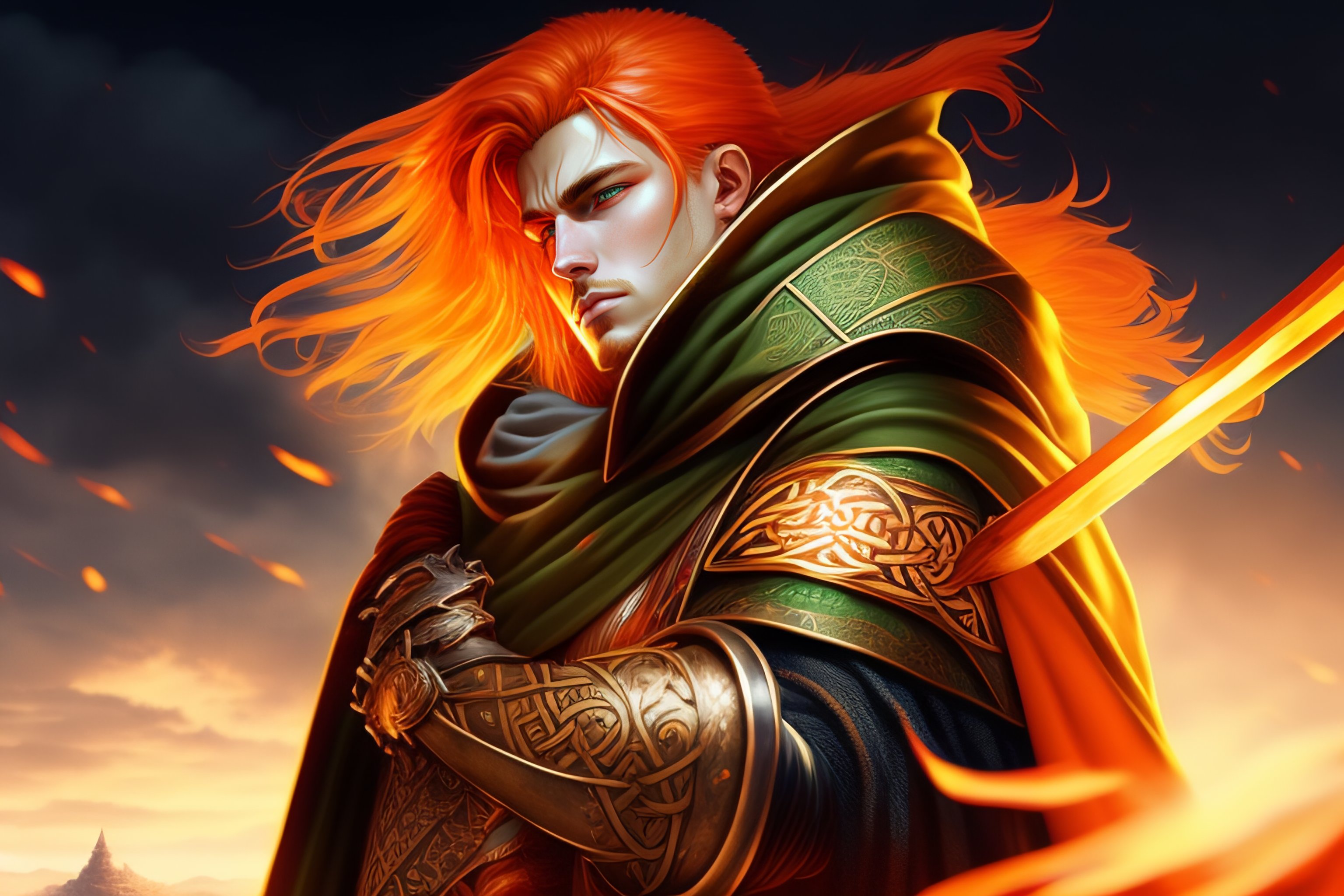 Masterpiece, best quality, ultra detailed, anime illustration, orange haired man with a hood, celtic symbols on his medieval clothing, grim fantasy, dynamic angle, cinematic lighting, backdrop of green plains with elden ring ruins