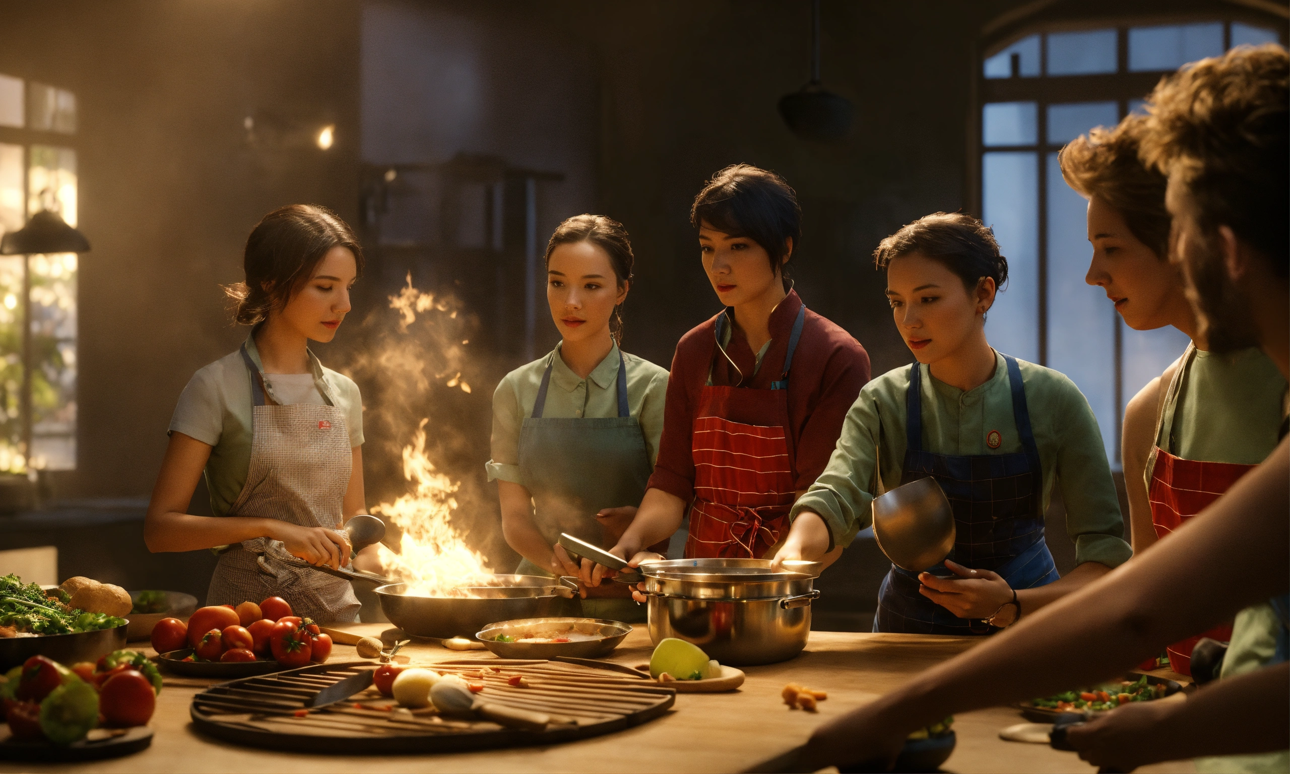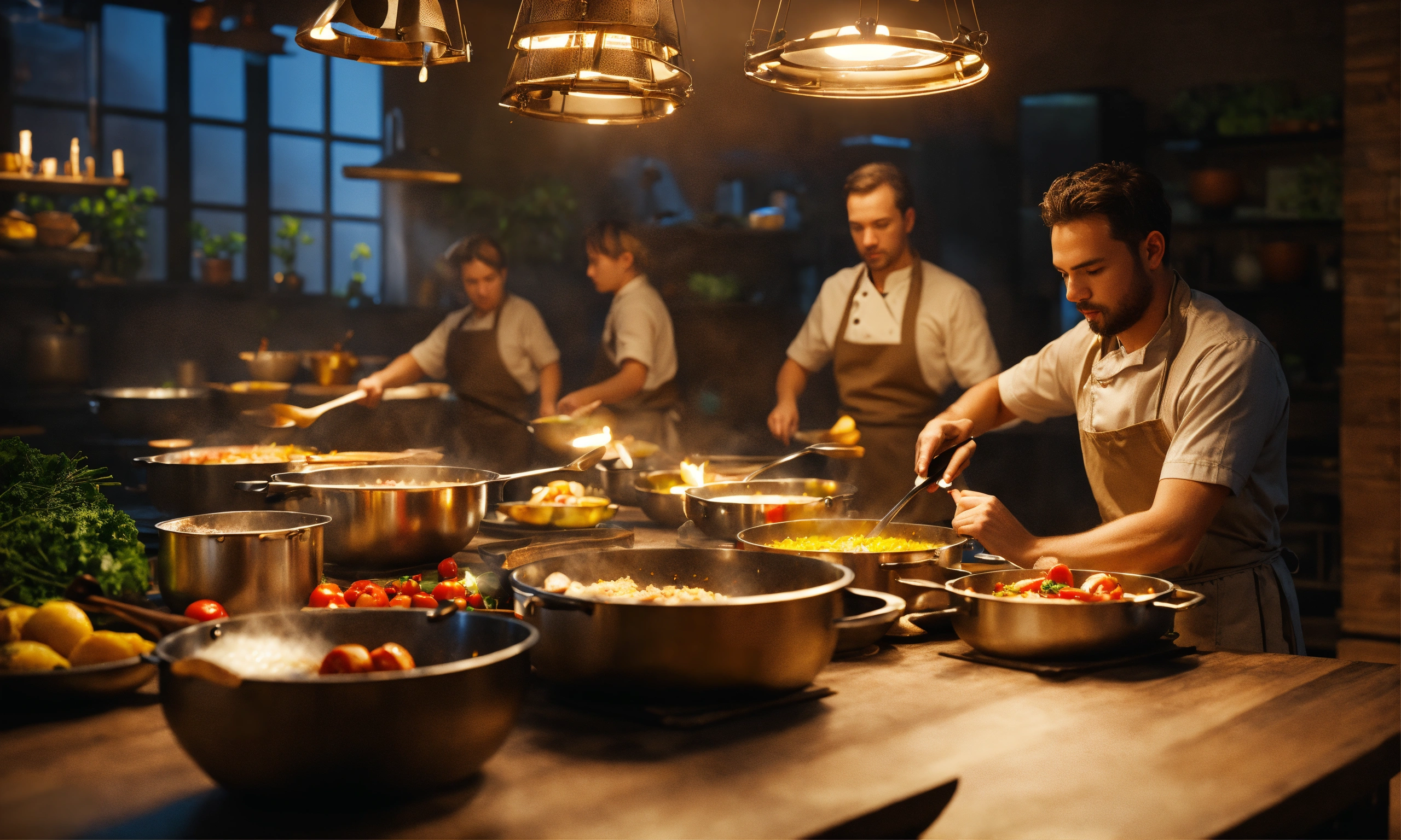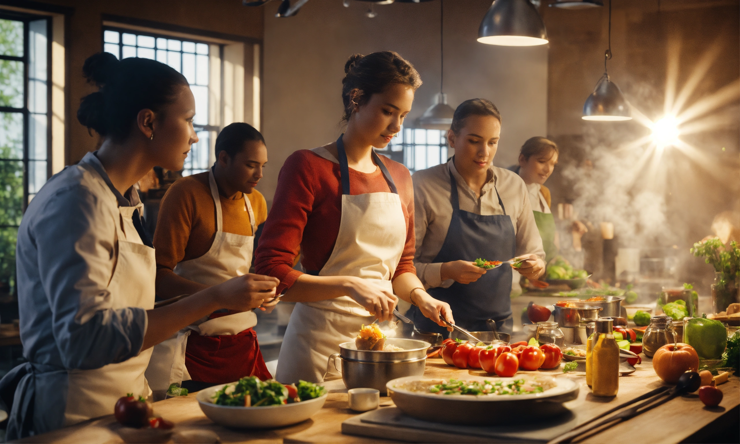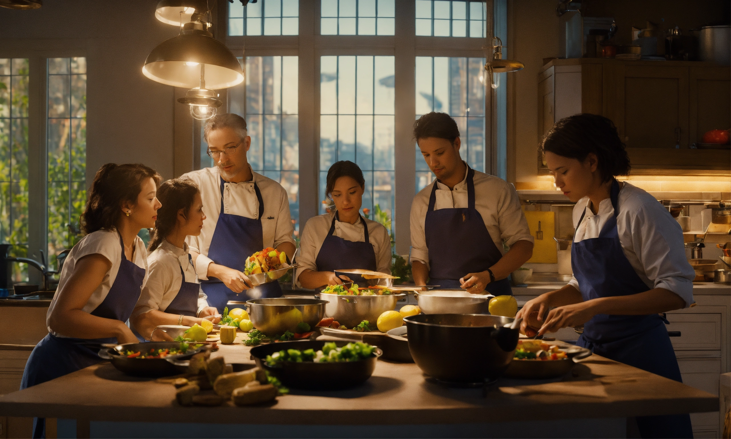 Team of people. teacher's master class for a group of people on cooking. octane render, trending on artstation, highly detailed, lighting, professional, realistic, sharp focus, 4k, 8k, high resolution, candid, personal, –testp, bright lighting, ultra-detailed, bright lighting, photo, high quality photo, cinematic shot, volumetric light, imax
