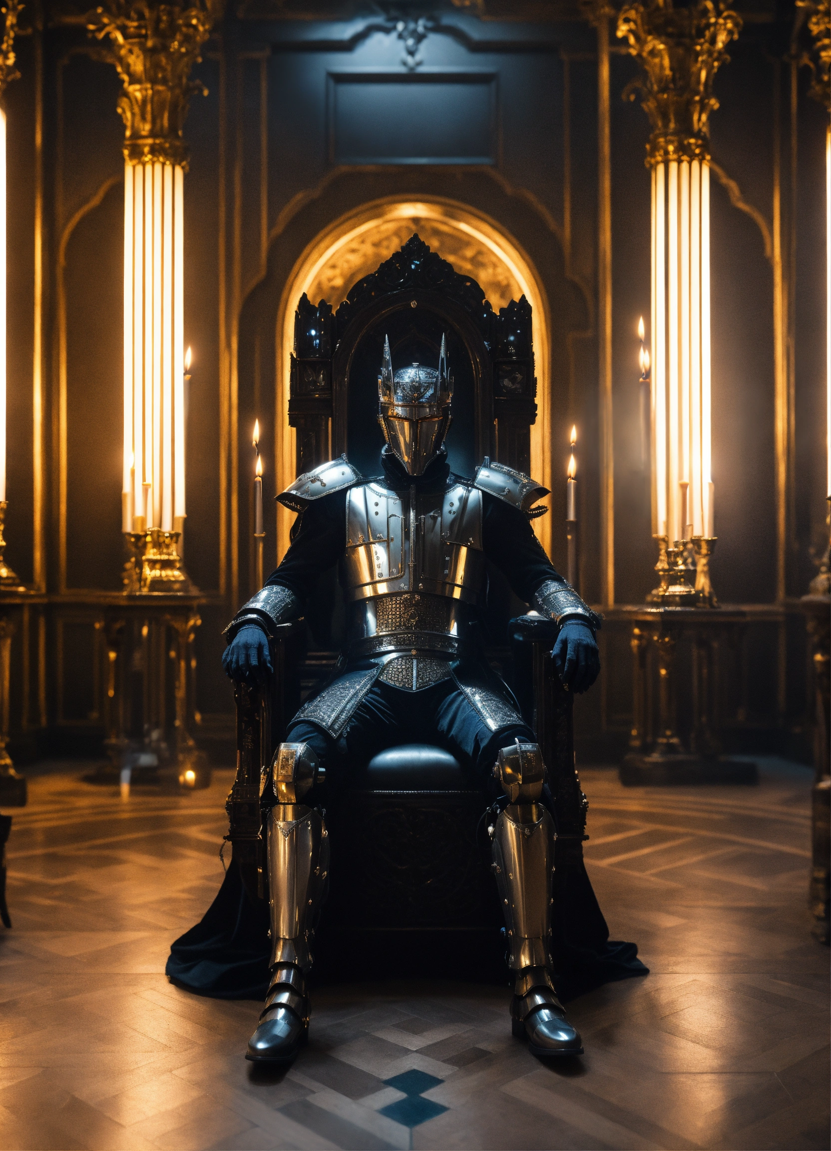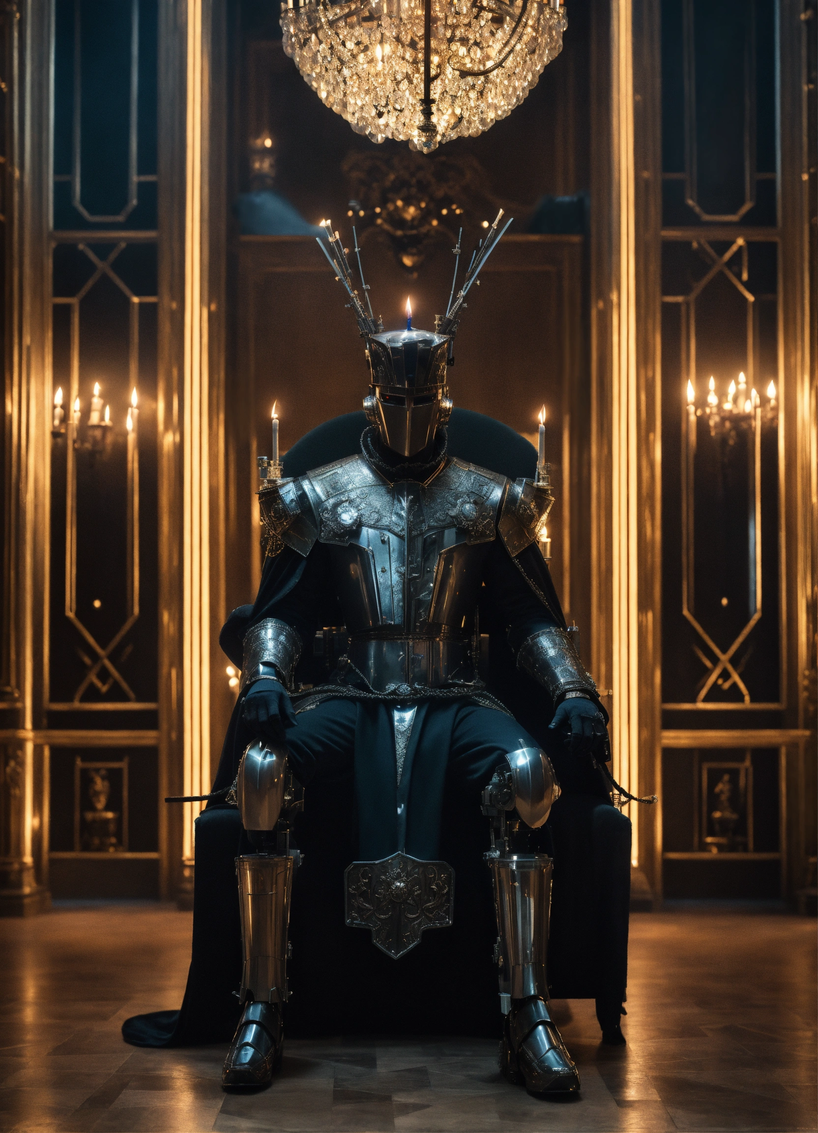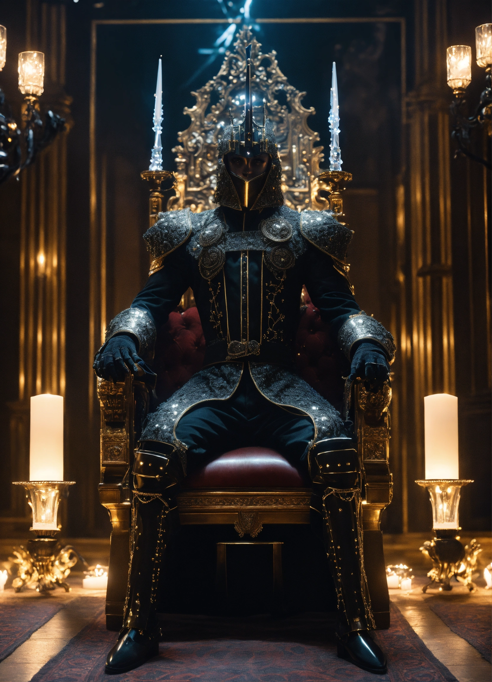 An ultrarrealistic distant photograph of a futuristic medieval king style power suit, made of black mate metal and polymer, full crystal hull, for a man, visible wires, sitting in a throne, two robot dogs, imposing, modern minimalism, elegant, dystopia, mysterious, godlike, scary, in a victorian era large palace room whit candle lights, 8k