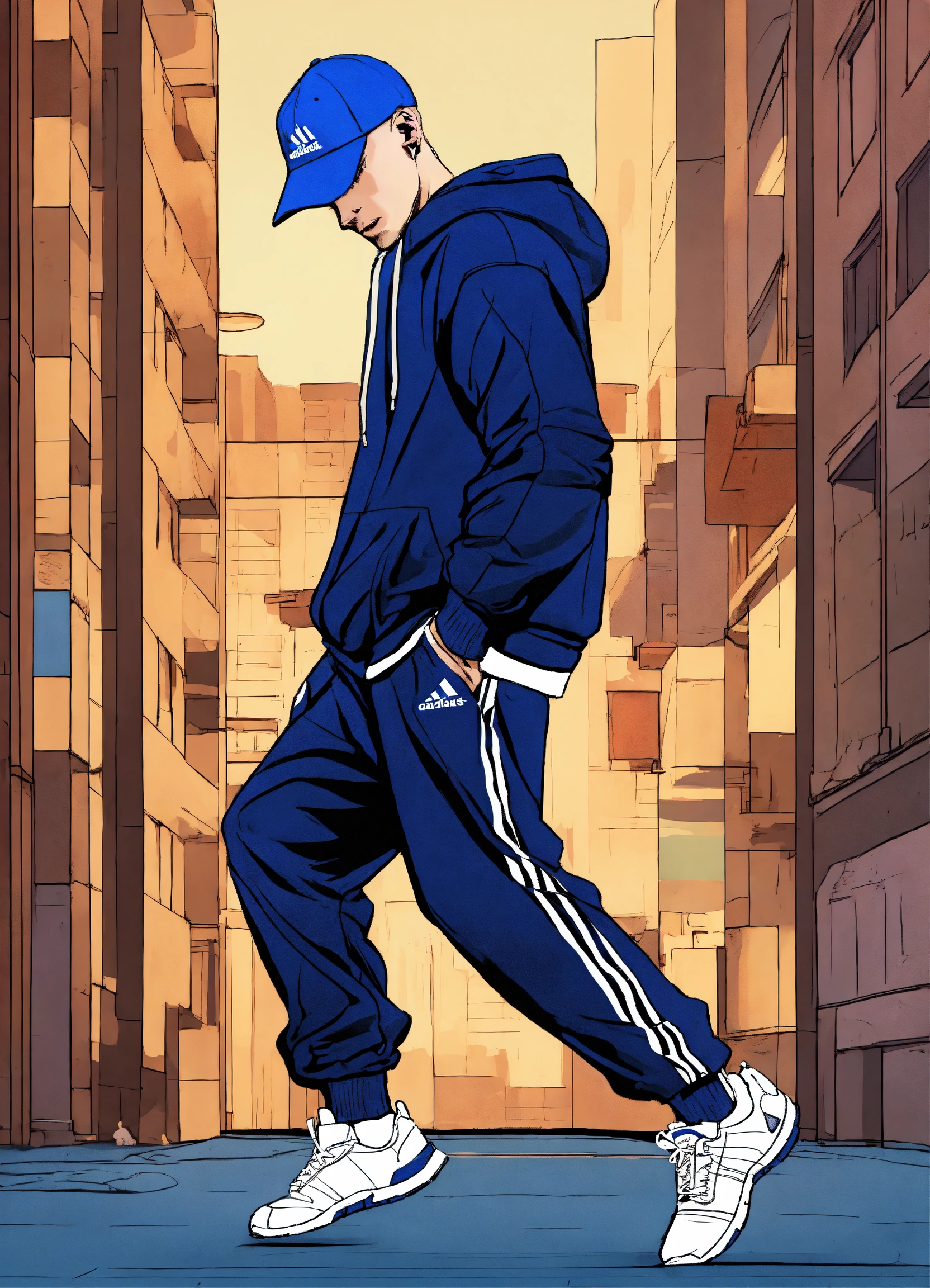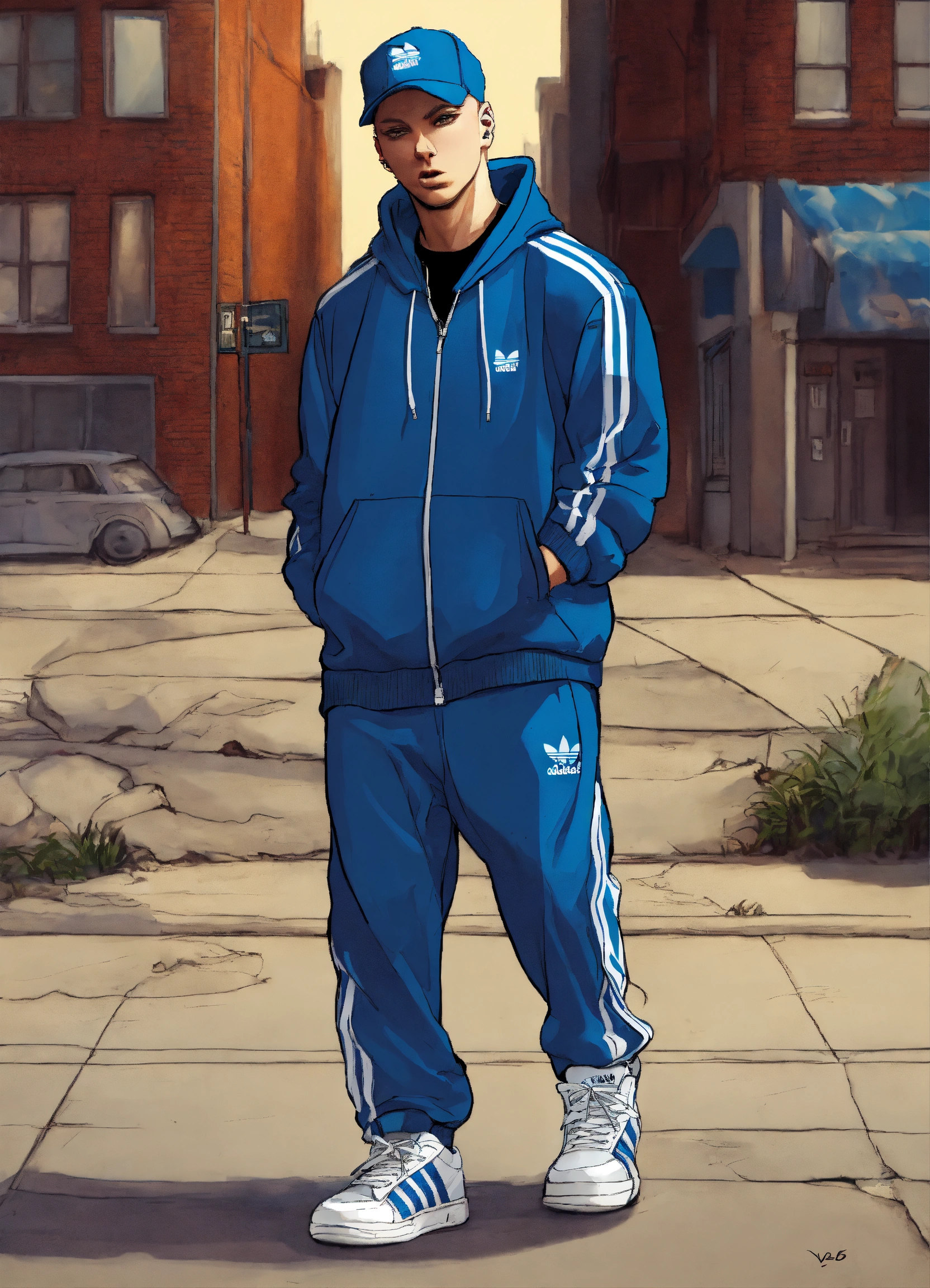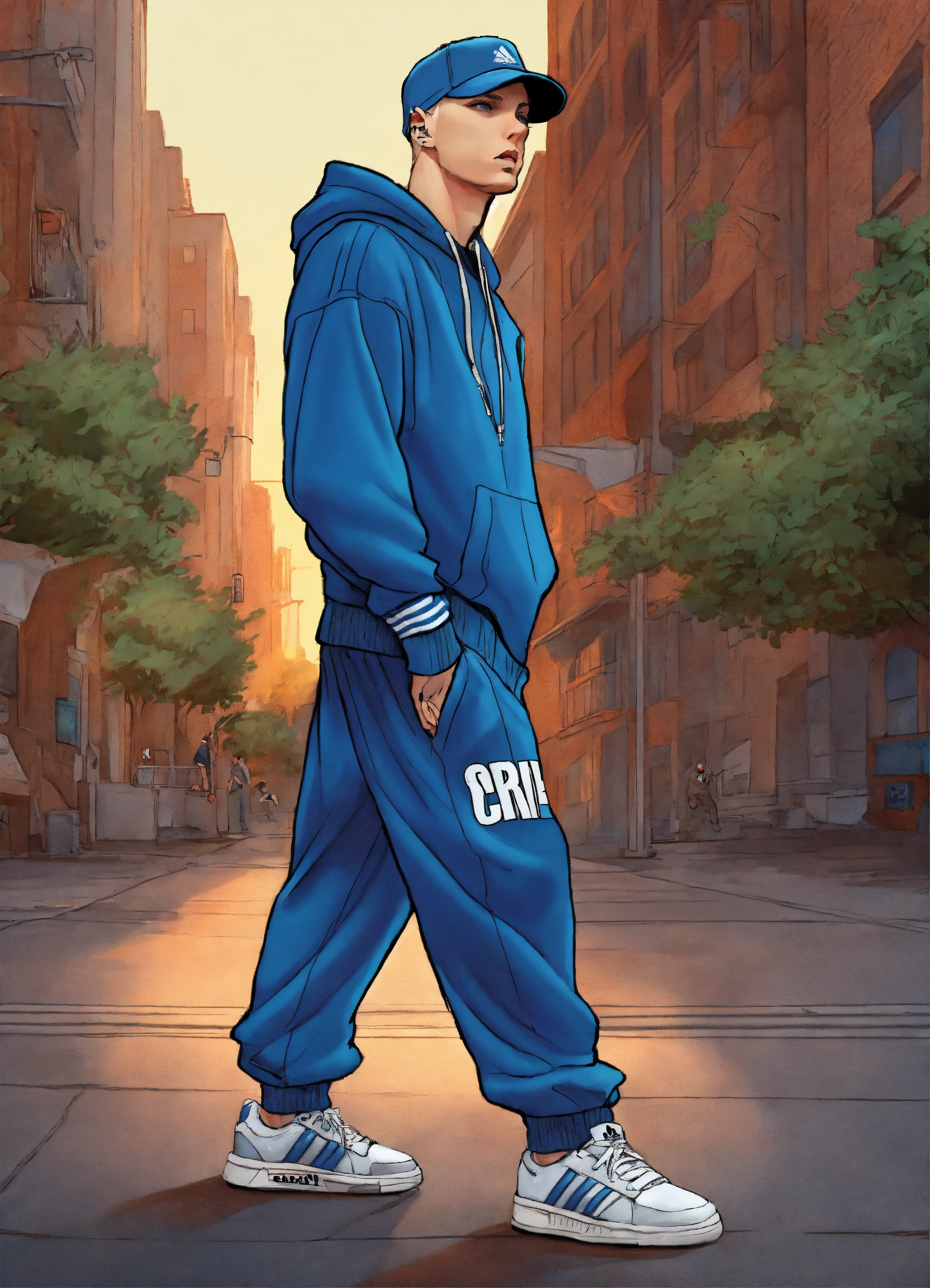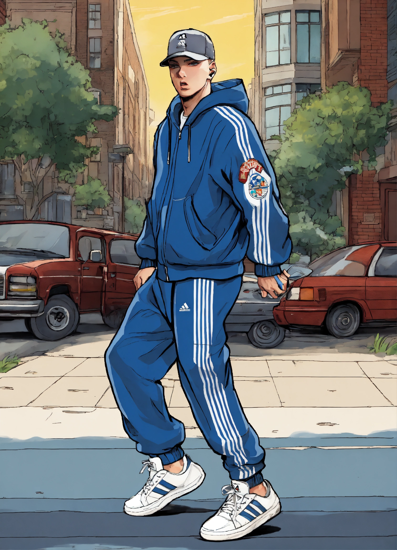 Handsome cartooned eminem with a dressed in adidas jogging suit, white sneakers, doing the "crip walk" dance --v 5.0