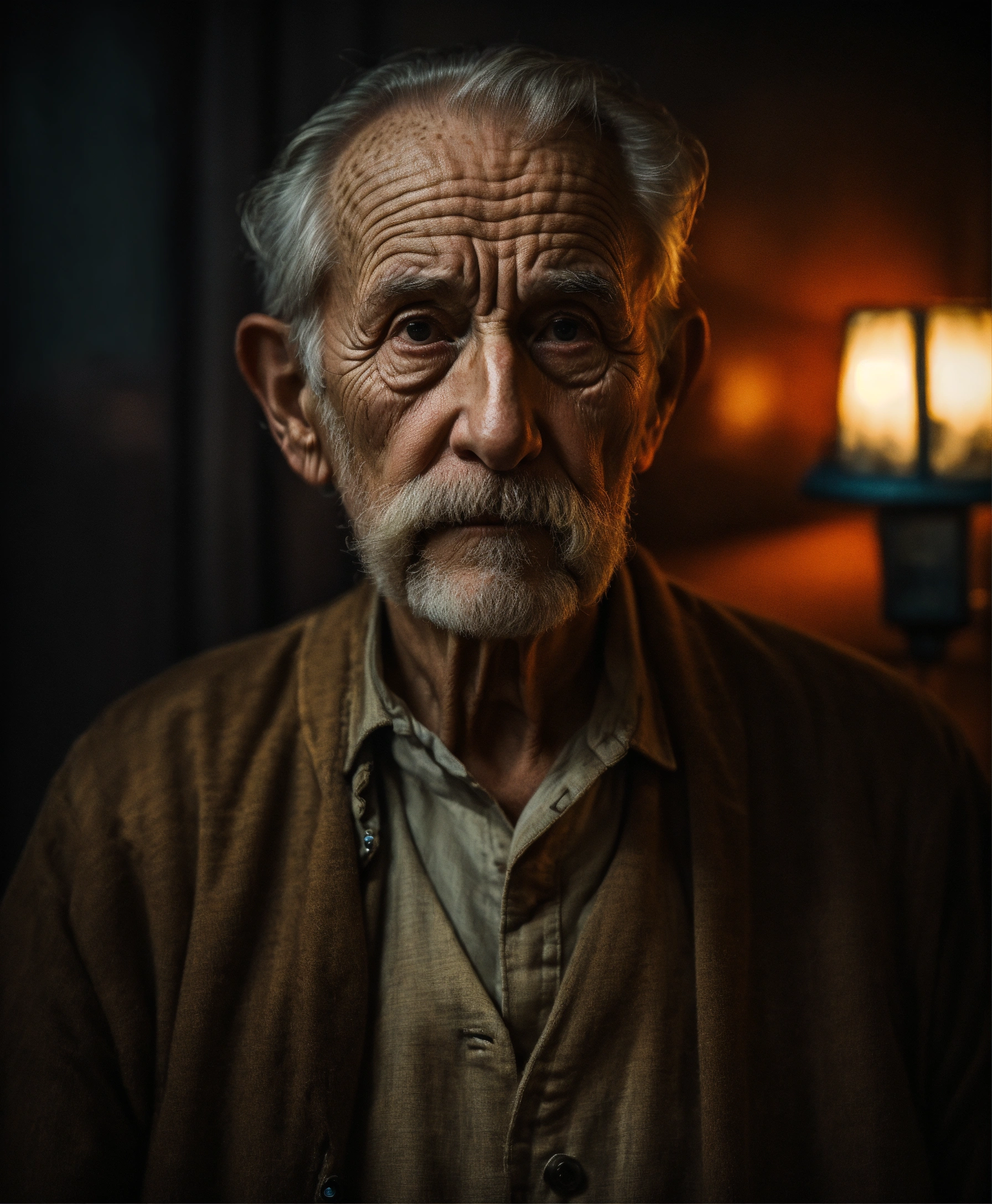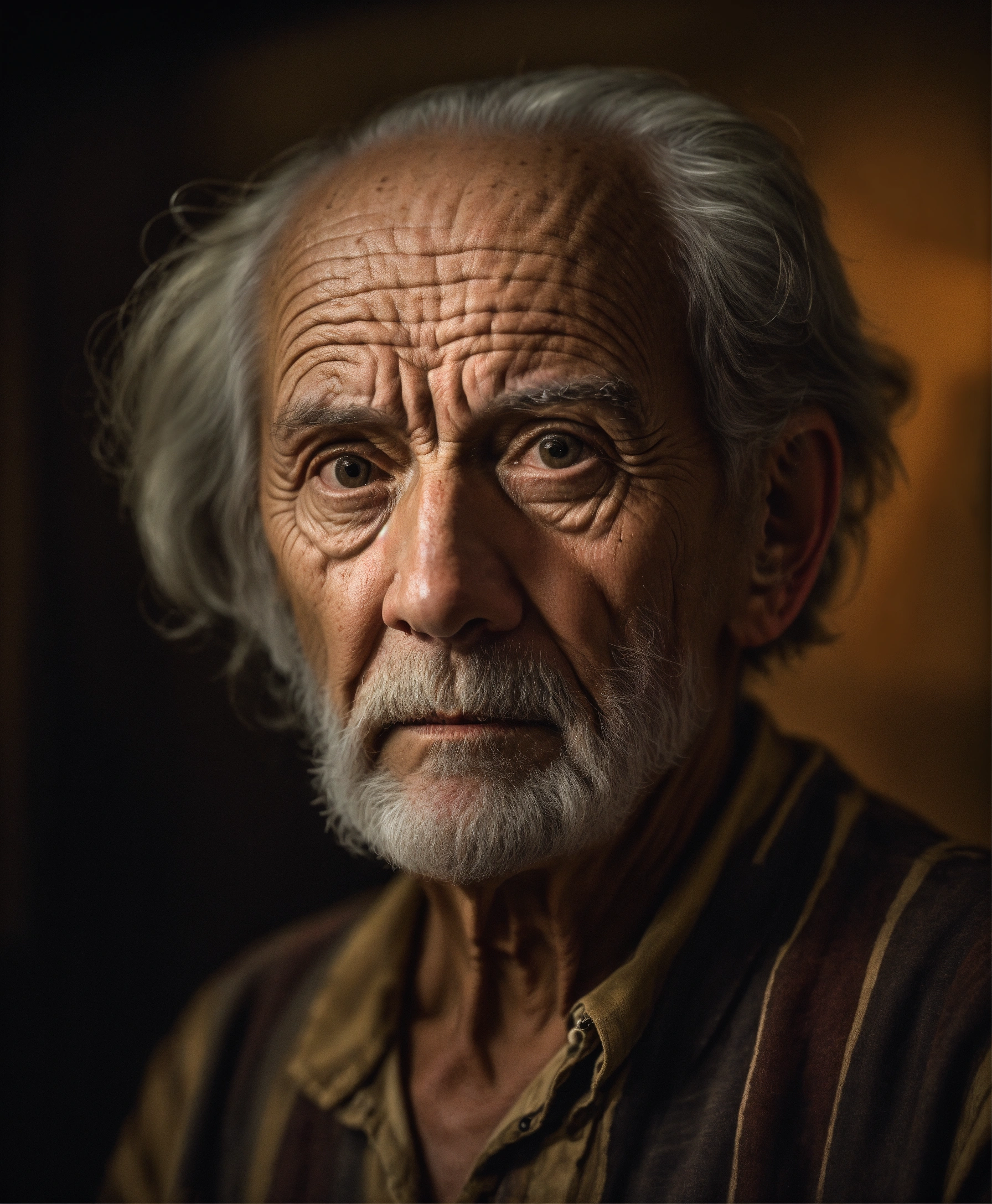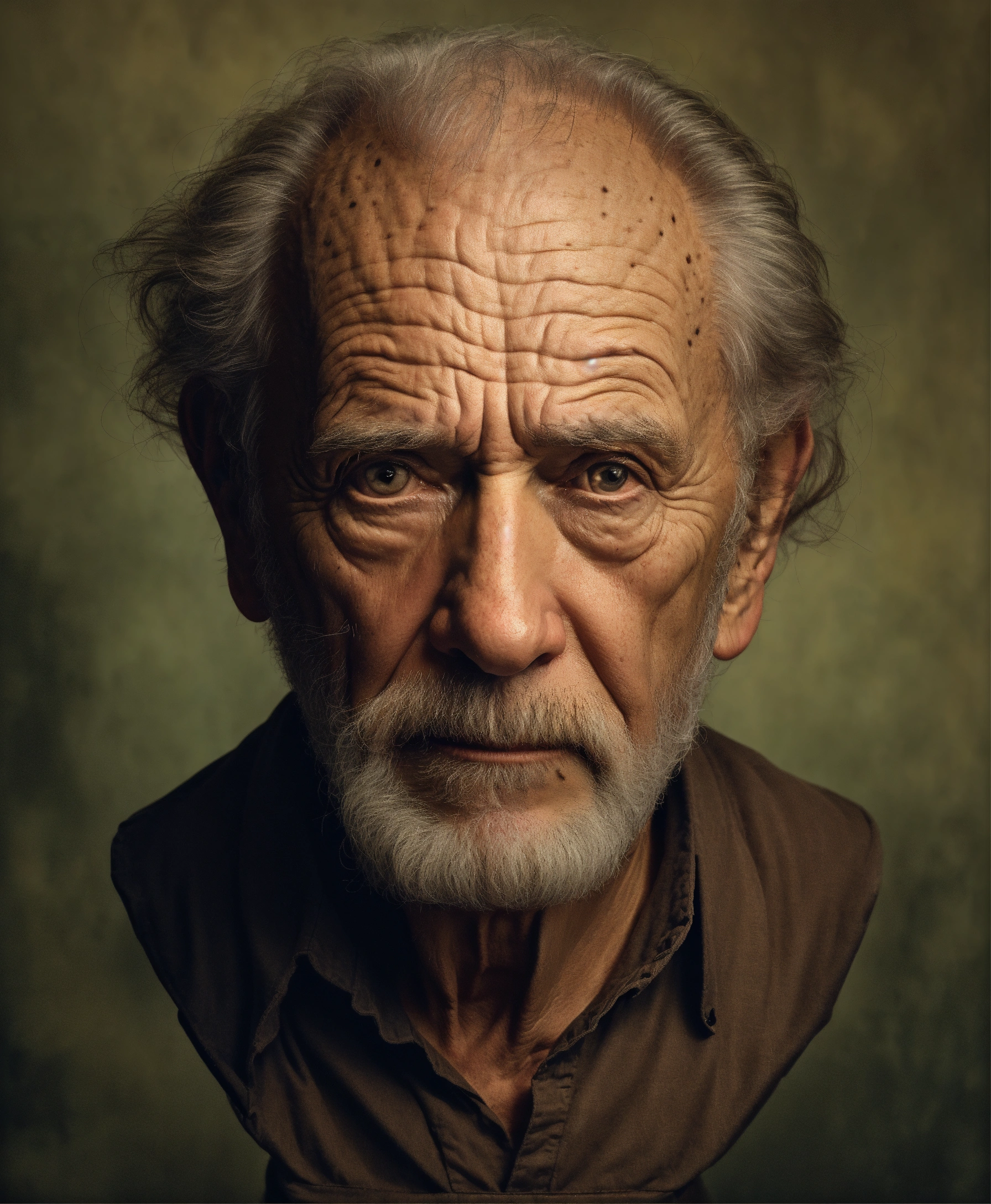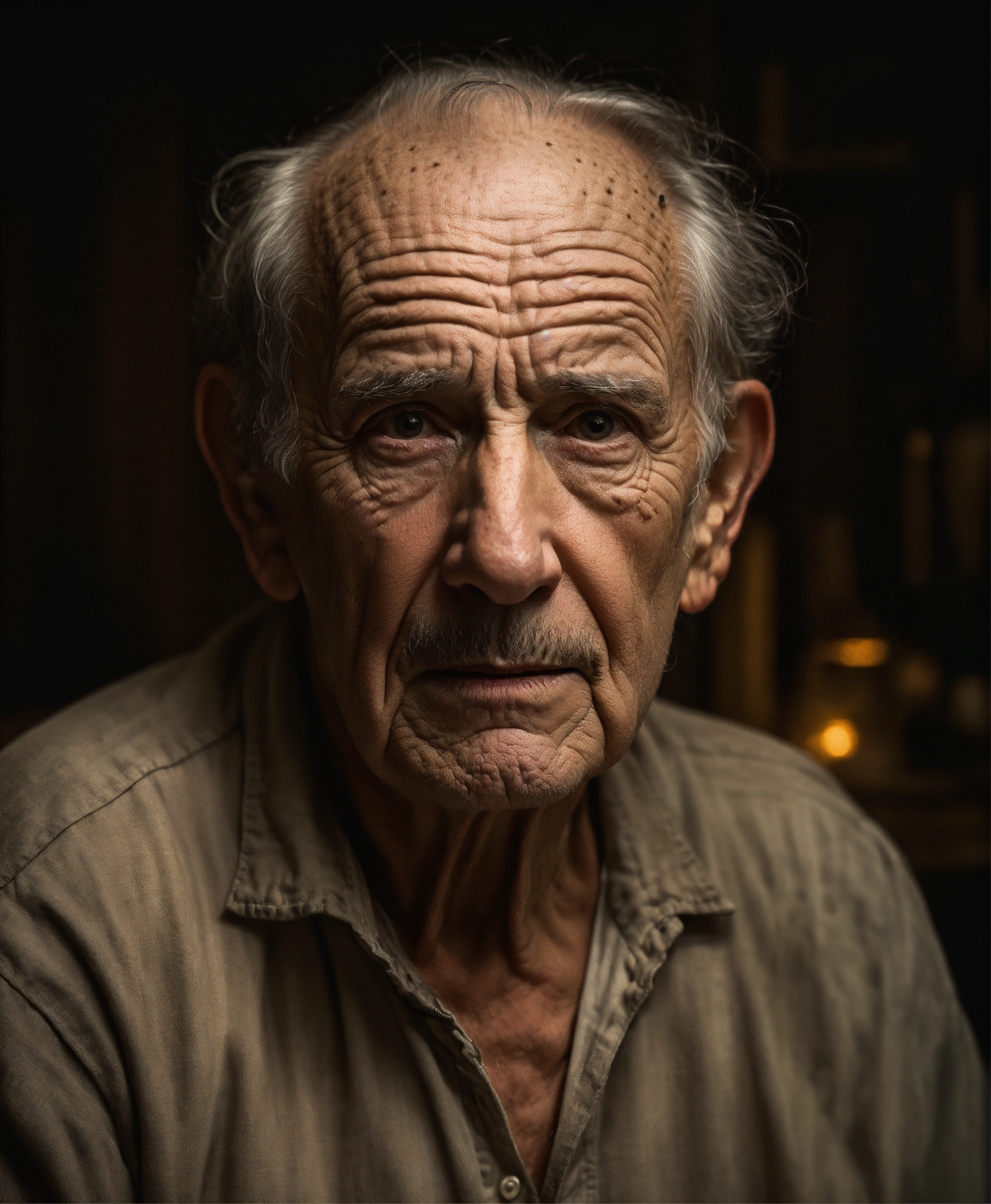 Portrait bust old scary american man, picture to ththinning hair, small little eyes, with wrinkles and dark circles telling a story, dark room background
