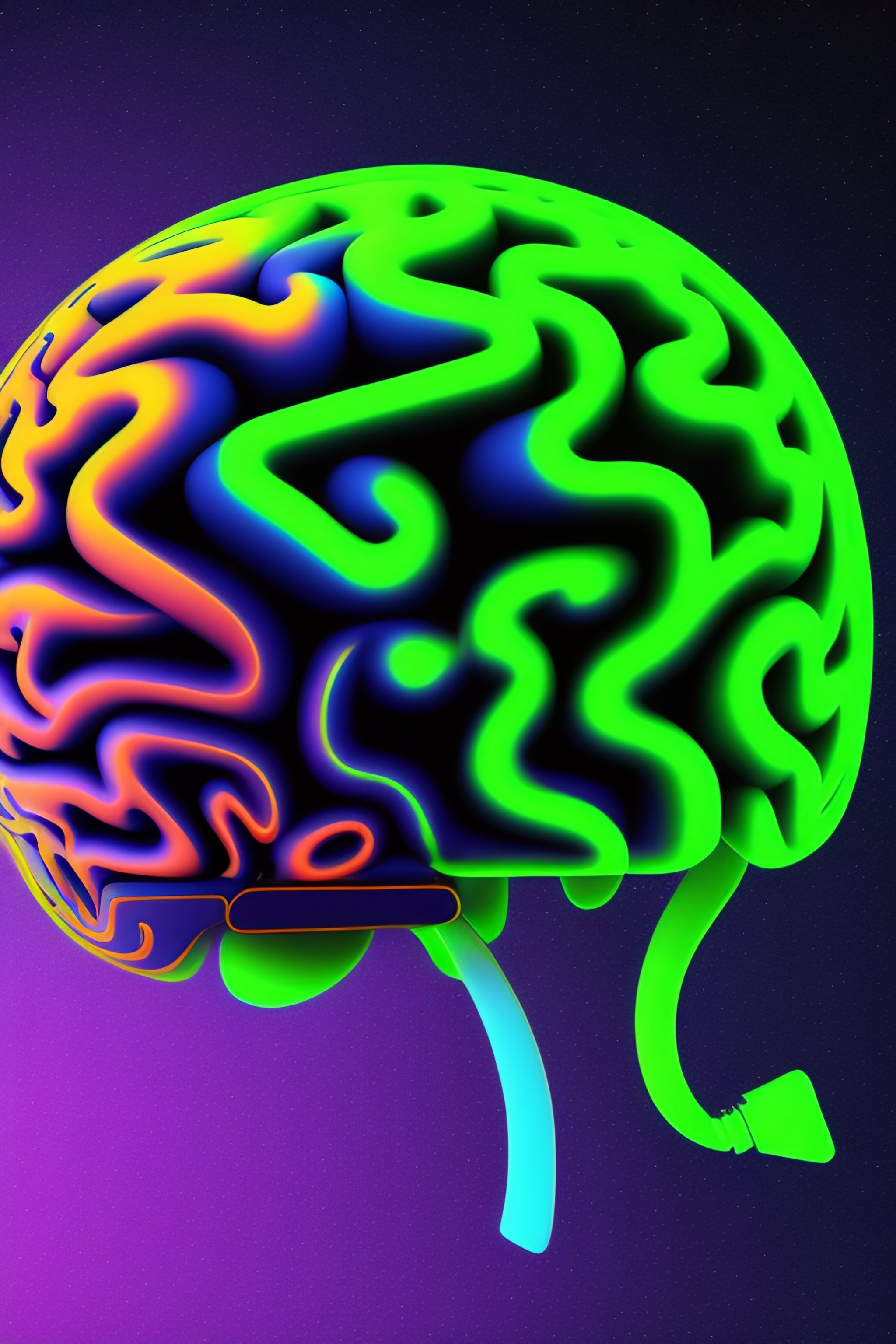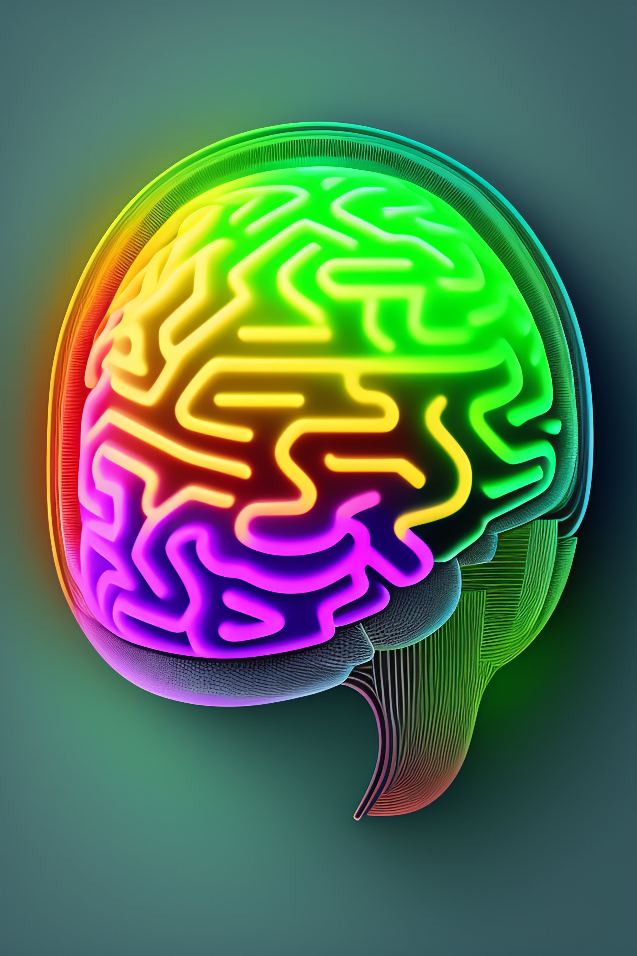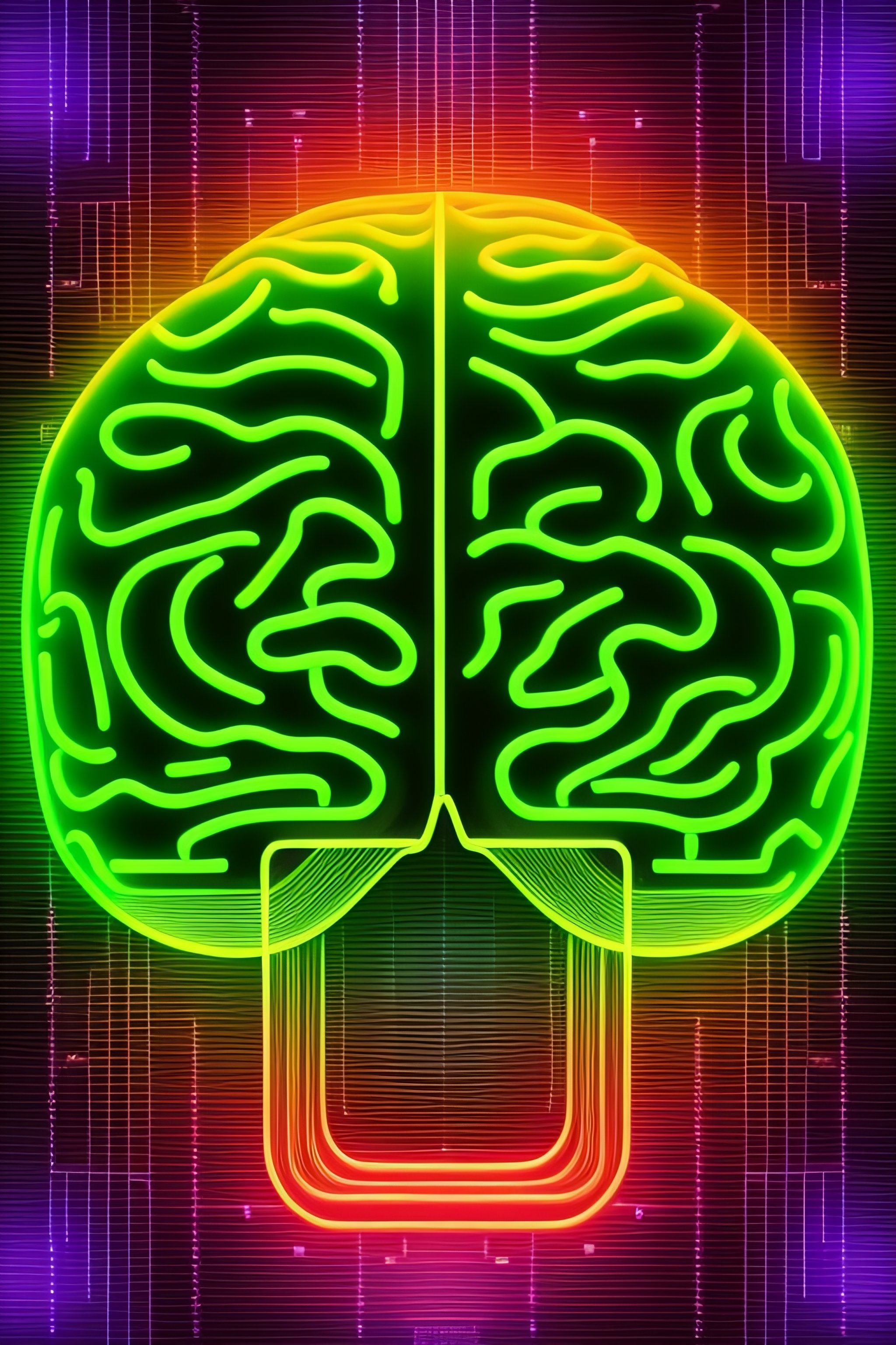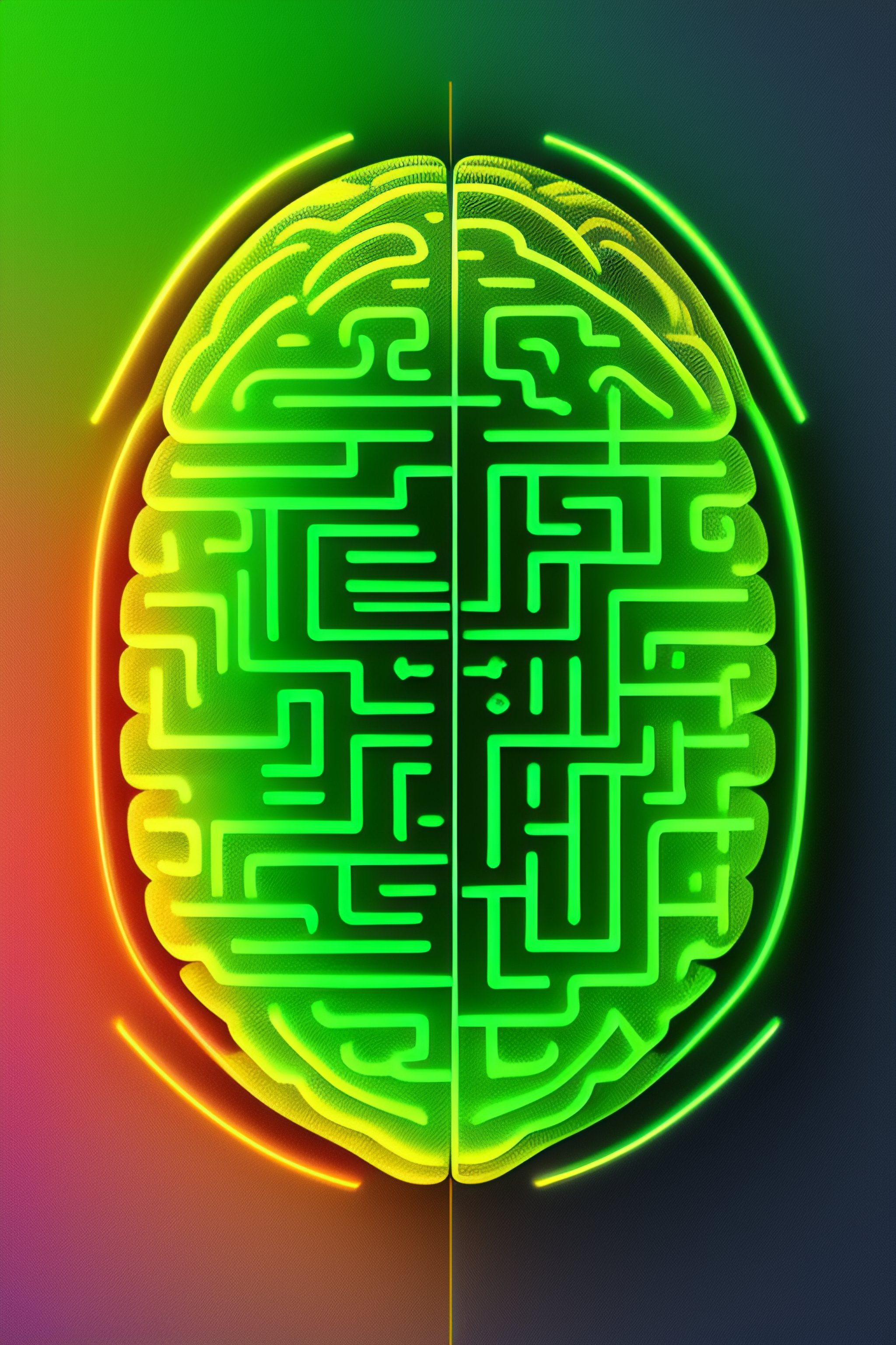Outline of the brain that looks like a maze. all lines are faded color except the quickest path from entry to exit is glowing neon green, like a bolt of lighting