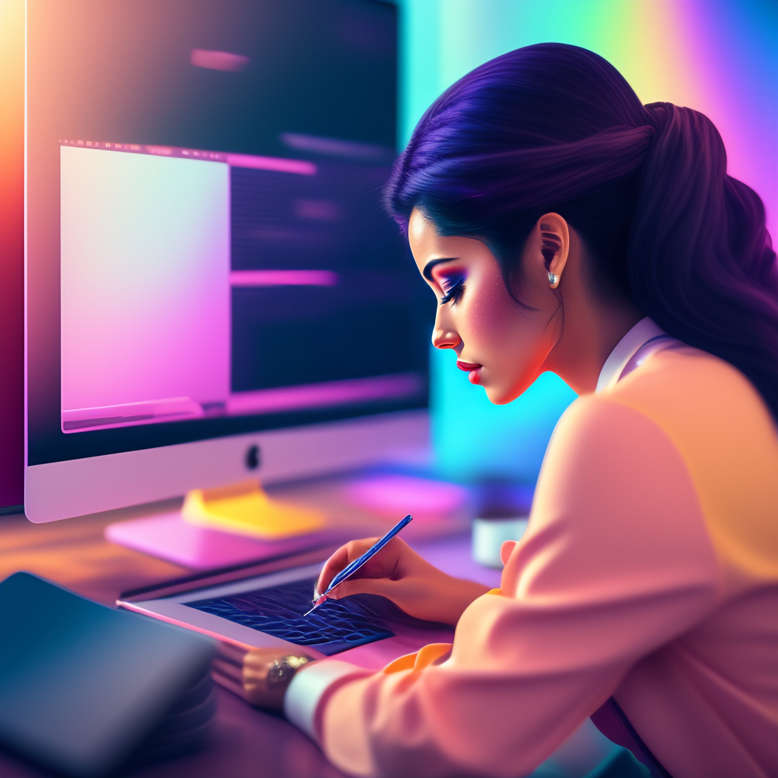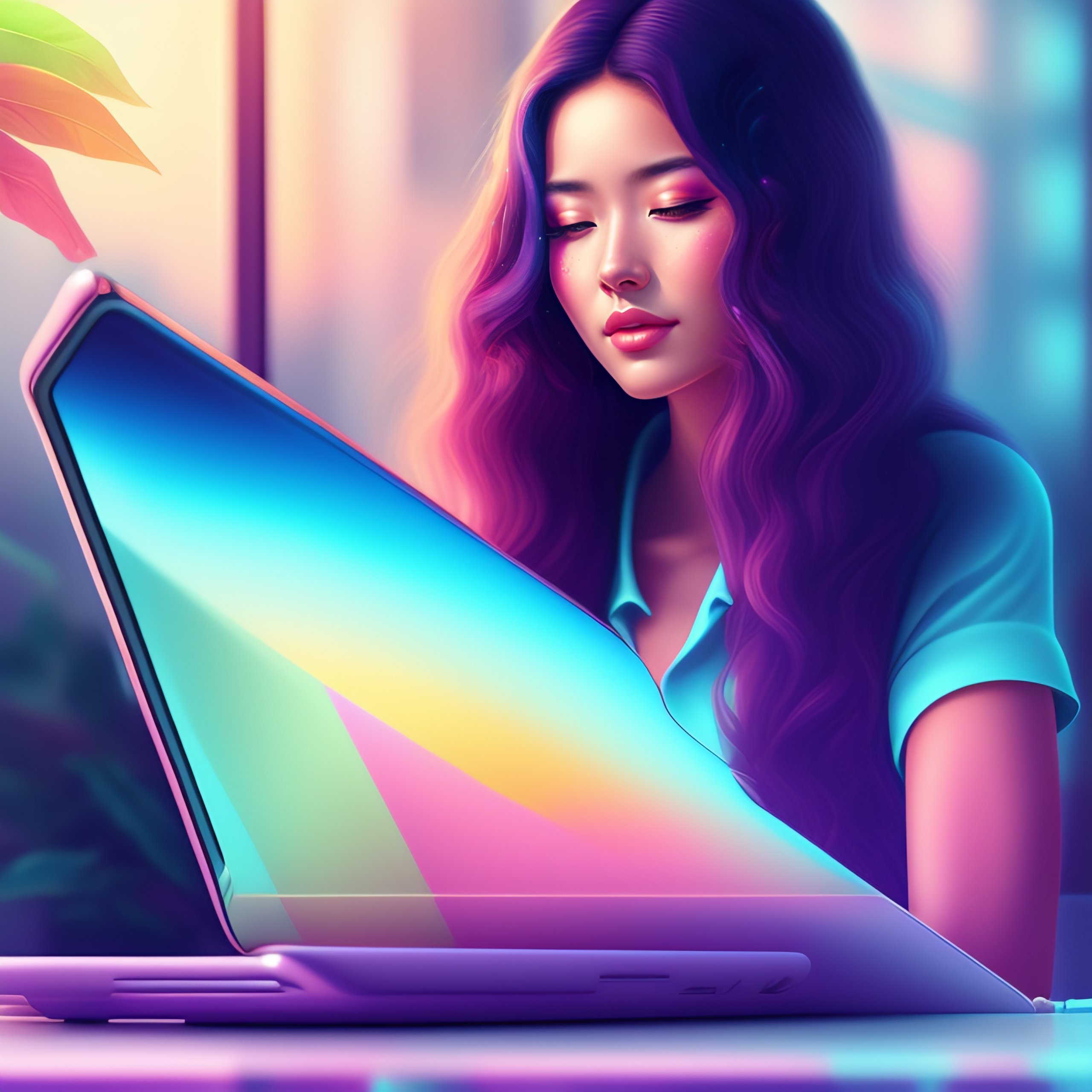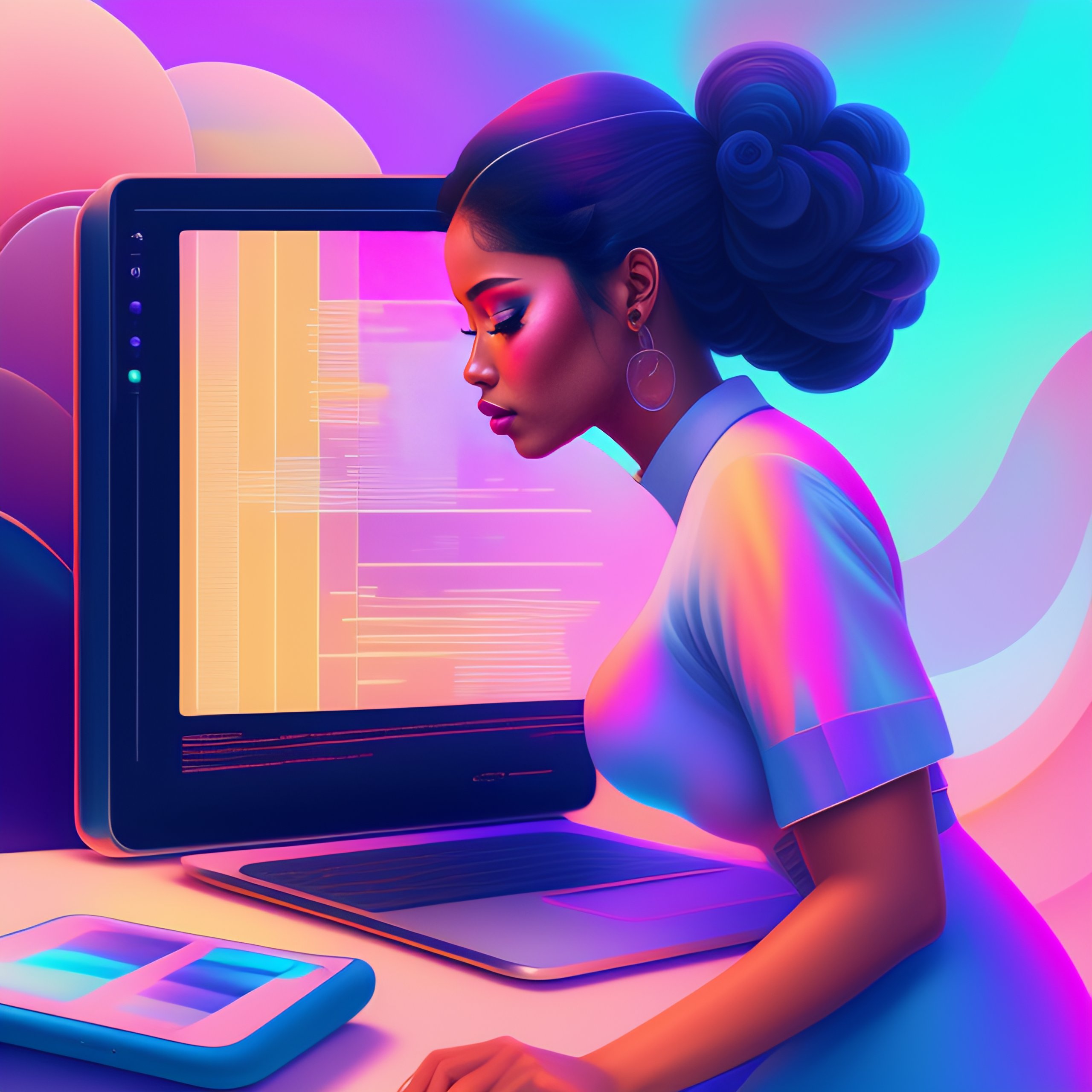 Woman programming on her laptop, coding aesthetic, pastel colors aesthetic, highly detailed, surrealistic, digital painting, concept art, sharp focus, illustration, color cca9dd