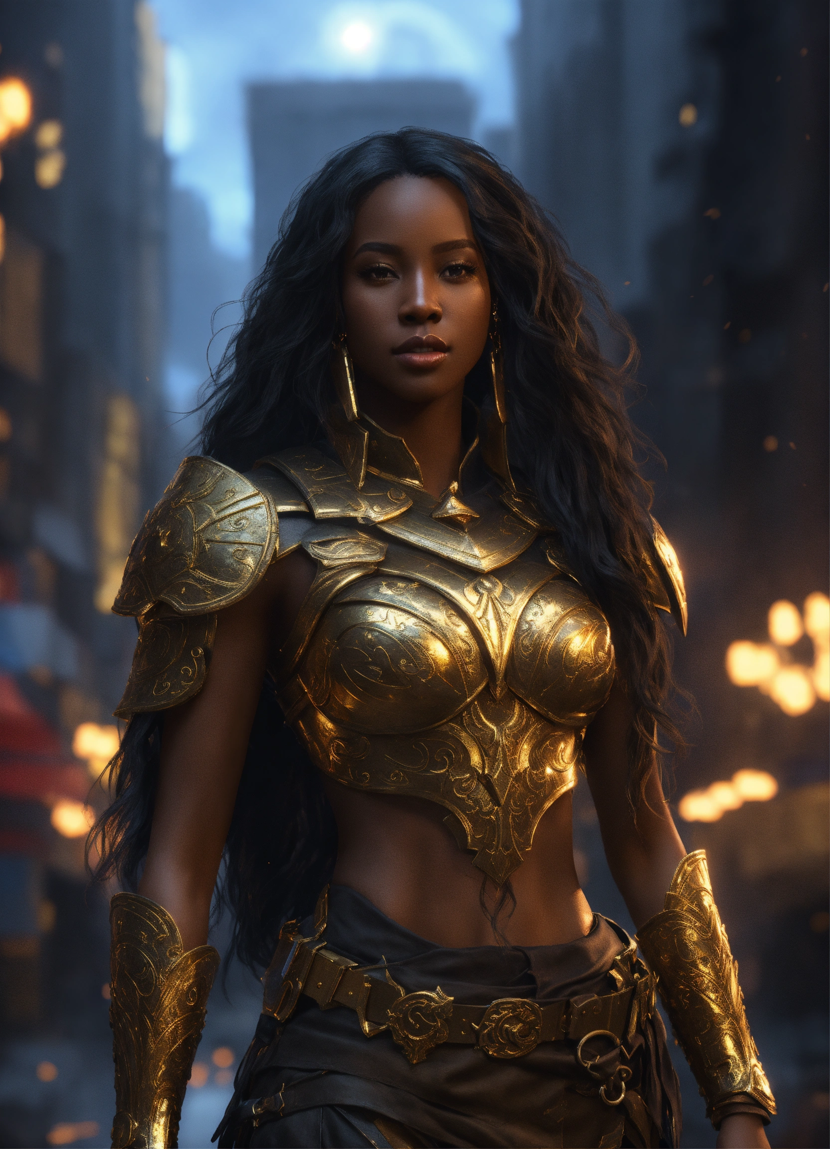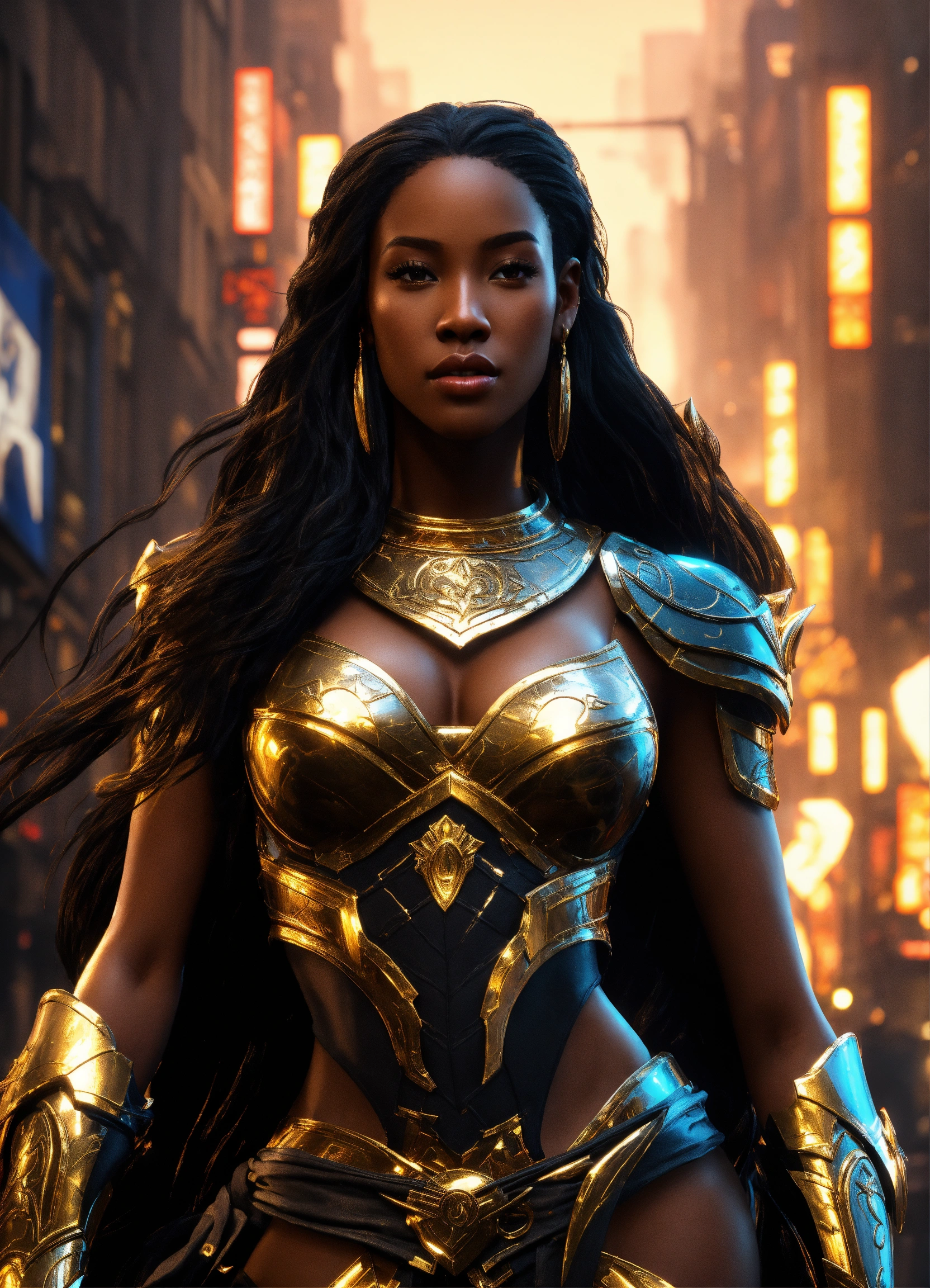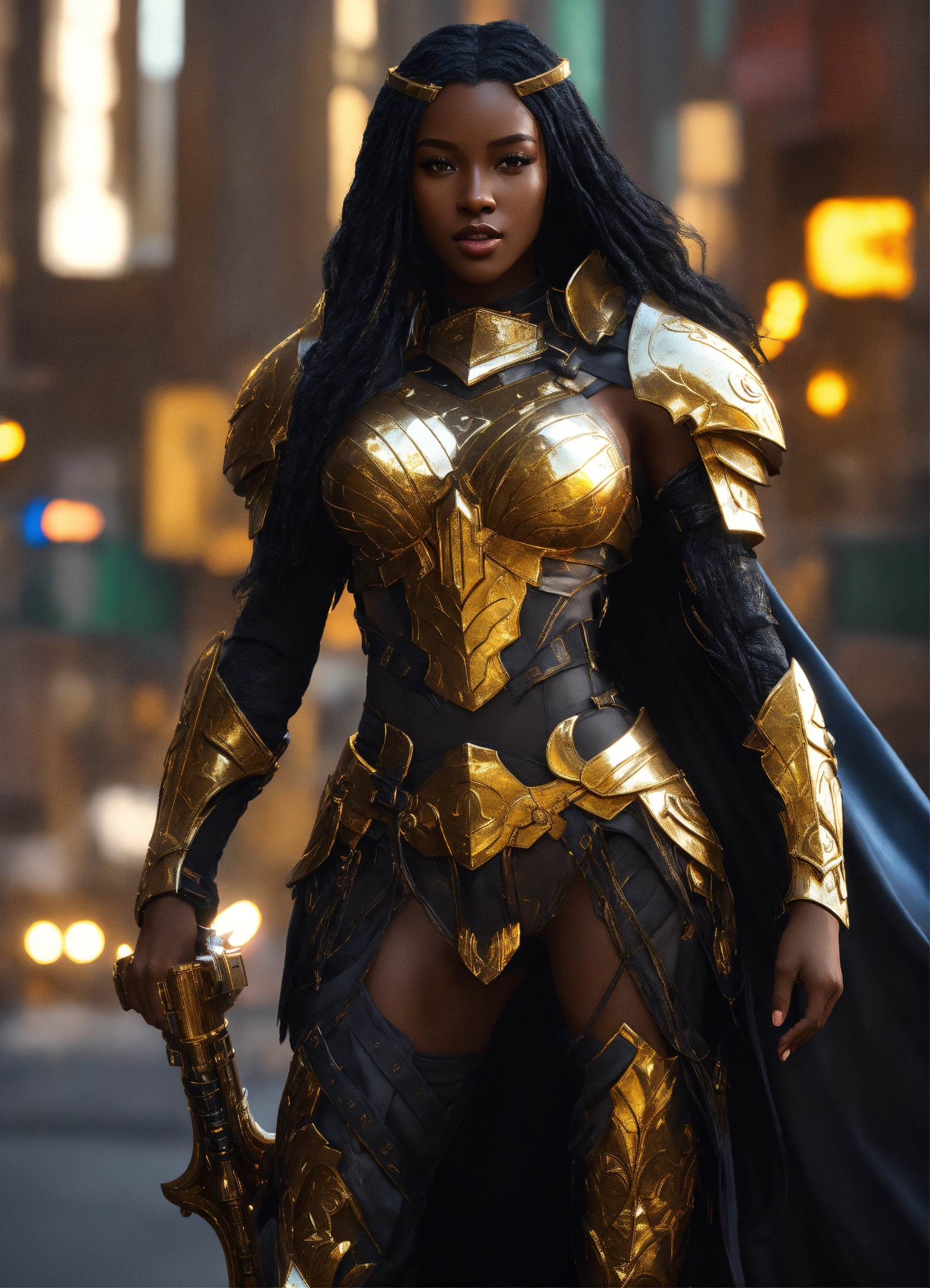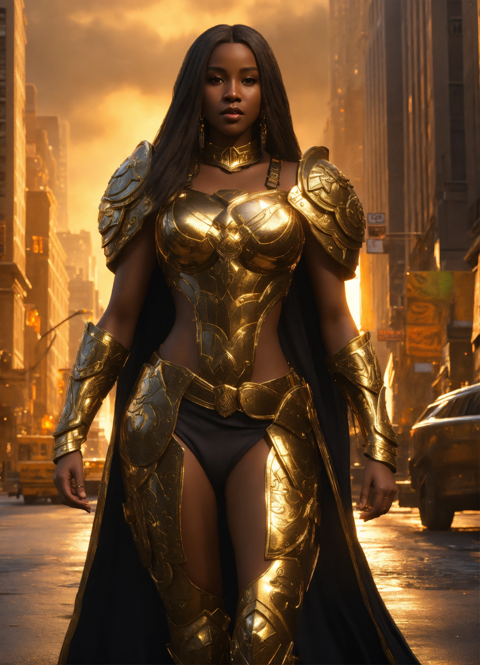 Full body of a beautilul, gorgeous long hair, shapely black female goddess of war with long flowing hair, perfect dark skin, perfect face, full lips most beautiful woman in the world, shapely hour-glass figure, a a dark skin hero wearing gold and black armor, fully covered, in new york city, full body, 8k resolution concept art portrait dynamic lighting hyperdetailed intricately detailed splash art trending on artstation unreal engine 5 volumetric lighting