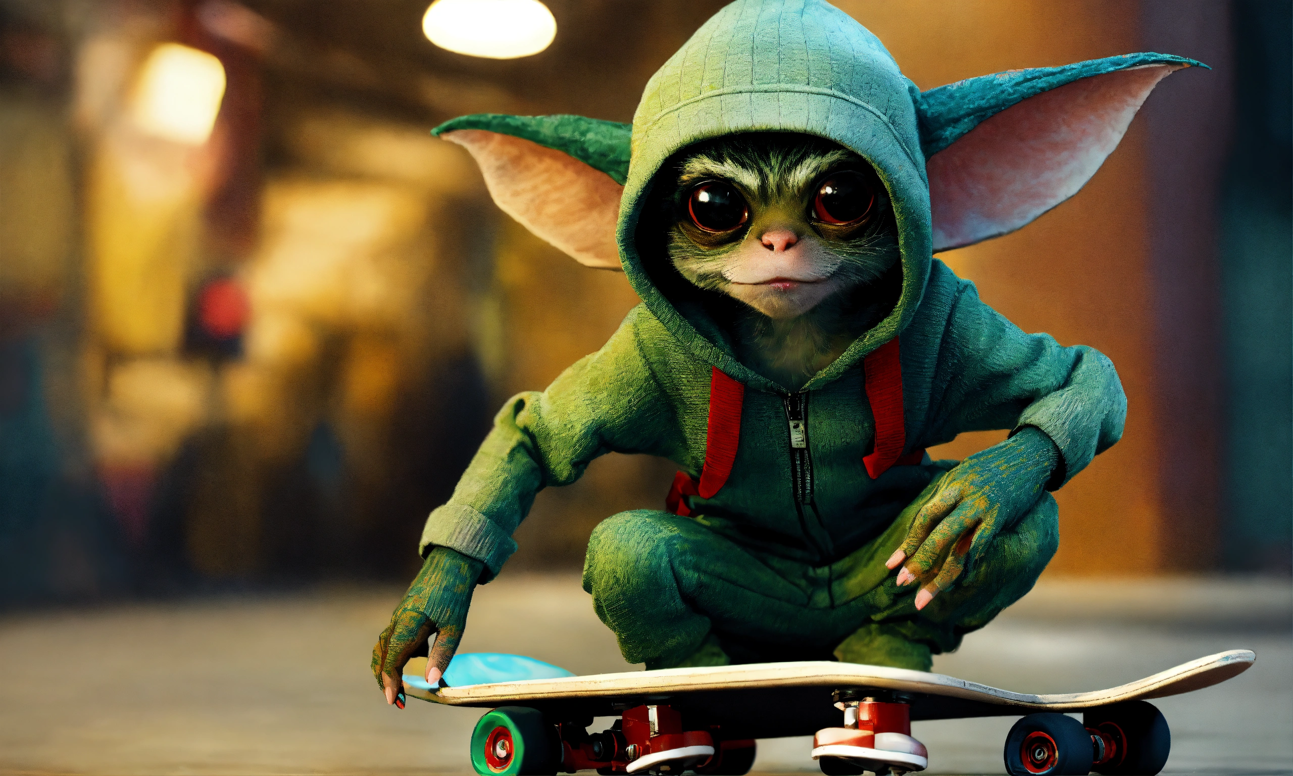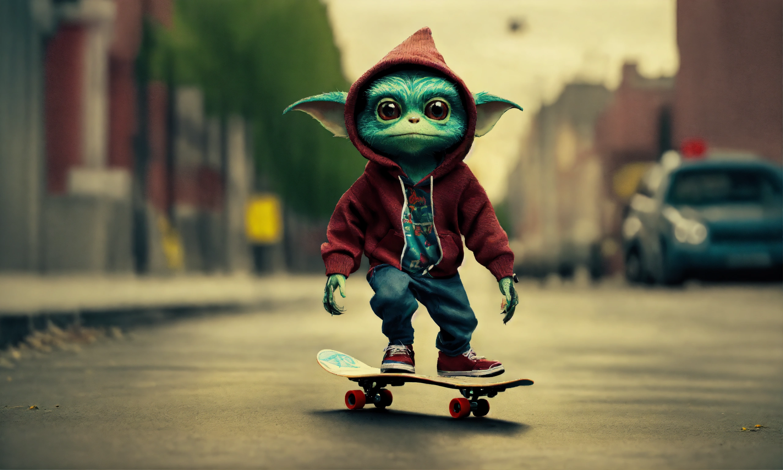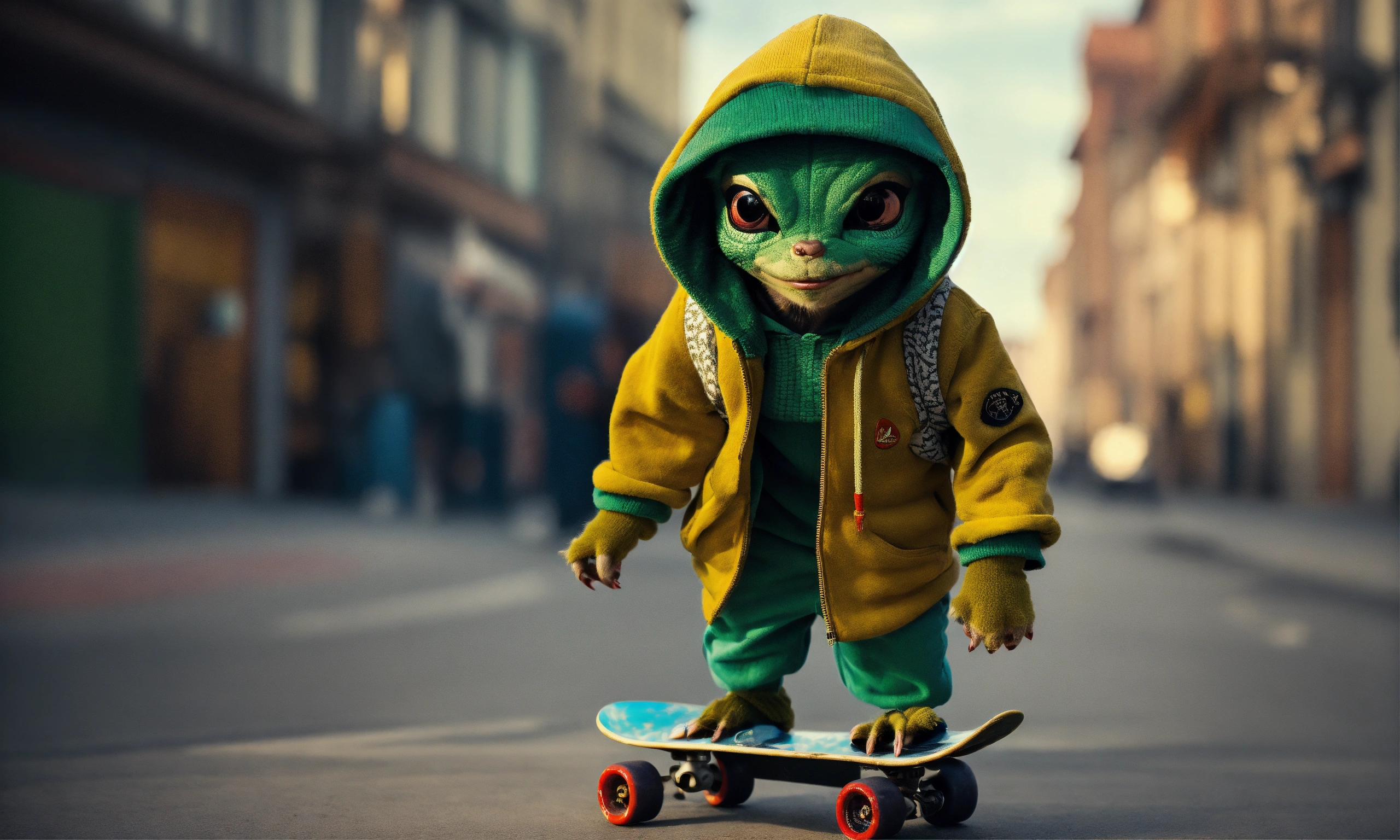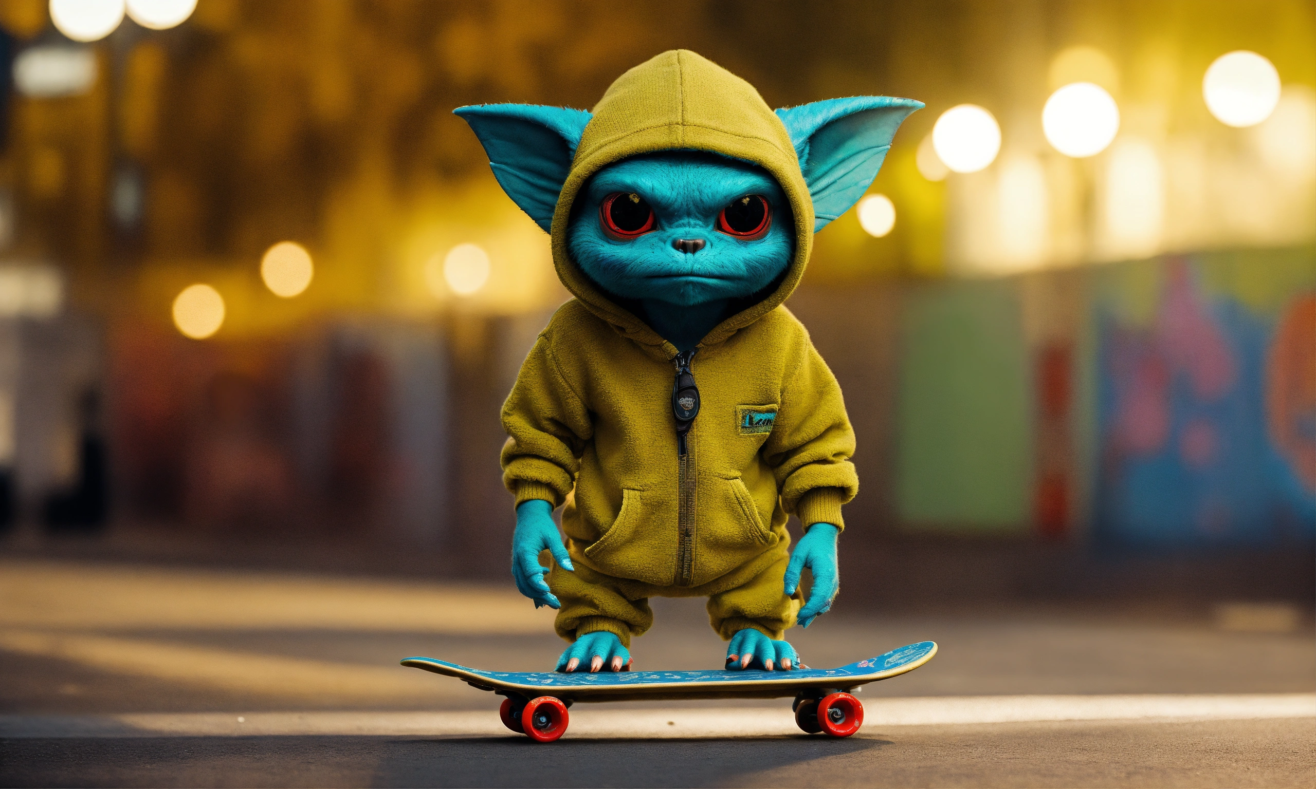 Leica portrait of a gremlin skateboarding, hoodie, coded patterns, sparse and simple, uhd image, urbancore, sovietwave, period snapshot
