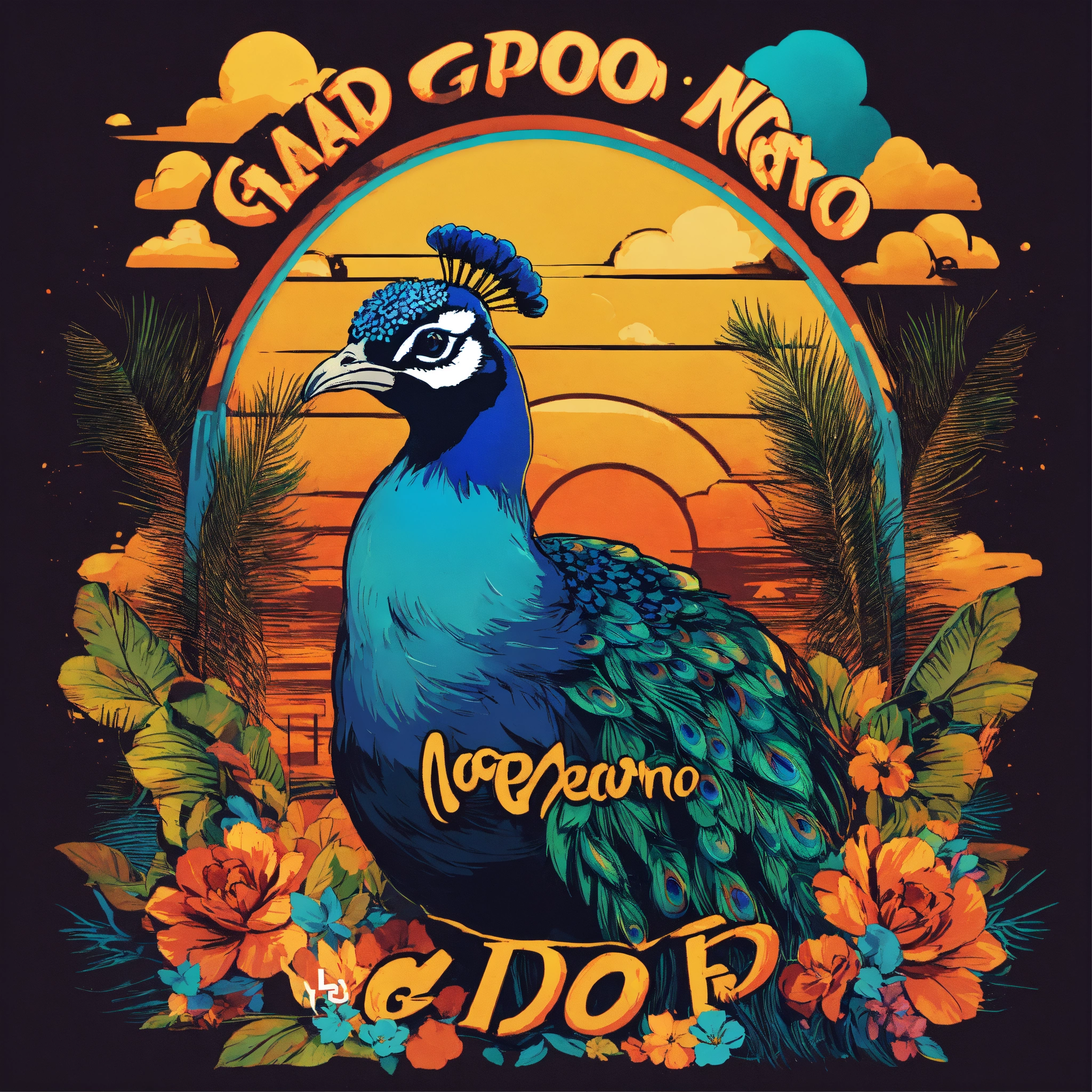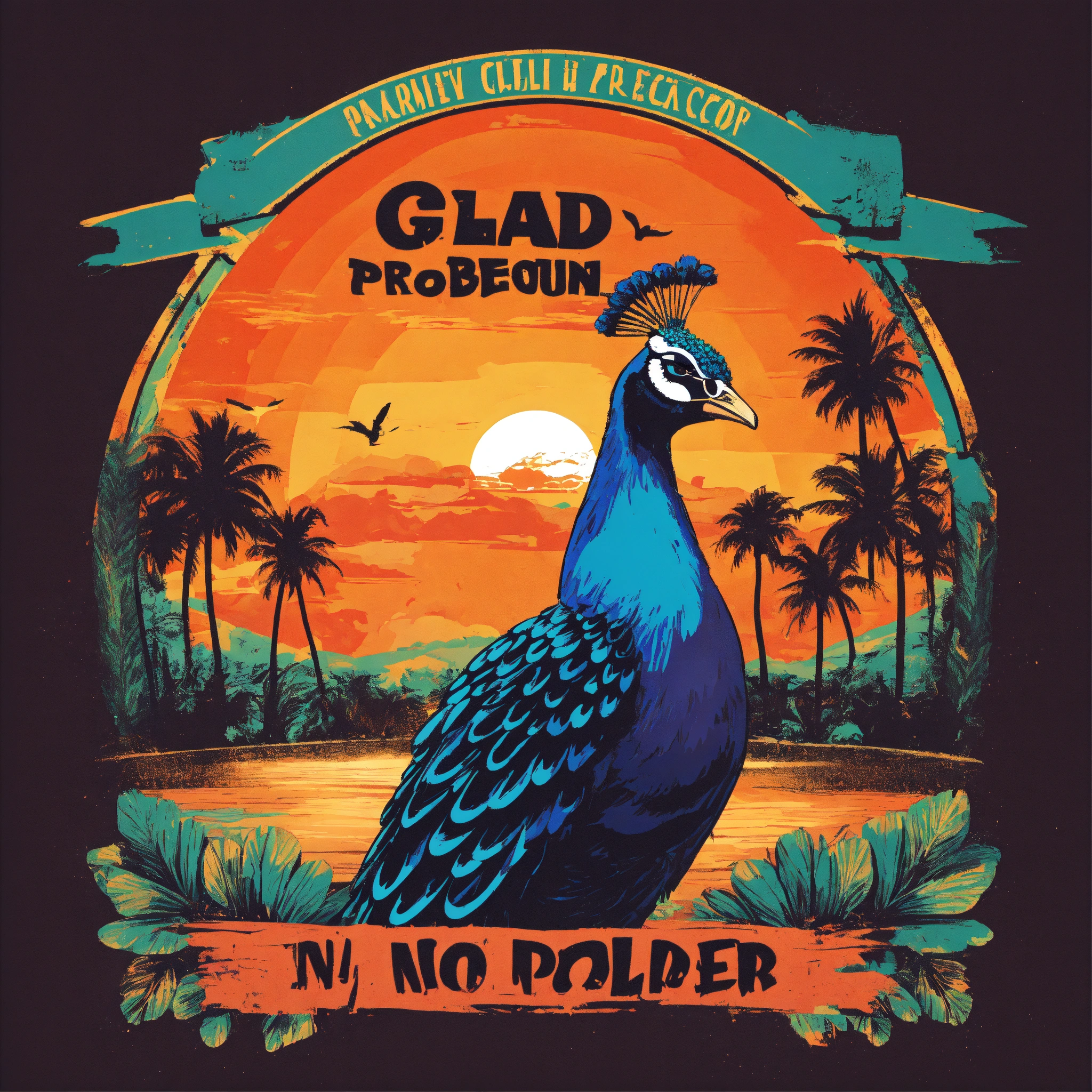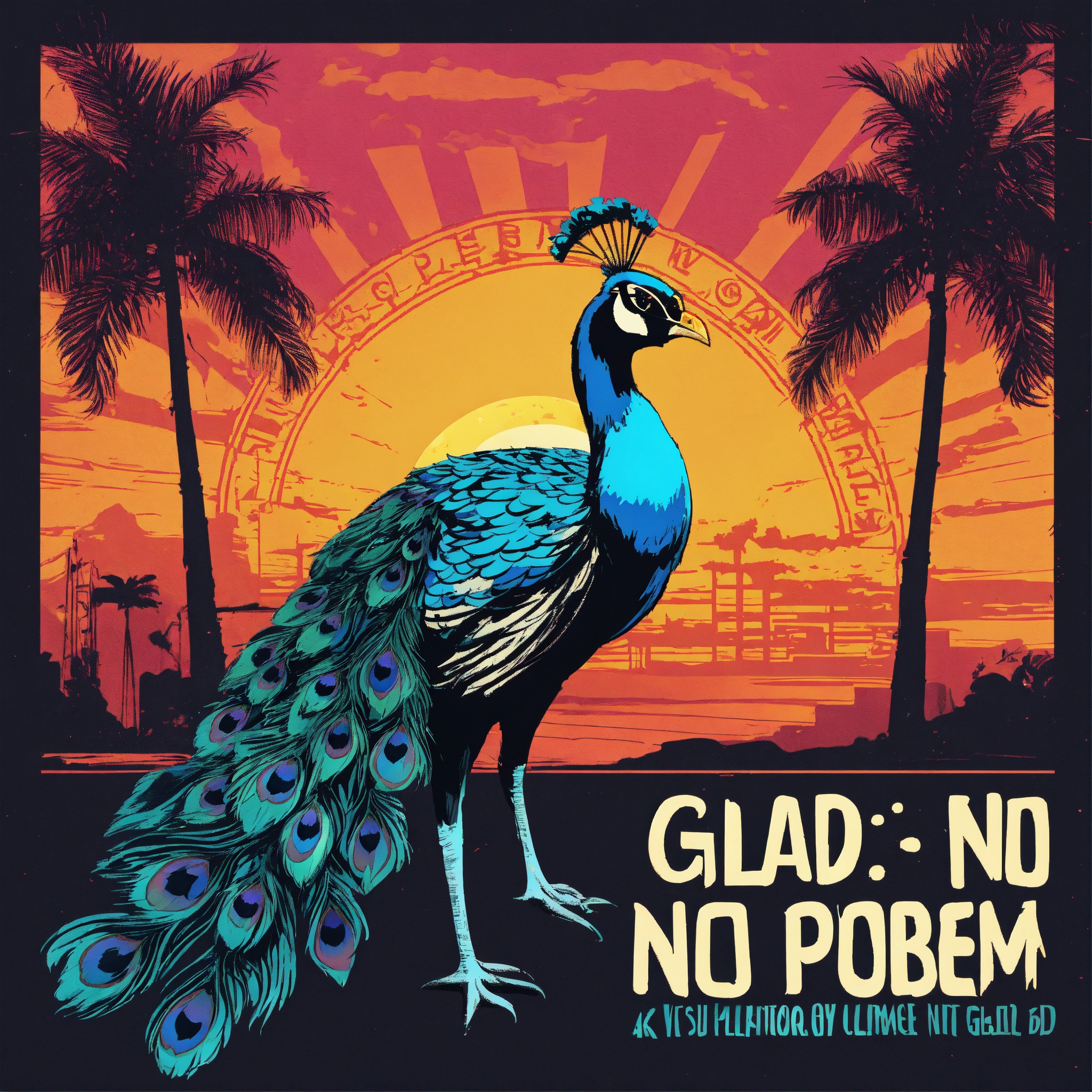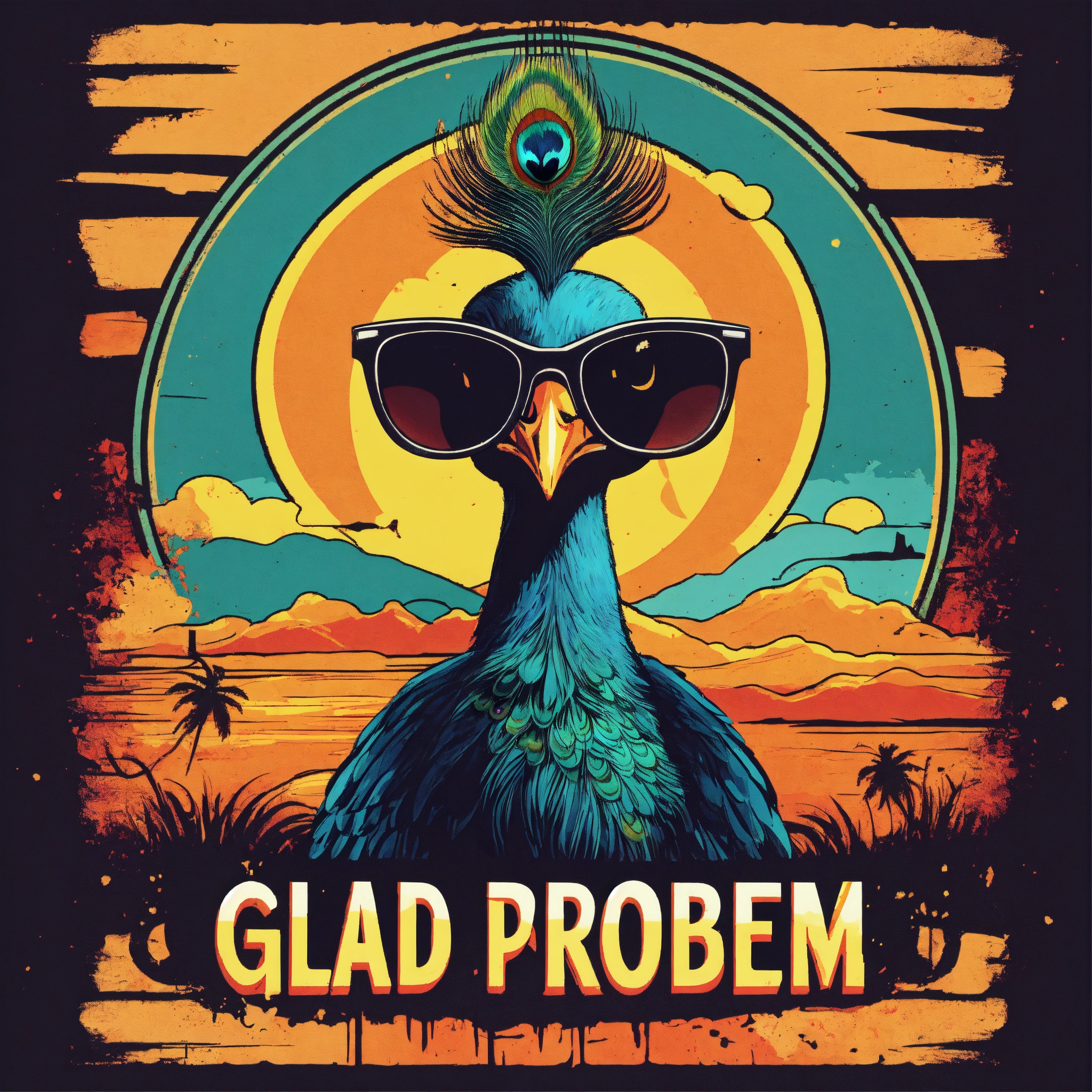 Vector t-shirt design vintage retro sunset distressed black style design, a cute peacock baby wearing sunglasses, with text “glad, no problem”, typography, graffiti, 3d render 4k, 4k, poster, 3d render