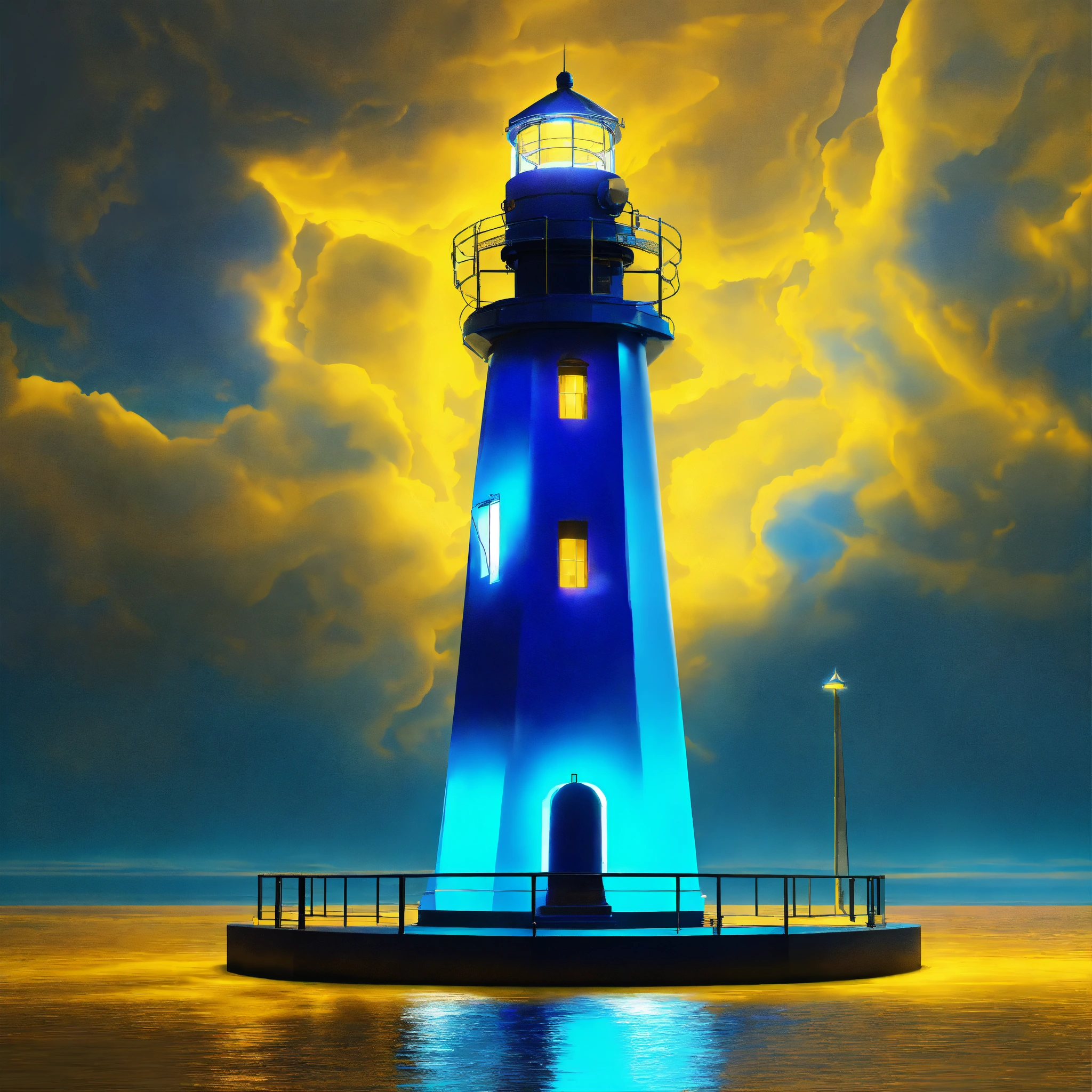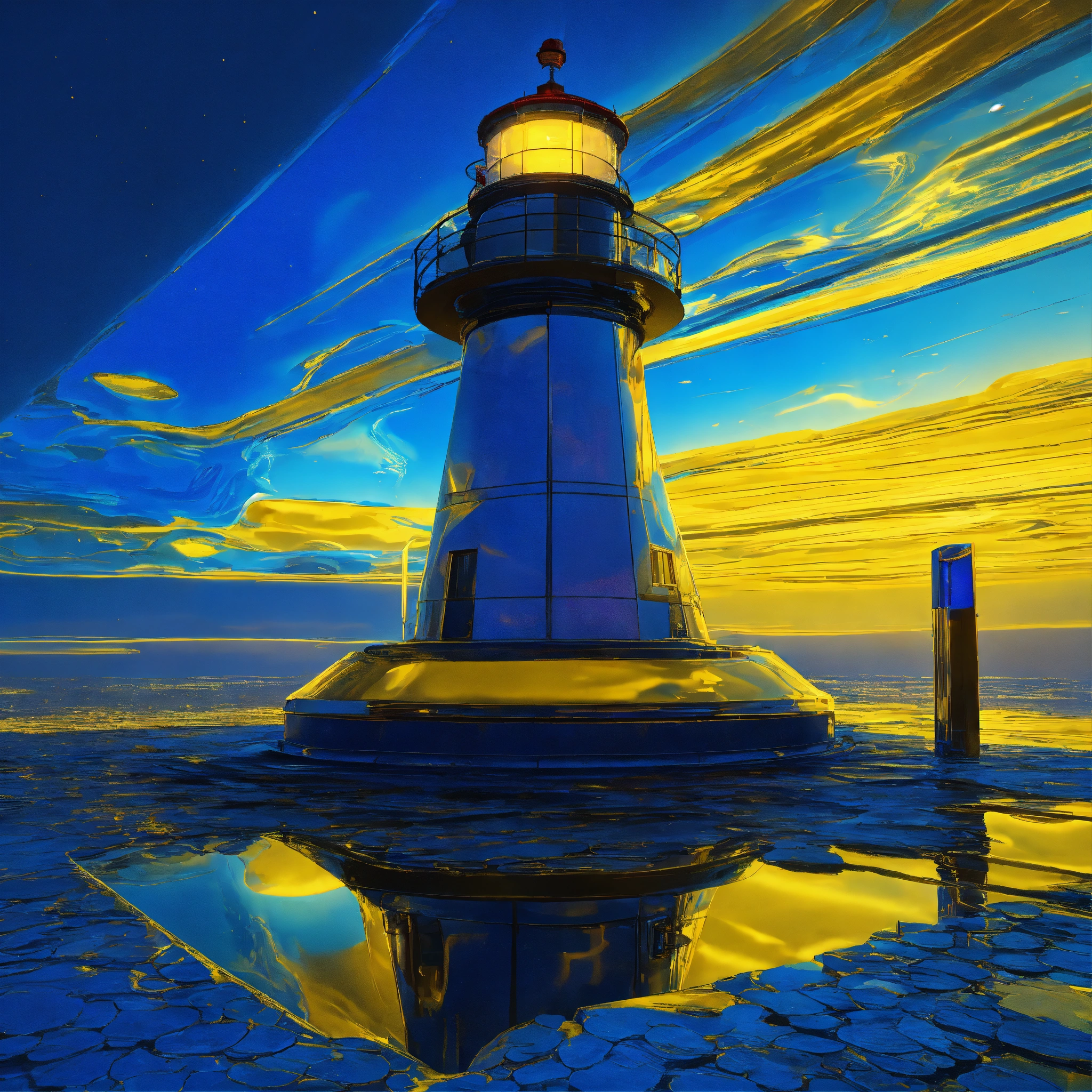 Metallic and glassy surface, vivid tones of blue and yellow, surreal futuristic neat object, heavenly light and intense neon lights, a lighthouse. one abstract representative object floating --ar 169 --s 1000 --c 15