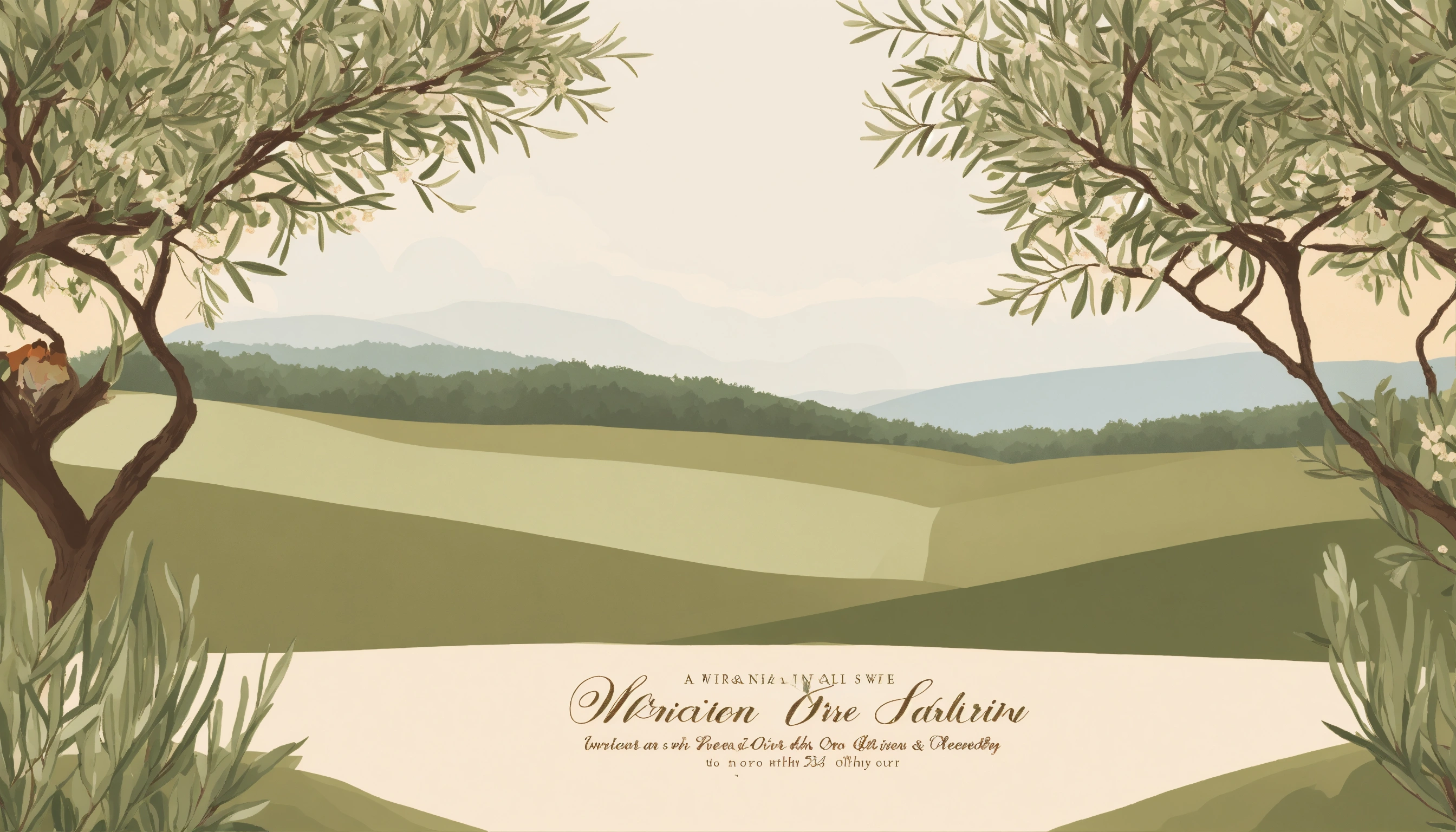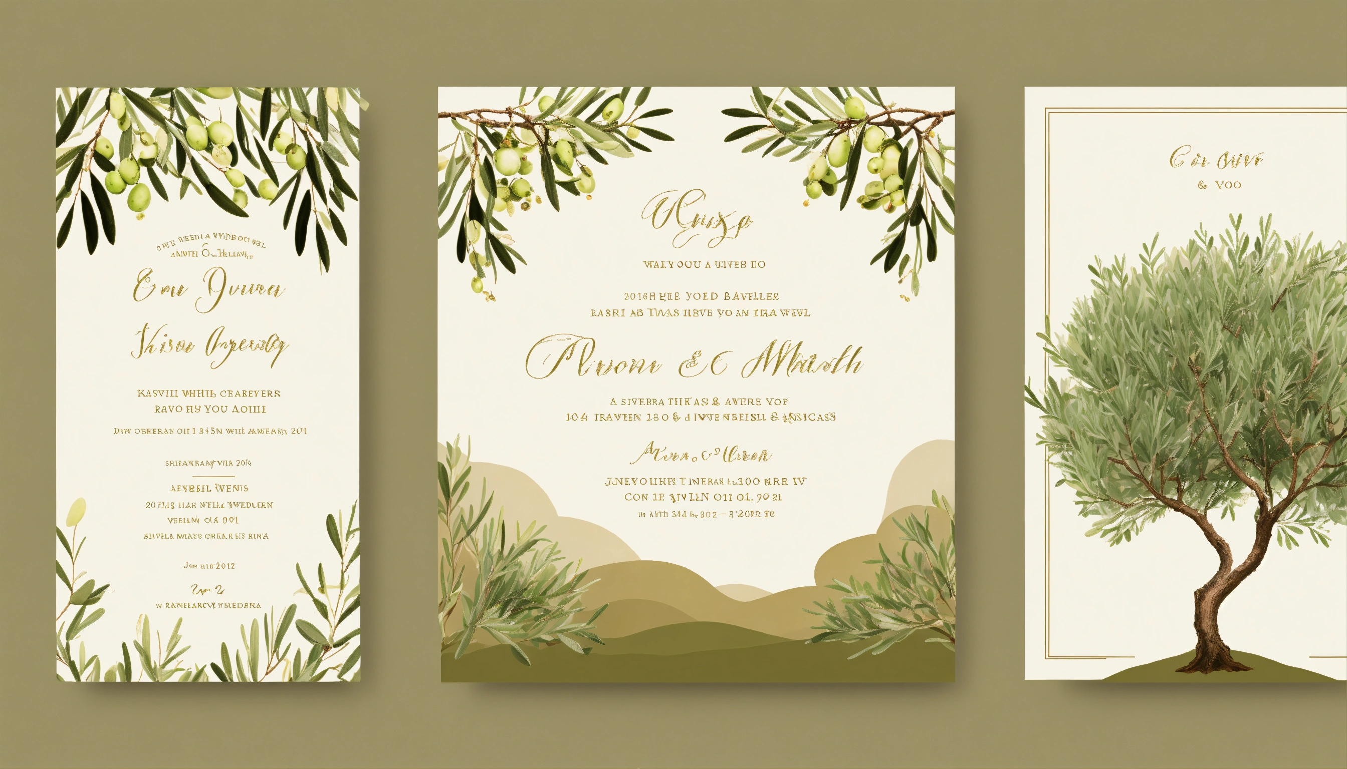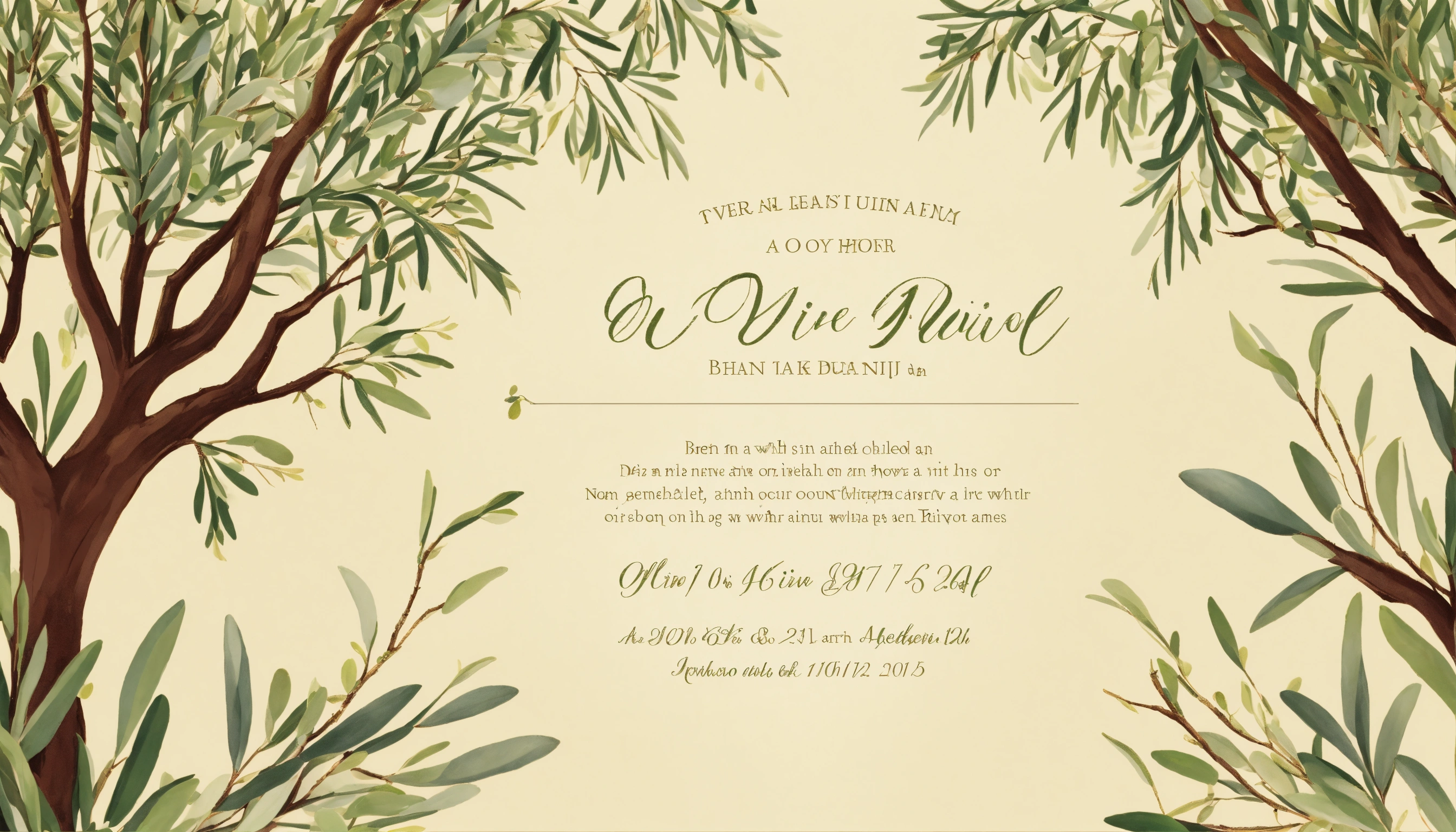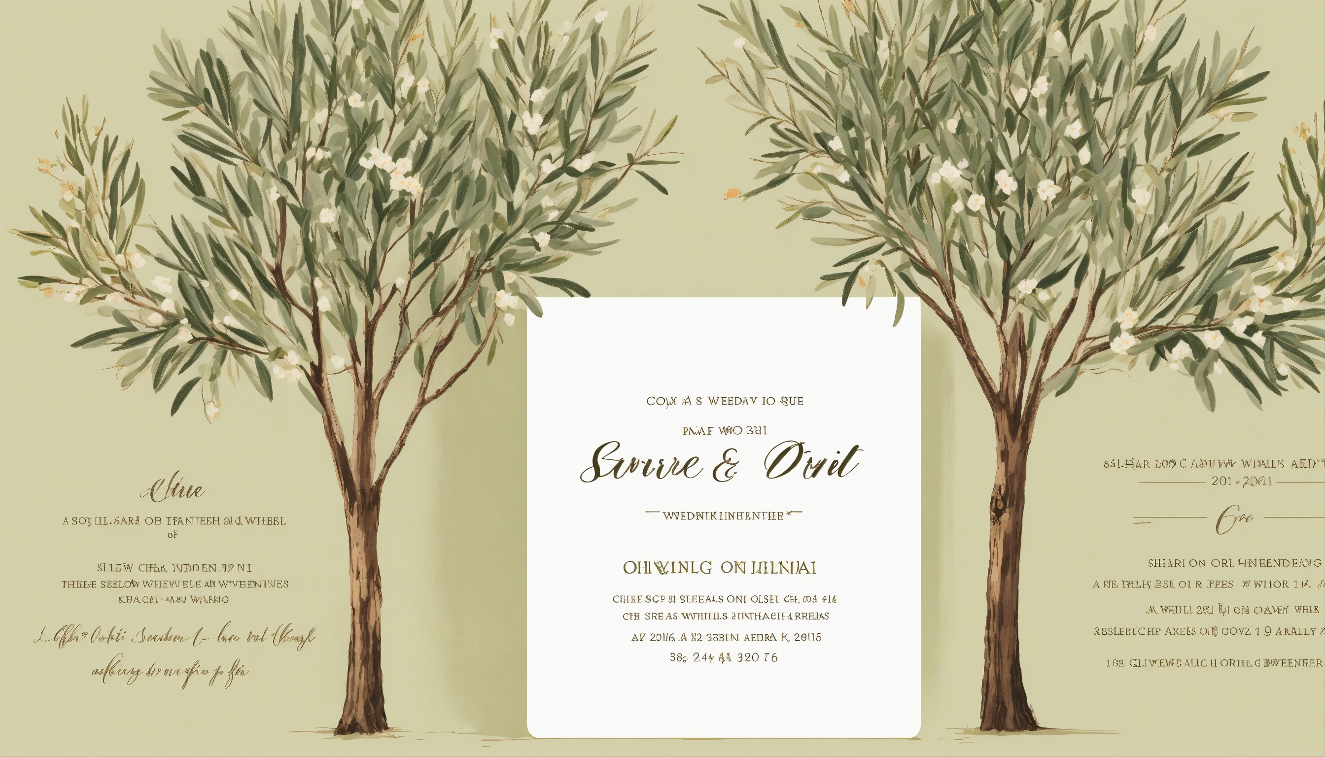 A wedding invitation with a white background and branches of an olive trees