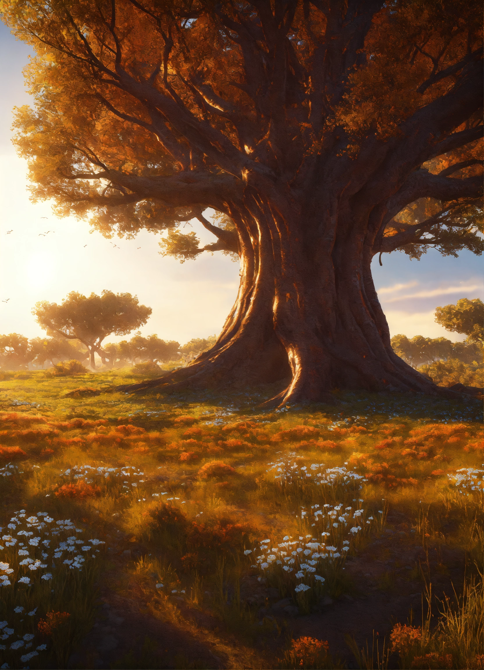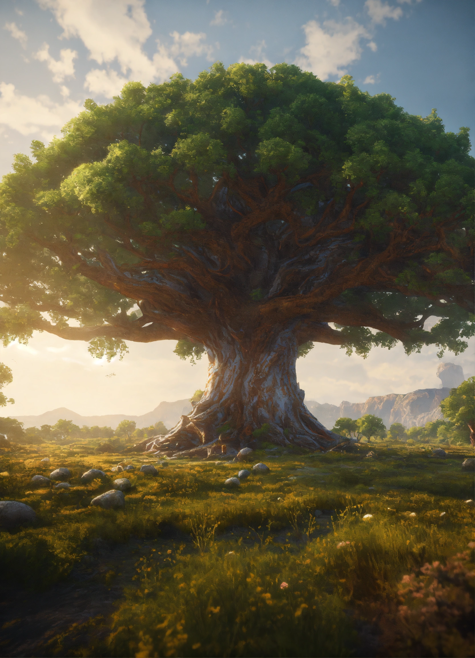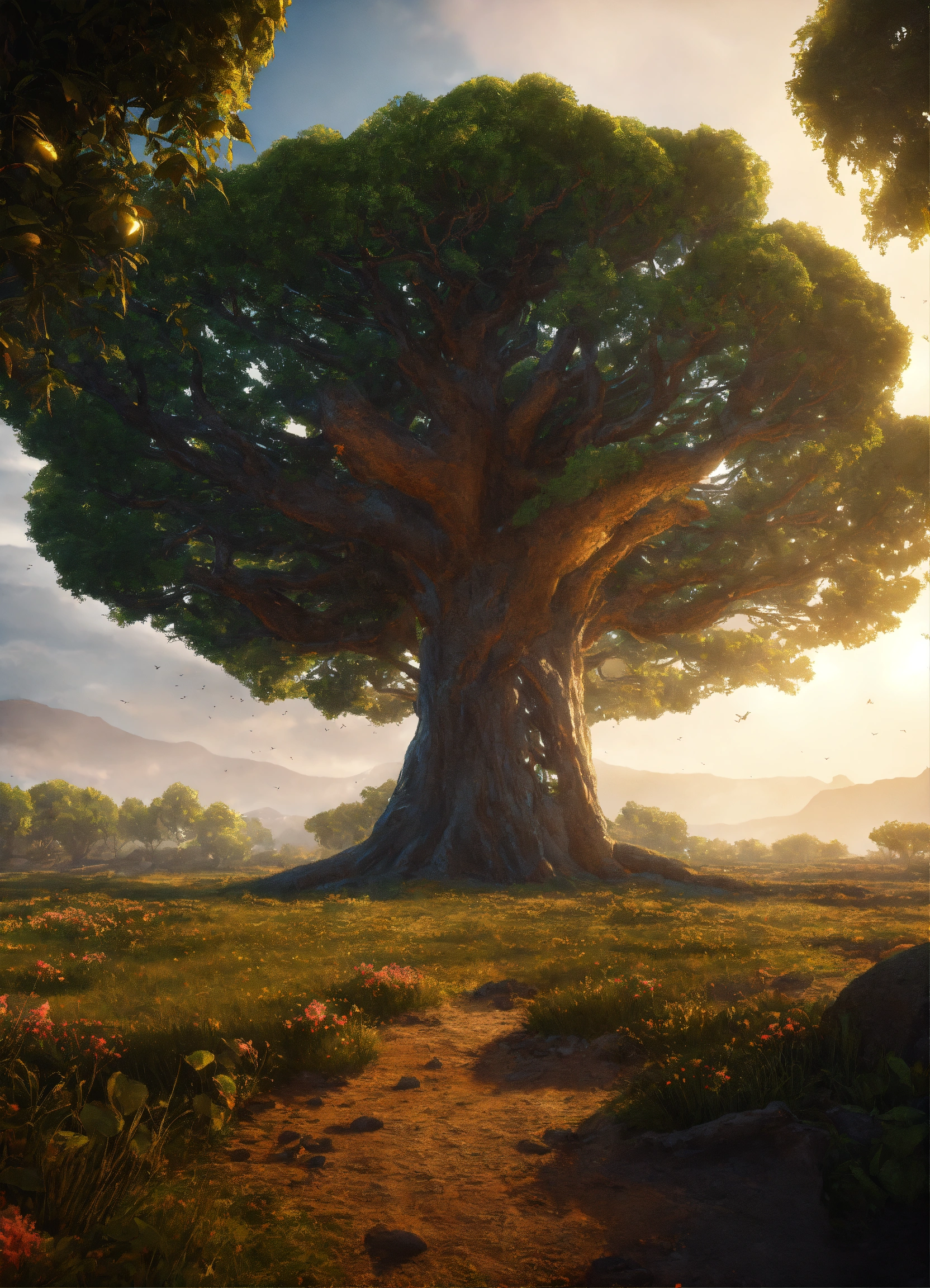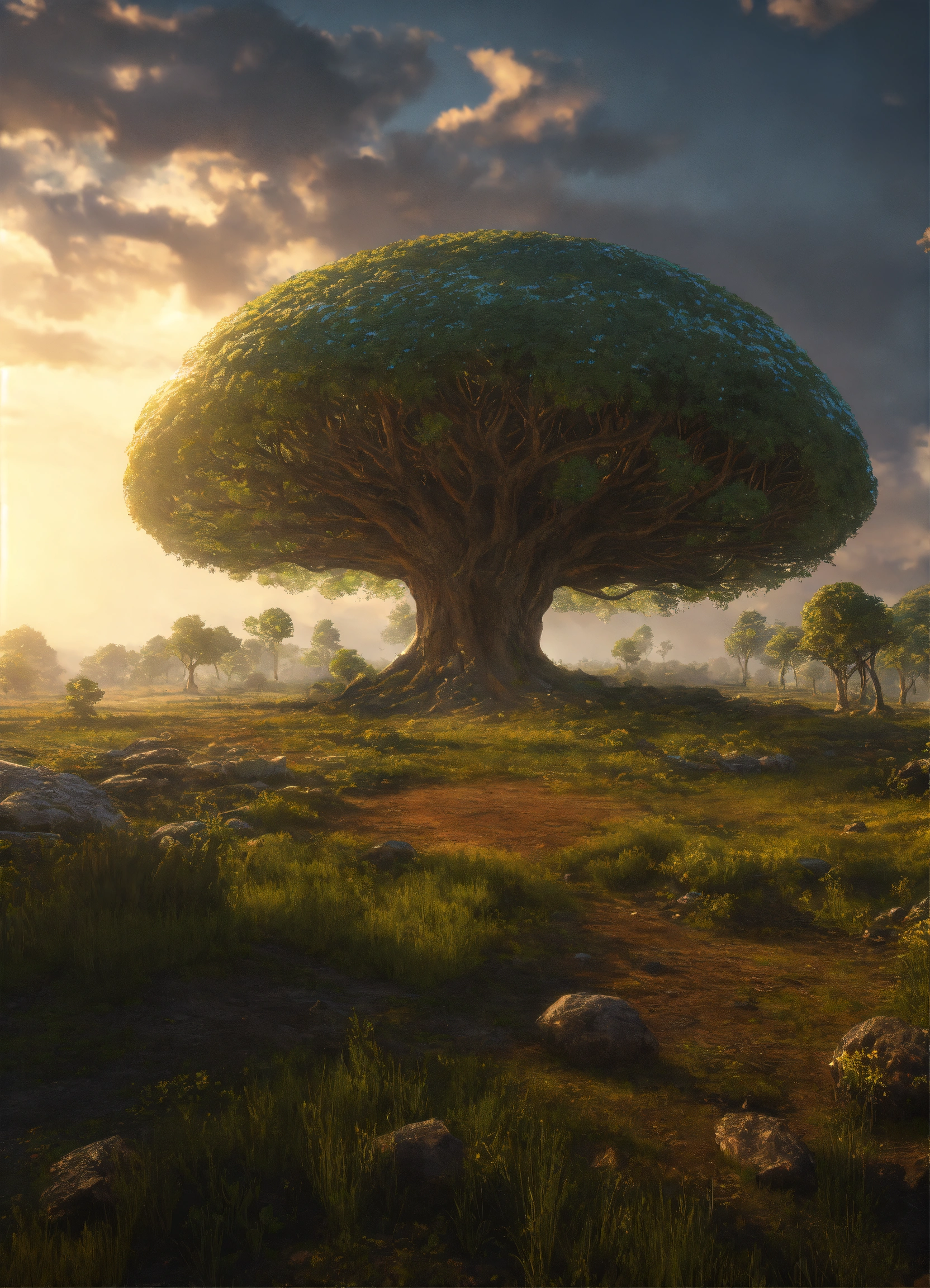 Alien world, large open field, massive tree of life, cinematic style, high detail, hr, realistic physics, photorealistic, unreal engine, hdr, 8k