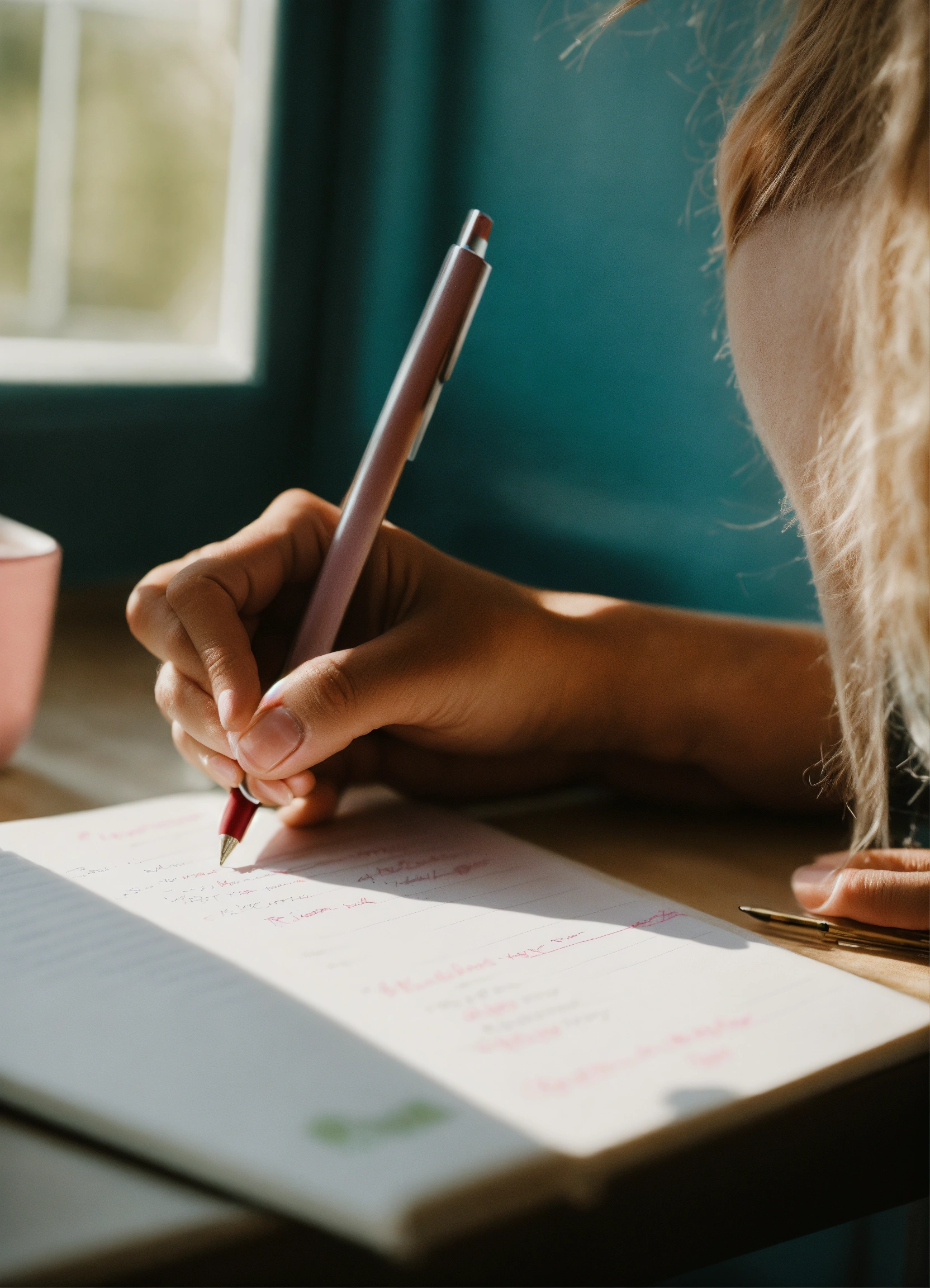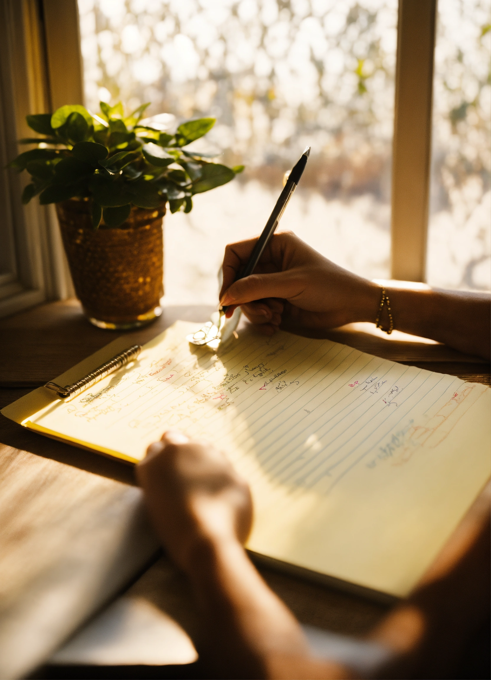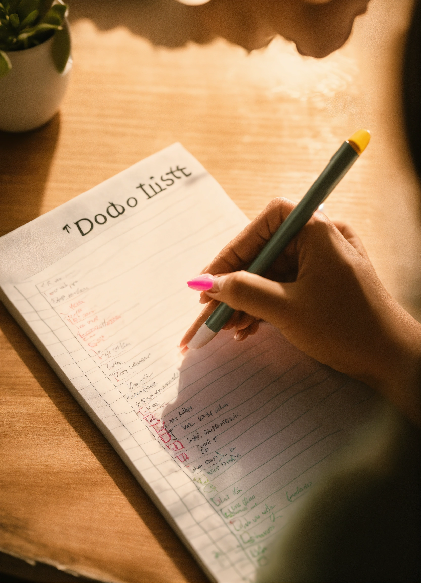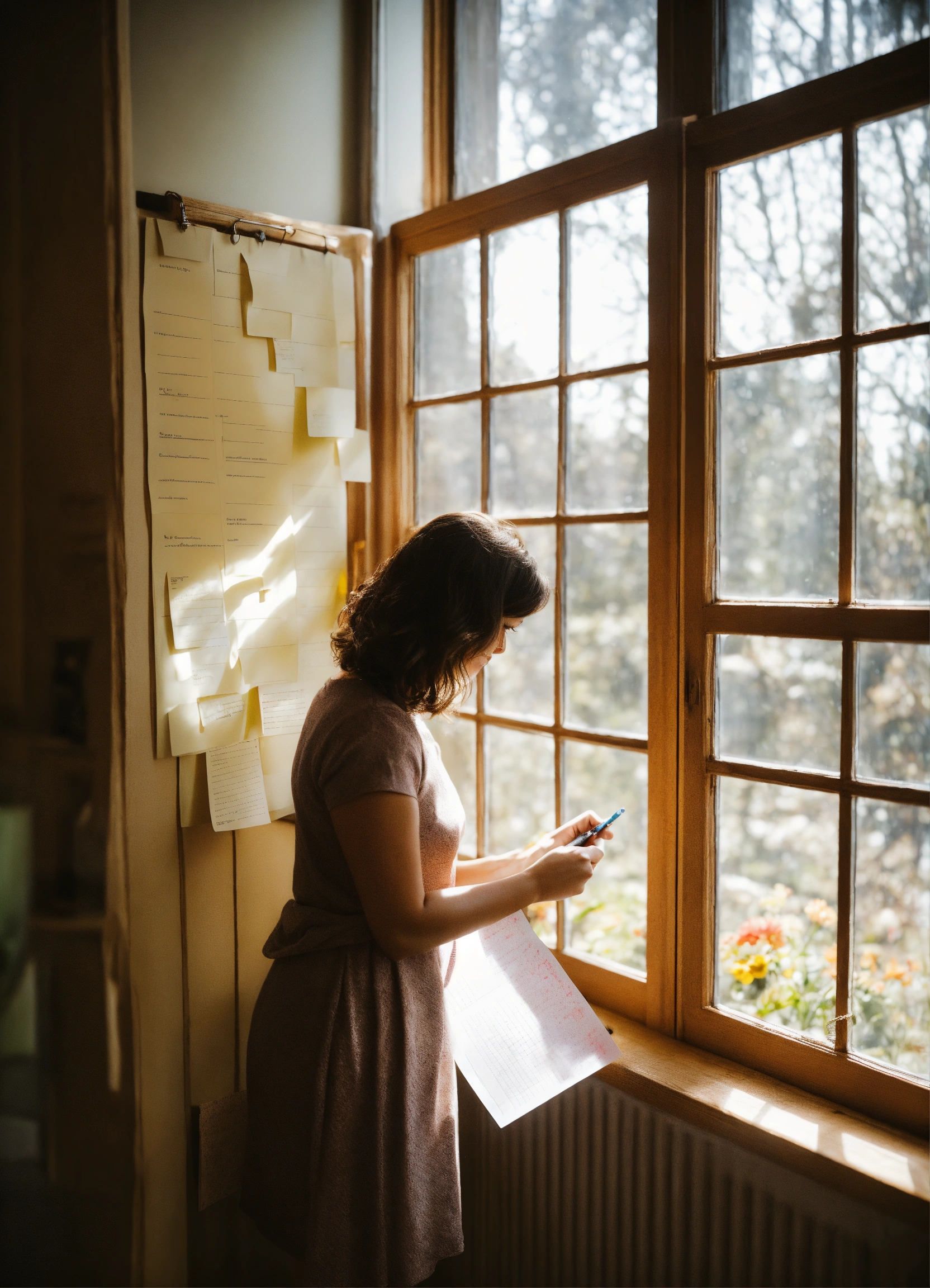 A woman's hand checking off a to do list, she is marking off the last one on the list, the photo has a soft feel with light coming in through a window