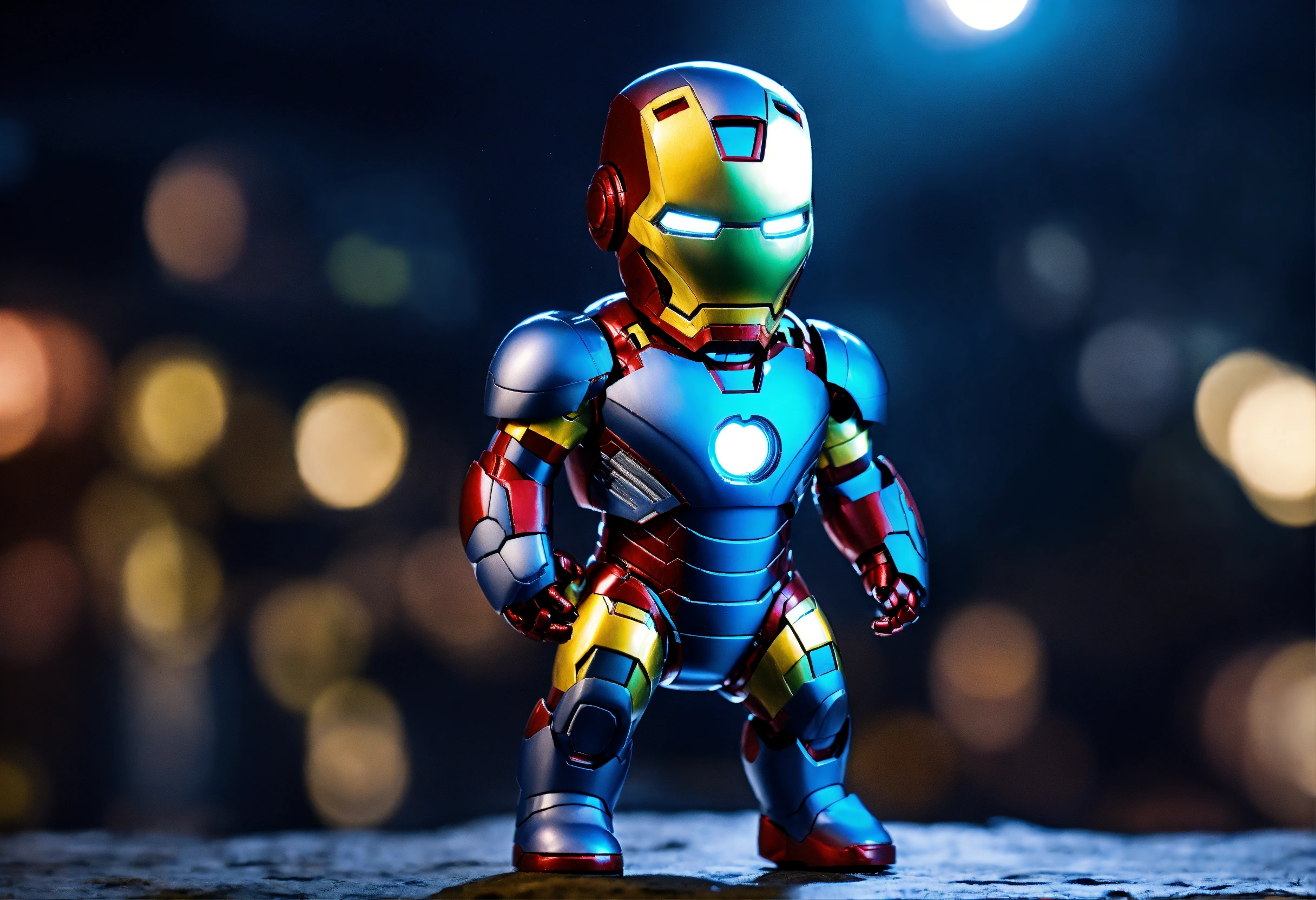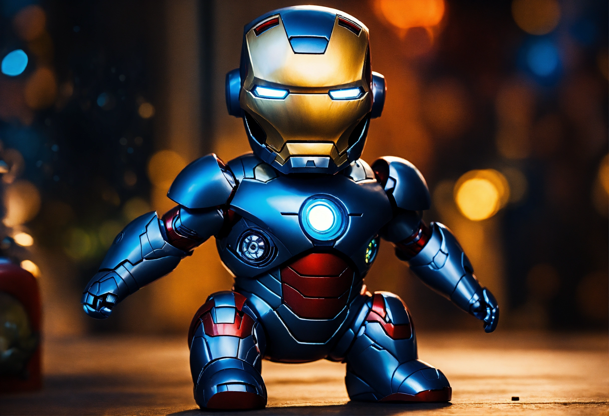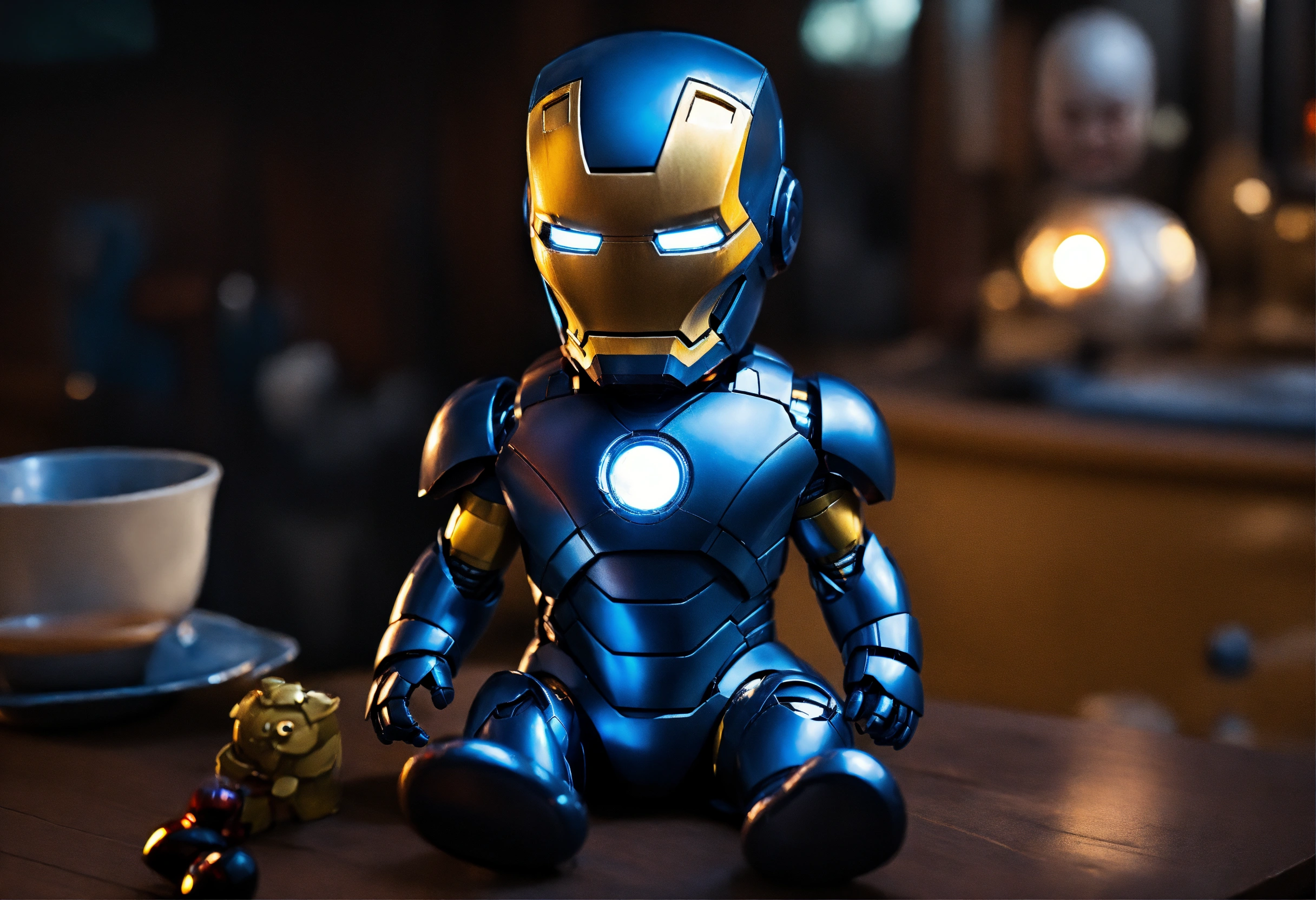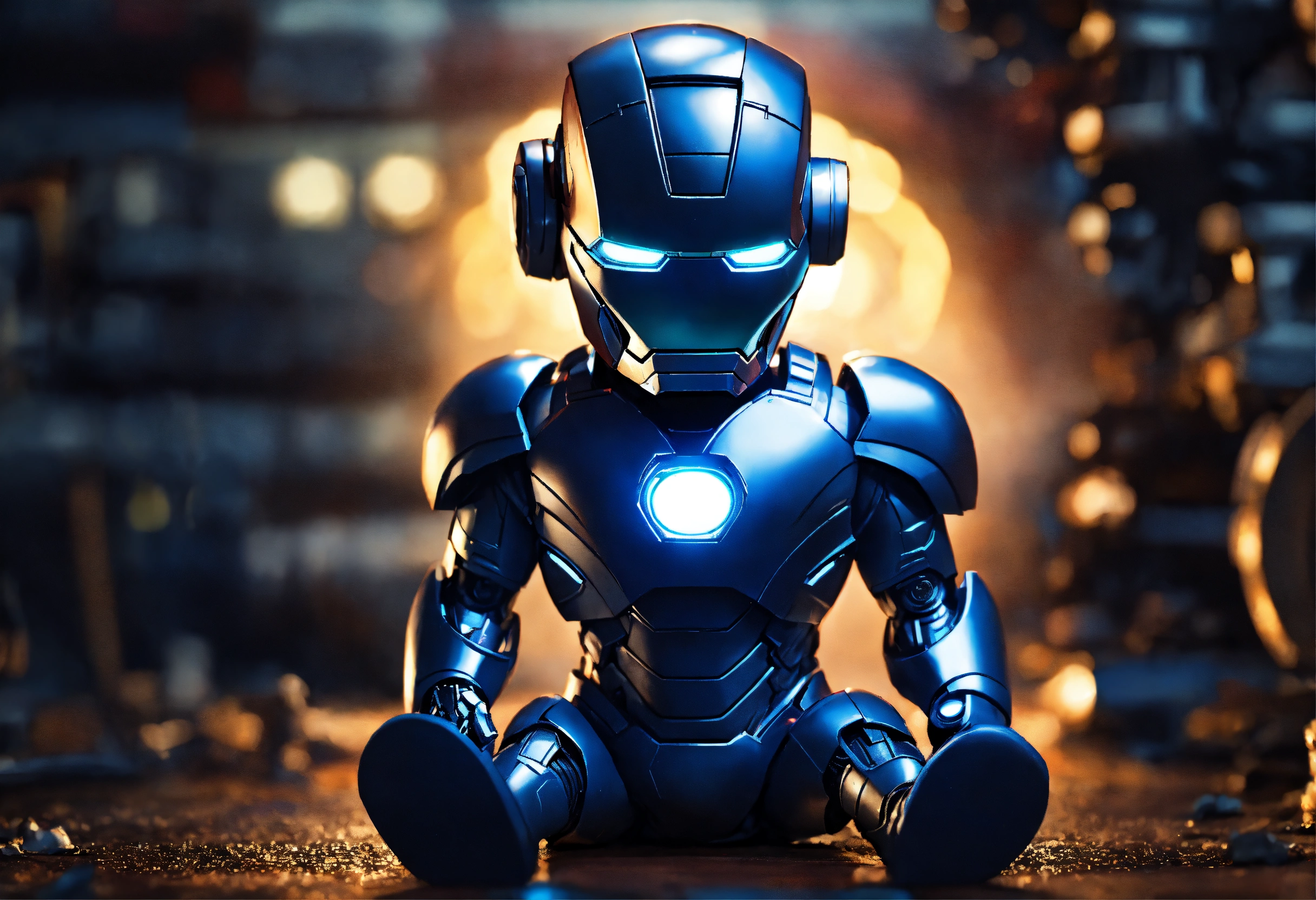 Very cute, realistic iron man baby cute with many eyes standing in background midnight blue, dark and mysterious.