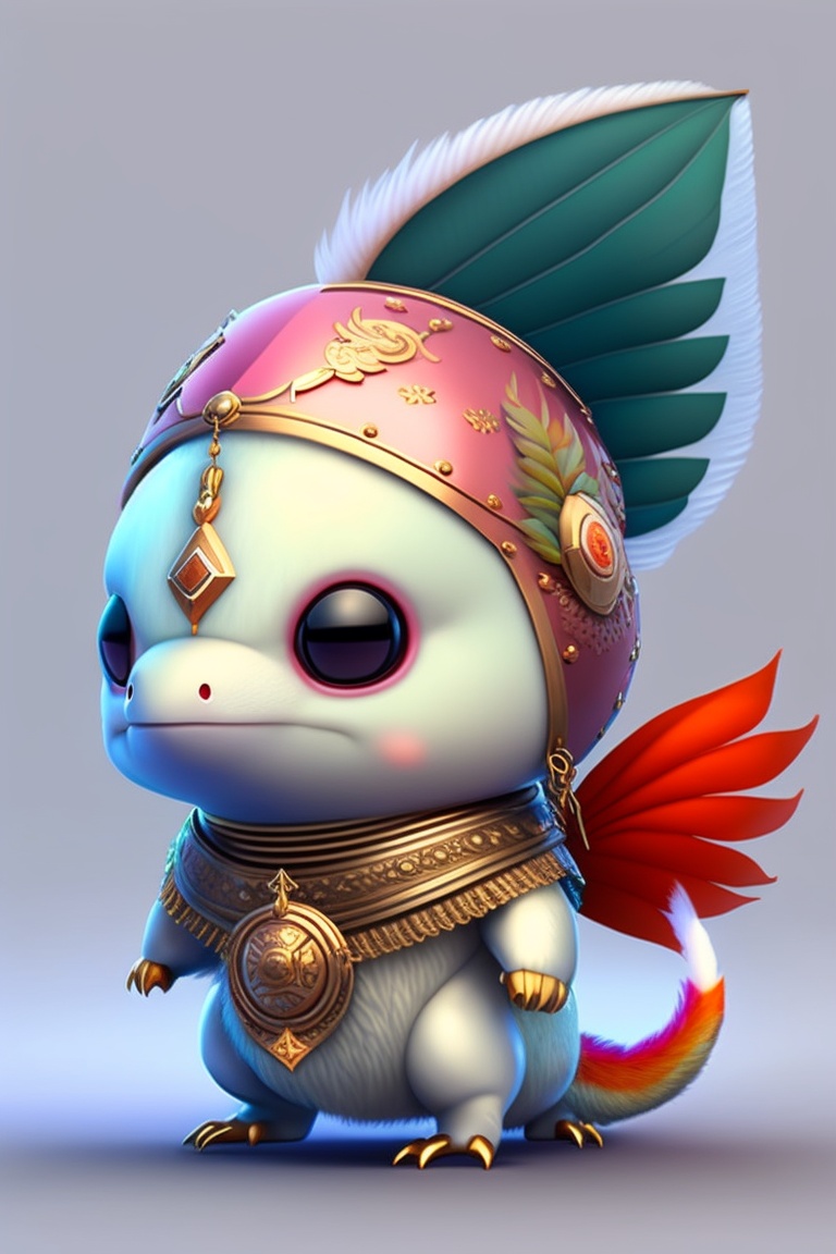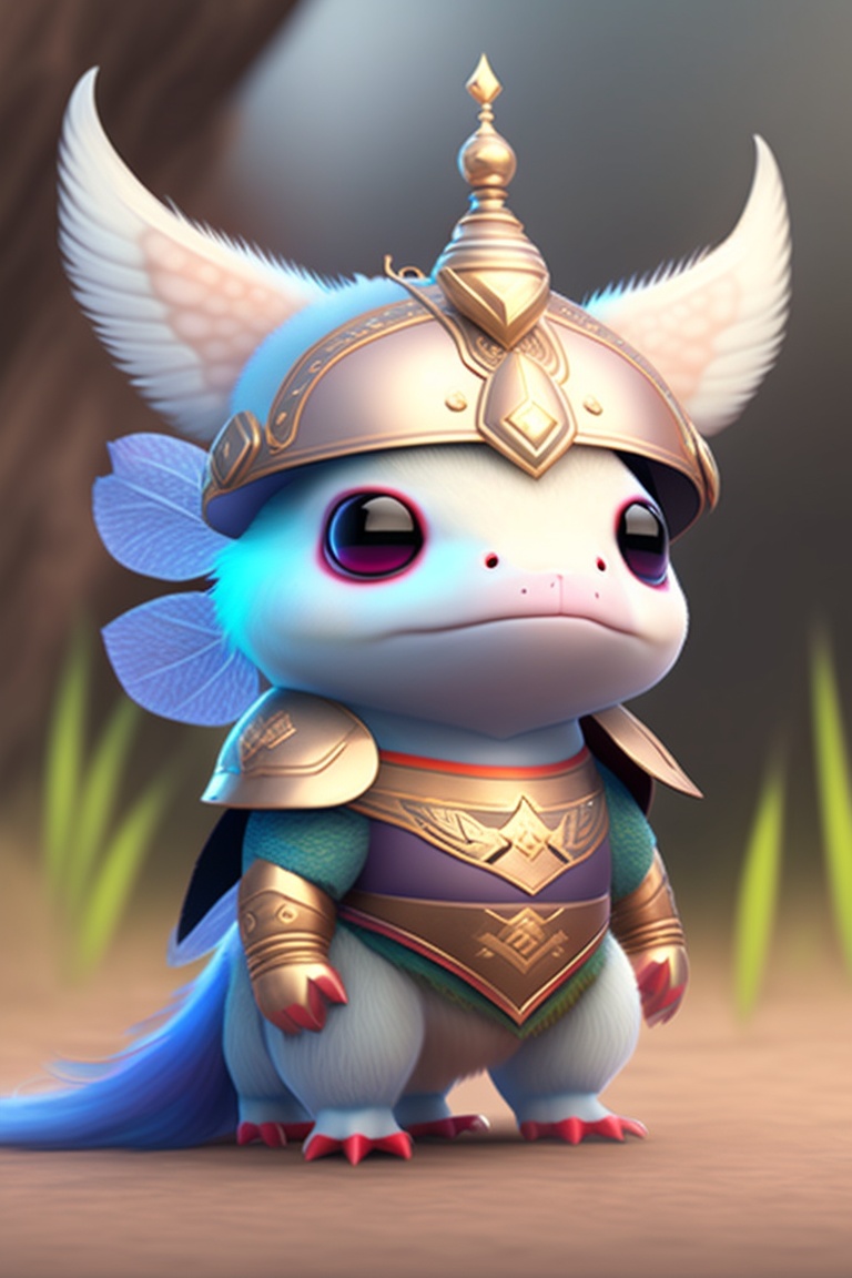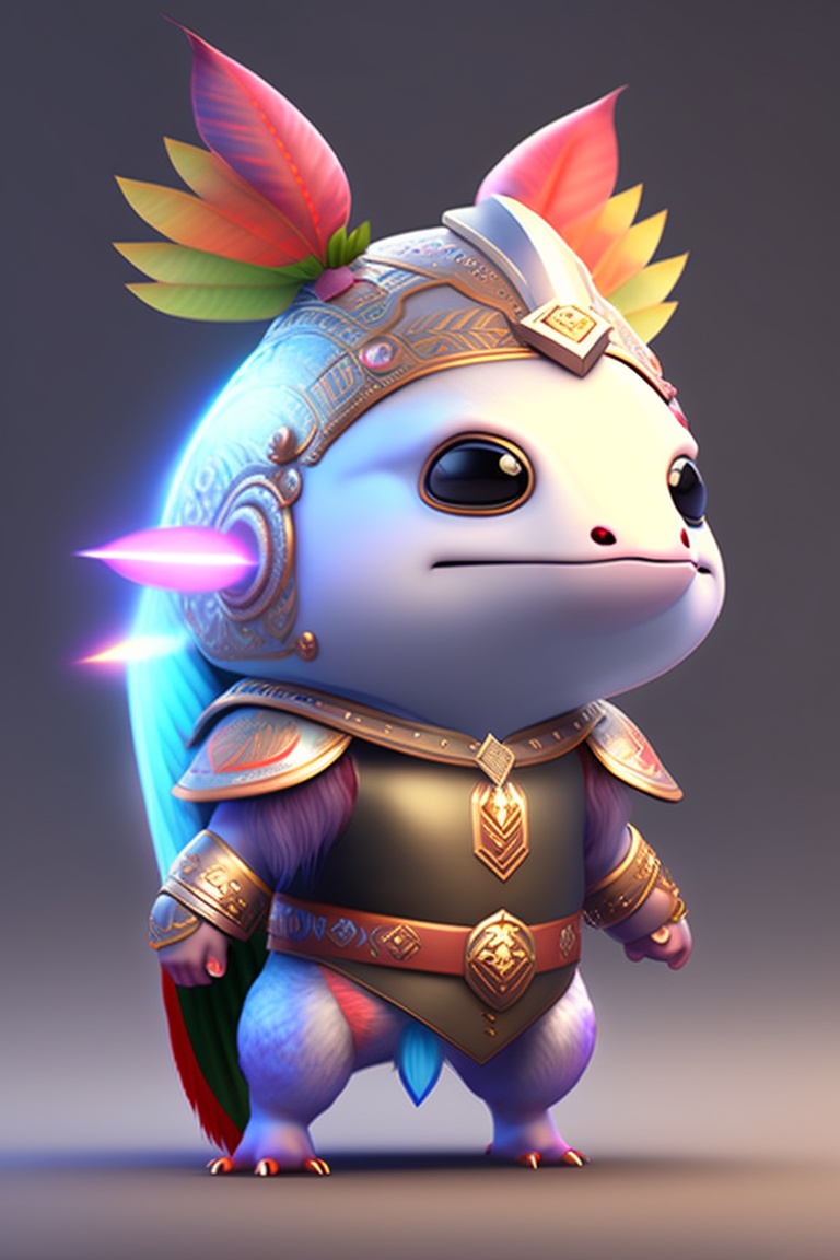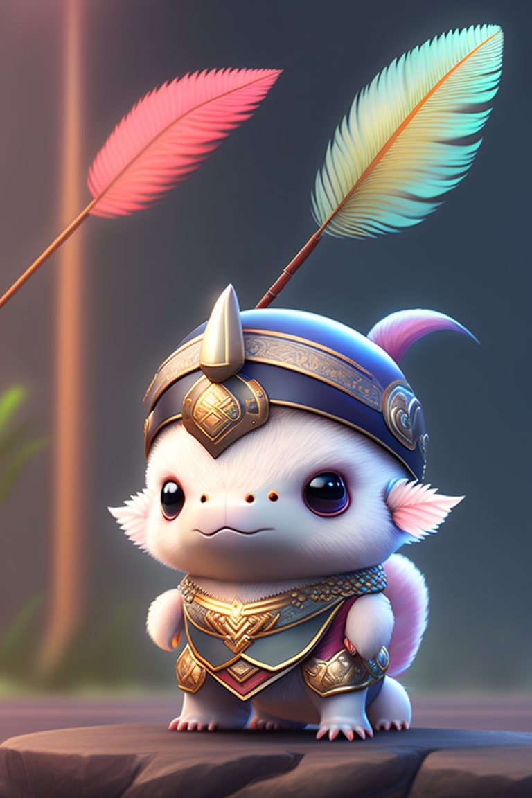 Cute and affectionate axolotl warrior with big eyes, muscular body, bone and feather armor, a large feather crest on the head, macuahuitl in the left arm, and a shield in the right arm.