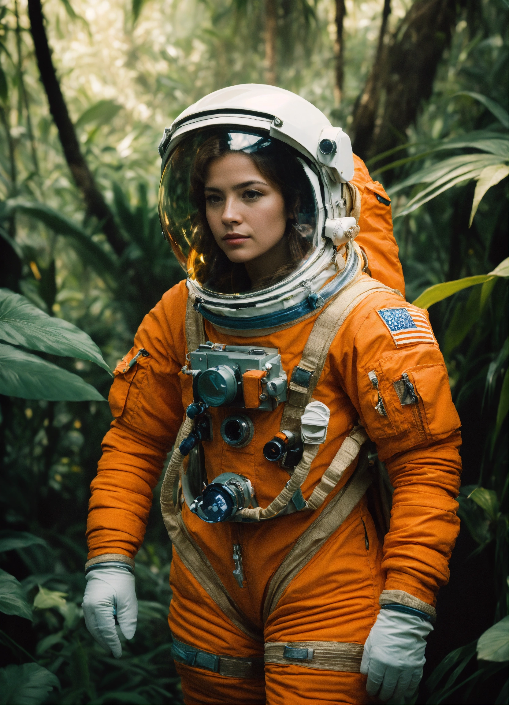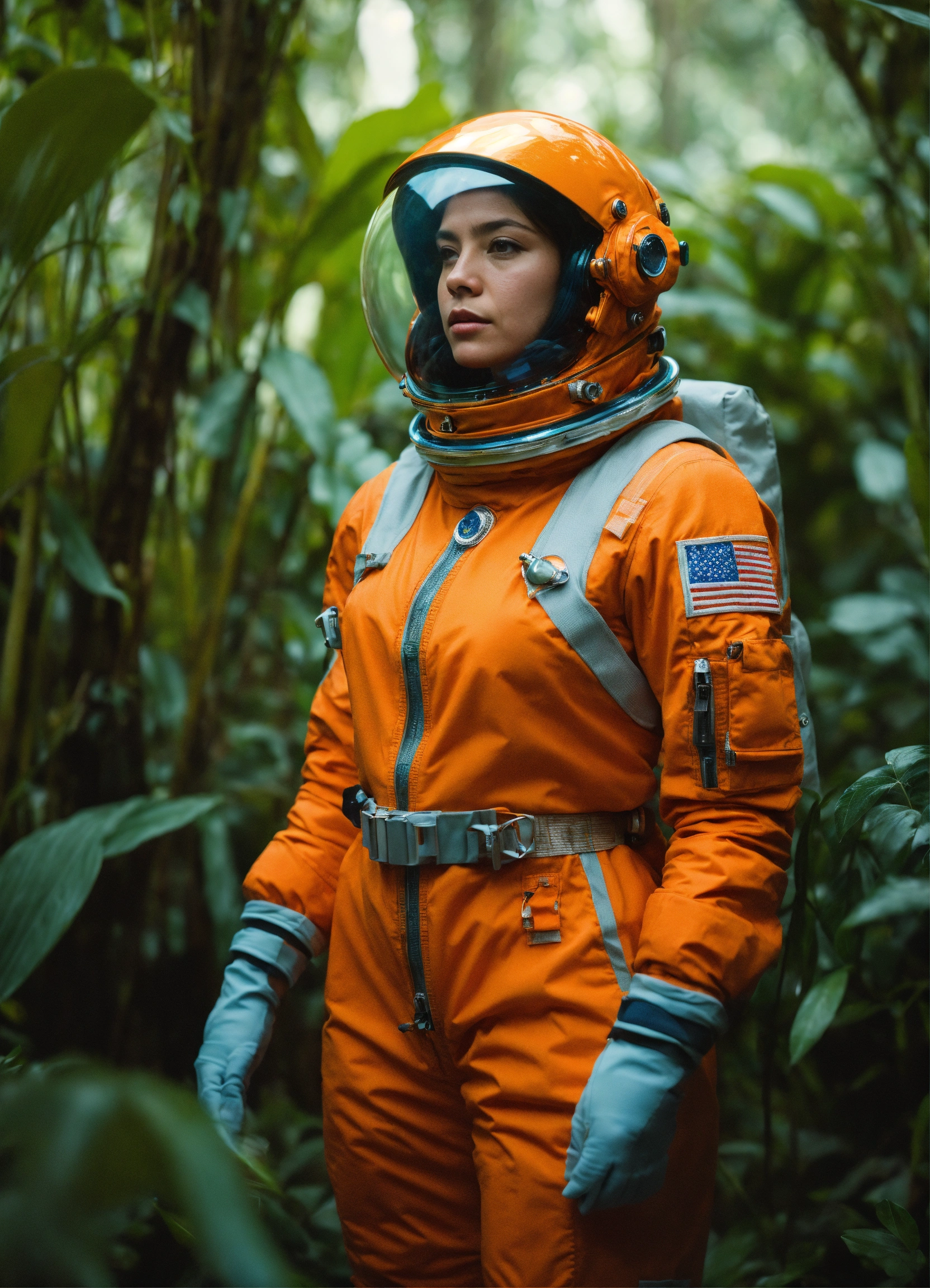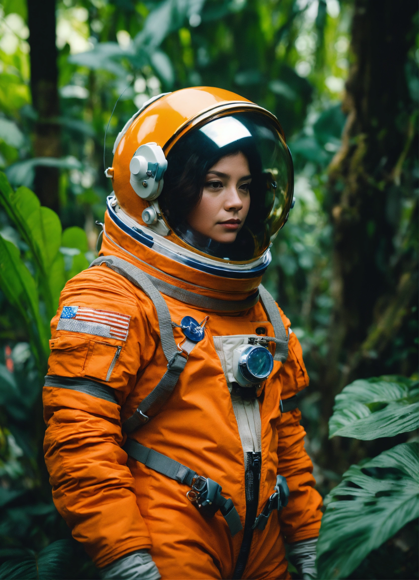 Medium-full shot, muted photo portrait titled "female astronaut in a jungle", tangerine space suit, muted palette, detailed, 8k, reflections