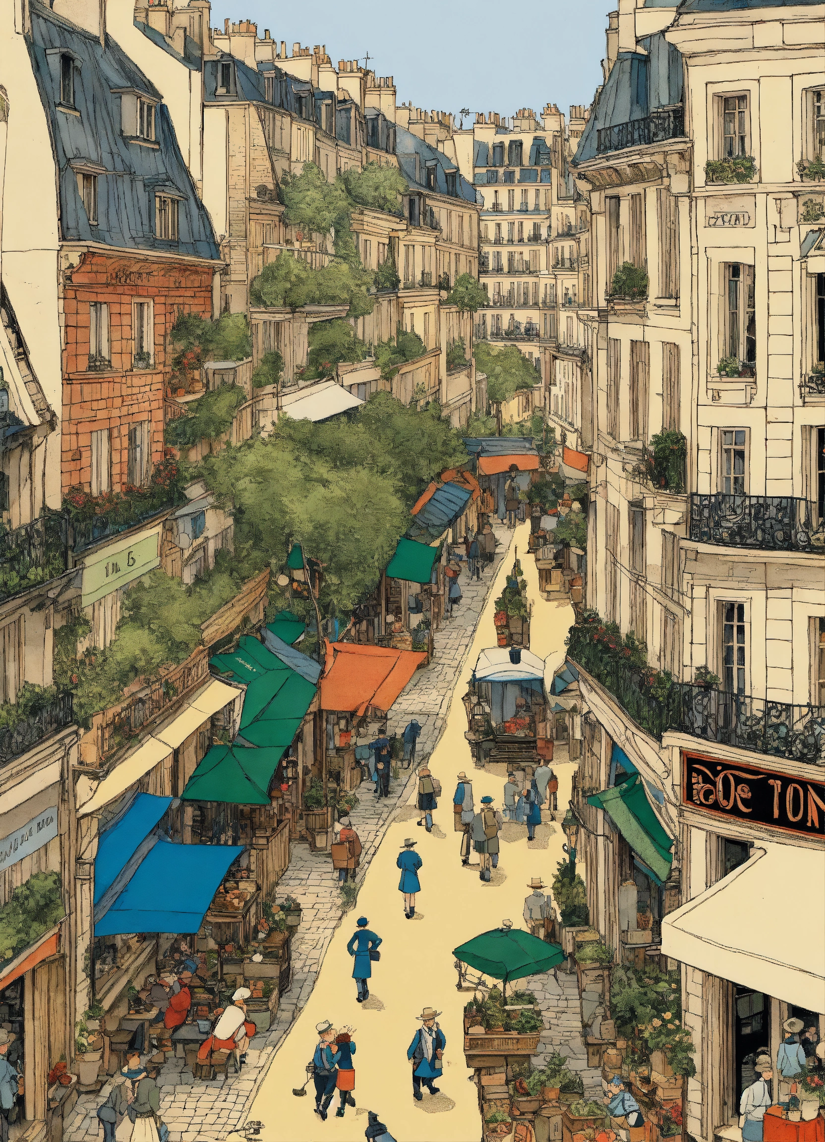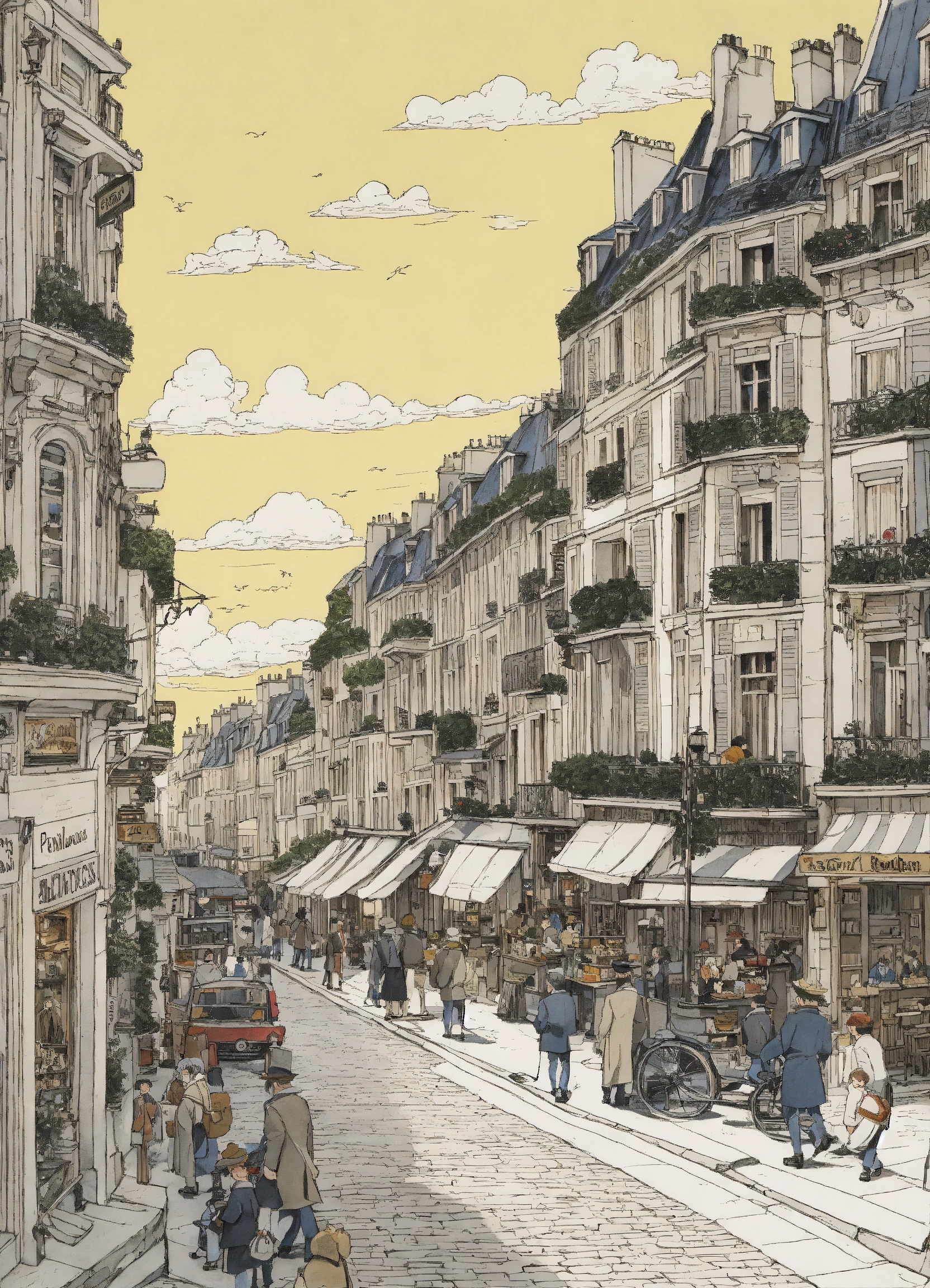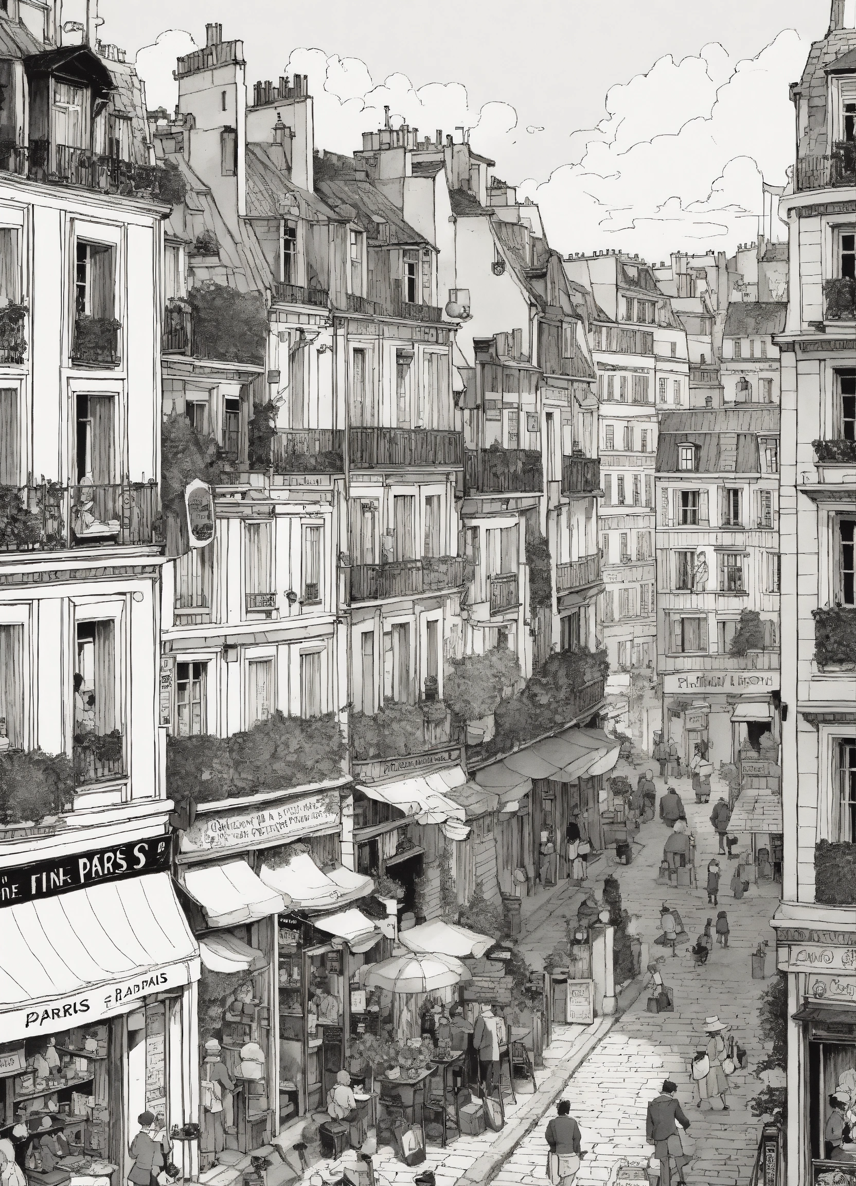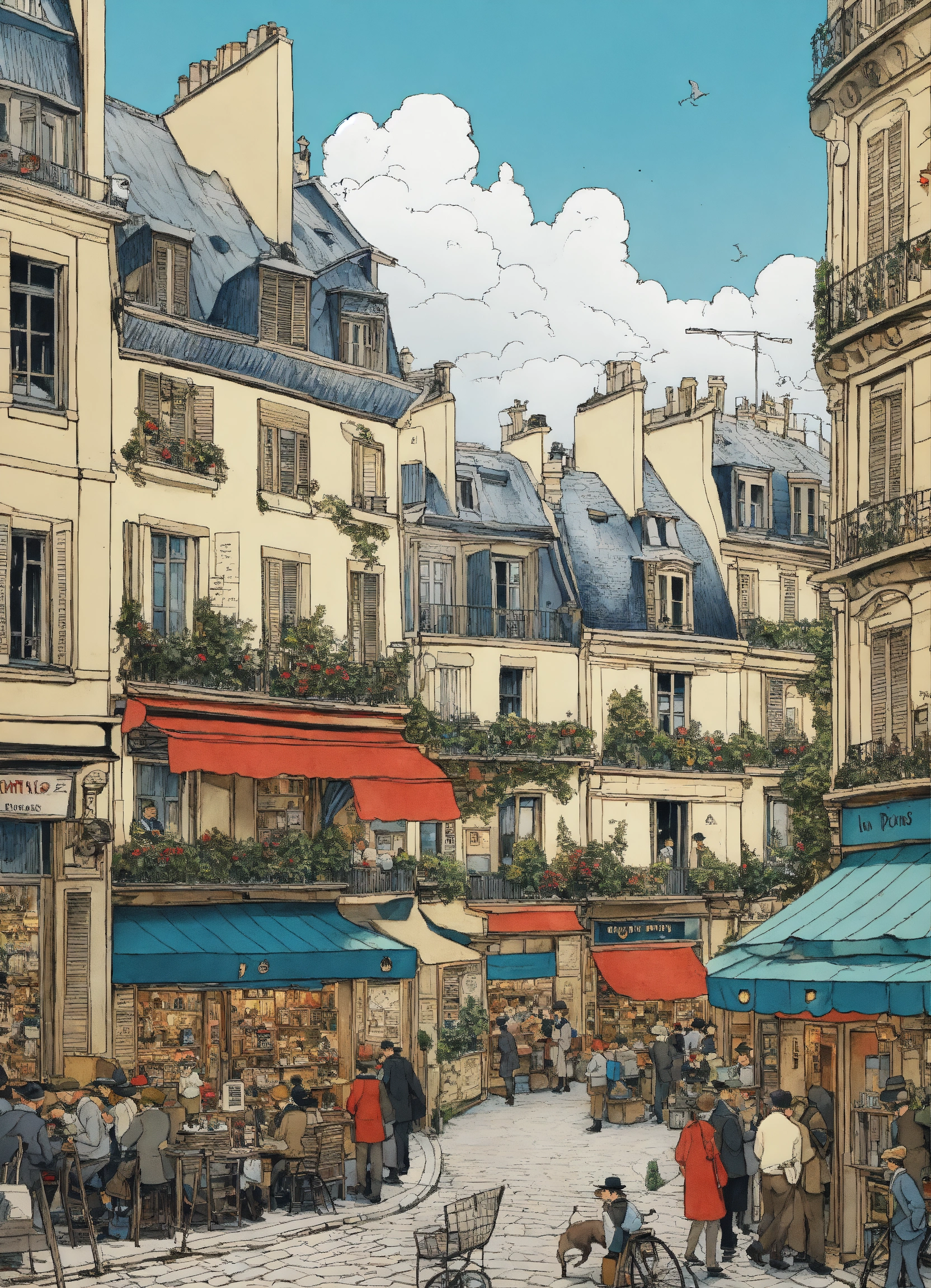 Detailed pen and ink illustration of the old city of paris, by herge, in the style of tin-tin comics, detailed coloring, detailed, lots of people, lots of tiny streets sunny day, busy neighbourhood