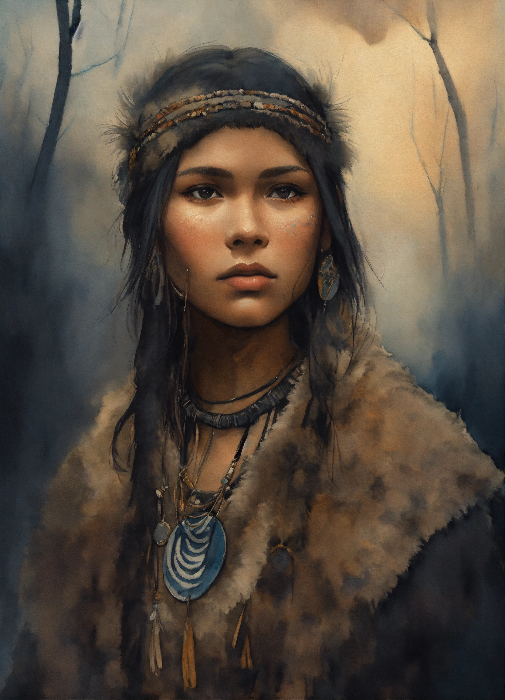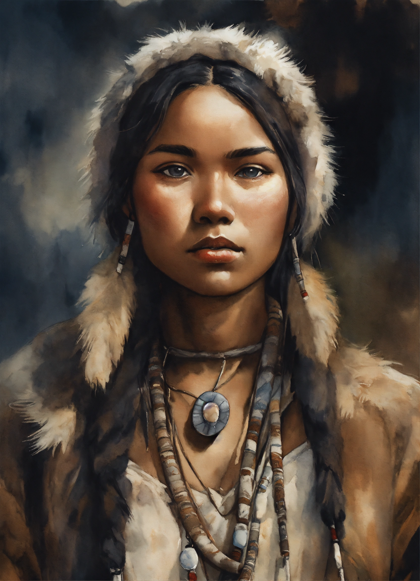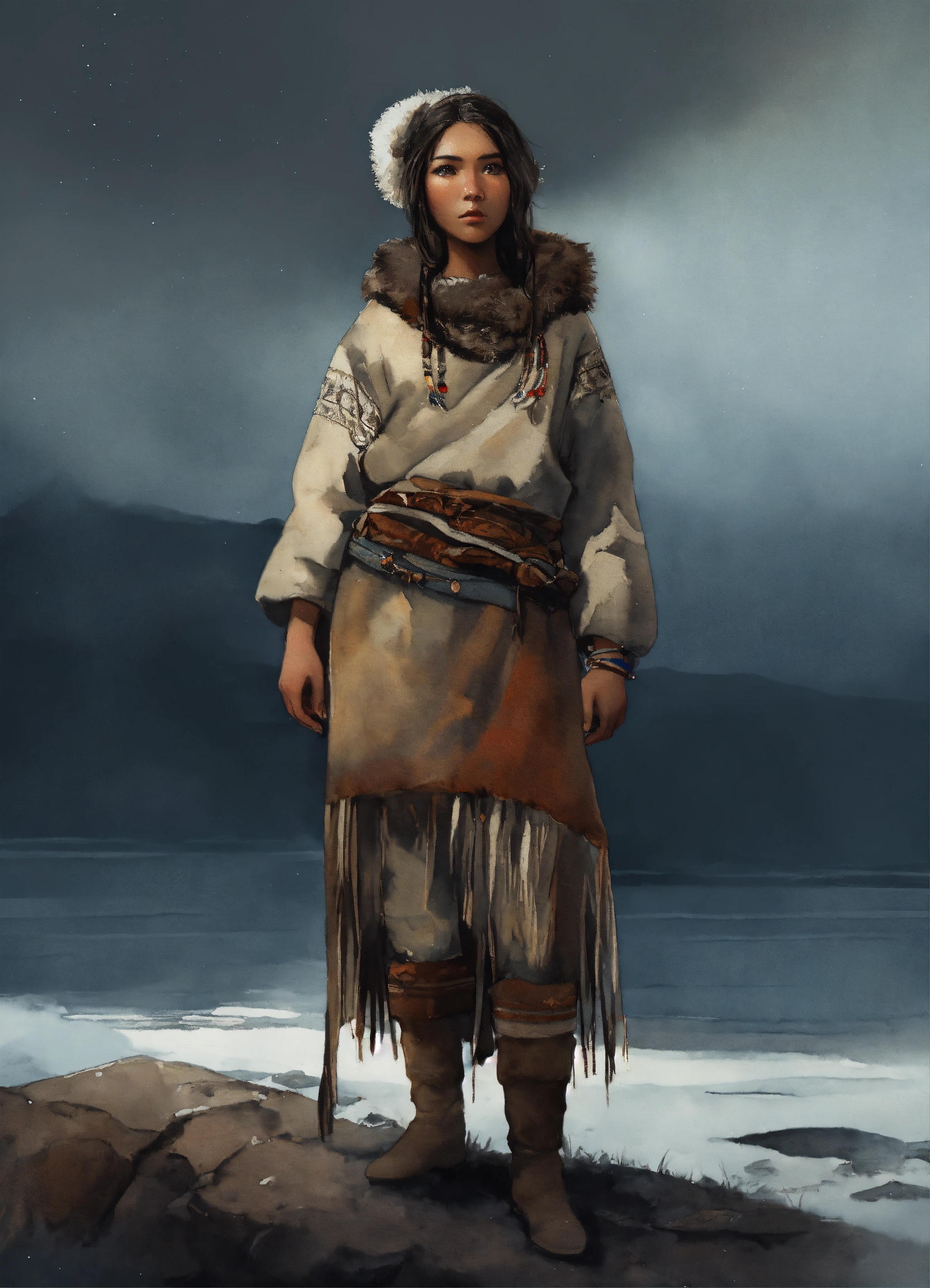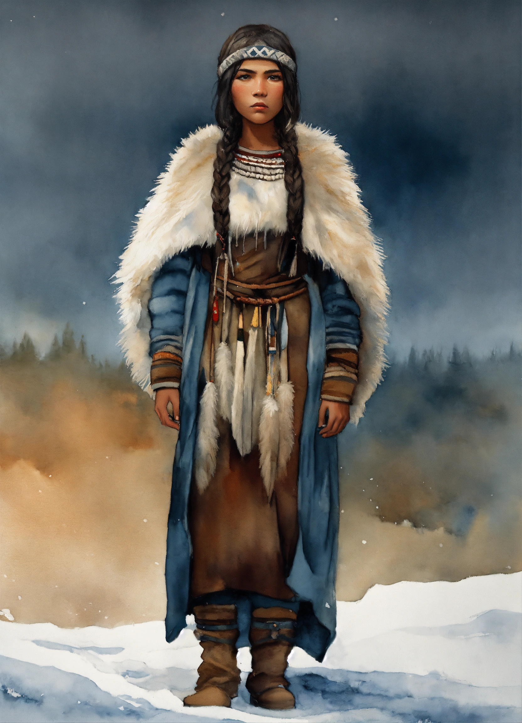 Illustration by tom björklund of a siberian "aboriginal" woman, 18 years old, wearing arctic paleolithic clothing. full body, artstyle by tom björklund, watercolors, dark hues, gloomy and depressing, masterpiece.