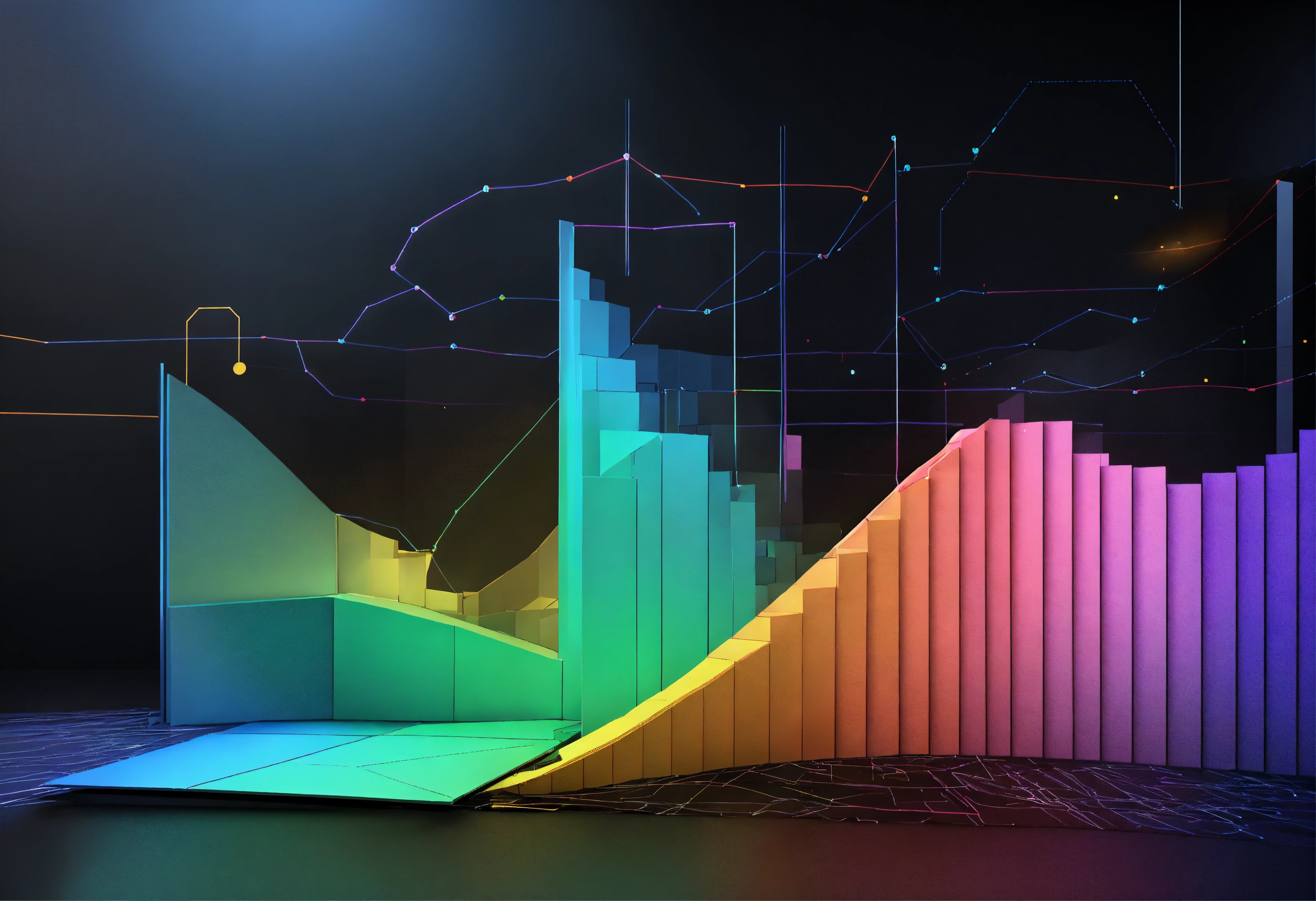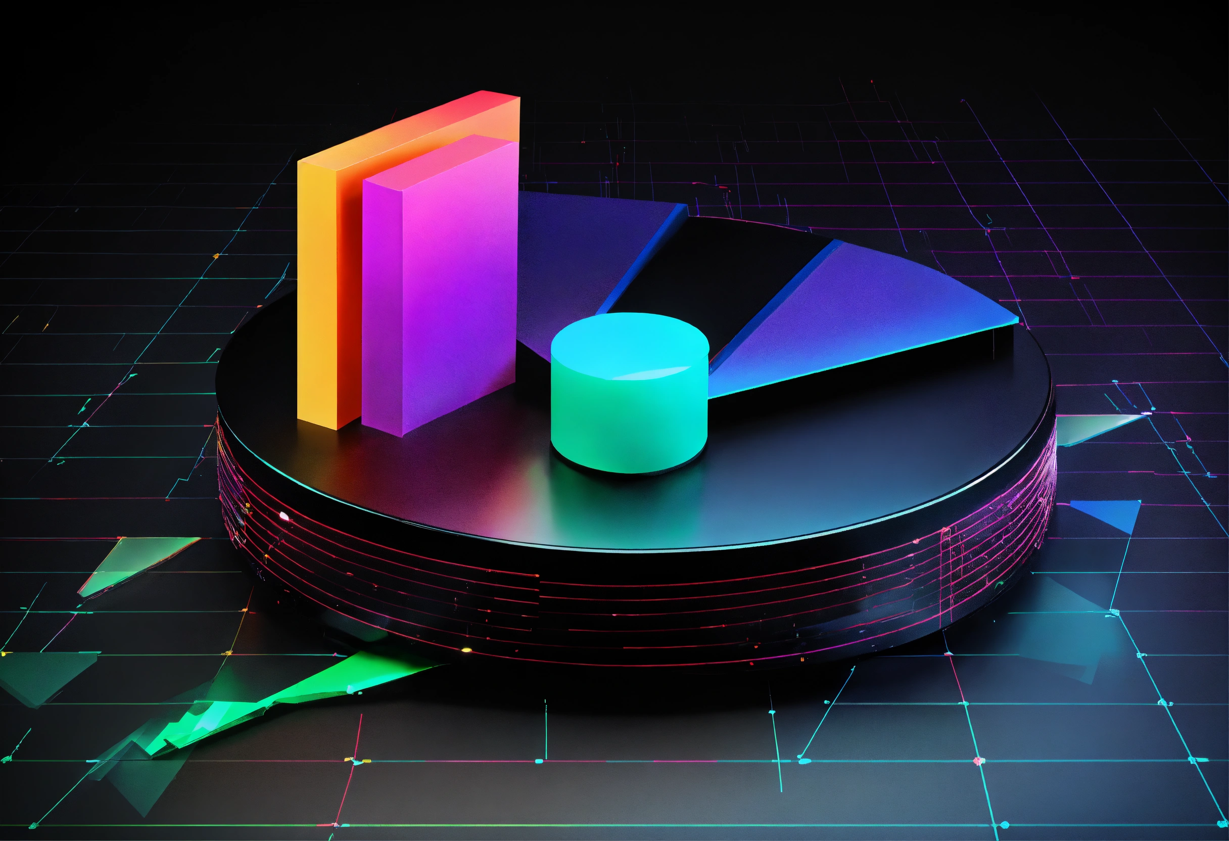 Pie graphs running inside a line graph. black background, shiny texture, gradient from the center. figures with a three-dimensional appearance using shading, light and perspective techniques. colors that contrast with the black background. clean and modern style. the image that is not very loaded. subtle lighting that enhances three-dimensional figures and adds depth to the image