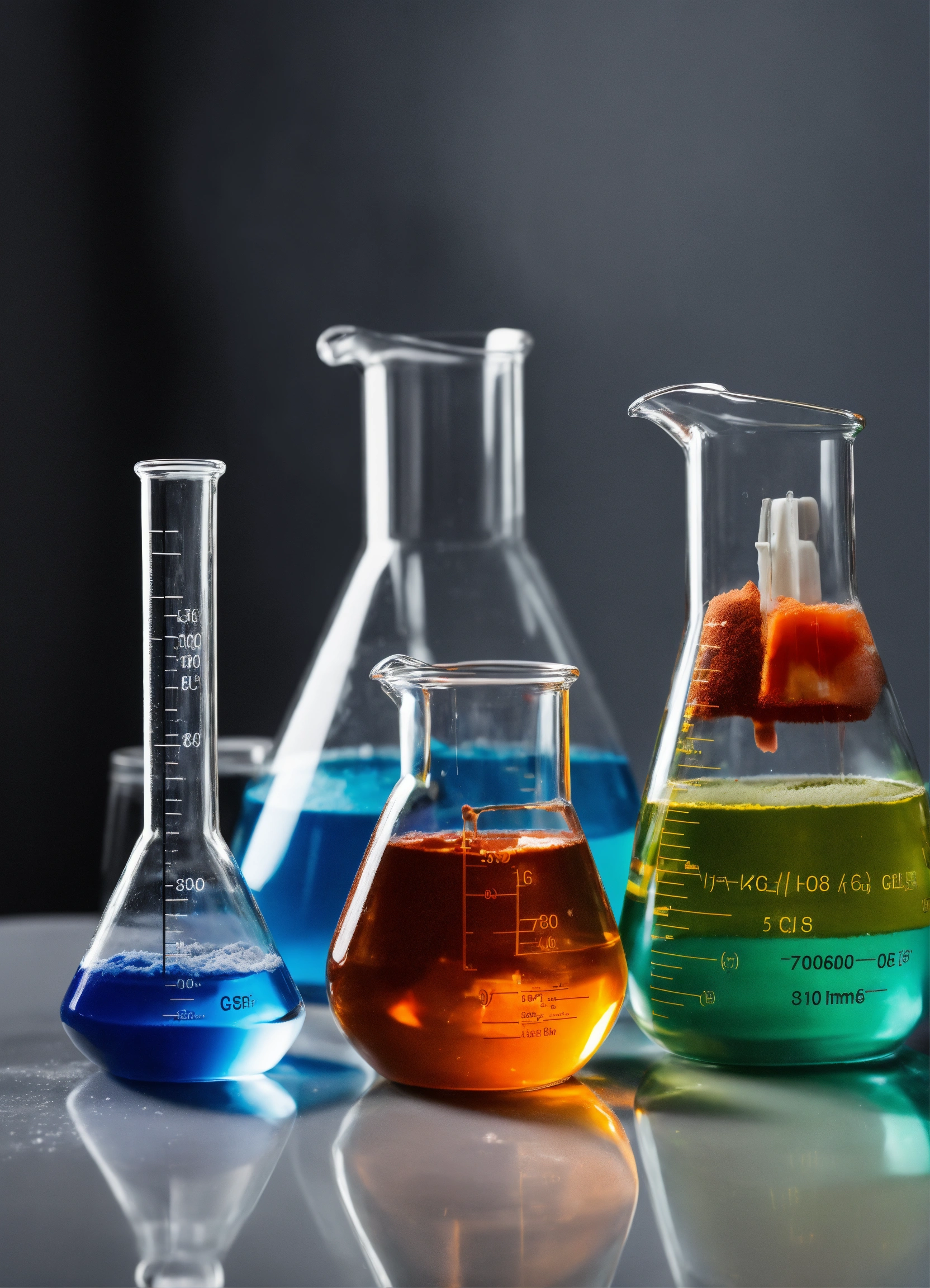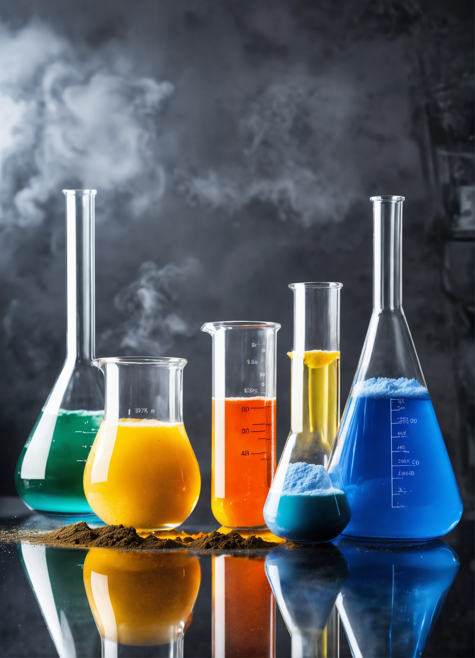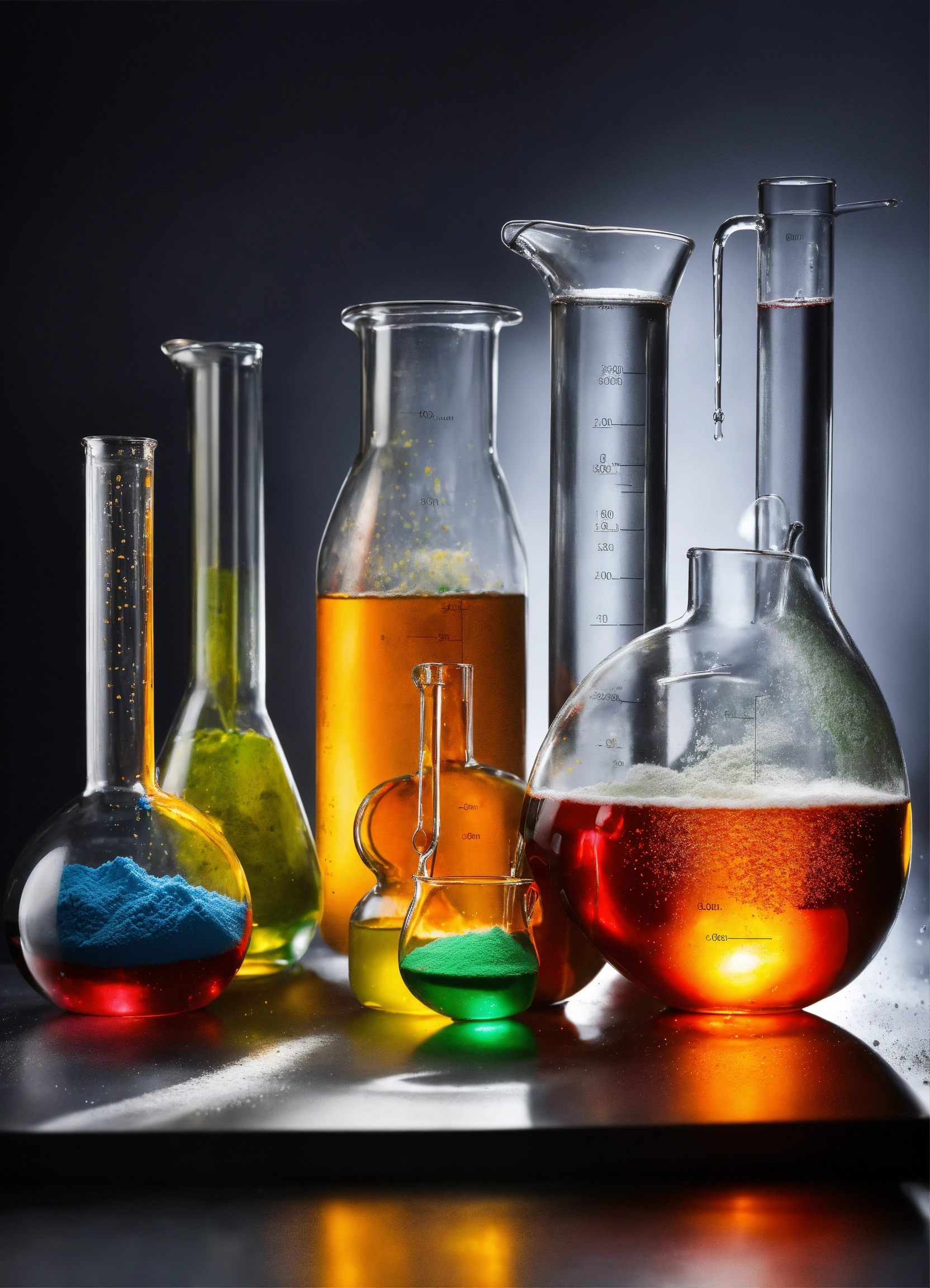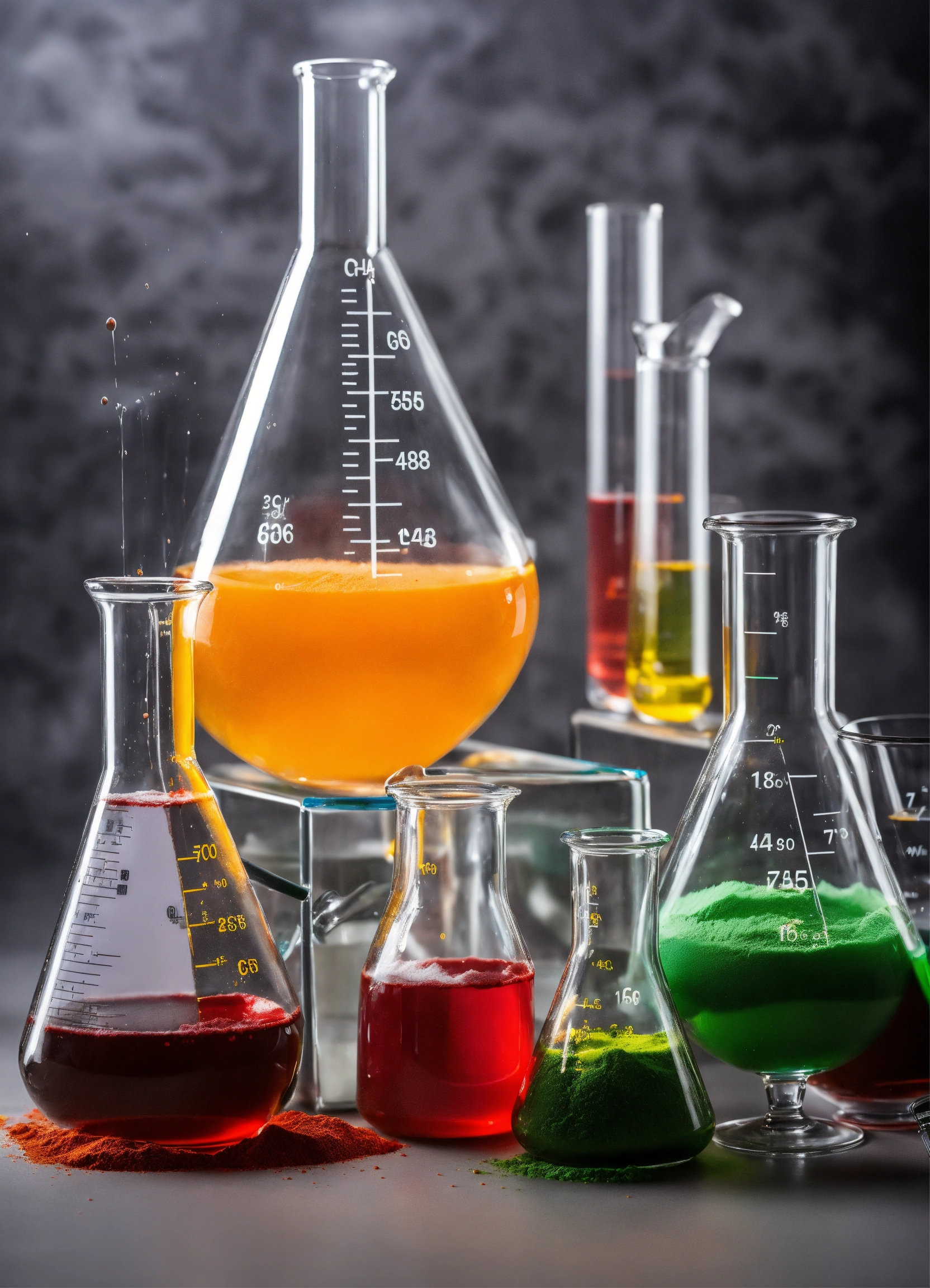 Different chemicals with powders and liquids in glassware in a laboratory environment, grey background