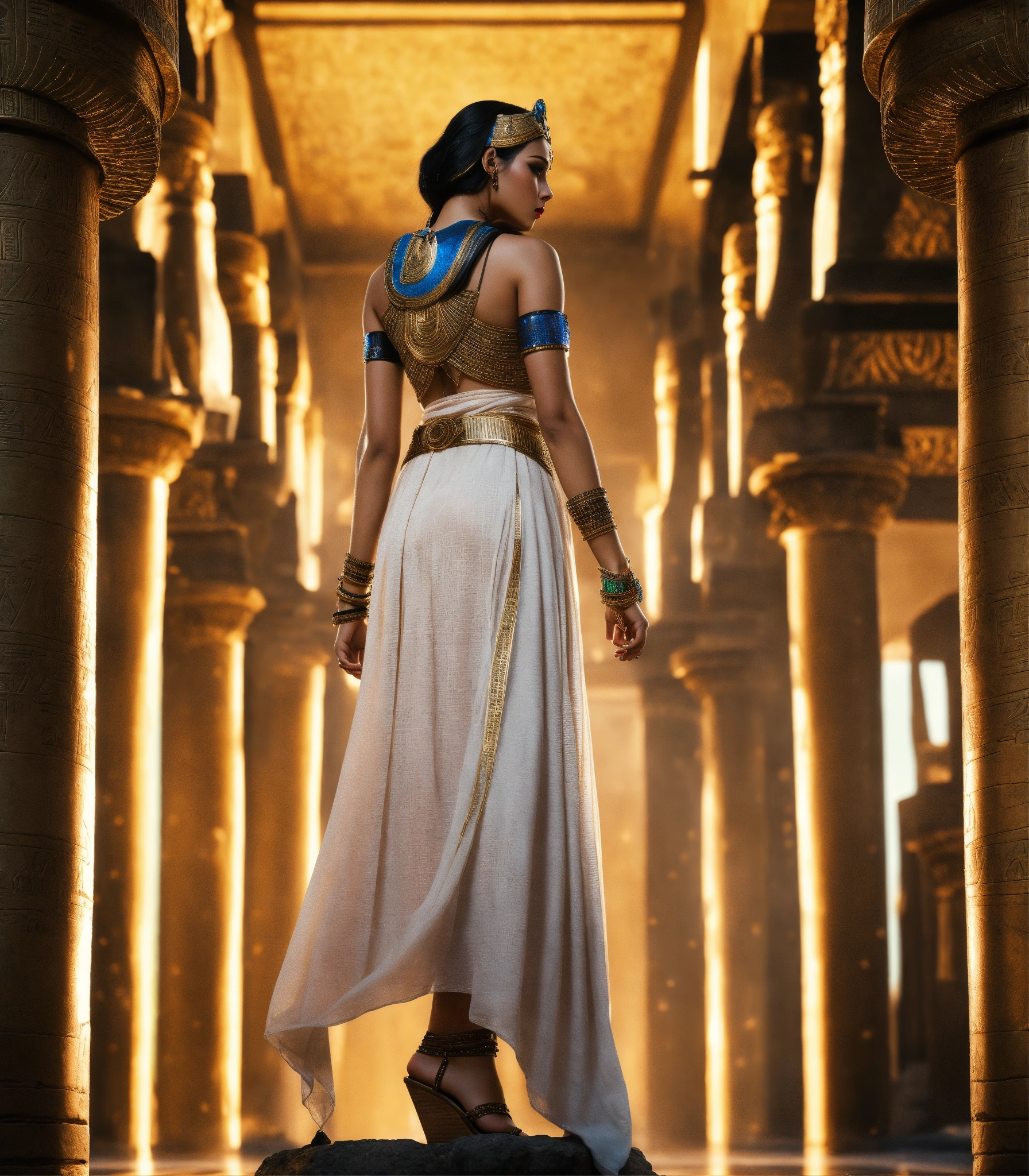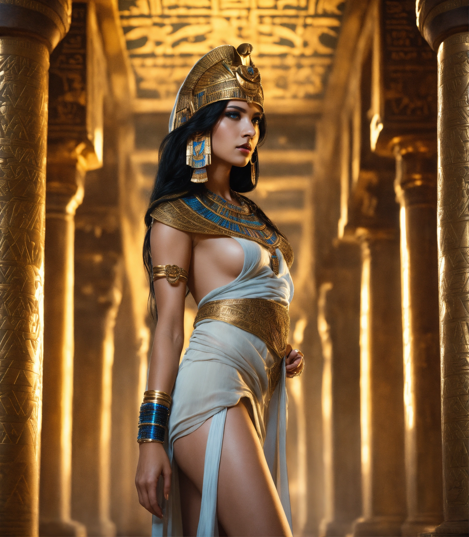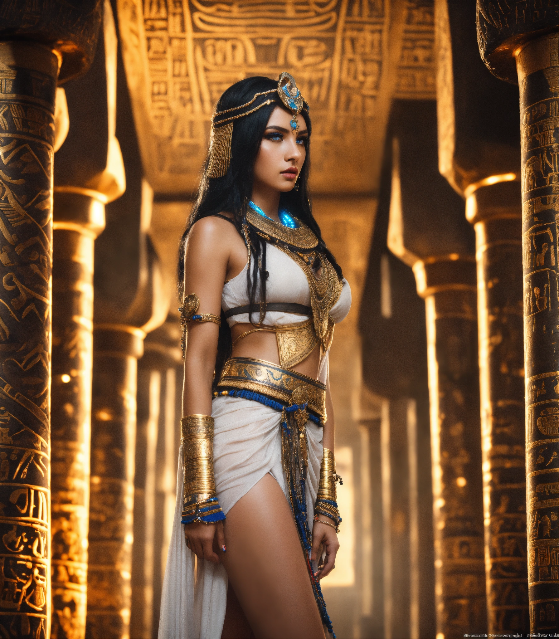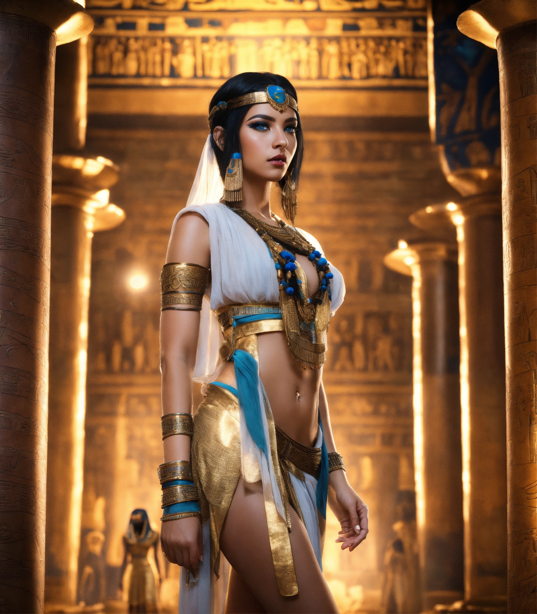 An epic fantasy scene featuring gorgeous and beautiful ancient egyptian female in full height, like the image, very attractive outfit, highly-detailed, long black hair, blue eyes, lips, tall, make up, transparent short tunic, bare legs, arm bracelets, sandals, photo realistic, beautiful, moody lighting, best quality, realistic, real picture, intricate details, depth of field, cinematic view, raw photo, 8k uhd, film grai