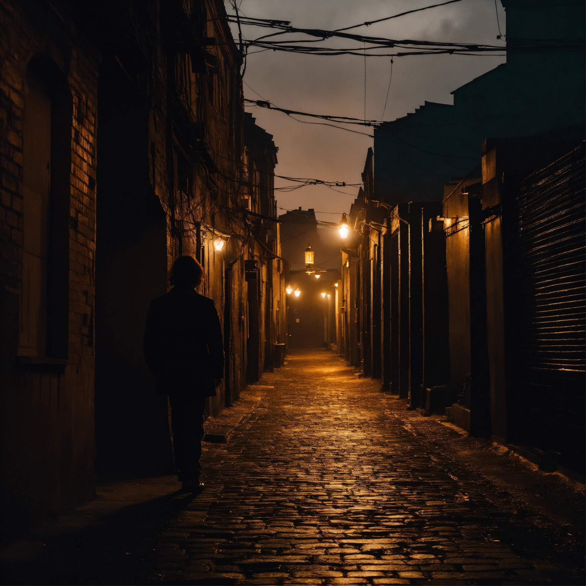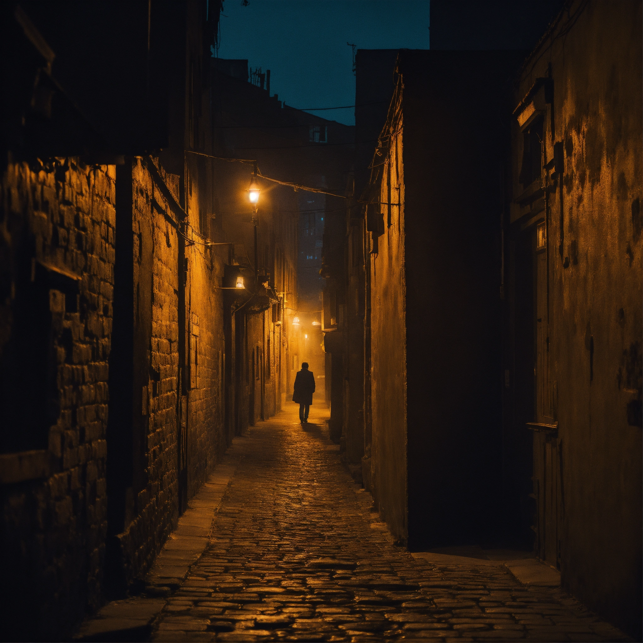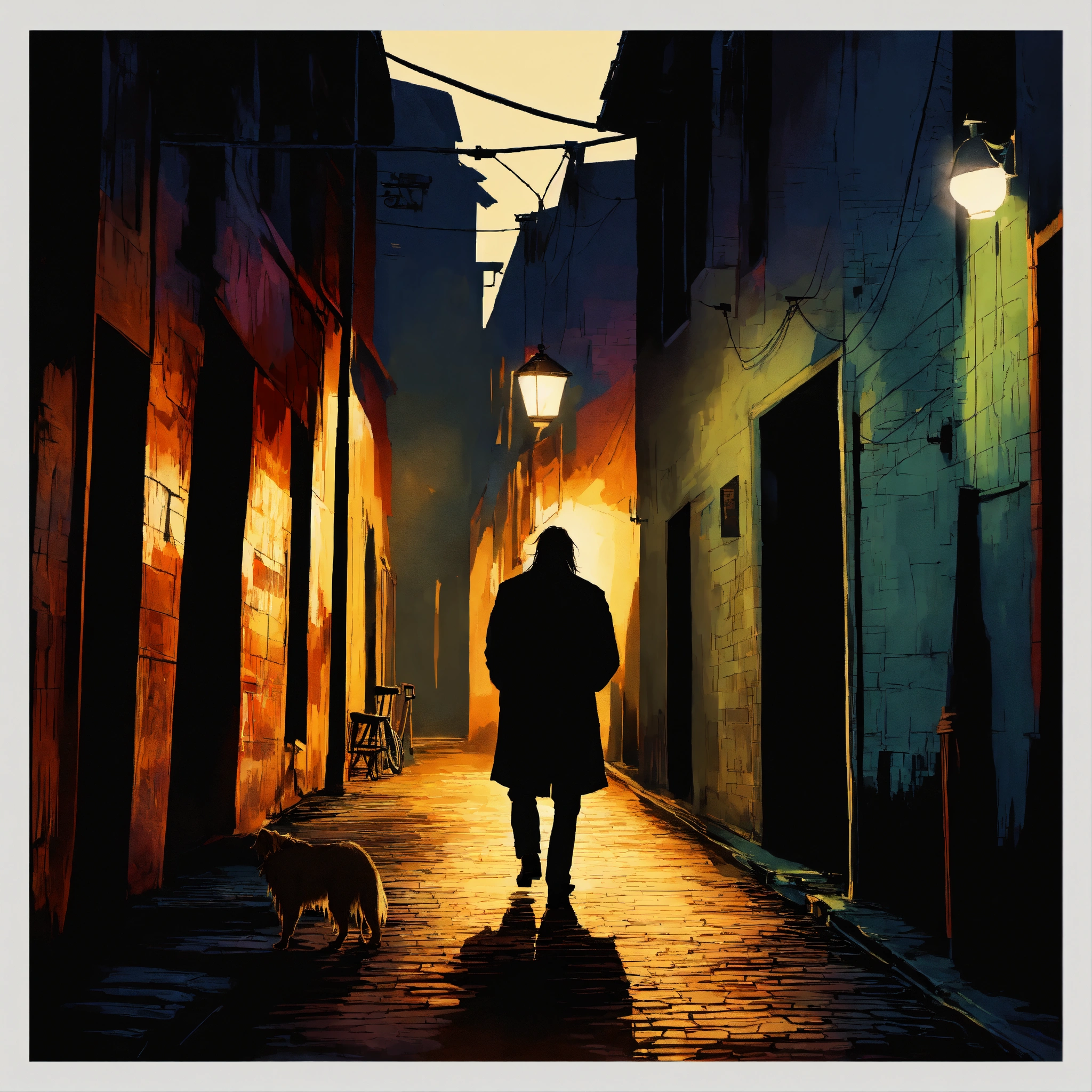 A lonely alley with a light in the background; a man with long hair from behind; in the style of dark hues; gloomy