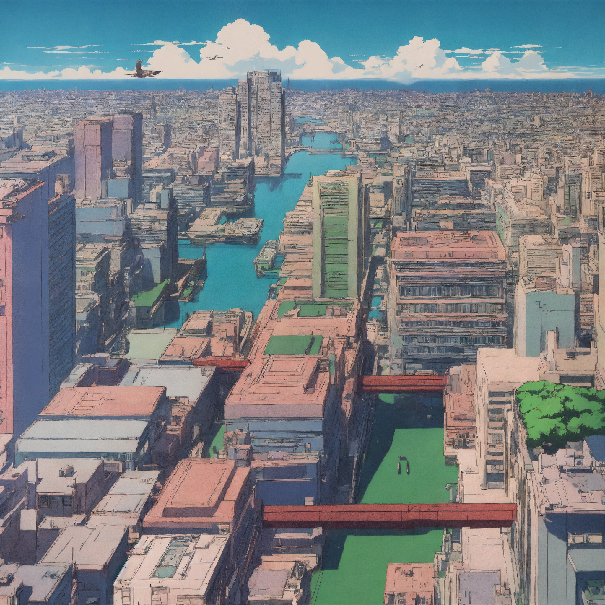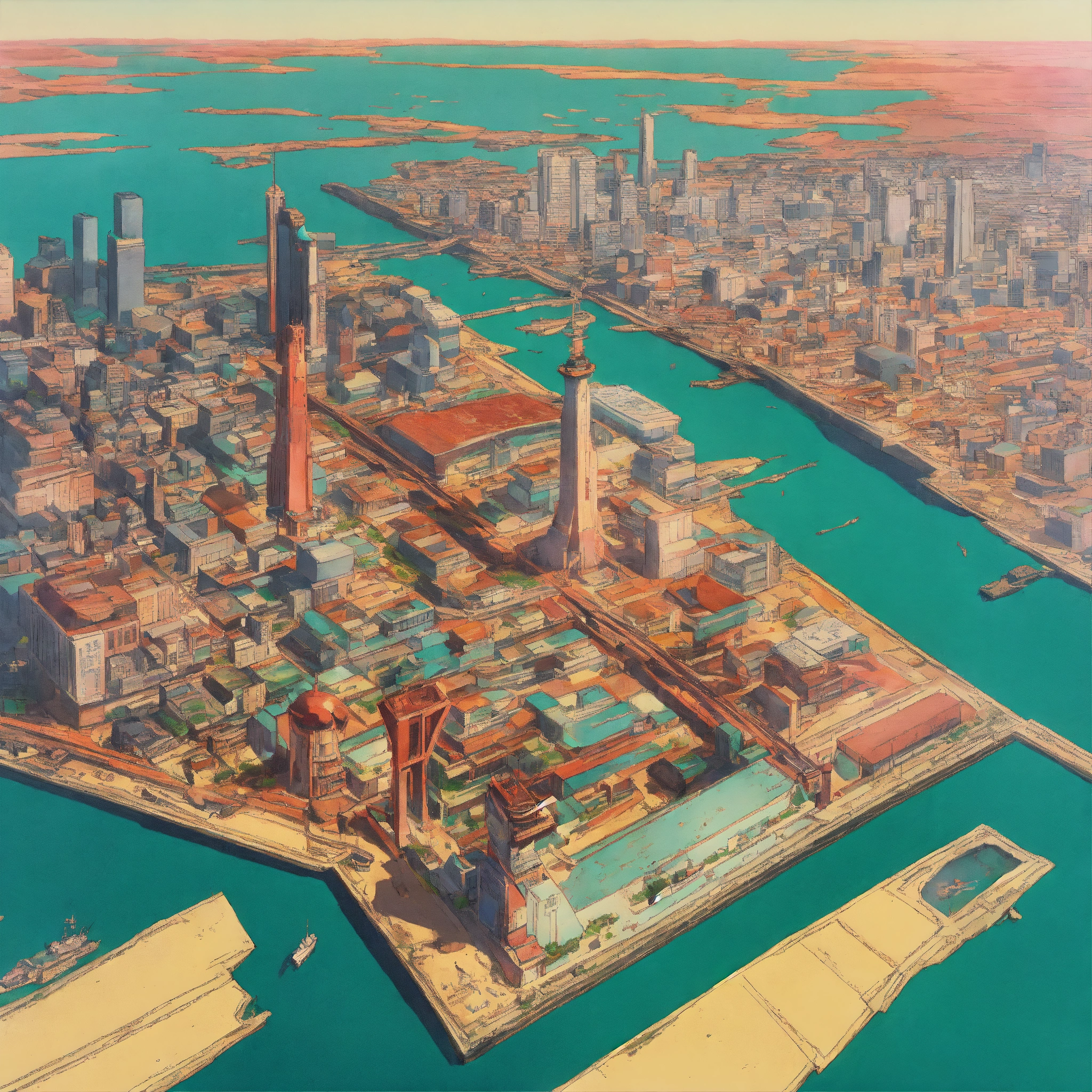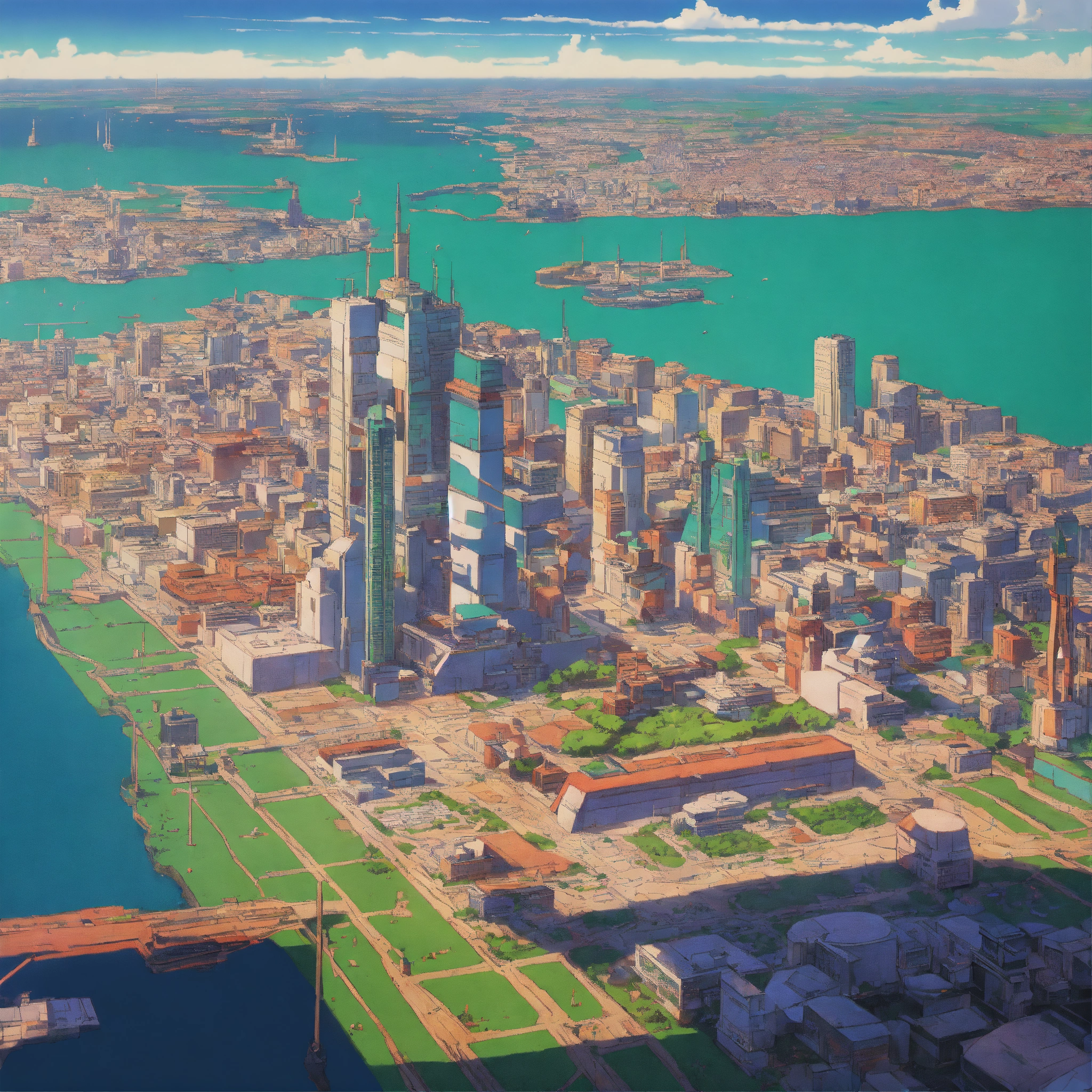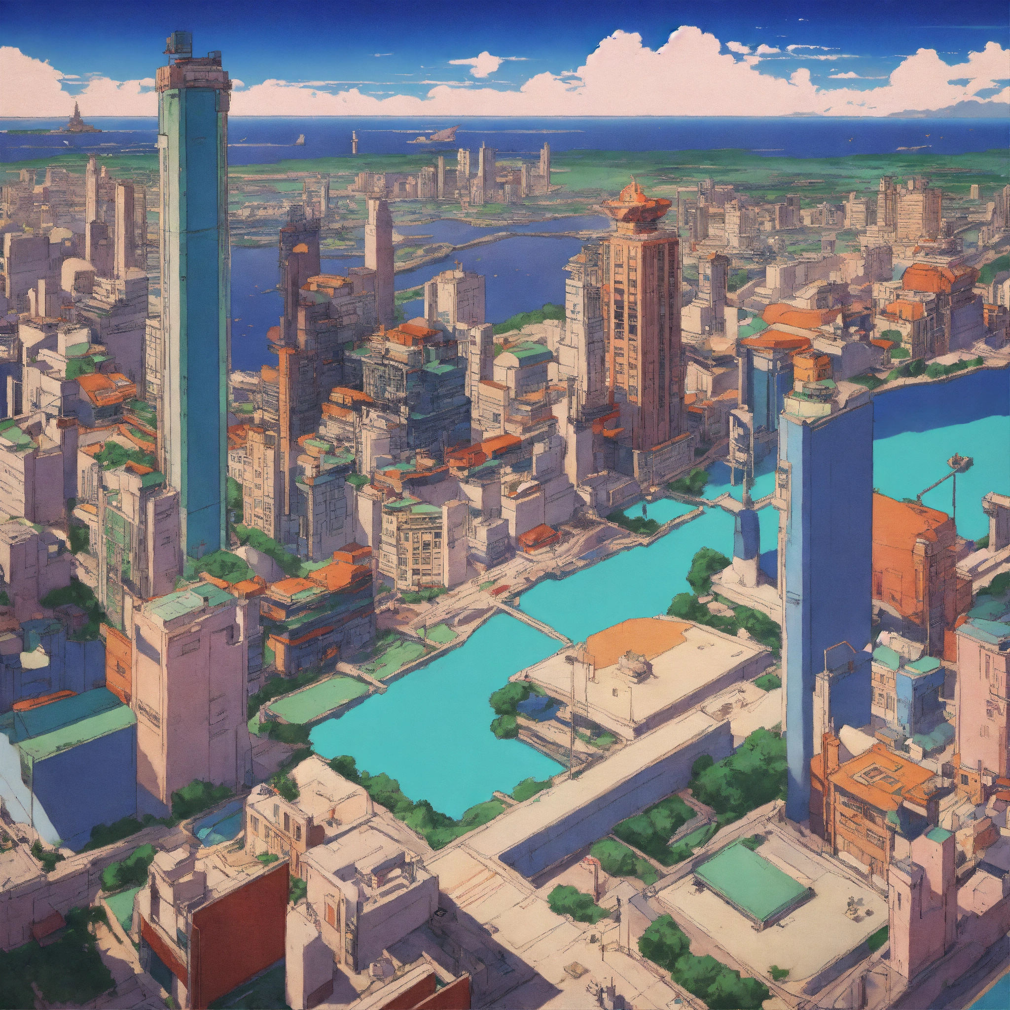 The city of atlantis but with futuristic vibes in a vintage anime screenshot from evangelion, a 90's anime. contemporary minimalism. bird's eye view.