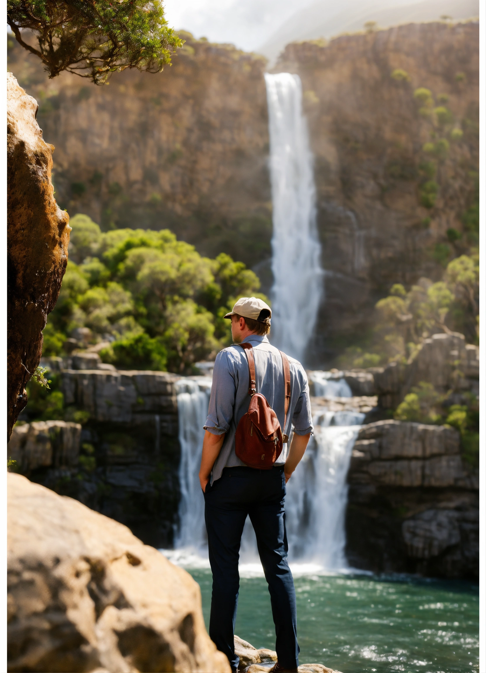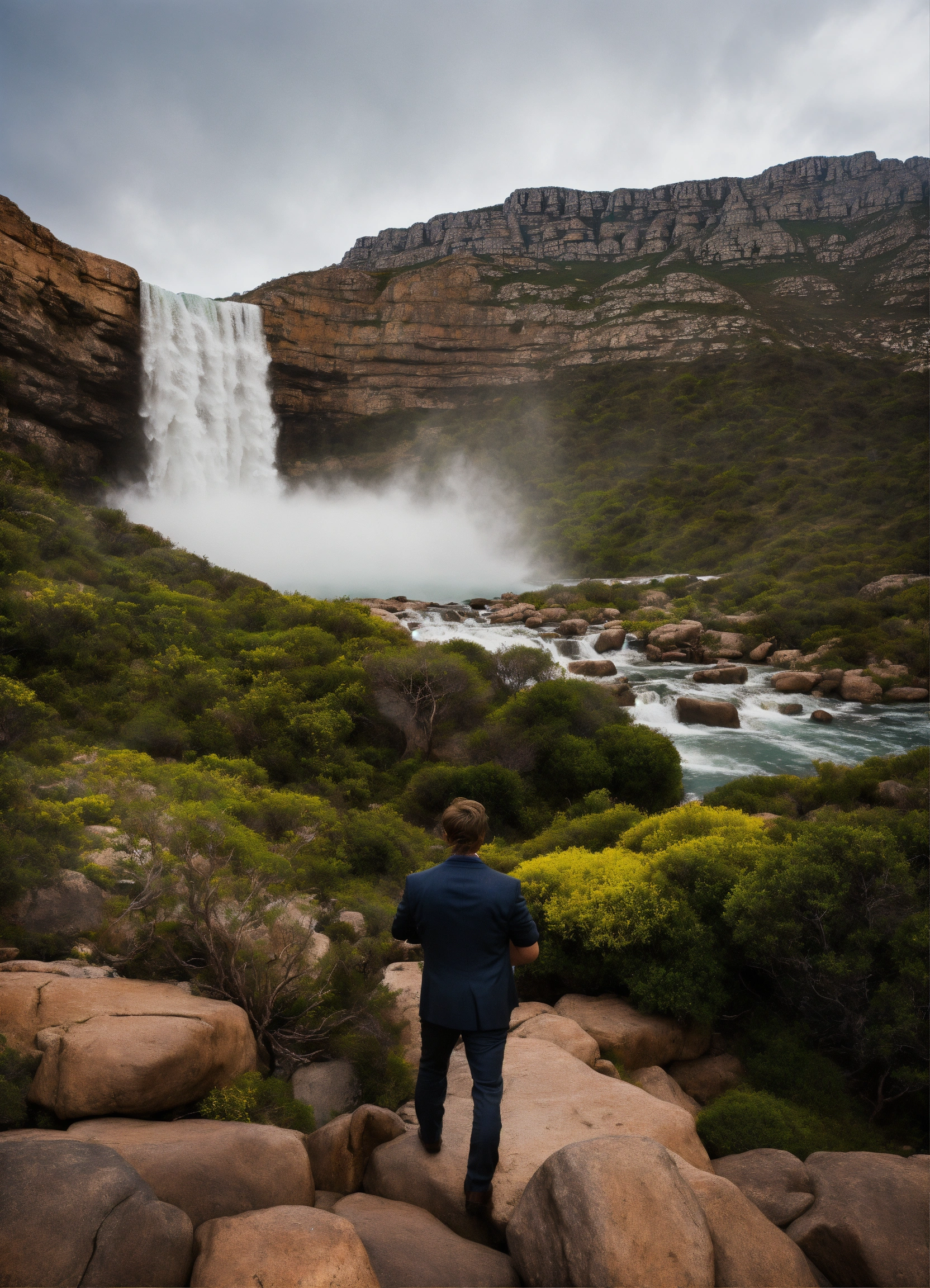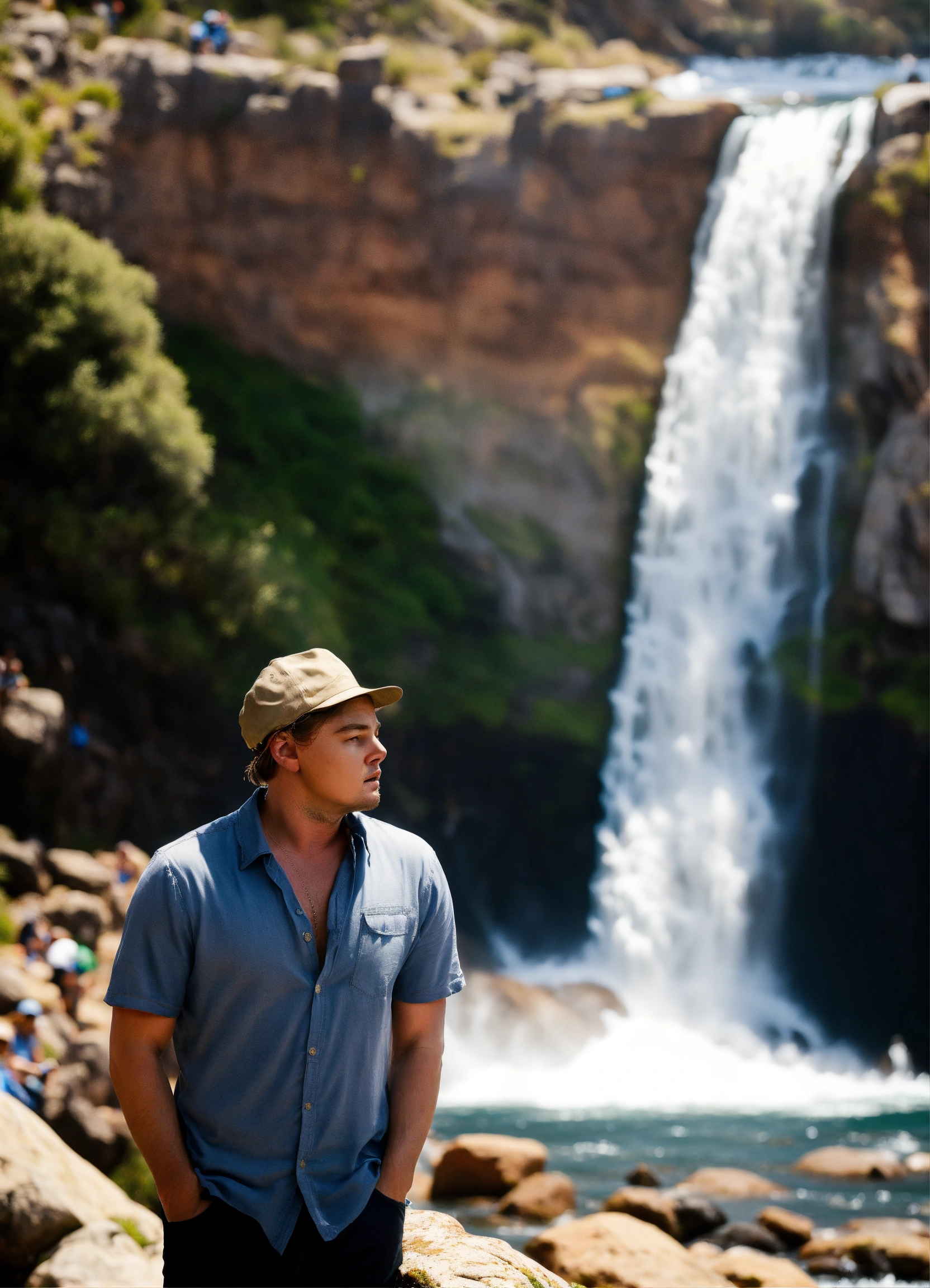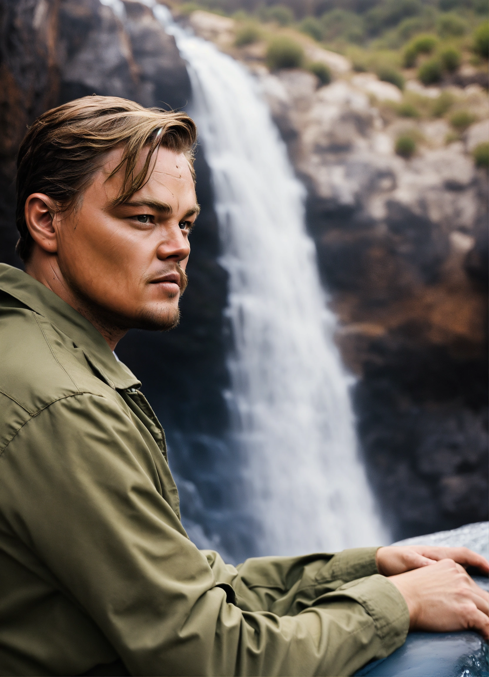 Leonardo dicaprio bravely observing a breathtaking waterfall in cape town