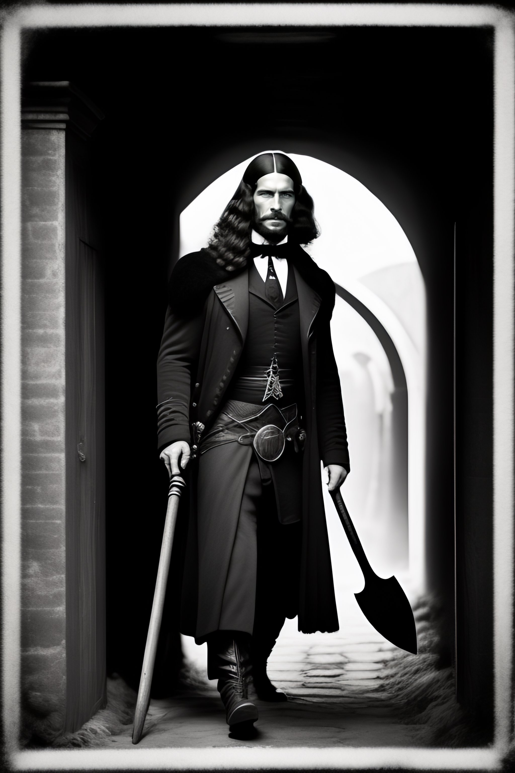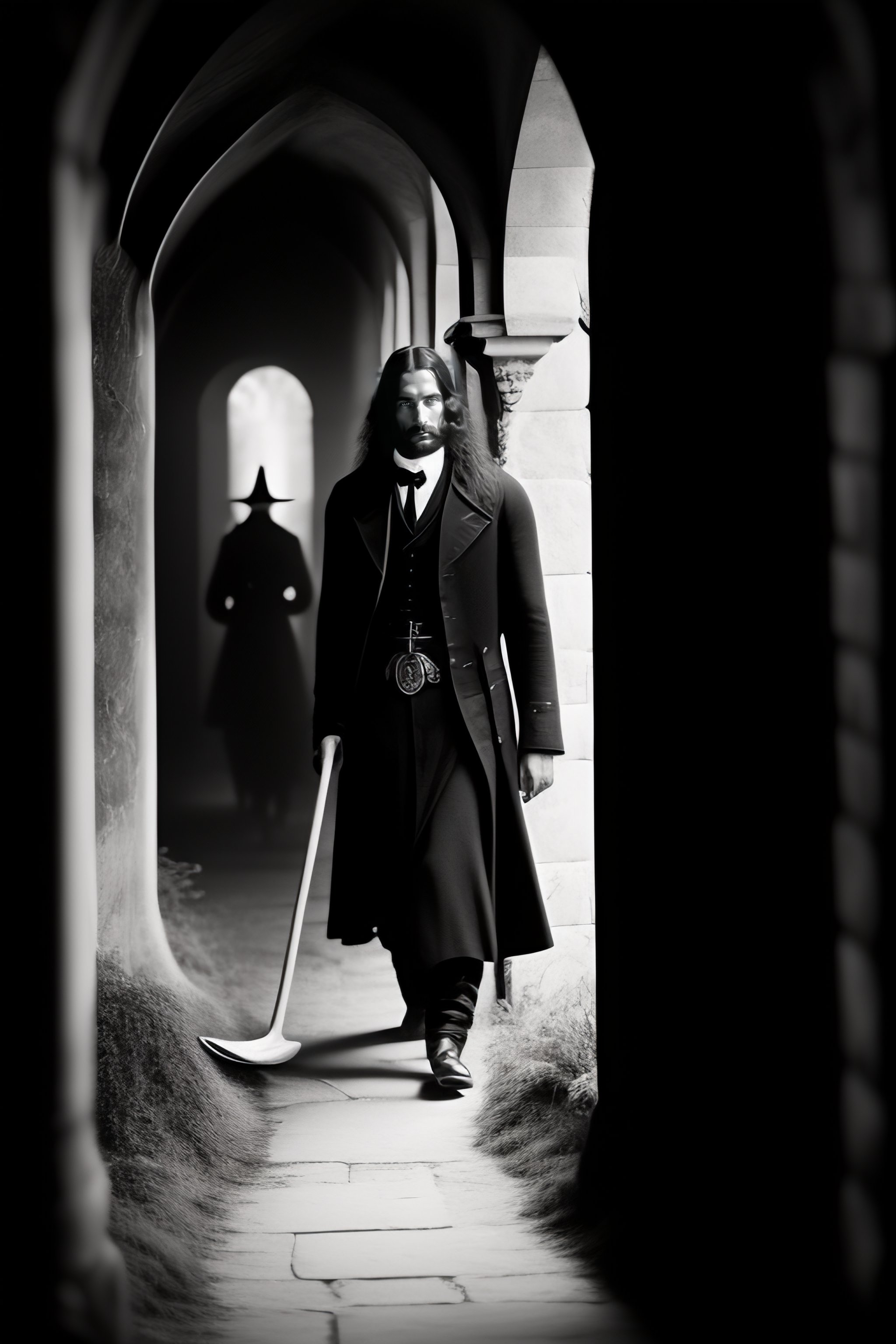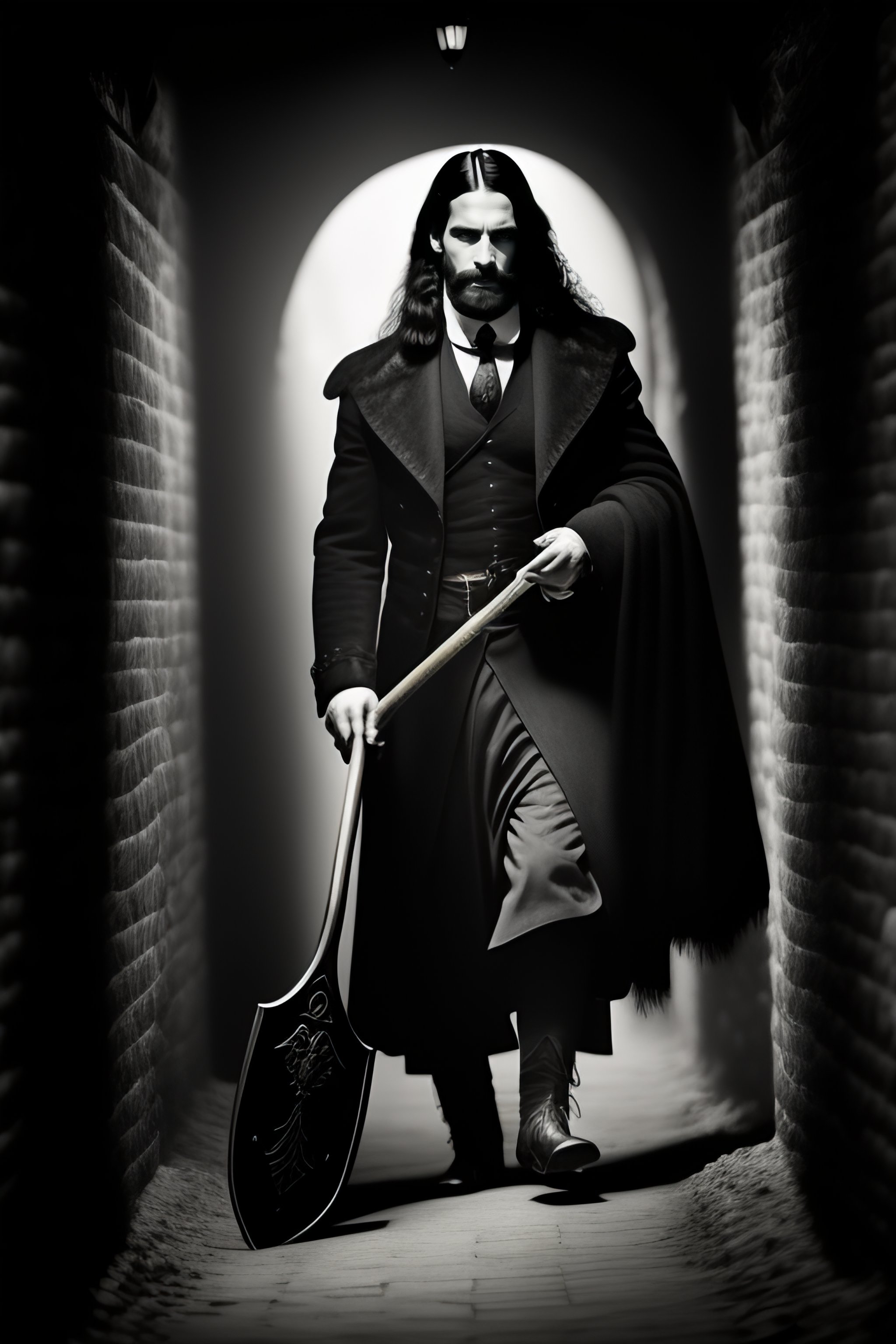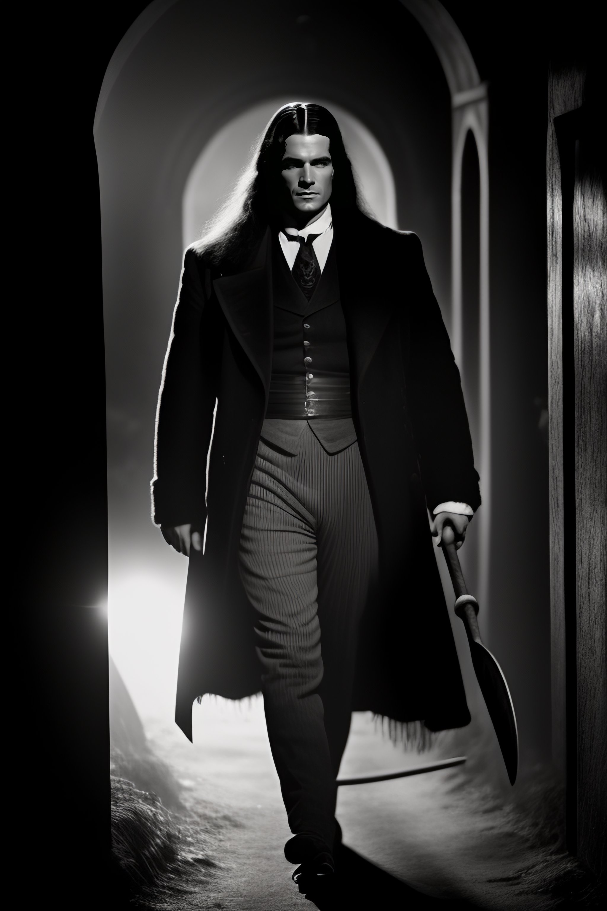 Black and white vintage. victorian age. a man with long hair. he is holding a ax. he is walking inside a dark tomb. black and white, old vintage, 60's movie, gothic horror film, 60s, van helsing
