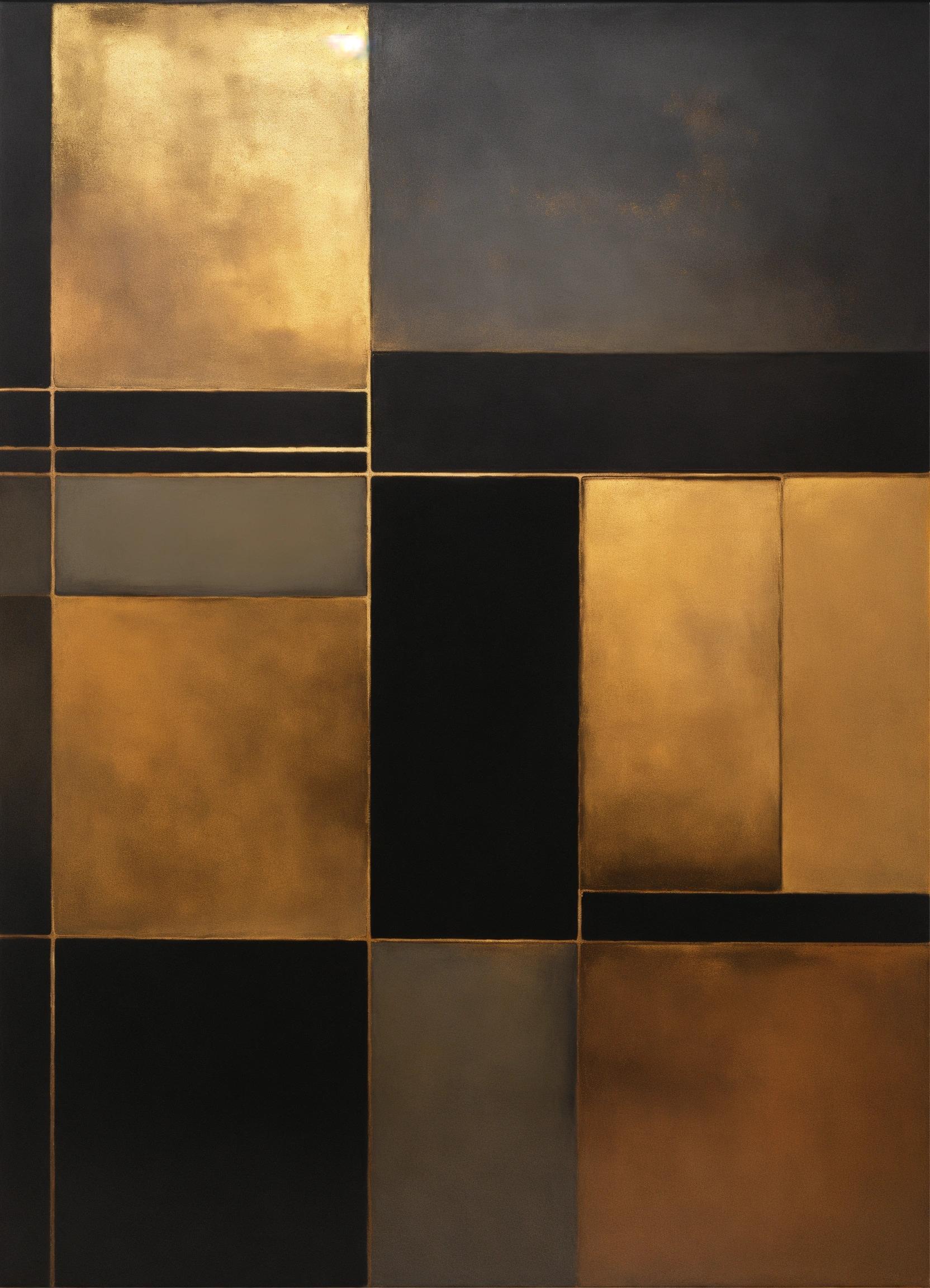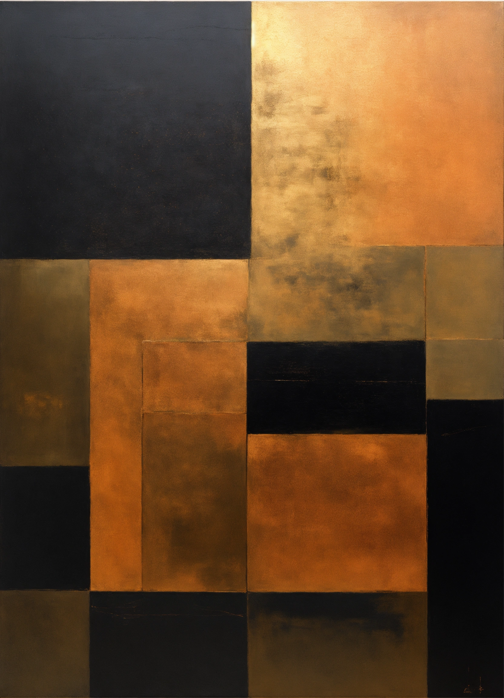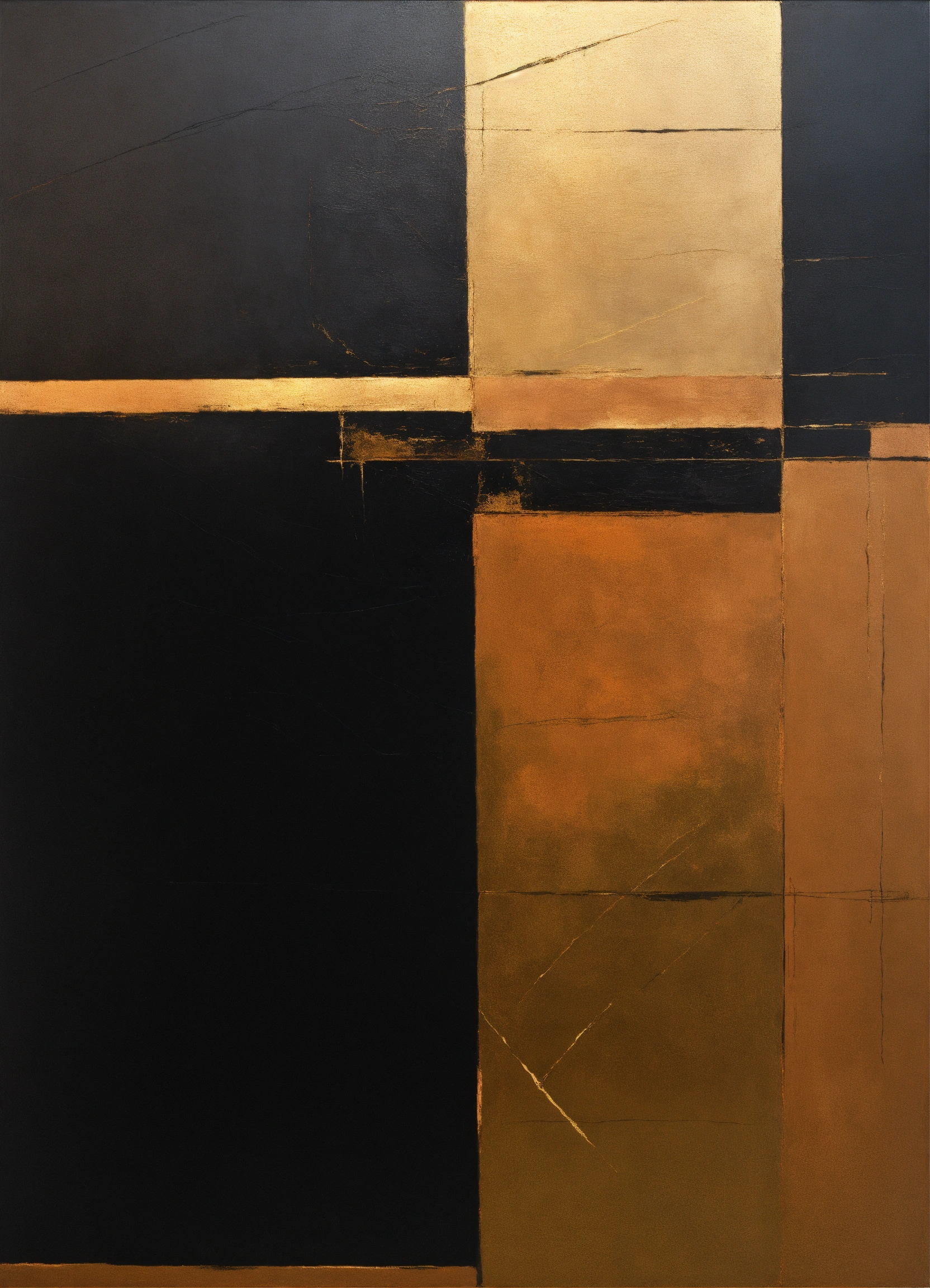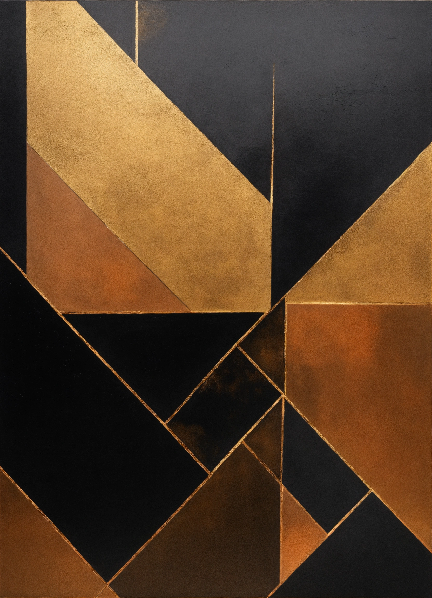 A minimalist, elegant, discreet, abstract, enigmatic, sophisticated, modern, mysterious, and perfect contemporary painting of geometric shapes in black, gold, and copper.