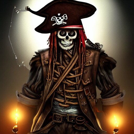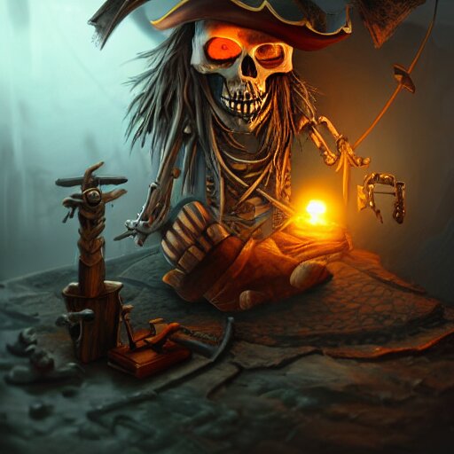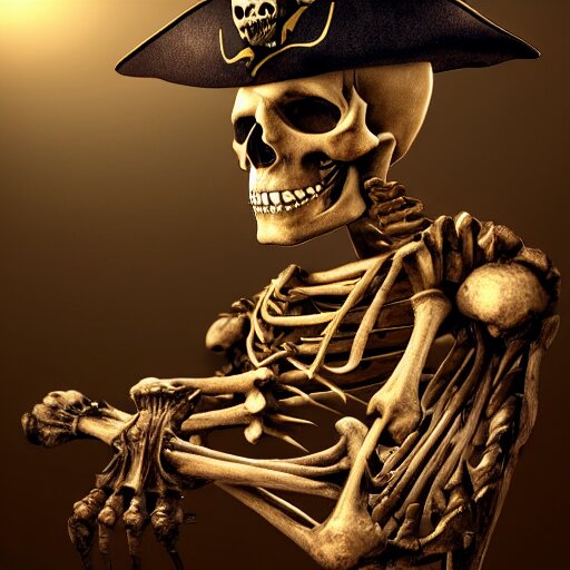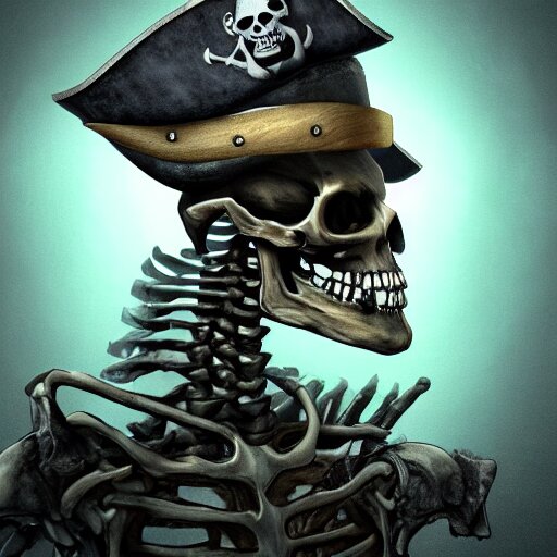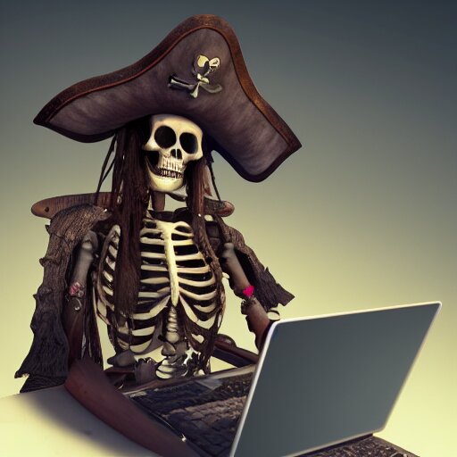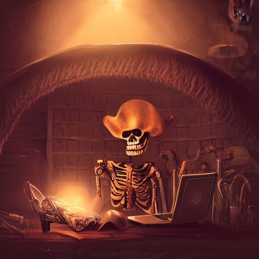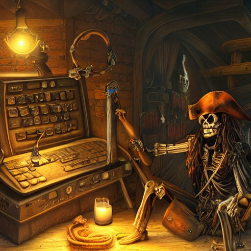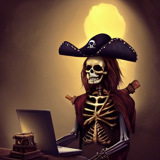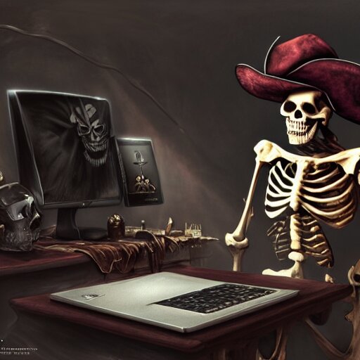 A pirate skeleton with a pirate hat sitting in front of a laptop programming, dark room, light coming from crt monitor, highly detailed, intricate, digital art, trending on artstation, trending on cgsociety