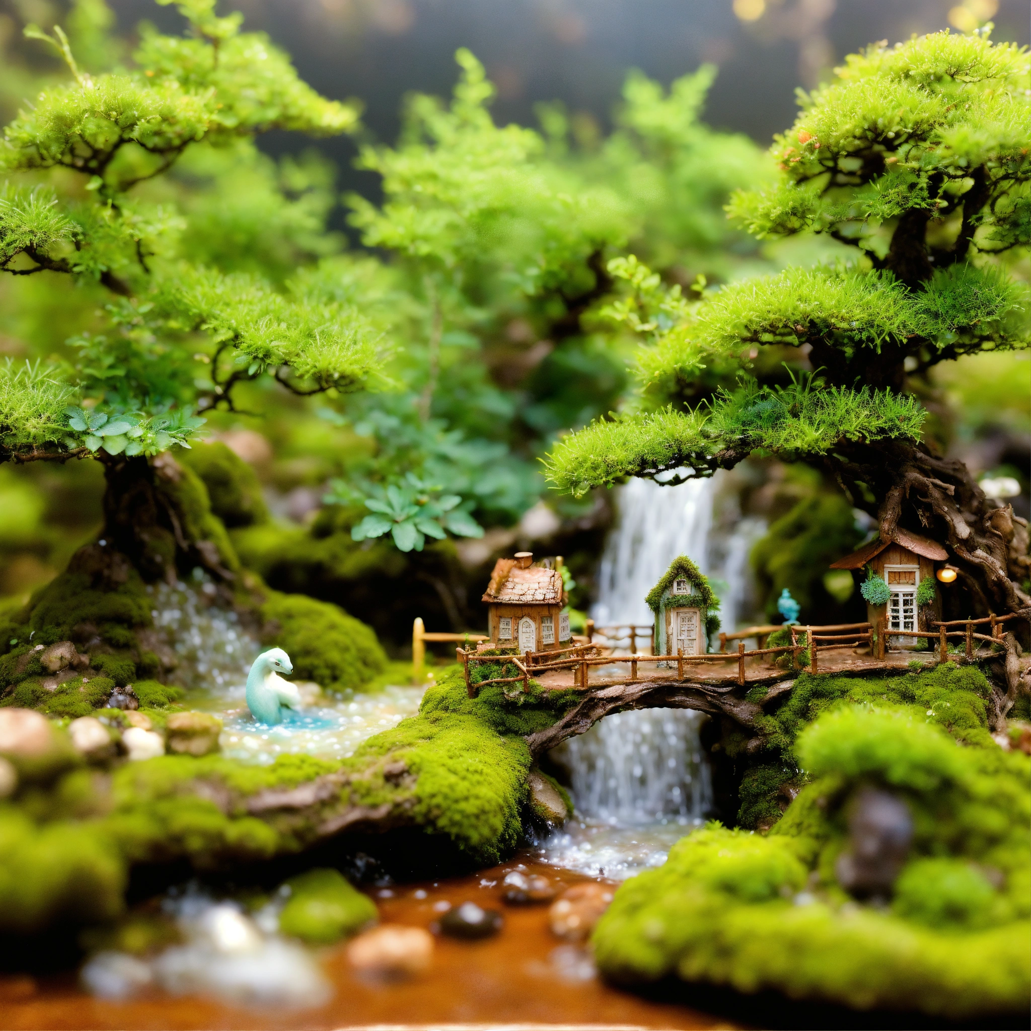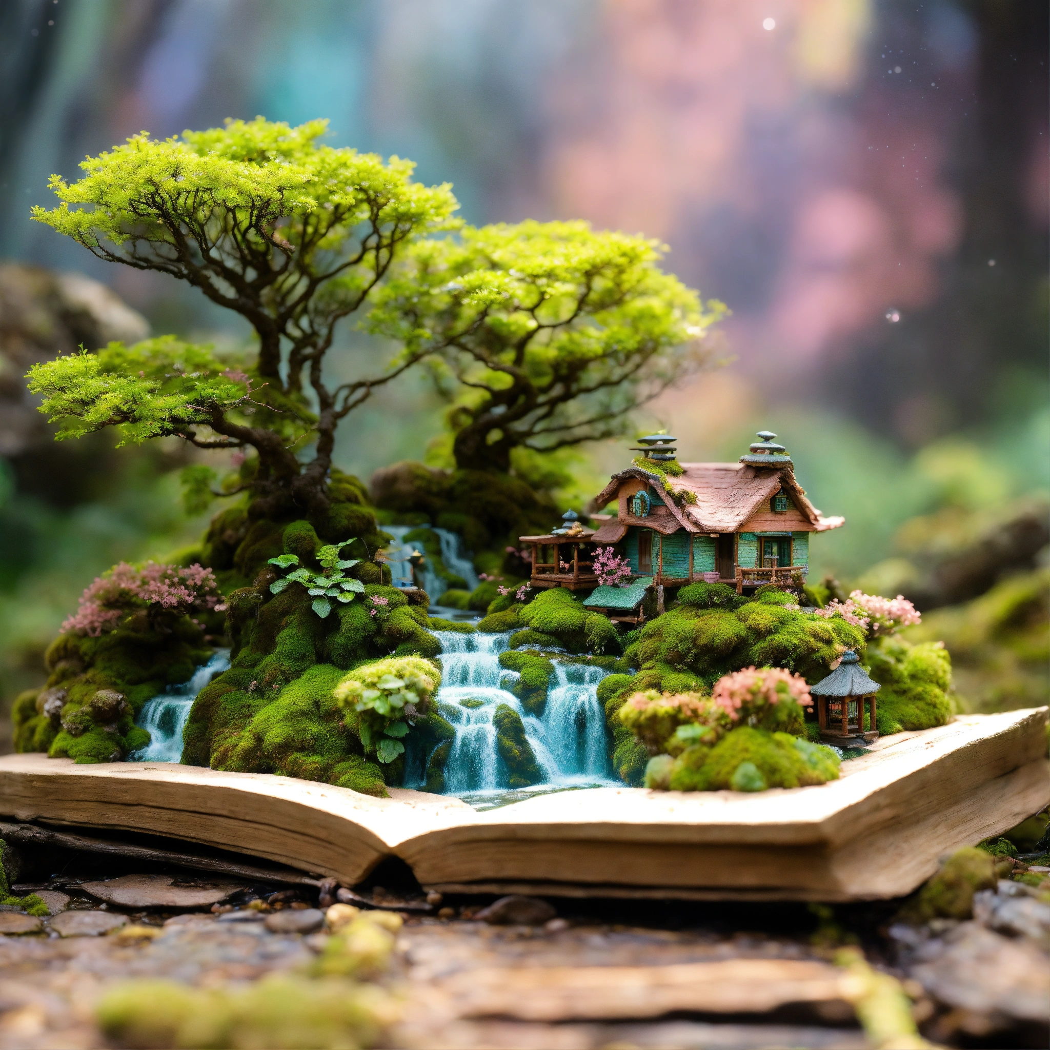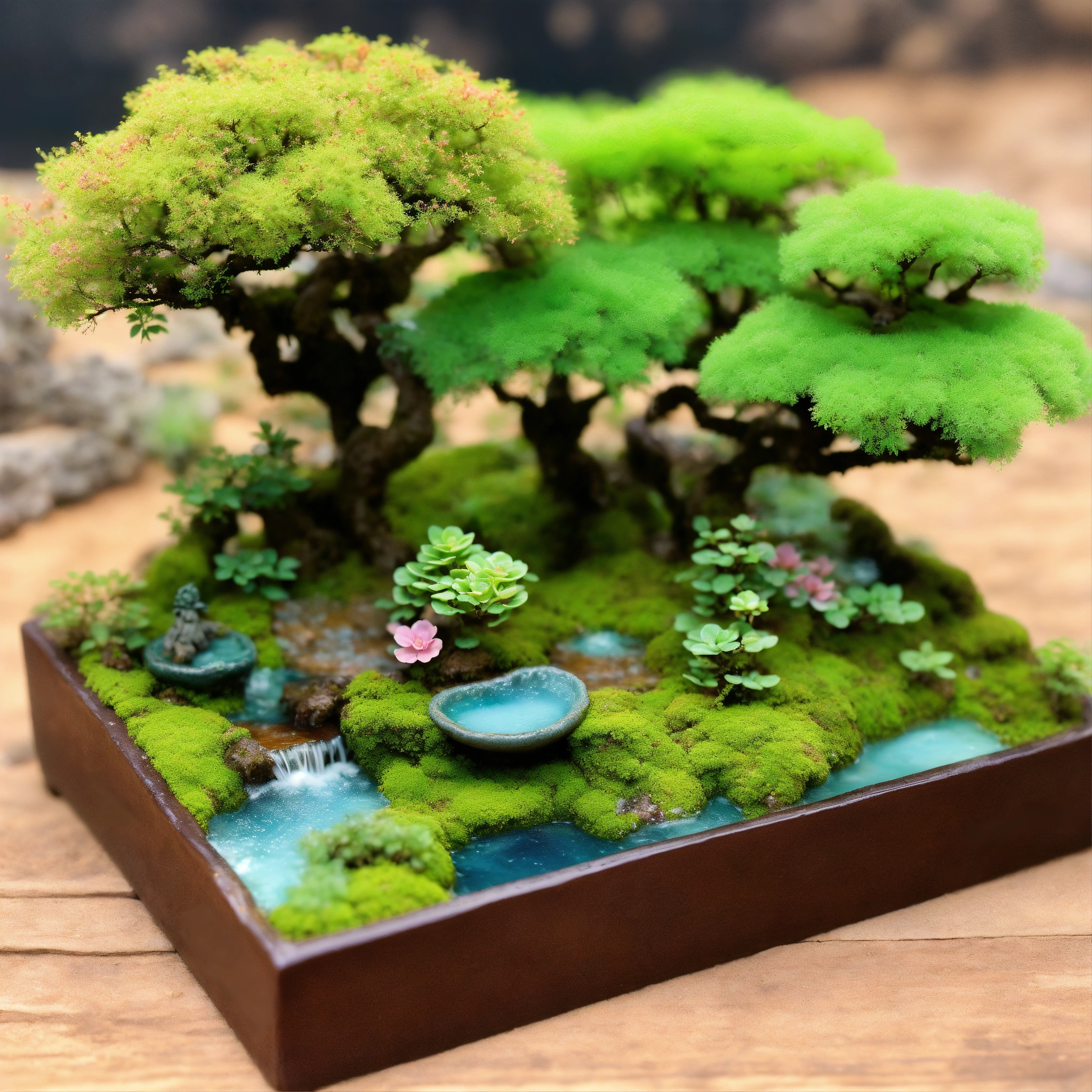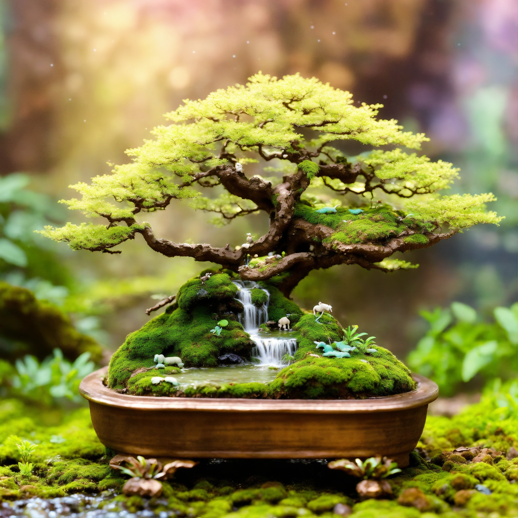 Shabby chic dreamy mist pastel junk journals the bonsai forest retreat imagine a room filled with miniature bonsai trees, each resembling a different landscape or mythical creature. tiny waterfalls, mossy paths, and mystical creatures inhabit this miniature world. swirling magical fairytale abstract art style