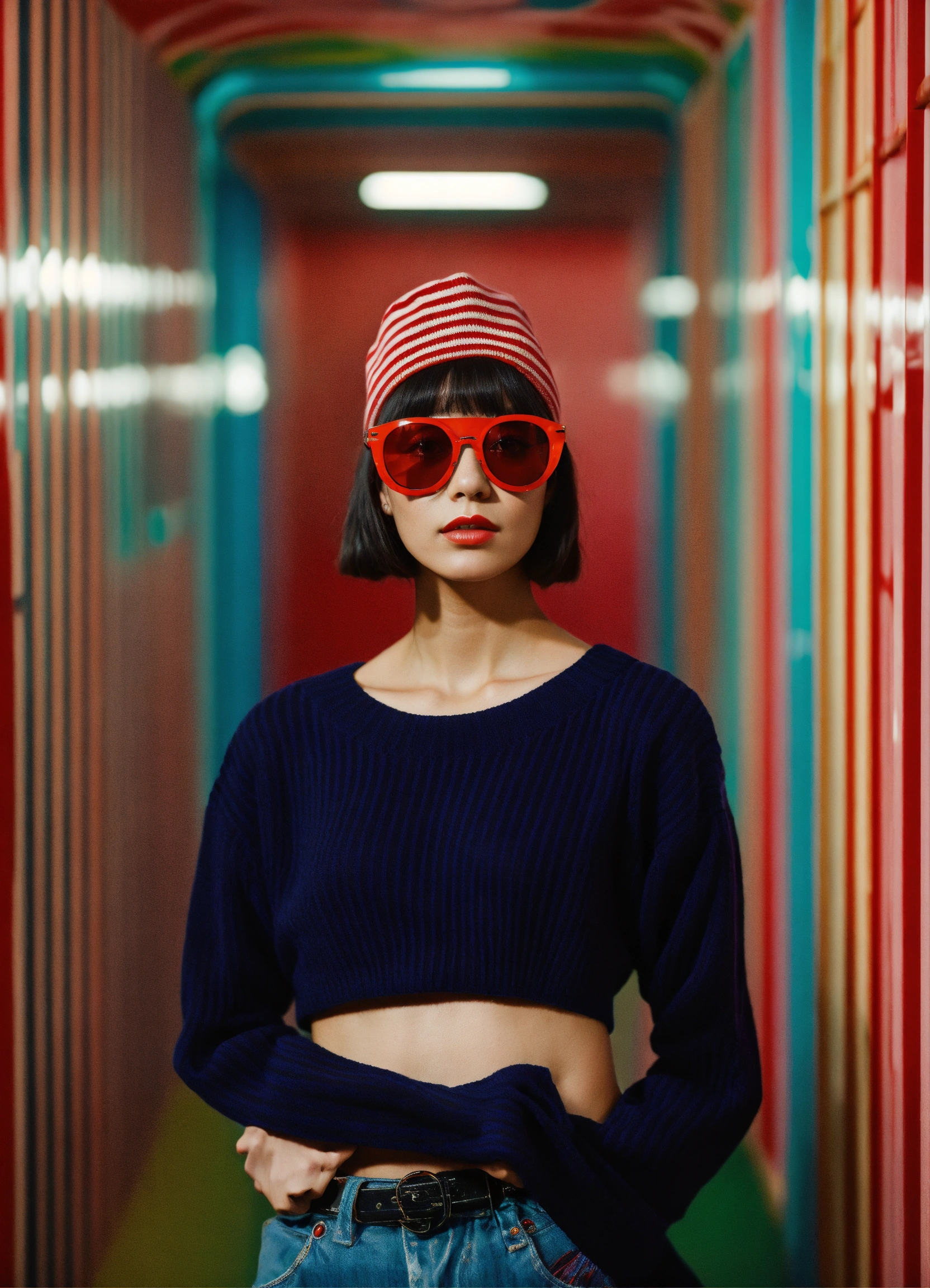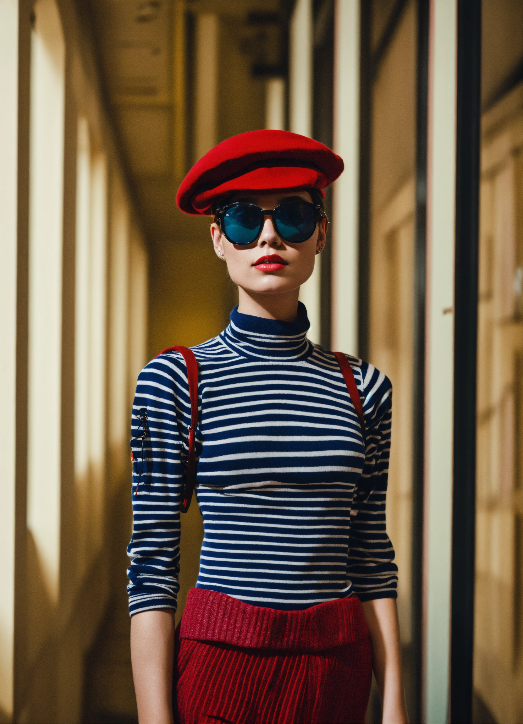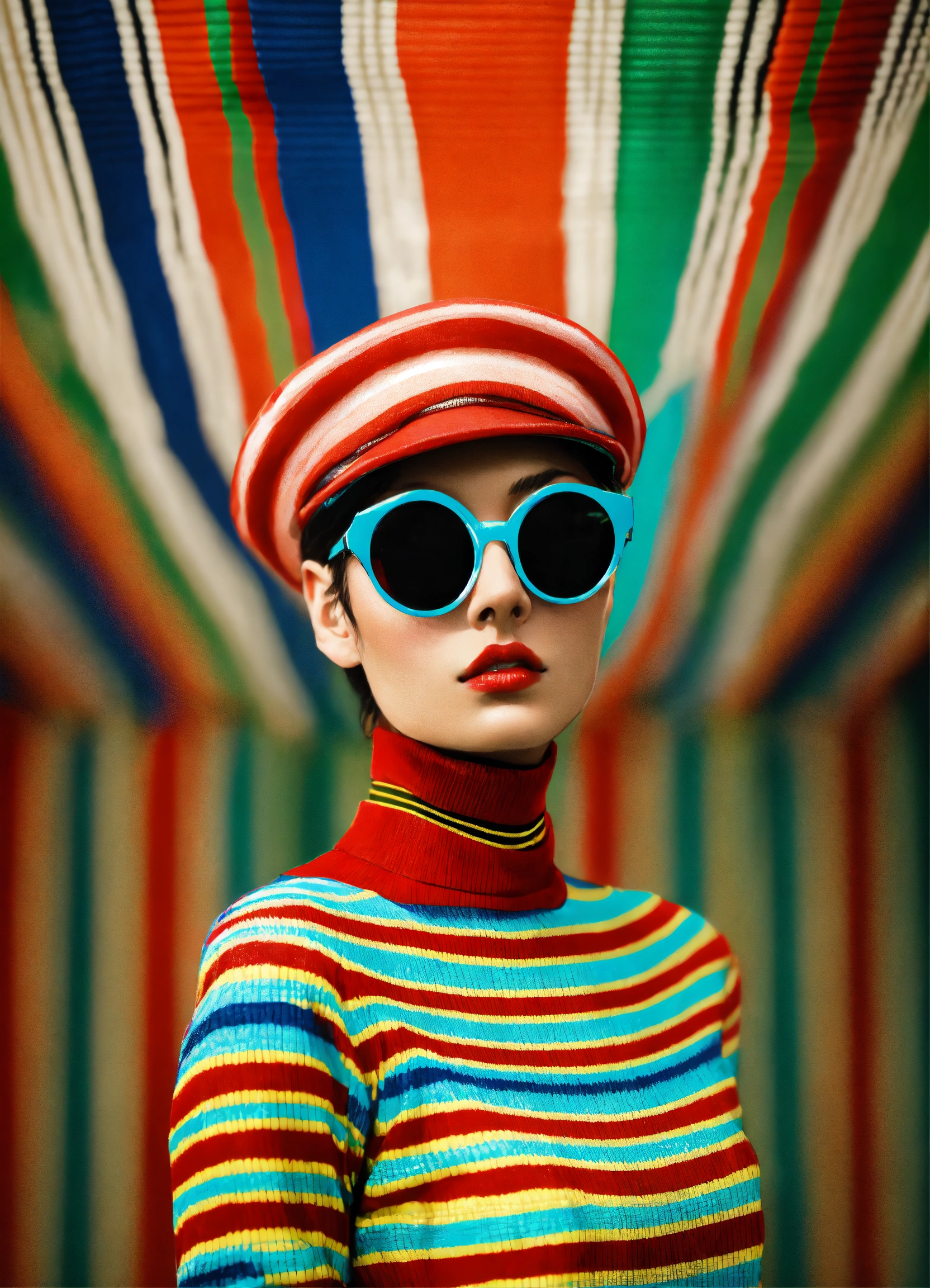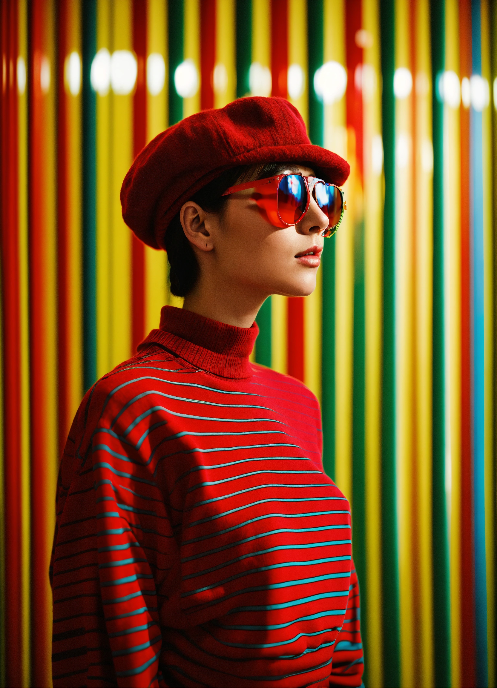 Front profile half body model show photography, in the psicodelic corridor, a alien a 50's beret, in a minimal large striped pattern pullover and large red sunglasses, futuris. issey miyaki t degree view.