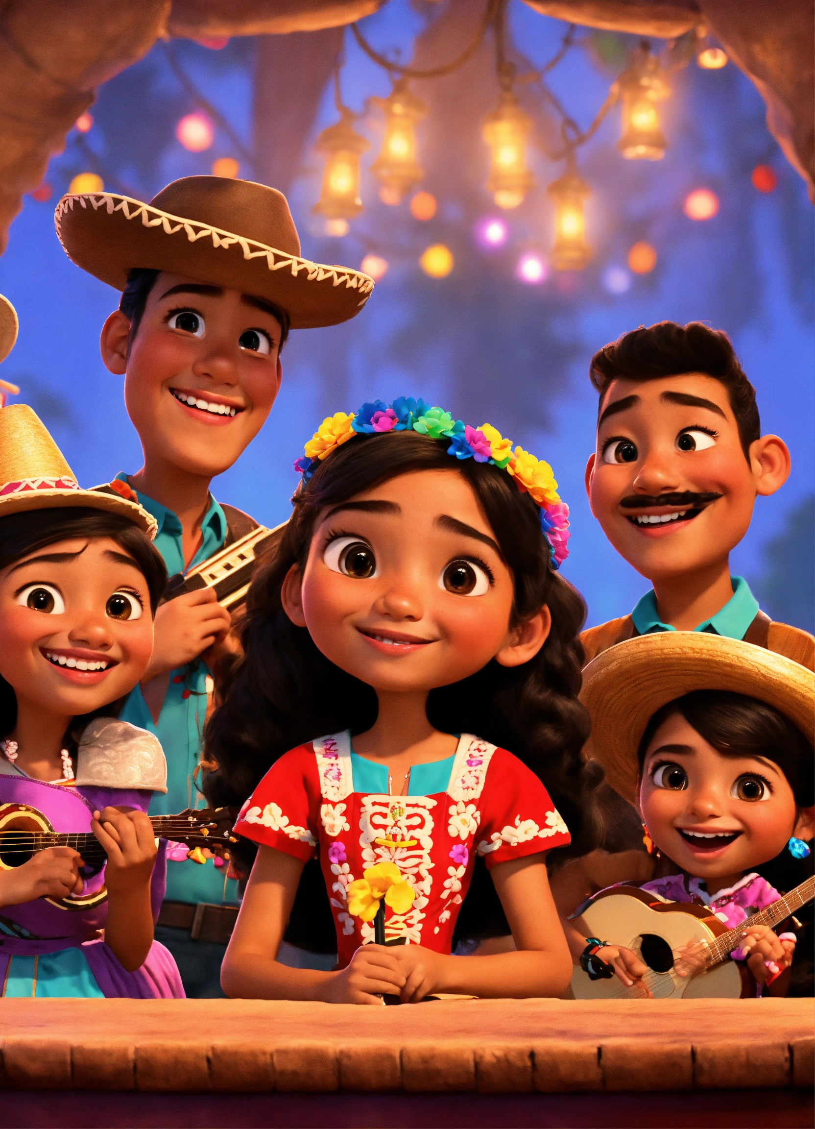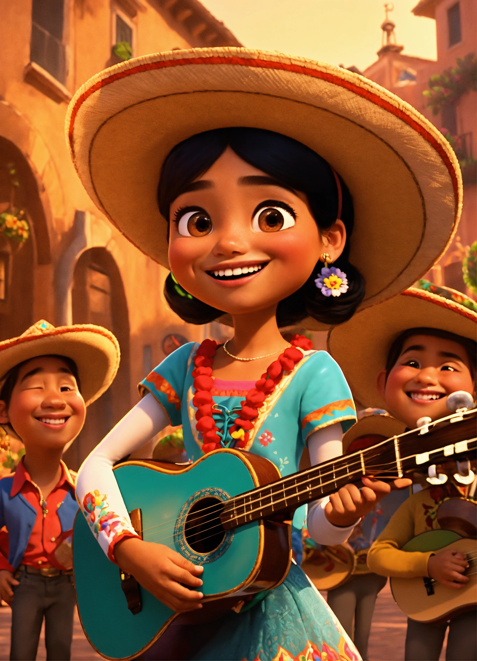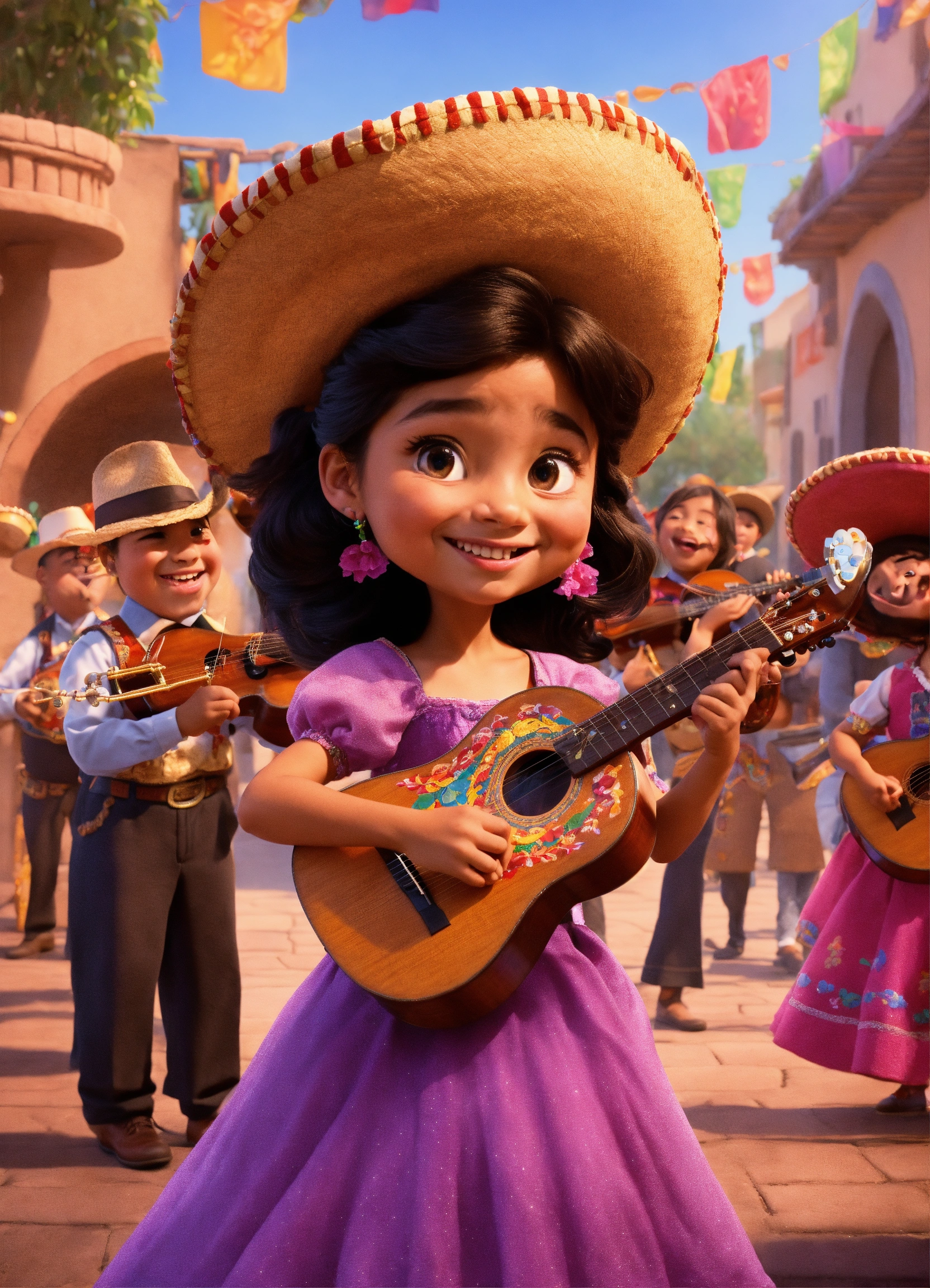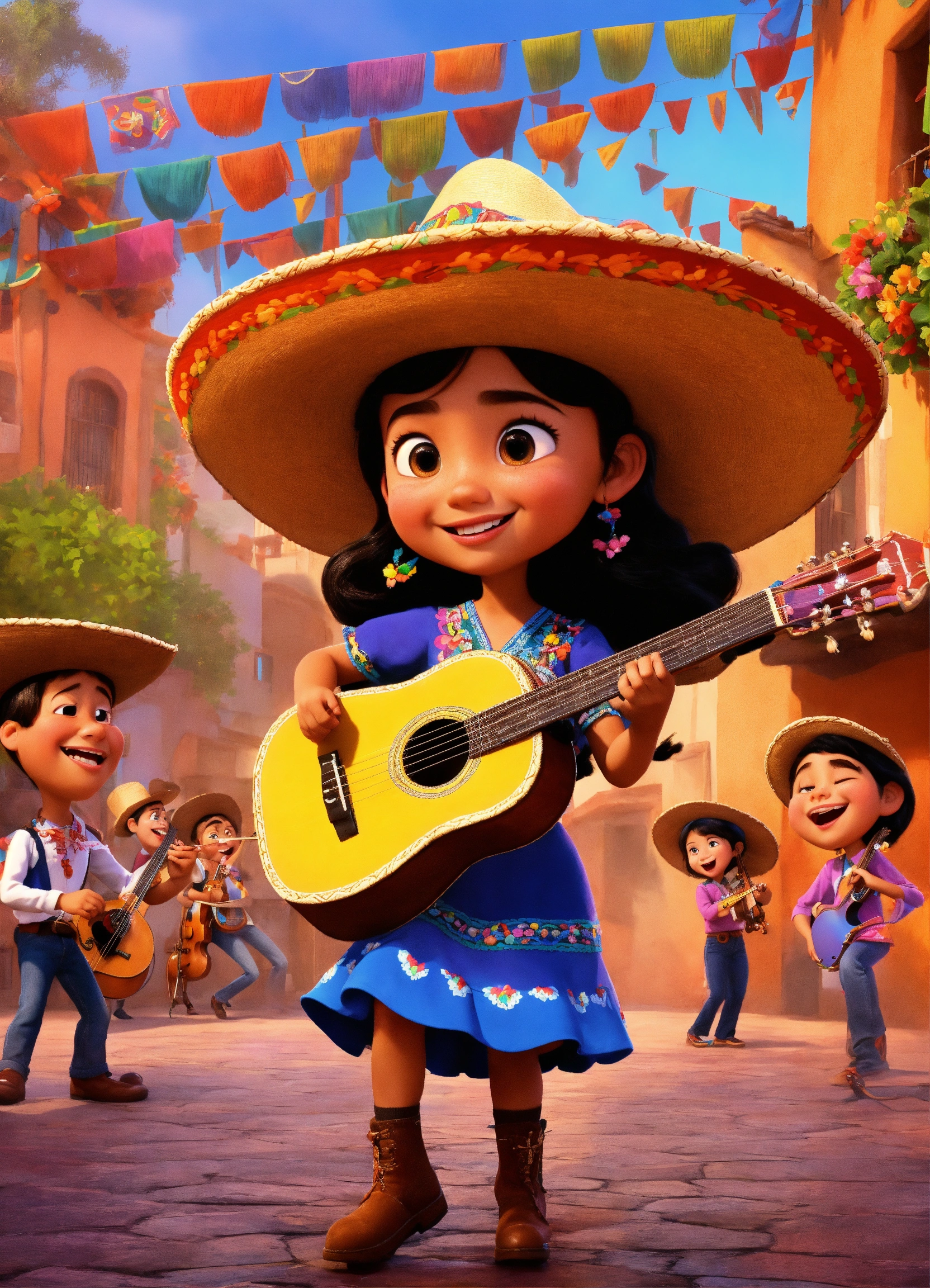 Pixar animation of hispanic 9 year old mia with local mariachi bands and musicians playing joyful tunes, pixar style cartoon