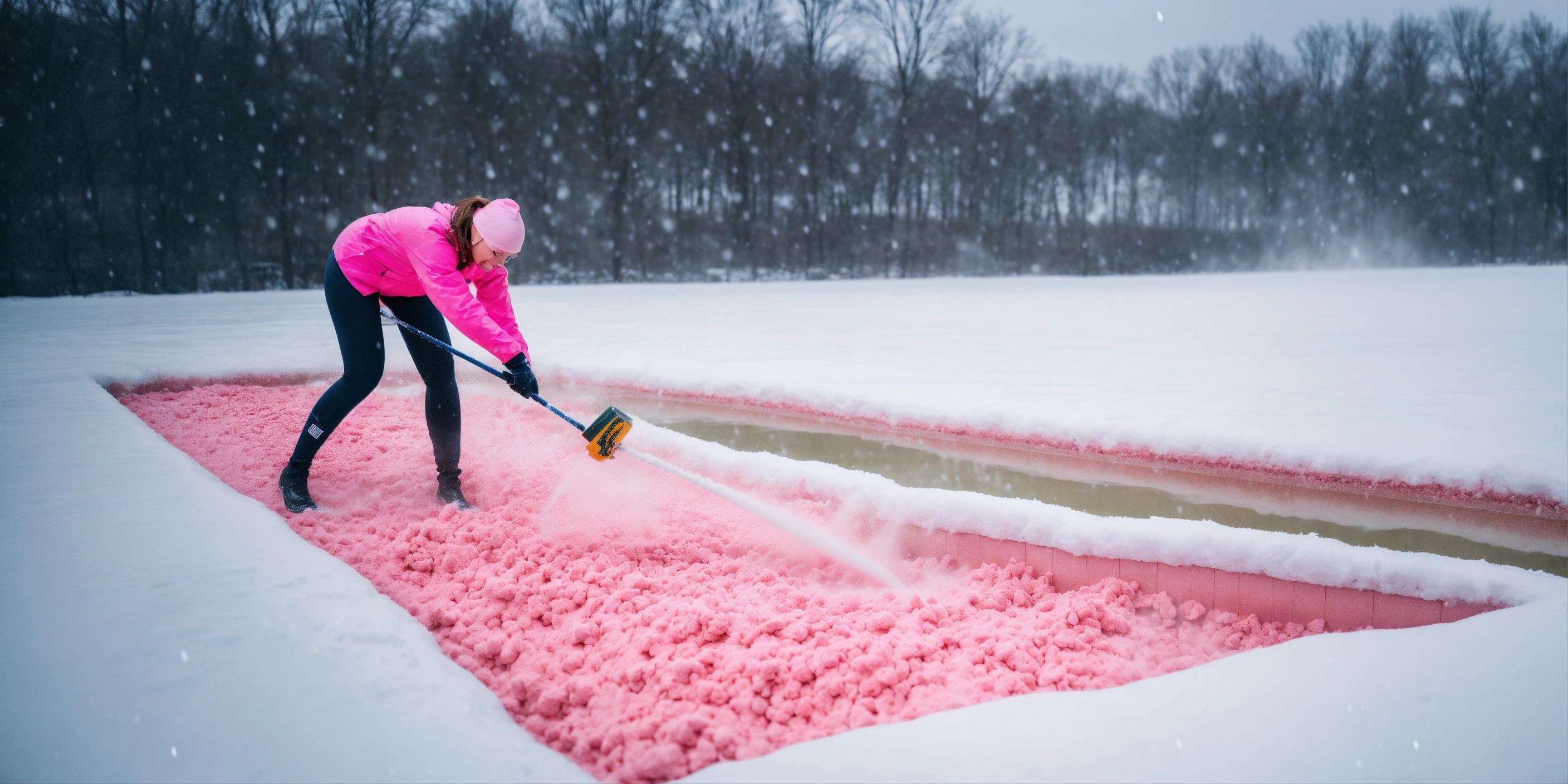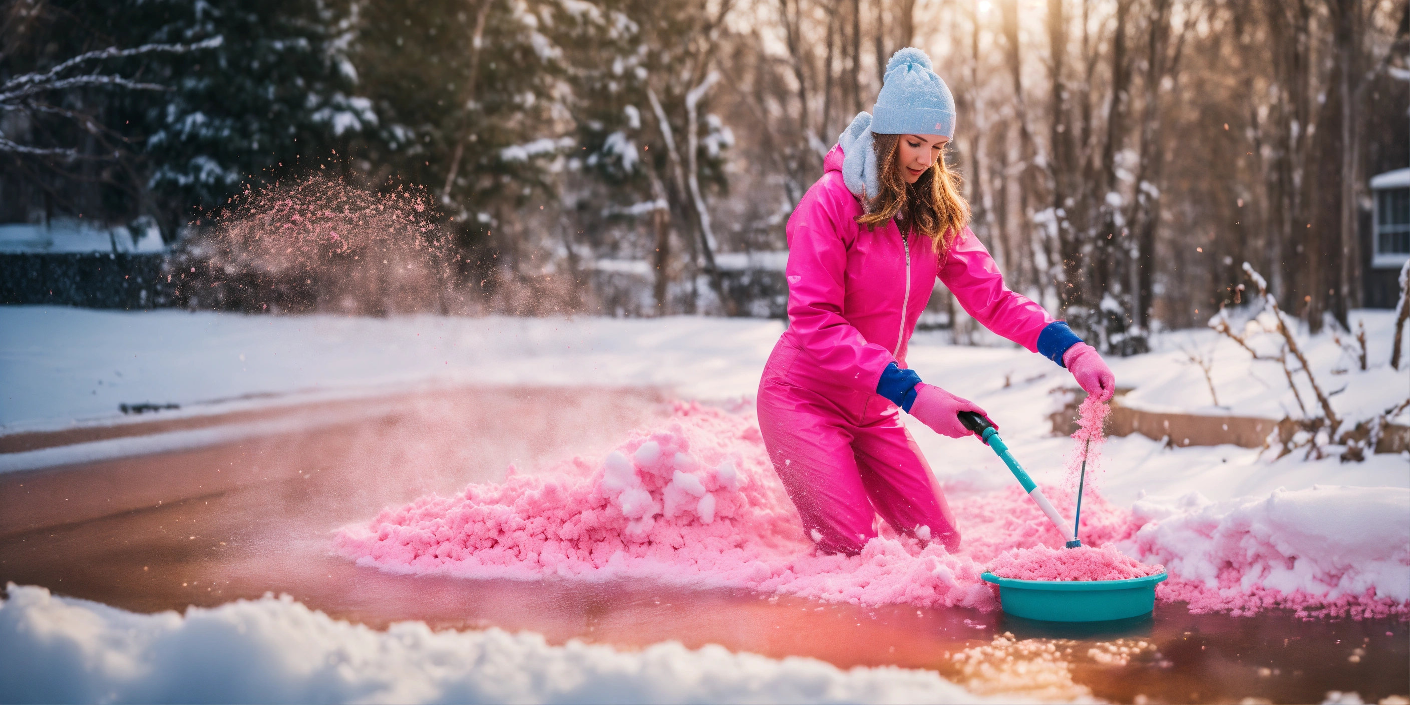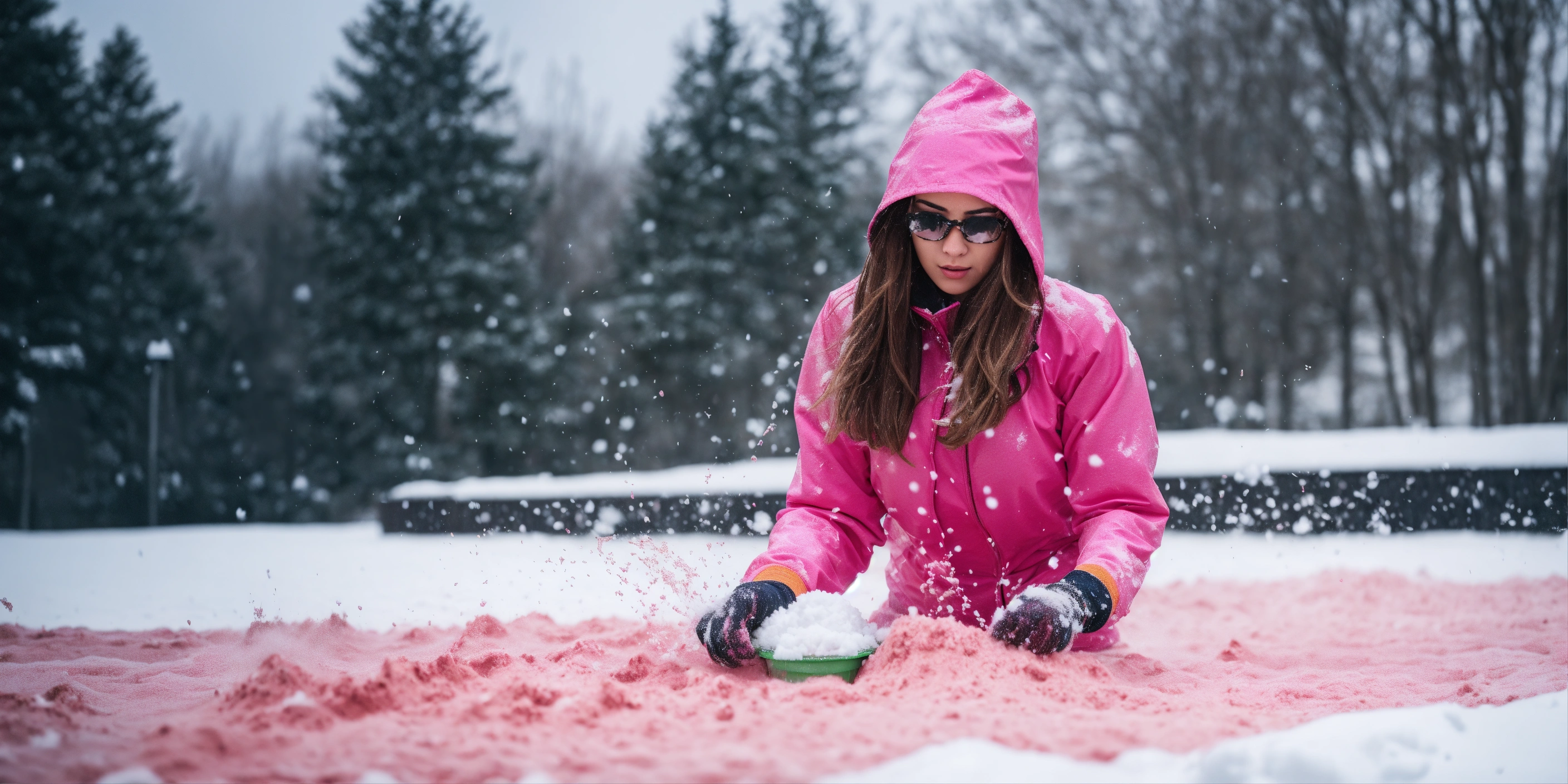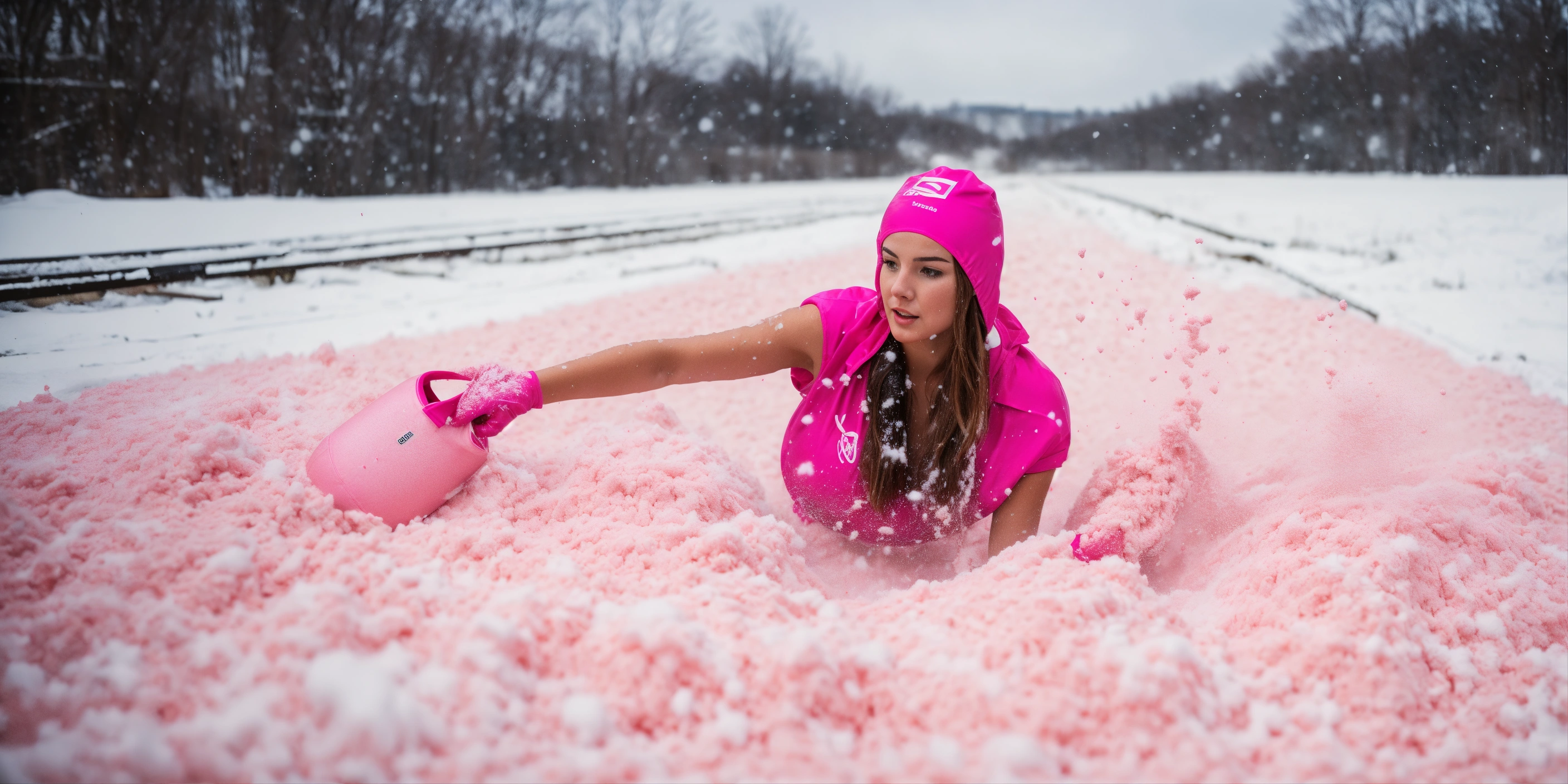 Young woman wearing pink swimming suit spreading fertilizers during very intense snow
