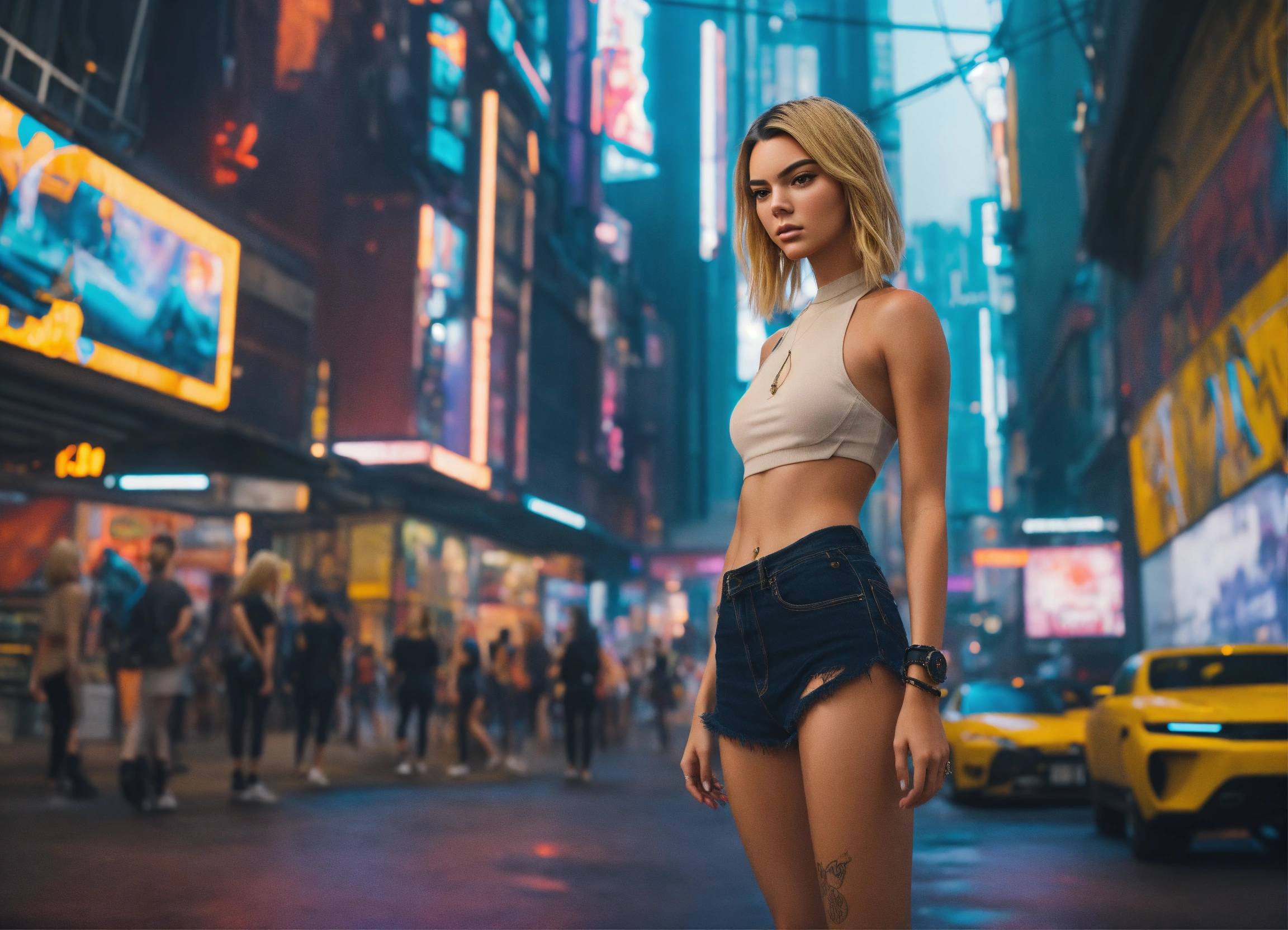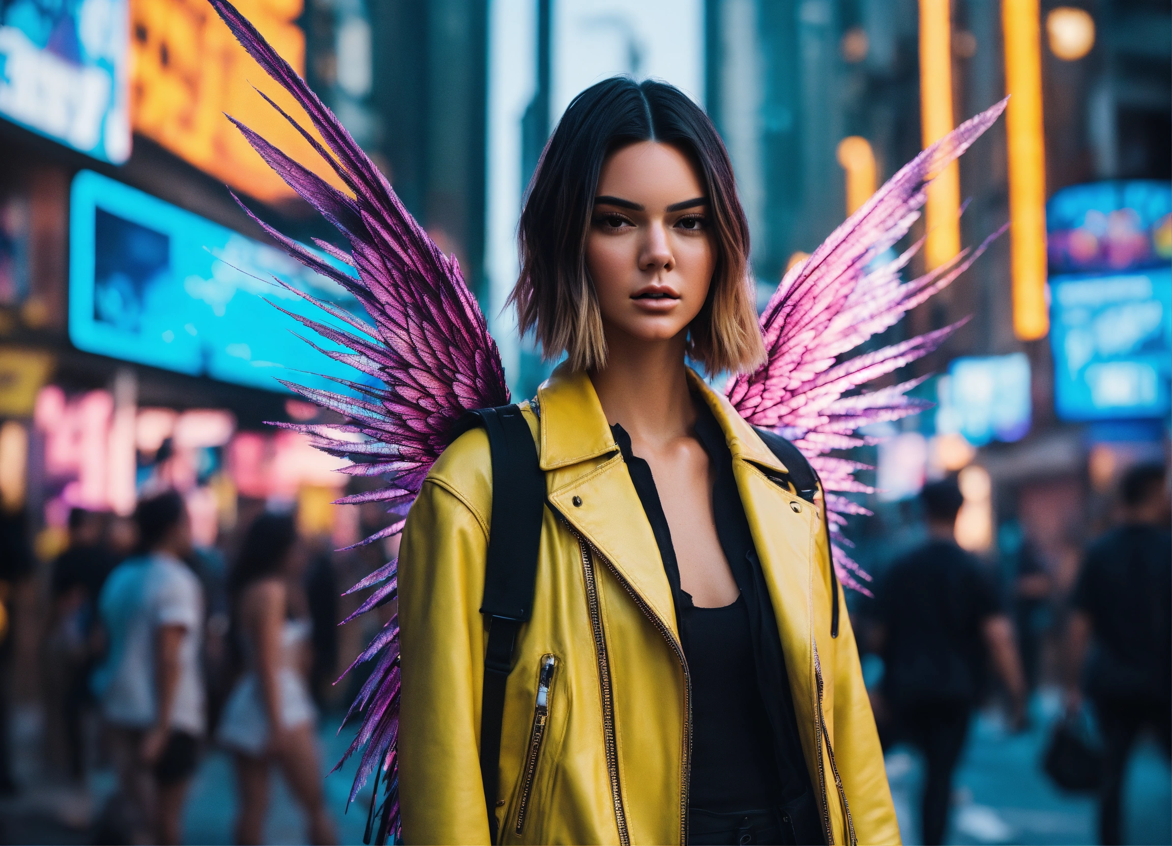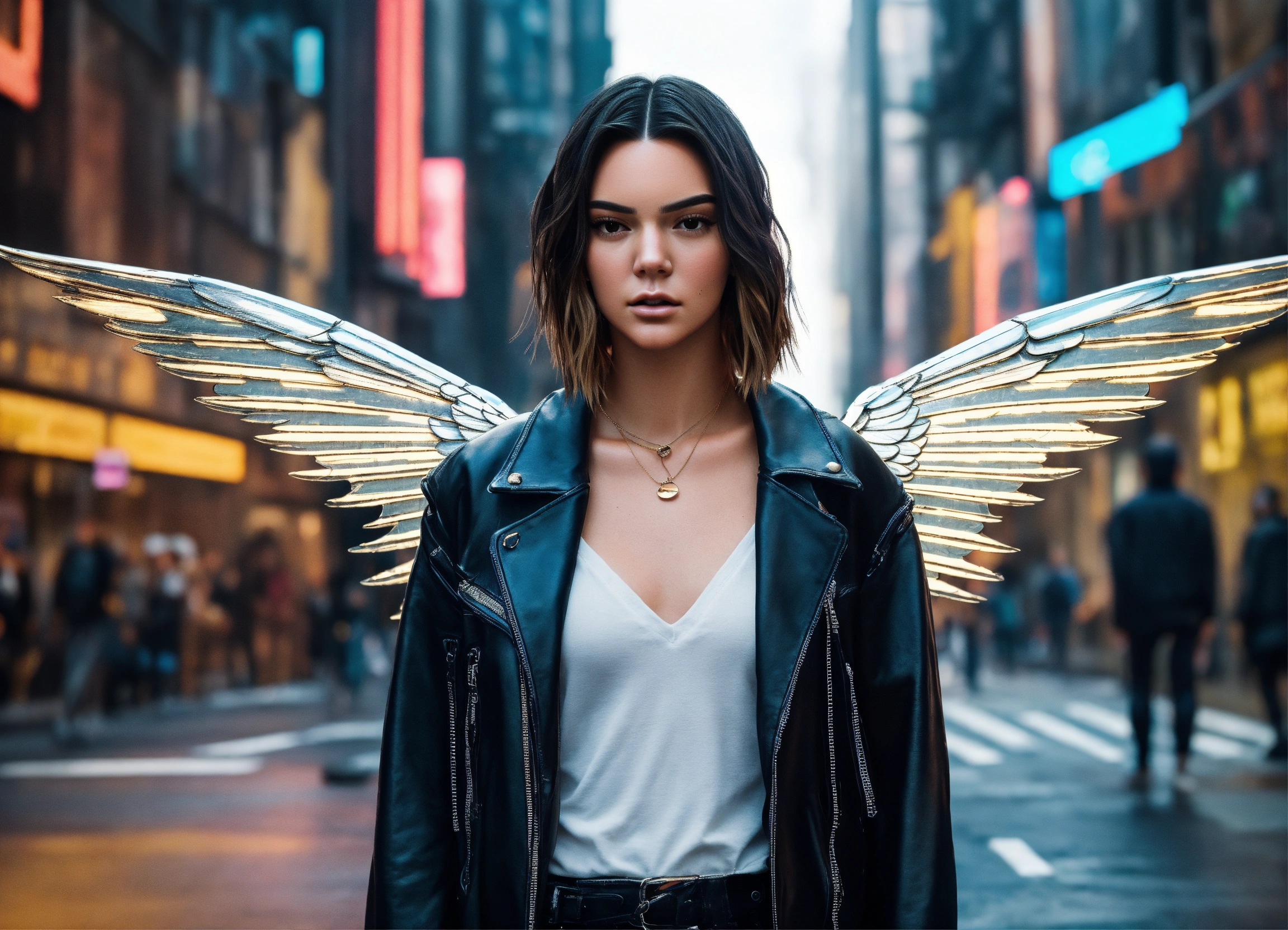 Real life photo full body digital art of a women looks like doppelgänger of kendall jenner with real big angelwing's in a cyberpunk like city has blond hair street