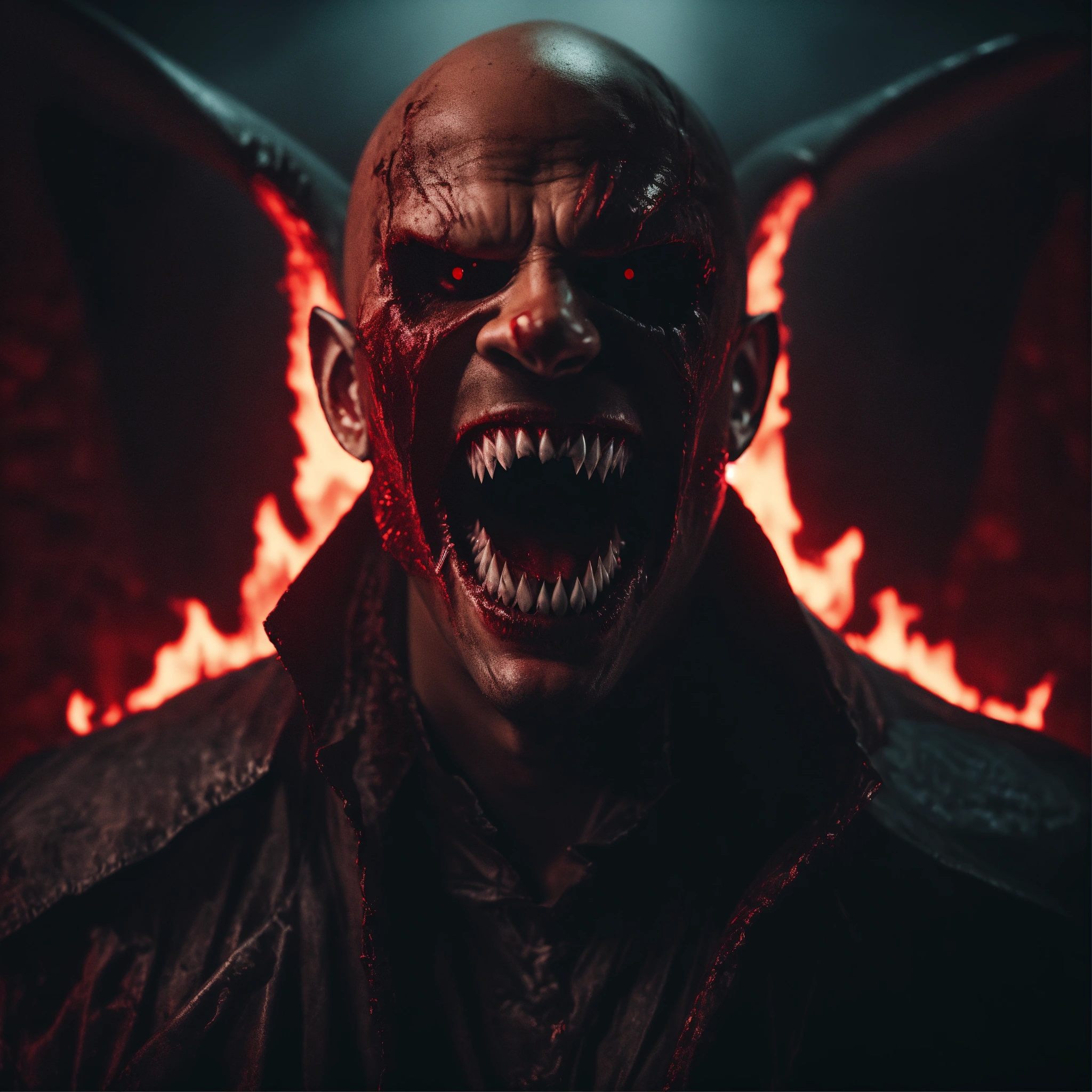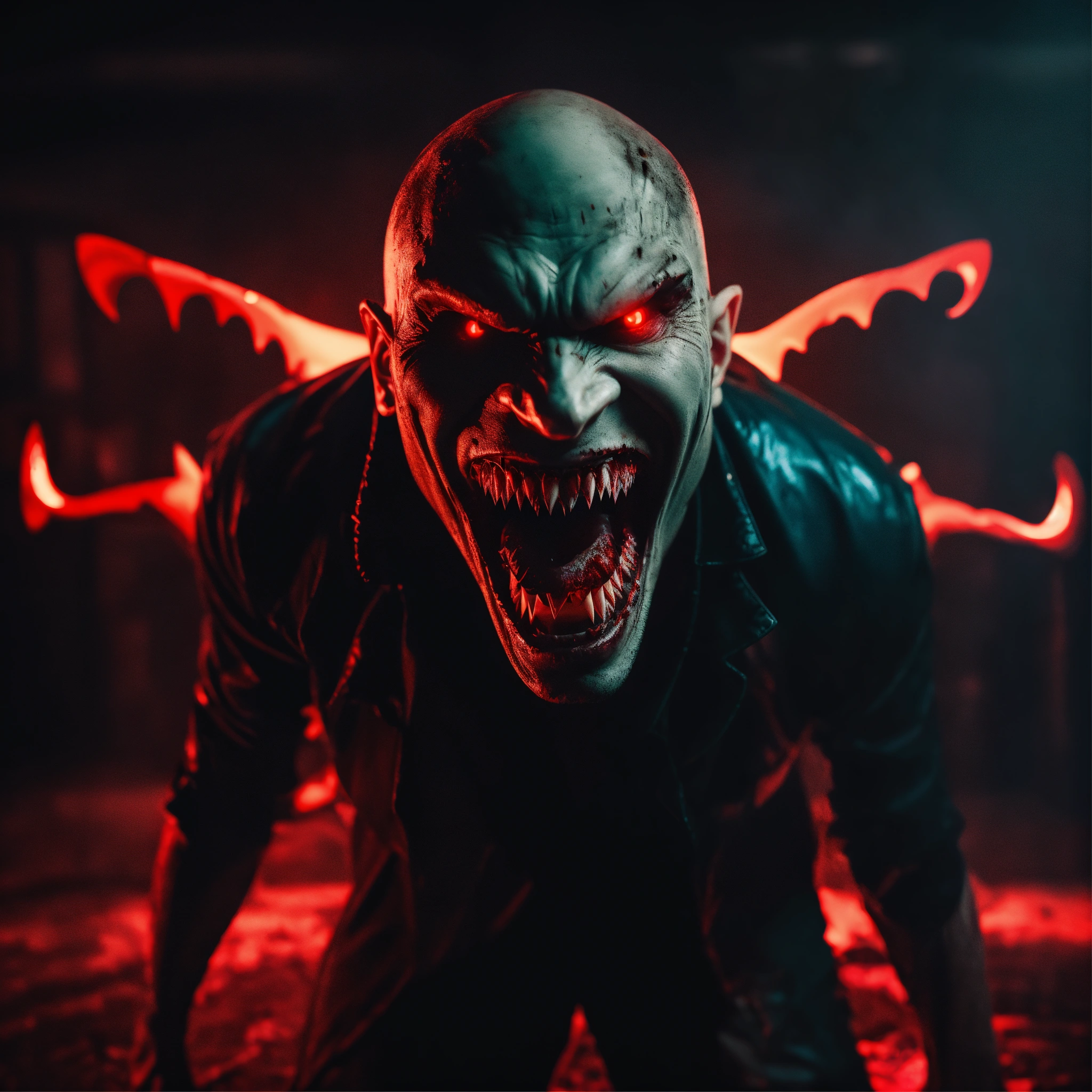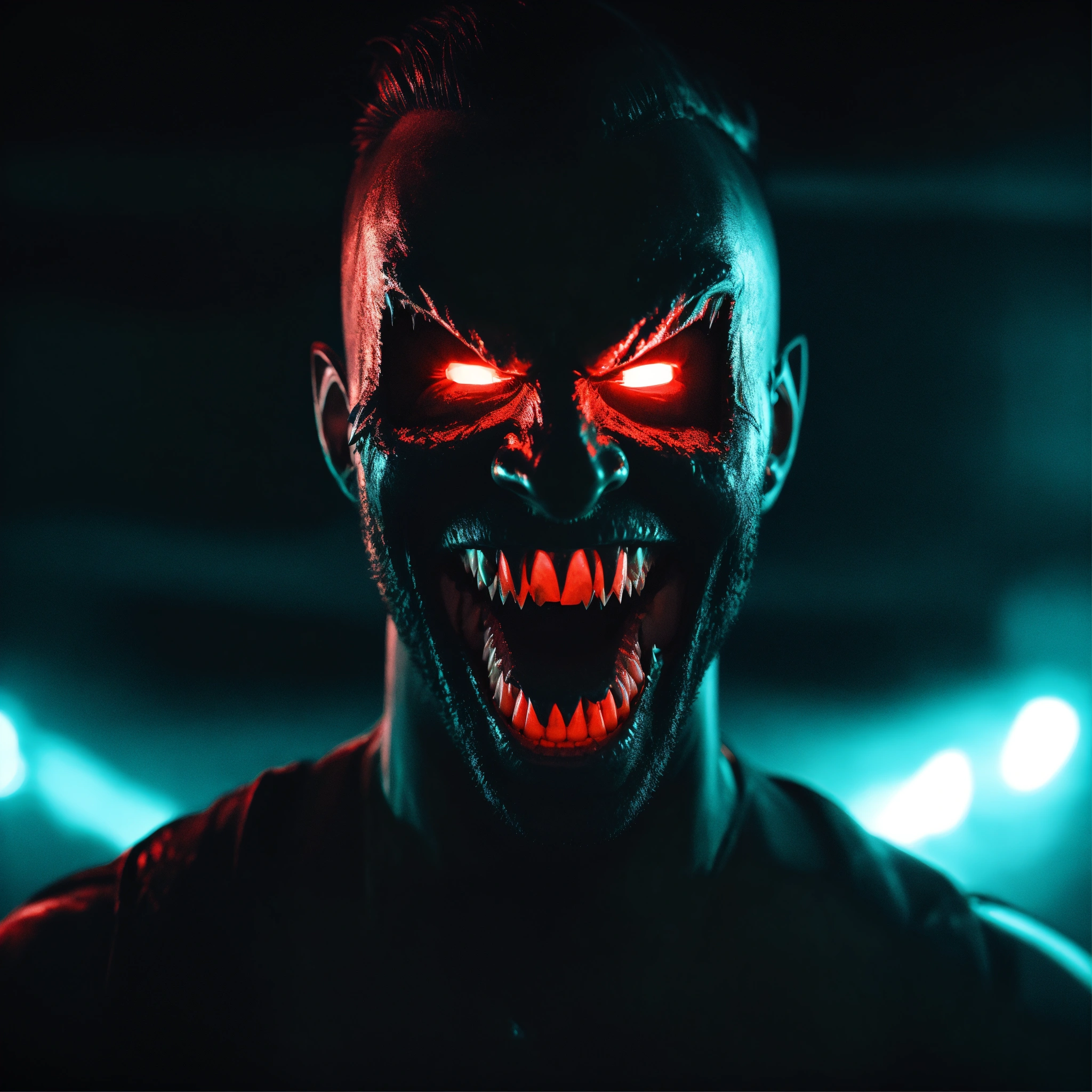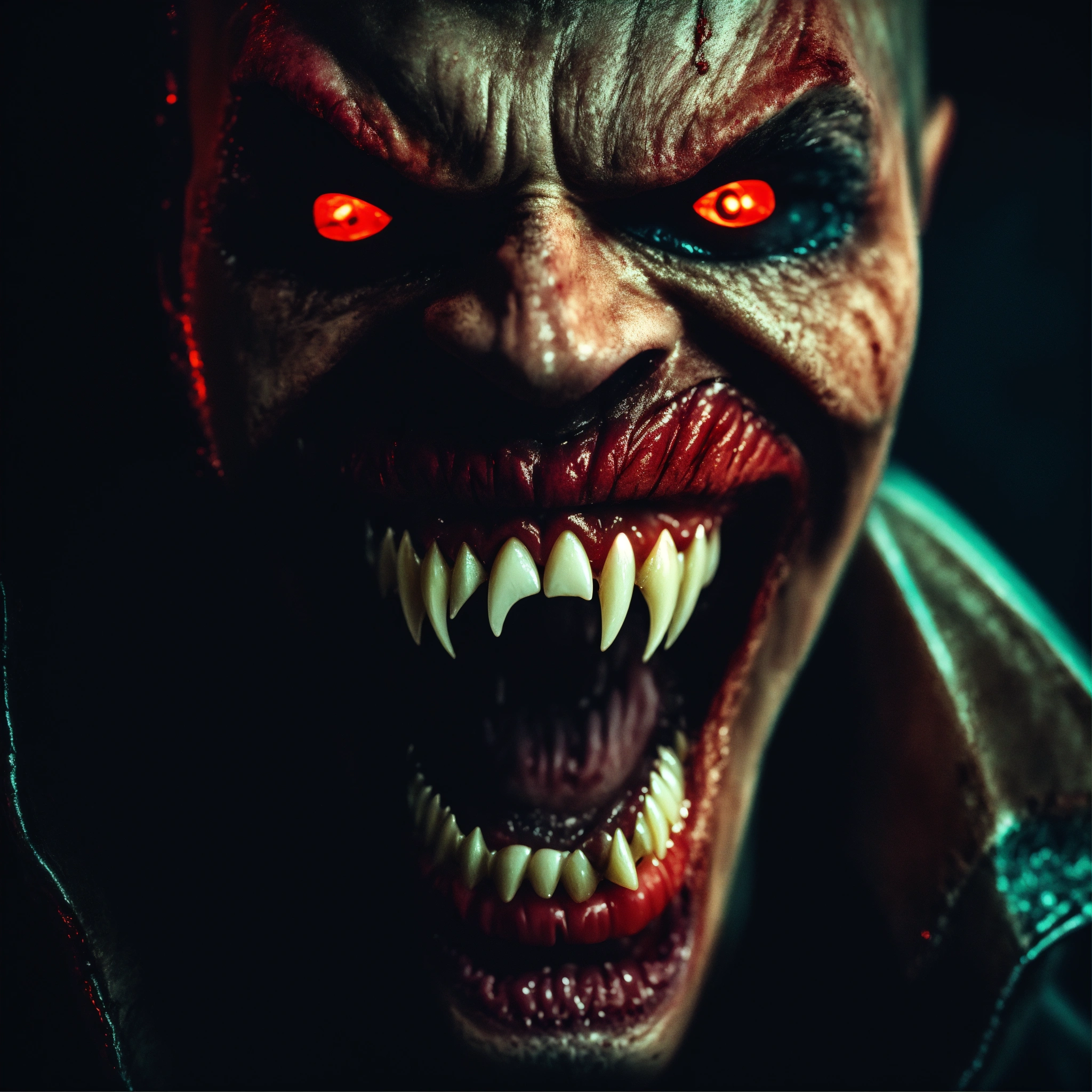 Deranged evil vampire-like man standing in a dark room, laughing sadistically, showing shark-like teeth, fangs, glowing red eyes, a close-up image, 8k render, grunge, solid black background, surreal, cinematic, lighting