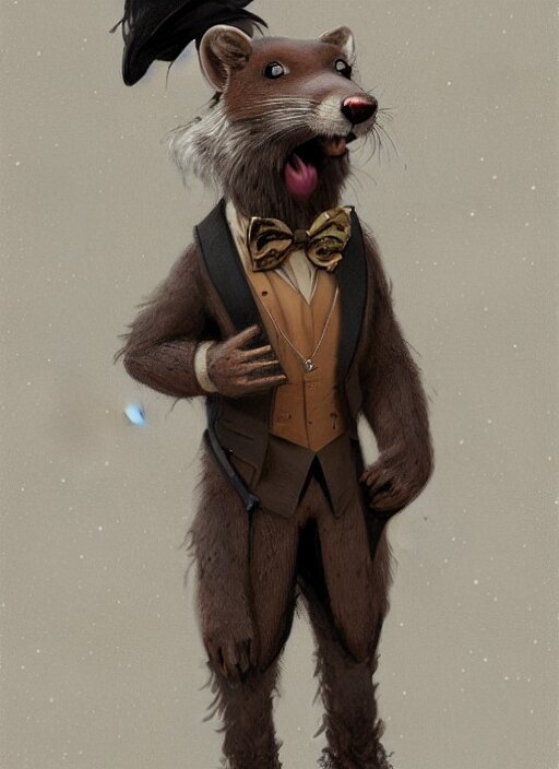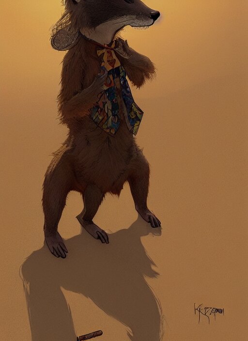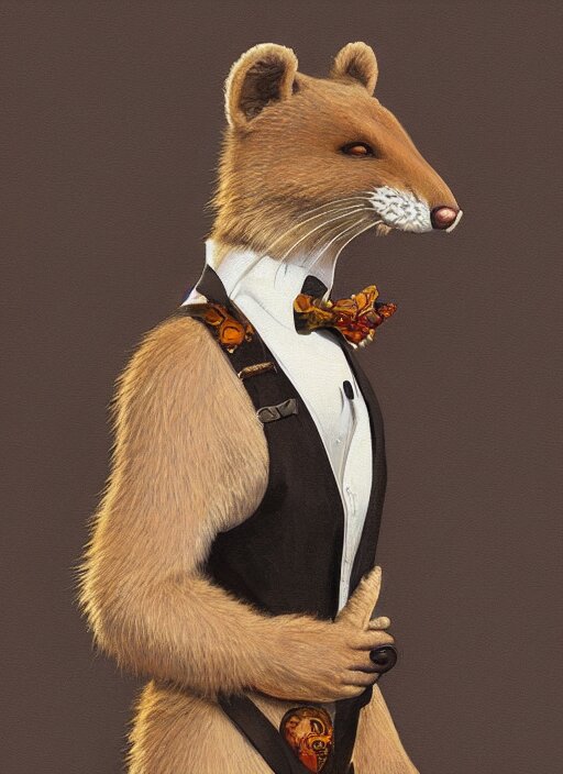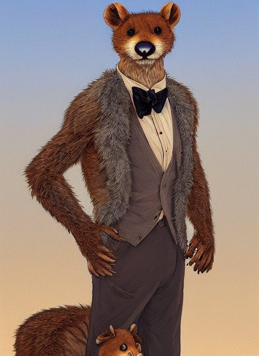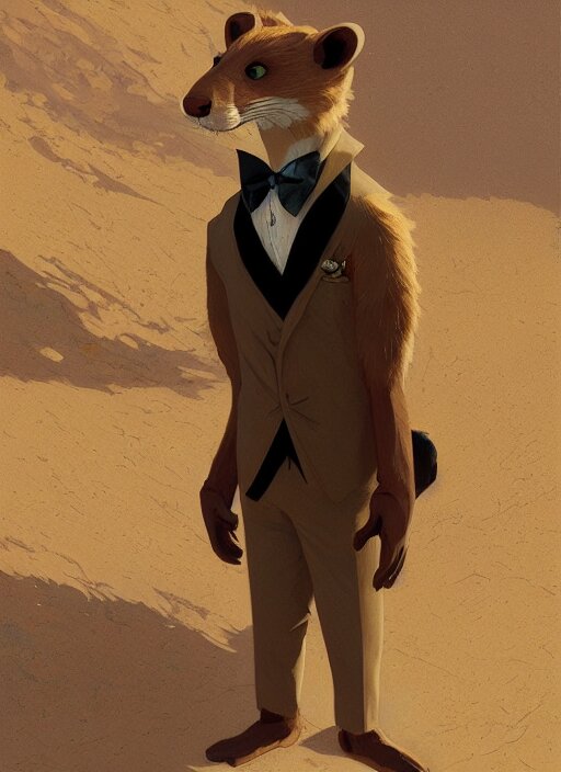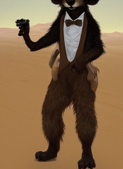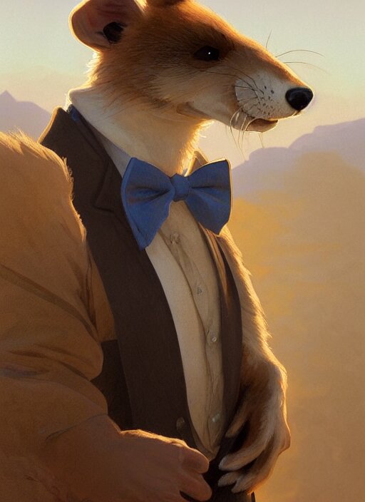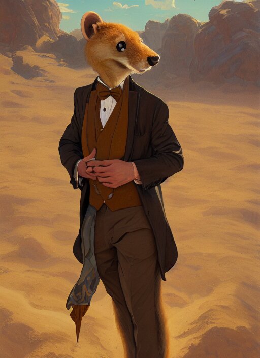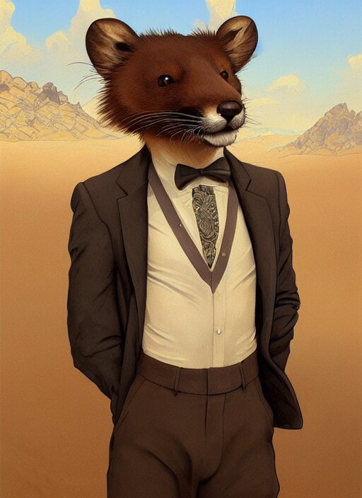 Character portrait of a happy furry anthro weasel wearing a tan vest, bowtie, black slacks in the desert wilderness, intricate, elegant, highly detailed, digital painting, artstation, concept art, smooth, sharp focus, illustration, art by krenz cushart and artem demura and alphonse mucha