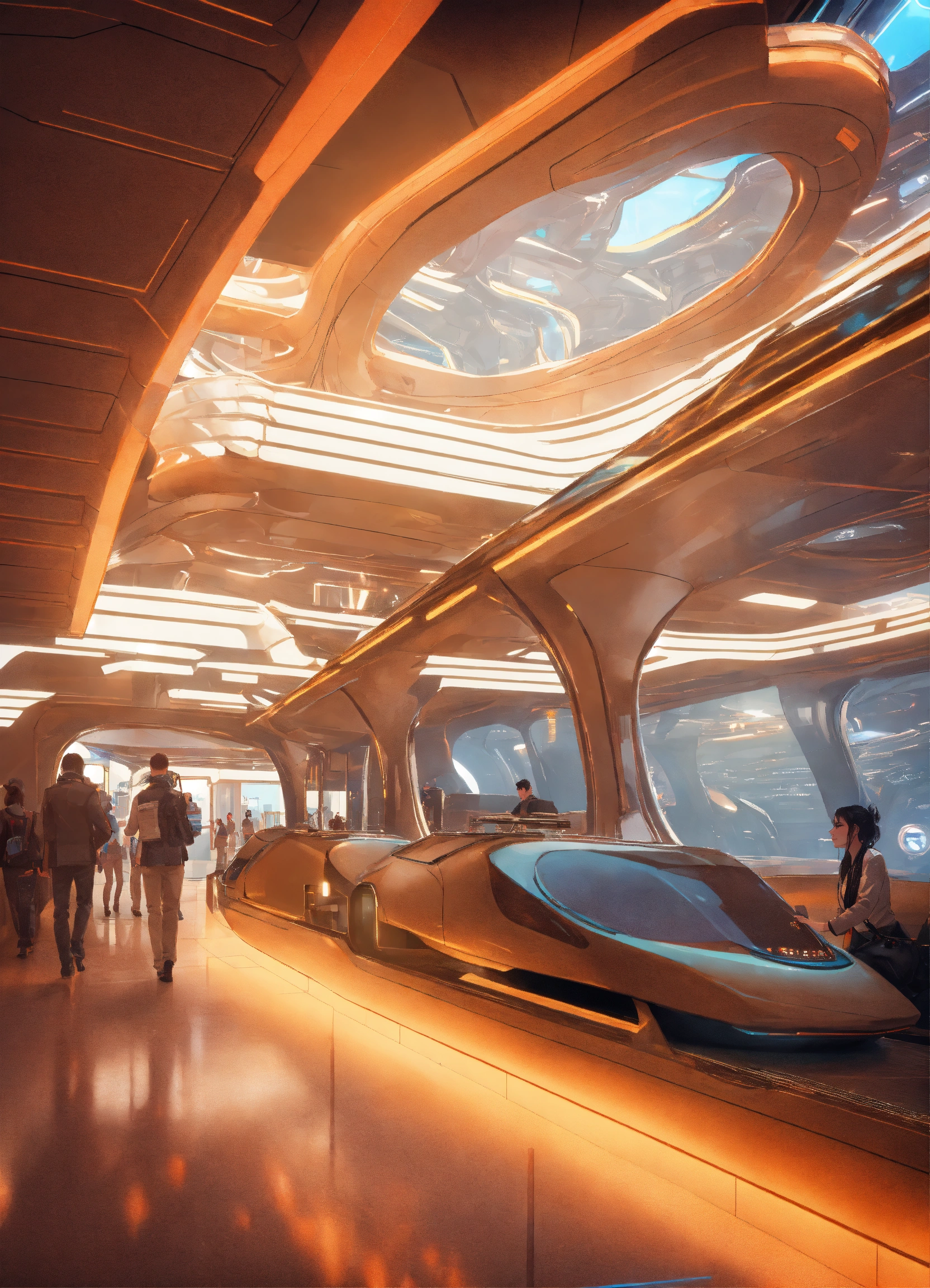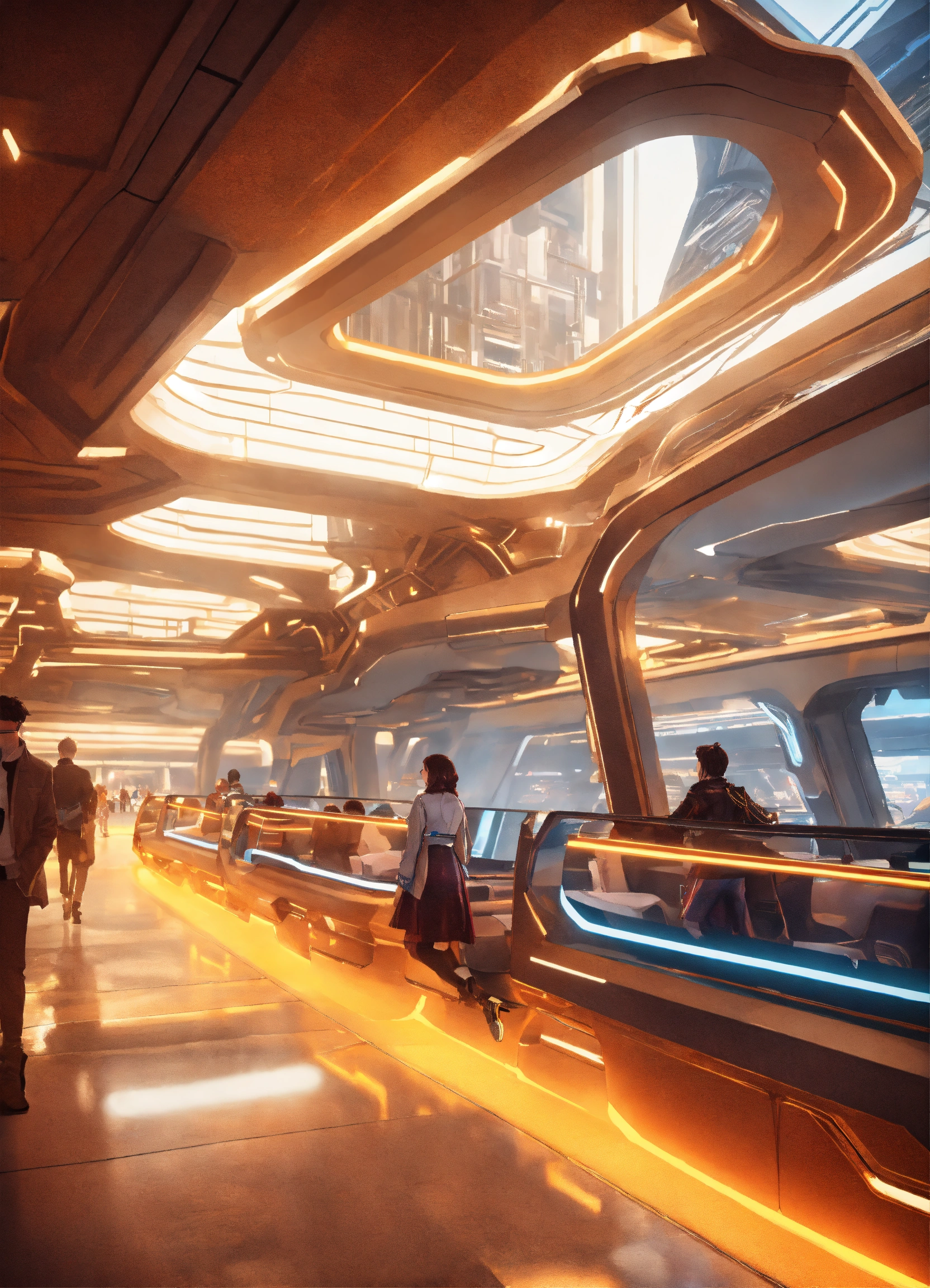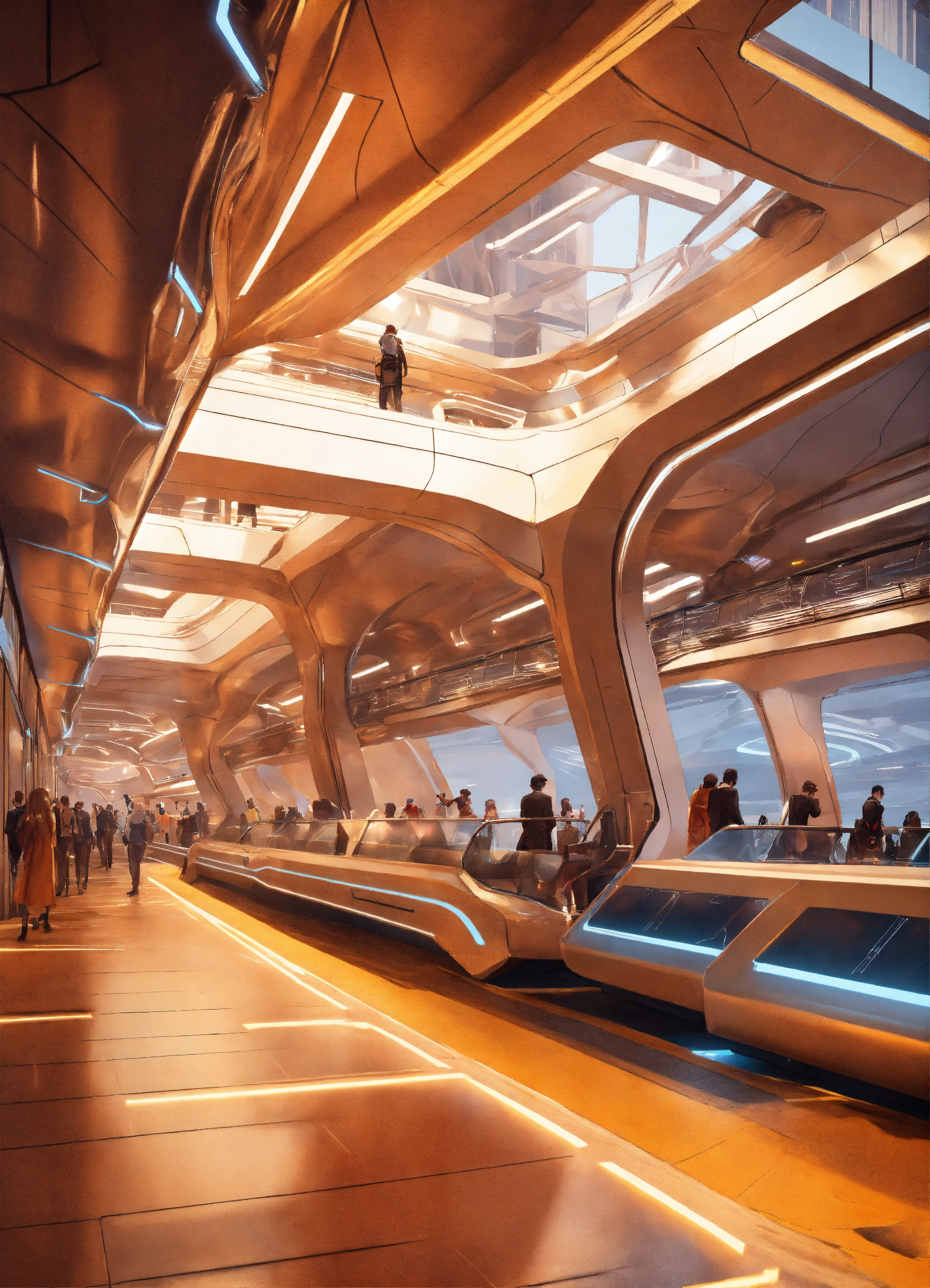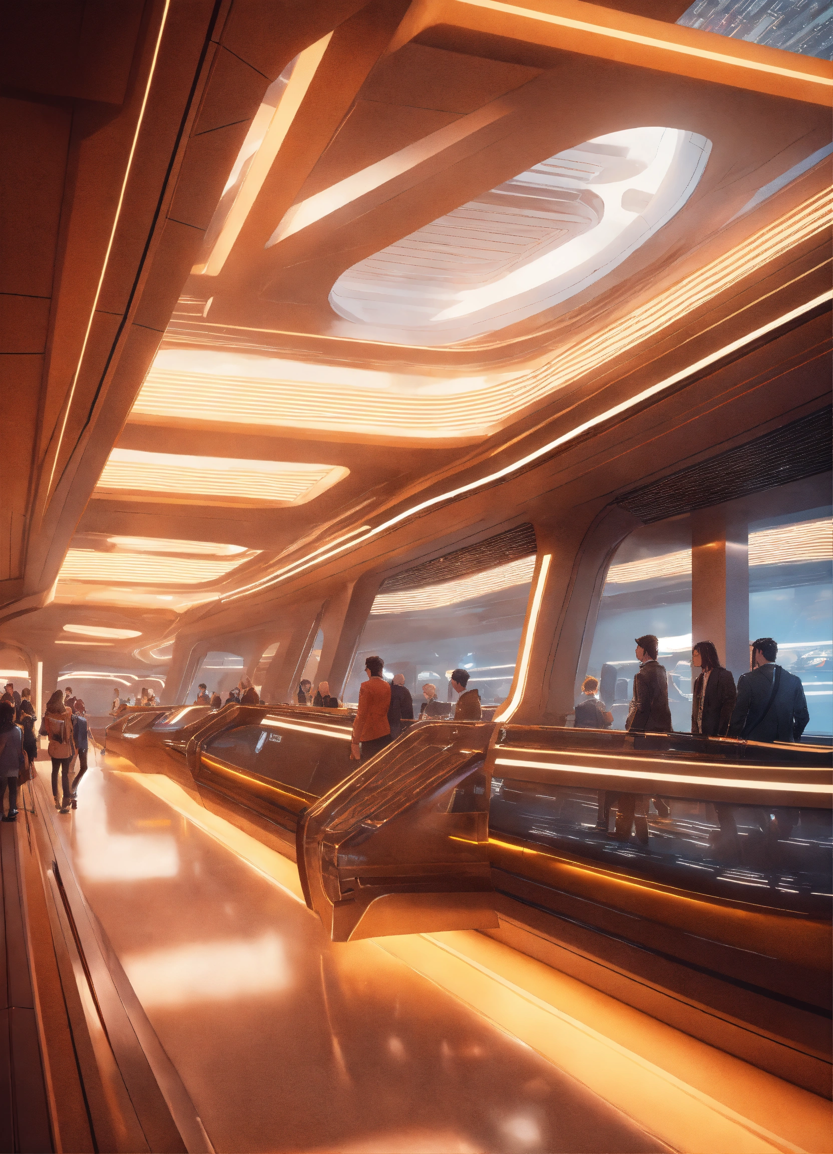 The crowd moves mindlessly through the people movers on a fancy space port hotel, realistic, futuristic, sci-fi, 8k, unreal engine, zaha hadid