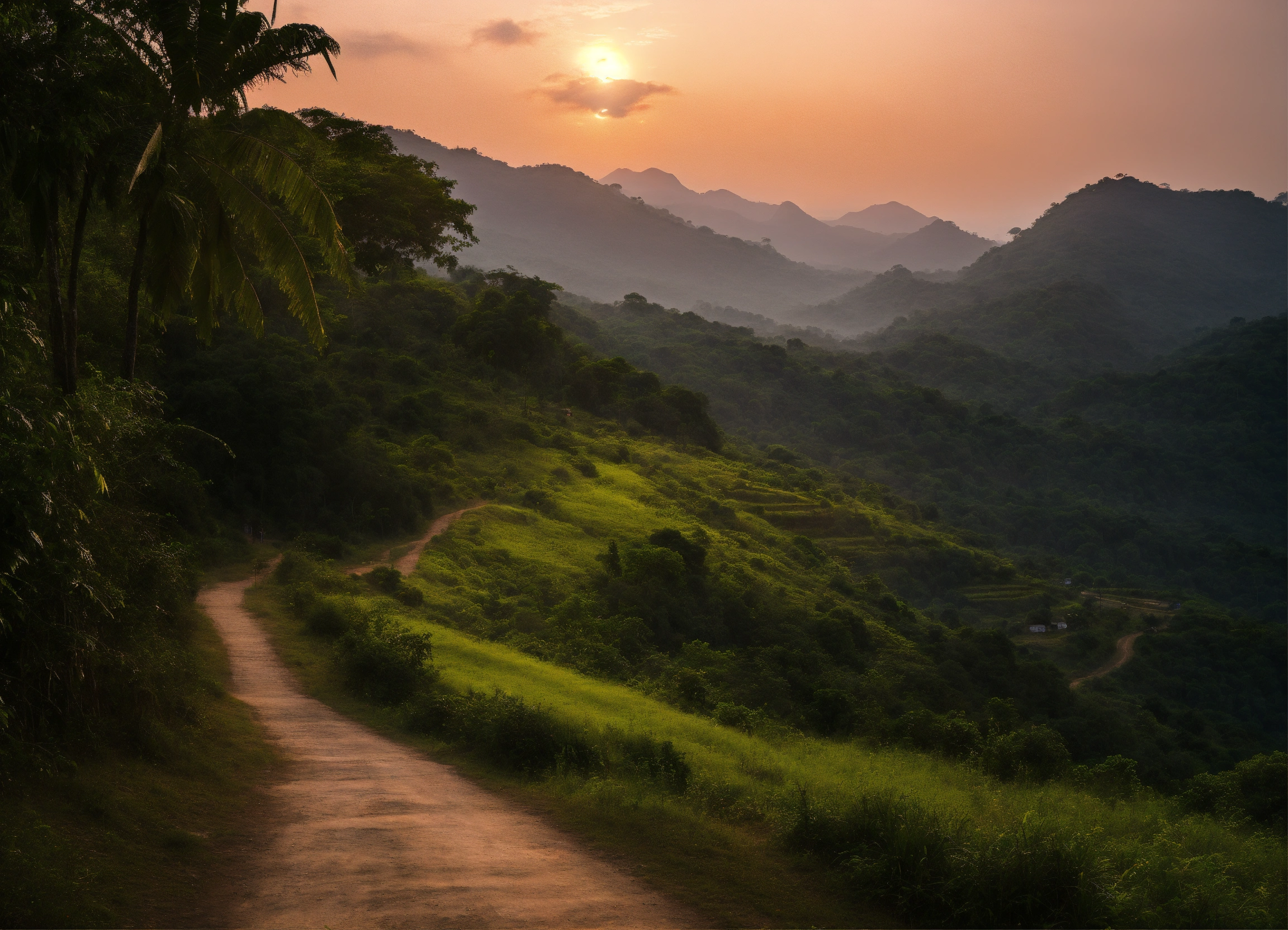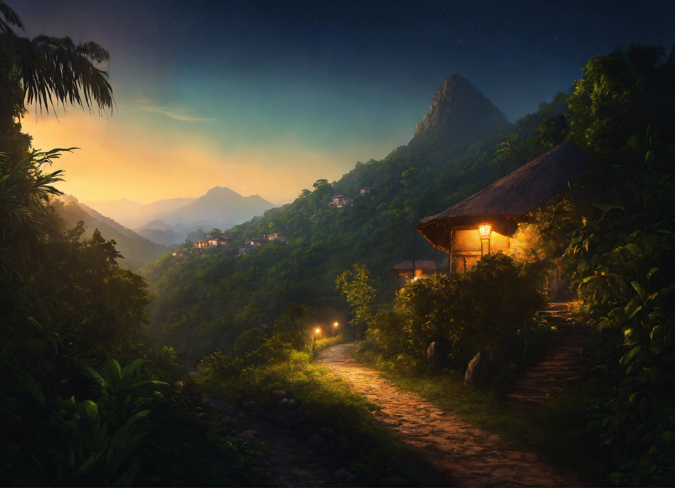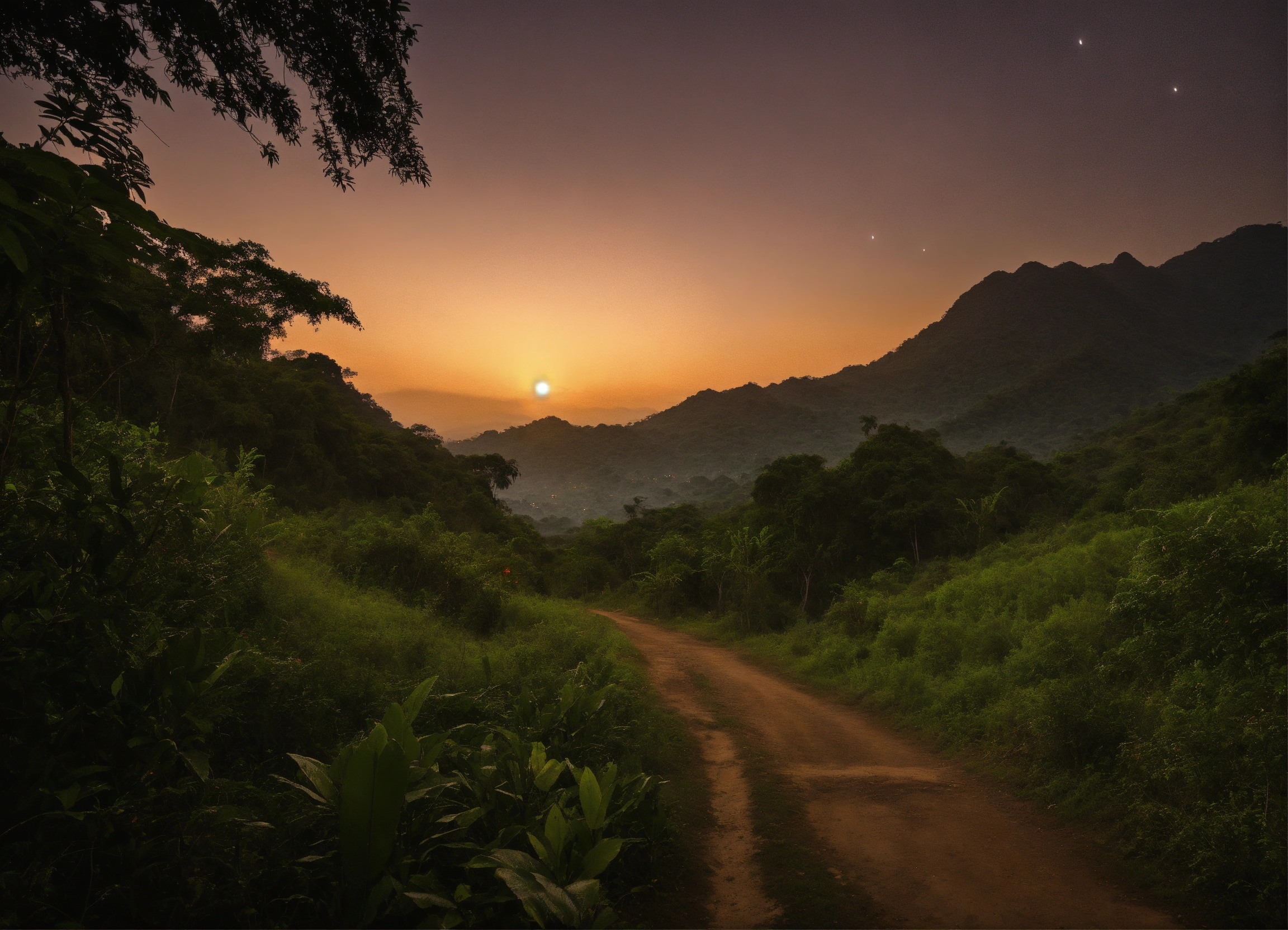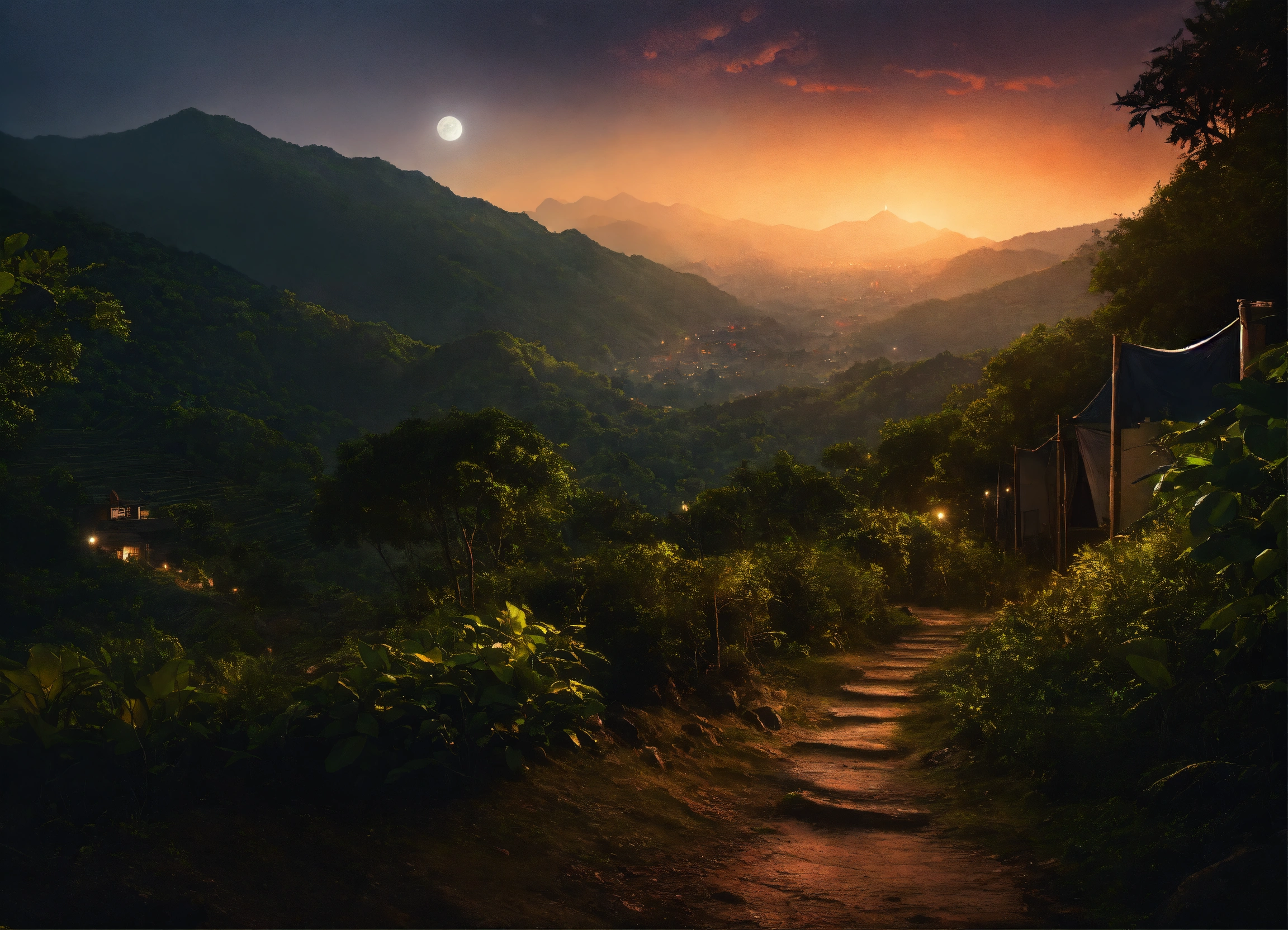 At night a footpath through a hilly landscape, jungle mountains on the left side, the heat is oppressive, the air humidity is high, medieval setting