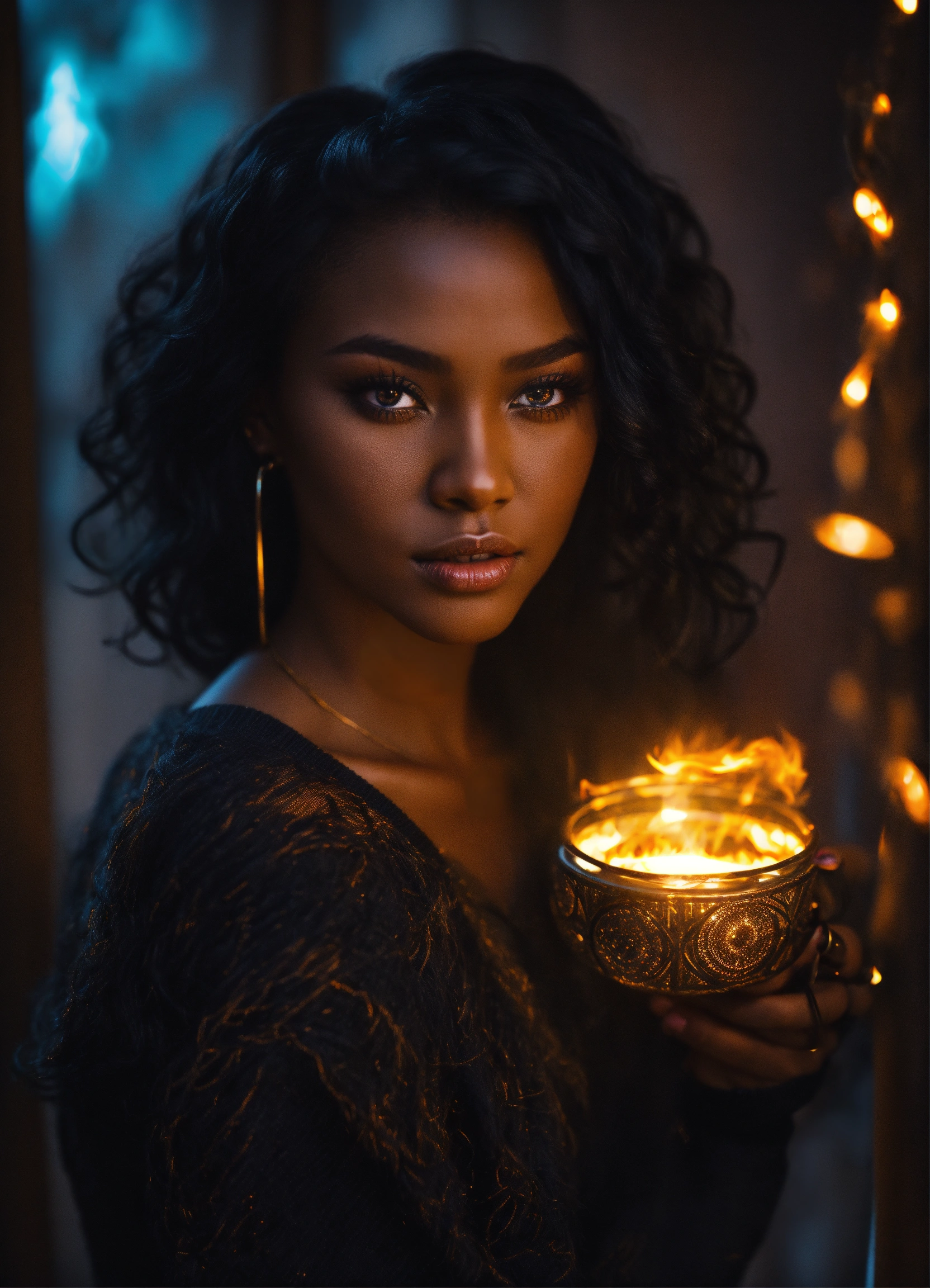 Beautiful black female, slim face, black jeans, tight sweater, jet black hair, light glowing eyes, witch, magic, ring of fire