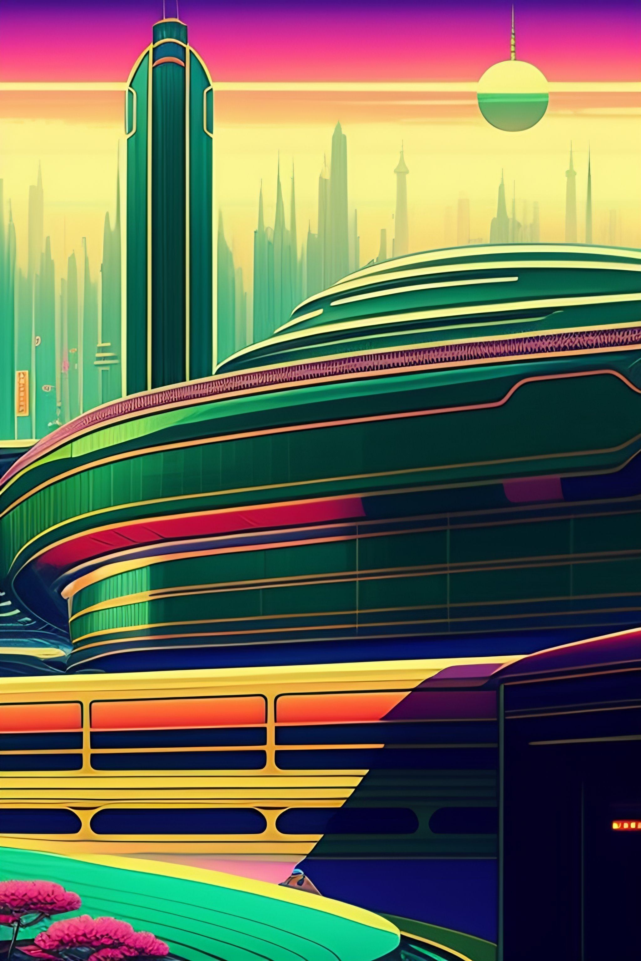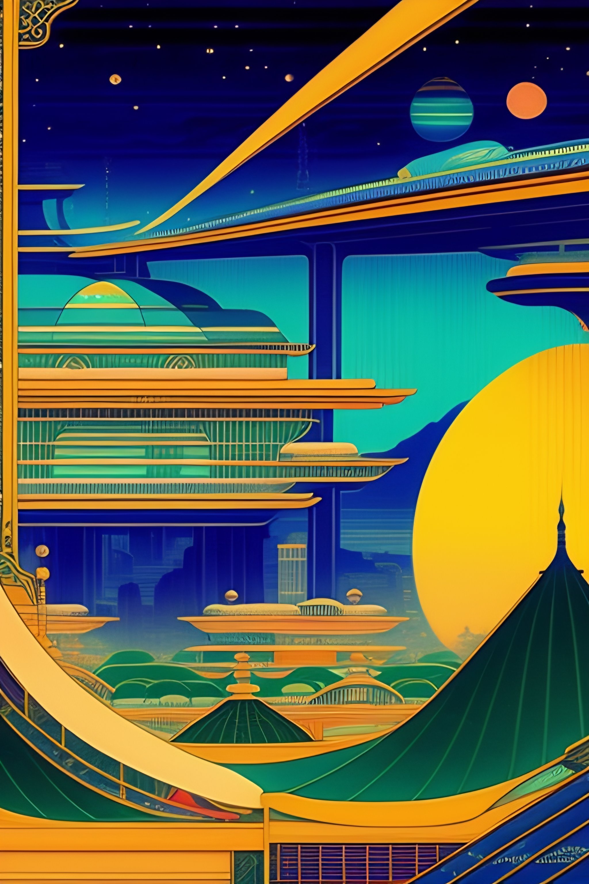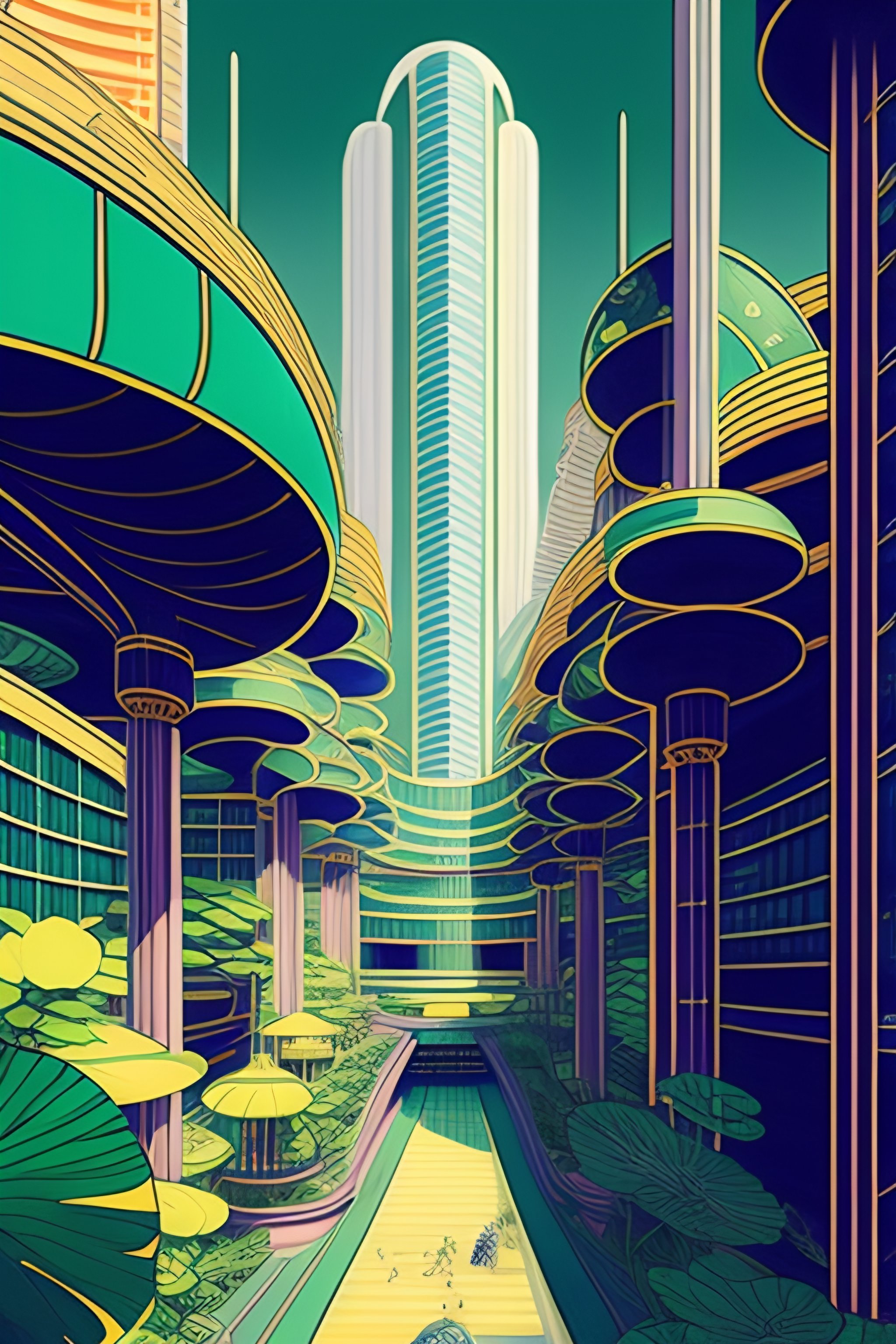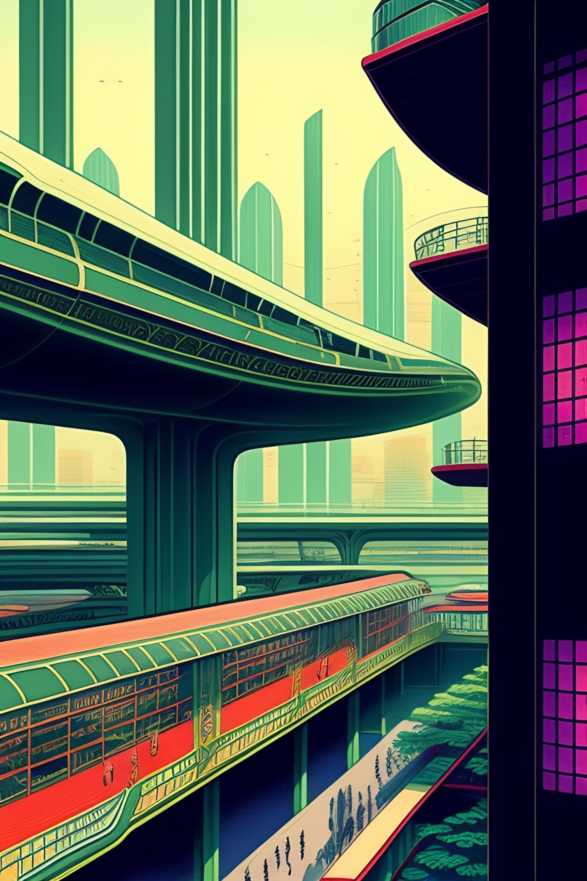 Art deco art nouveau ukiyo-e solarpunk futurisitc city with high speed rail, lots of people and lots of plants