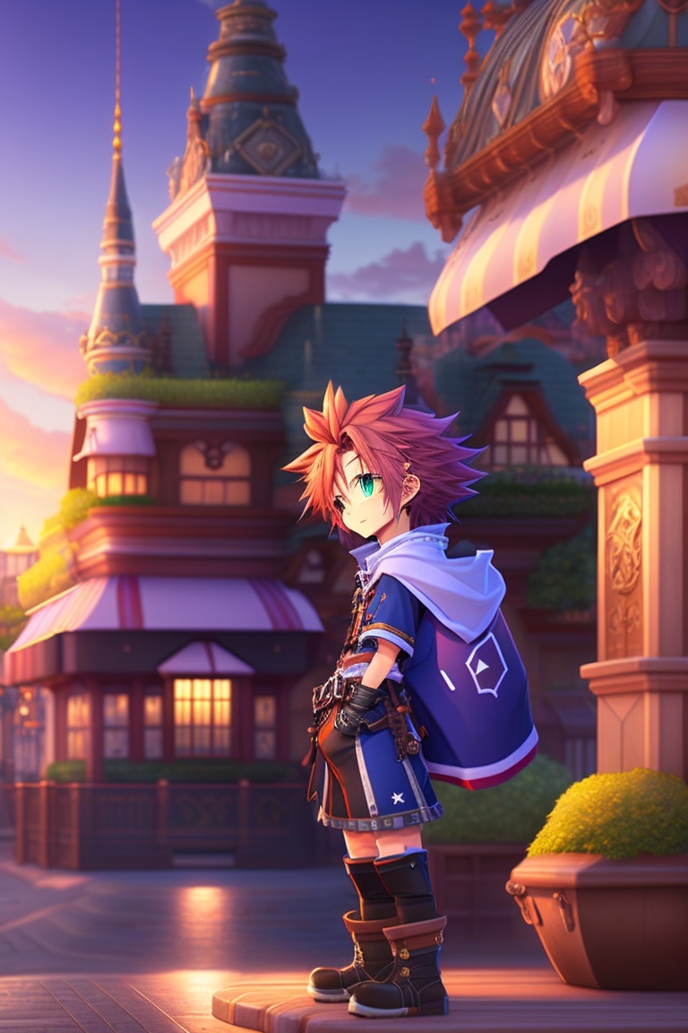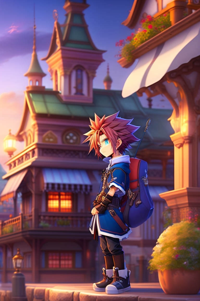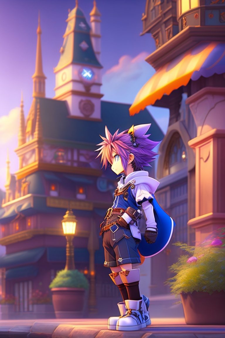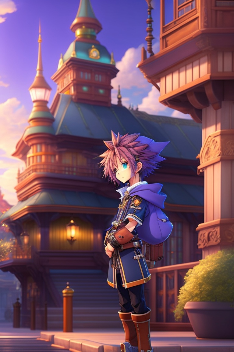 Kingdom hearts 2, sora, anime key visual, kingdom key, pose, background twilight town, professional photo