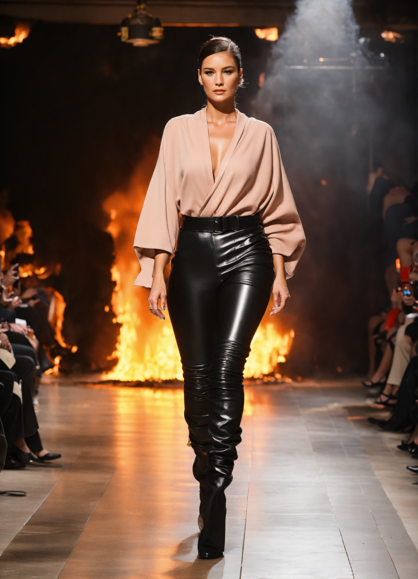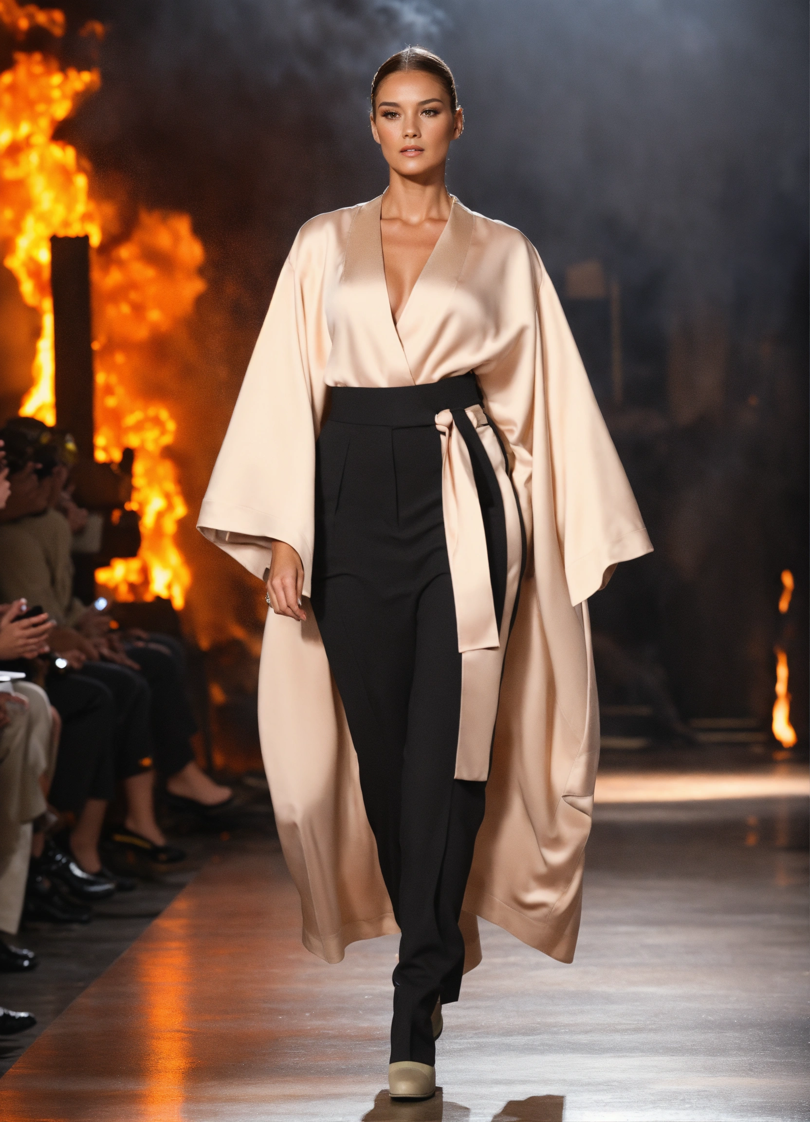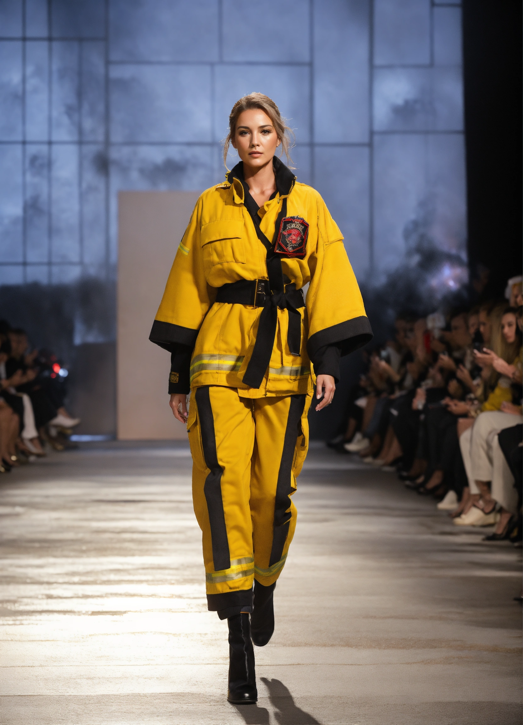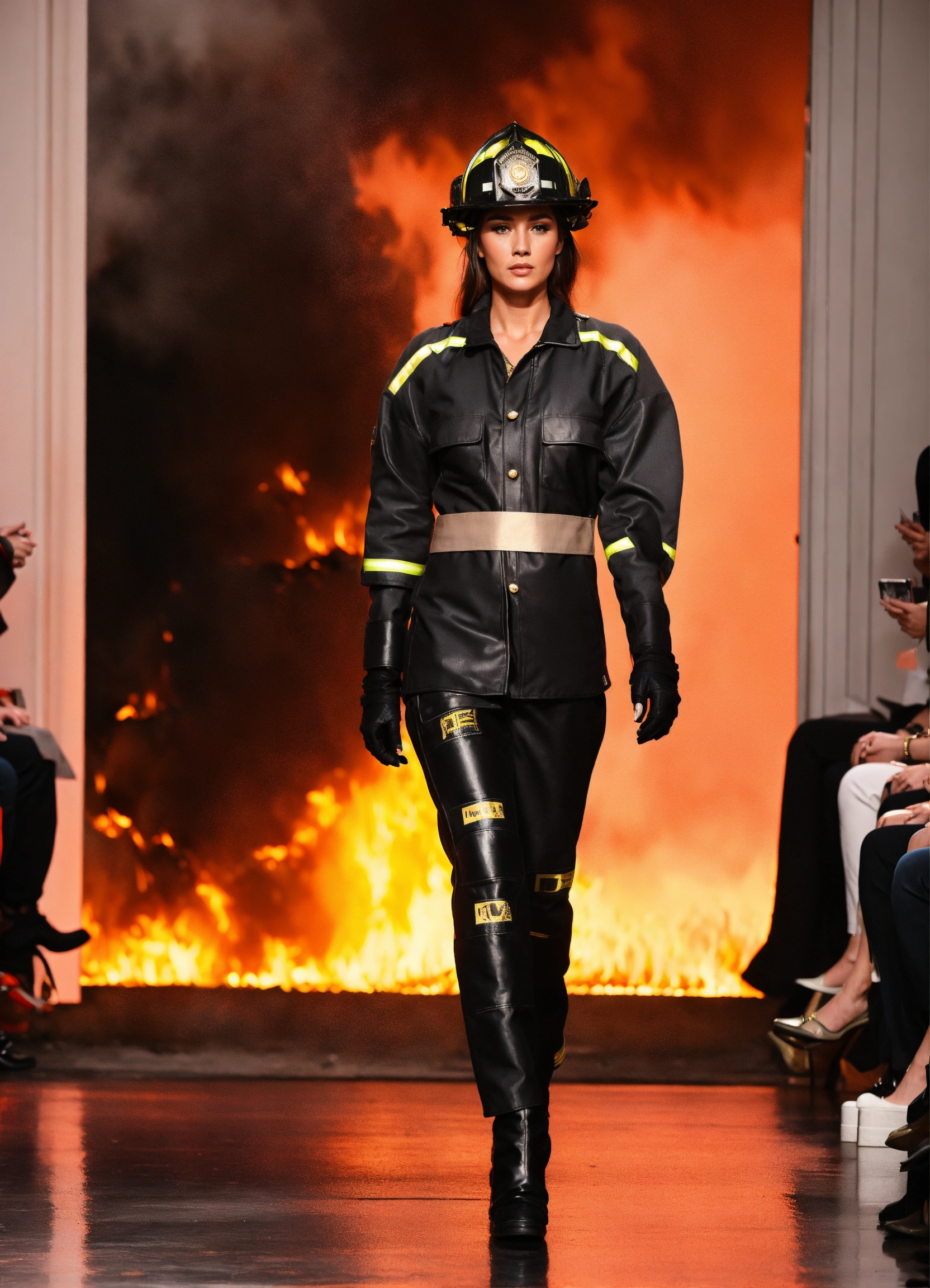 3d realistic photo of female firefighter walking runway during first responder fashion week wearing dolman sleeve donna karan firemen fashion in black, white, blush, grey, beige, stone, gold in a burning house