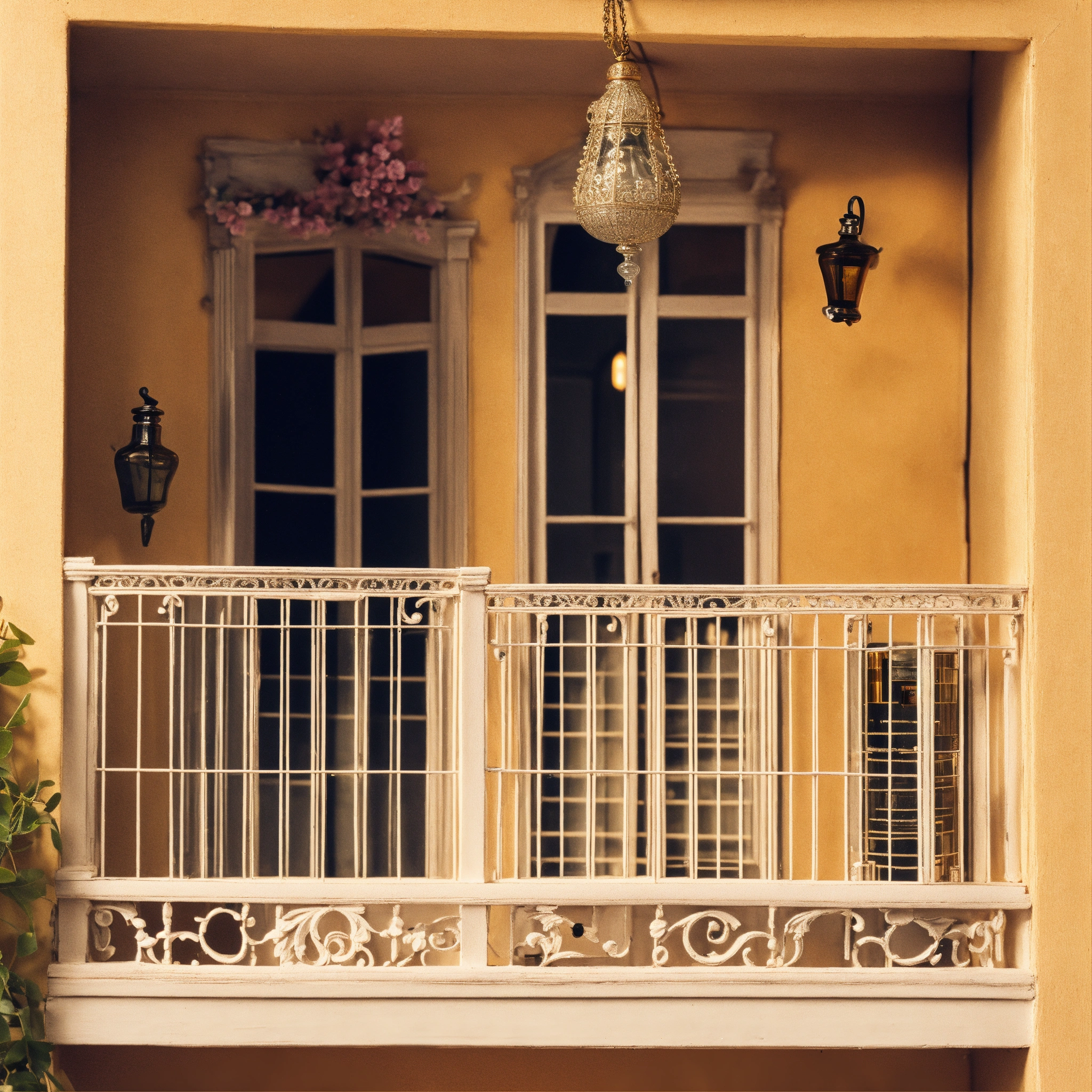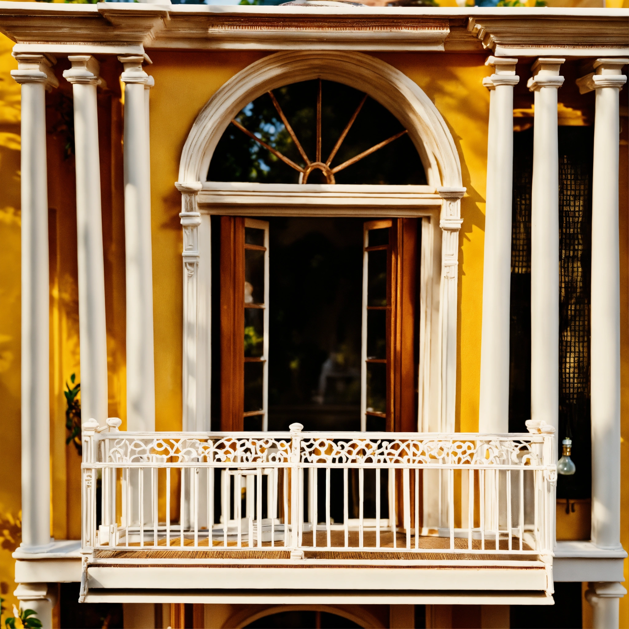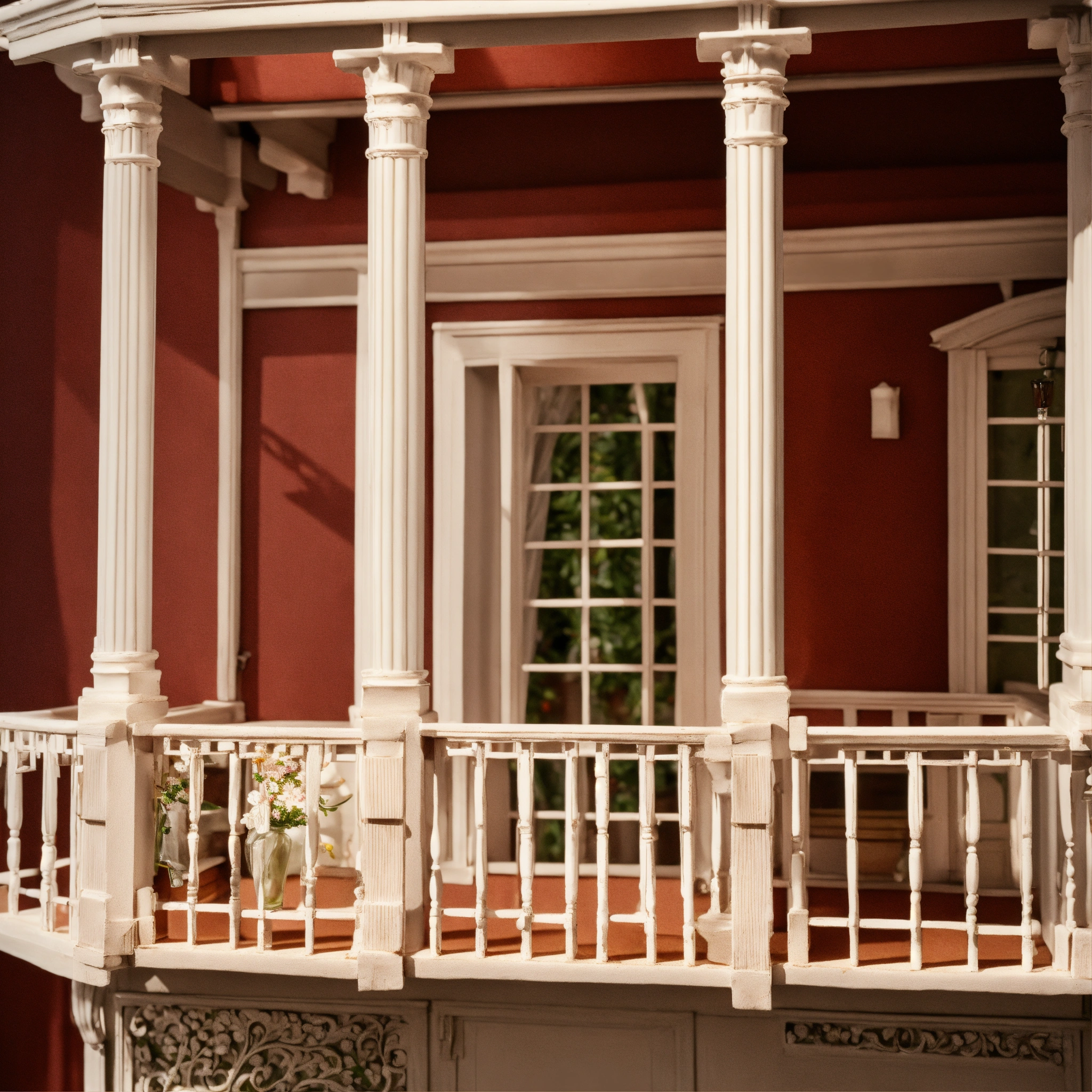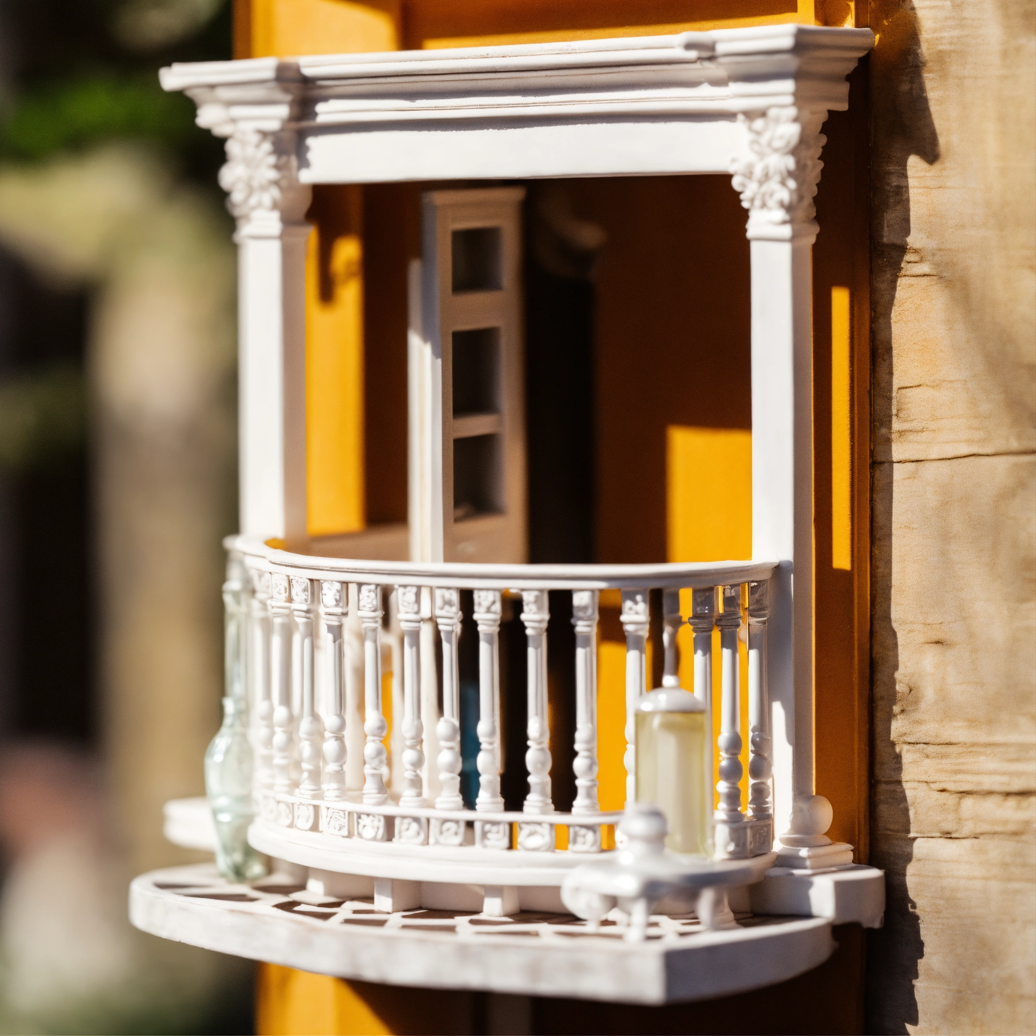 A white classical style doll house balcony with a bottle perfume in