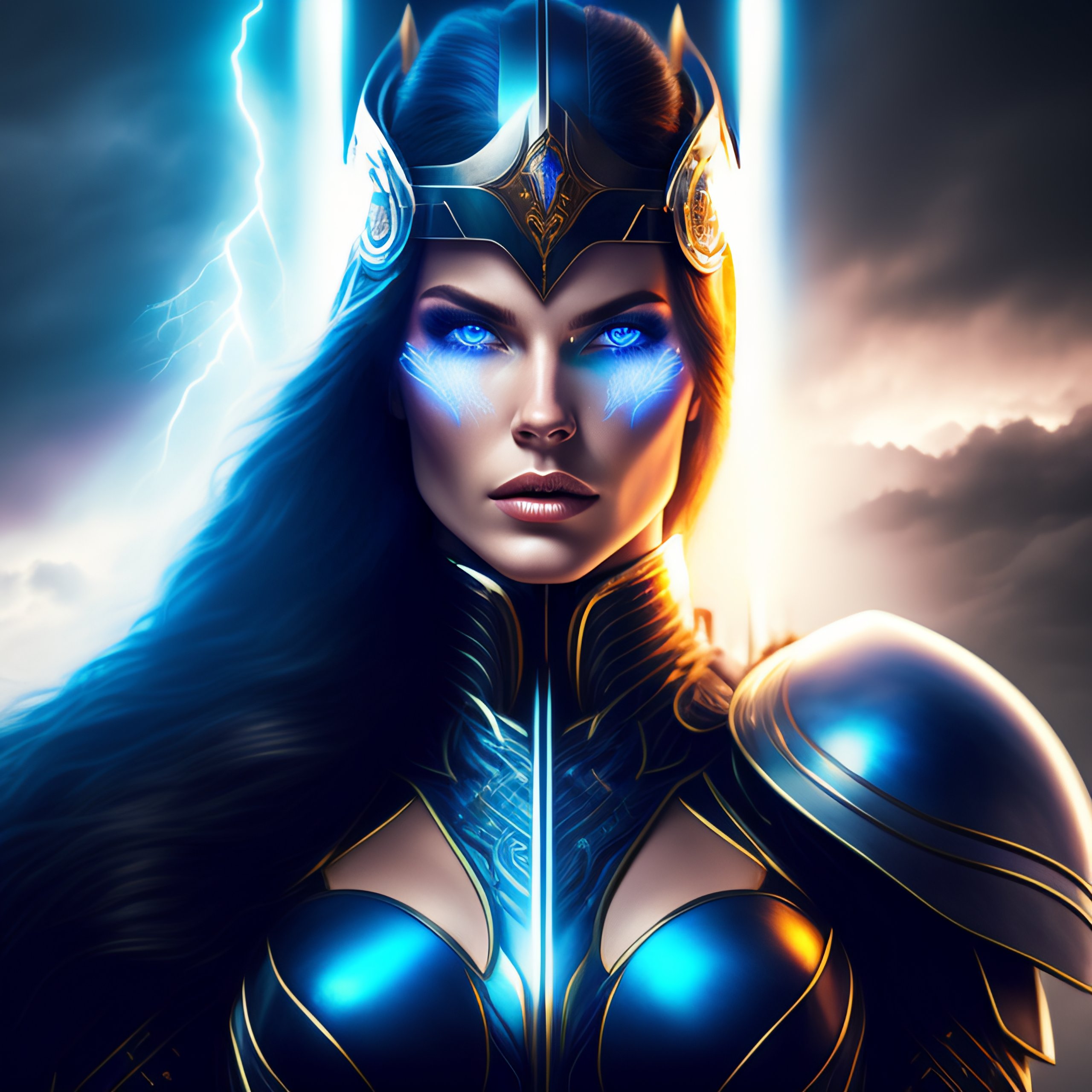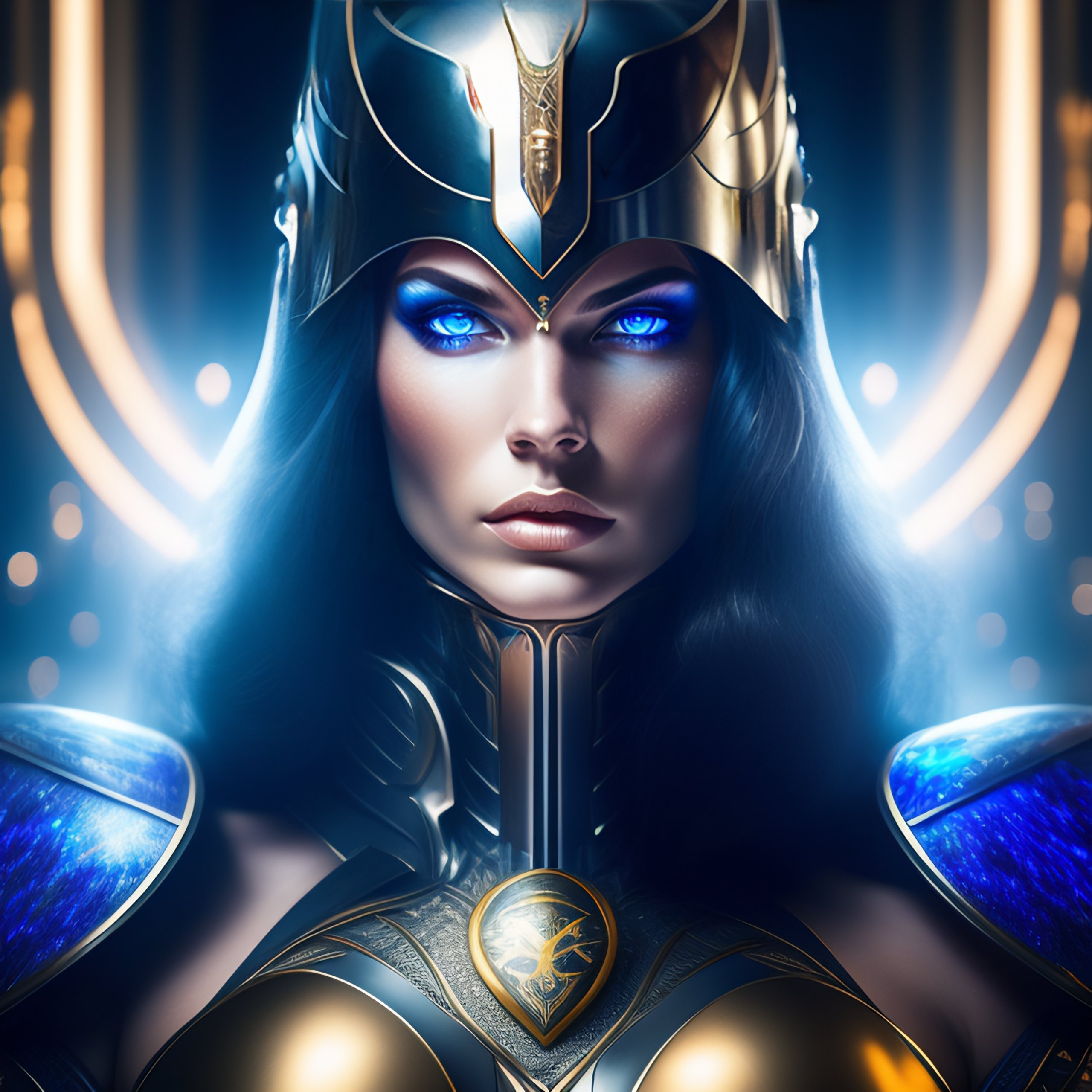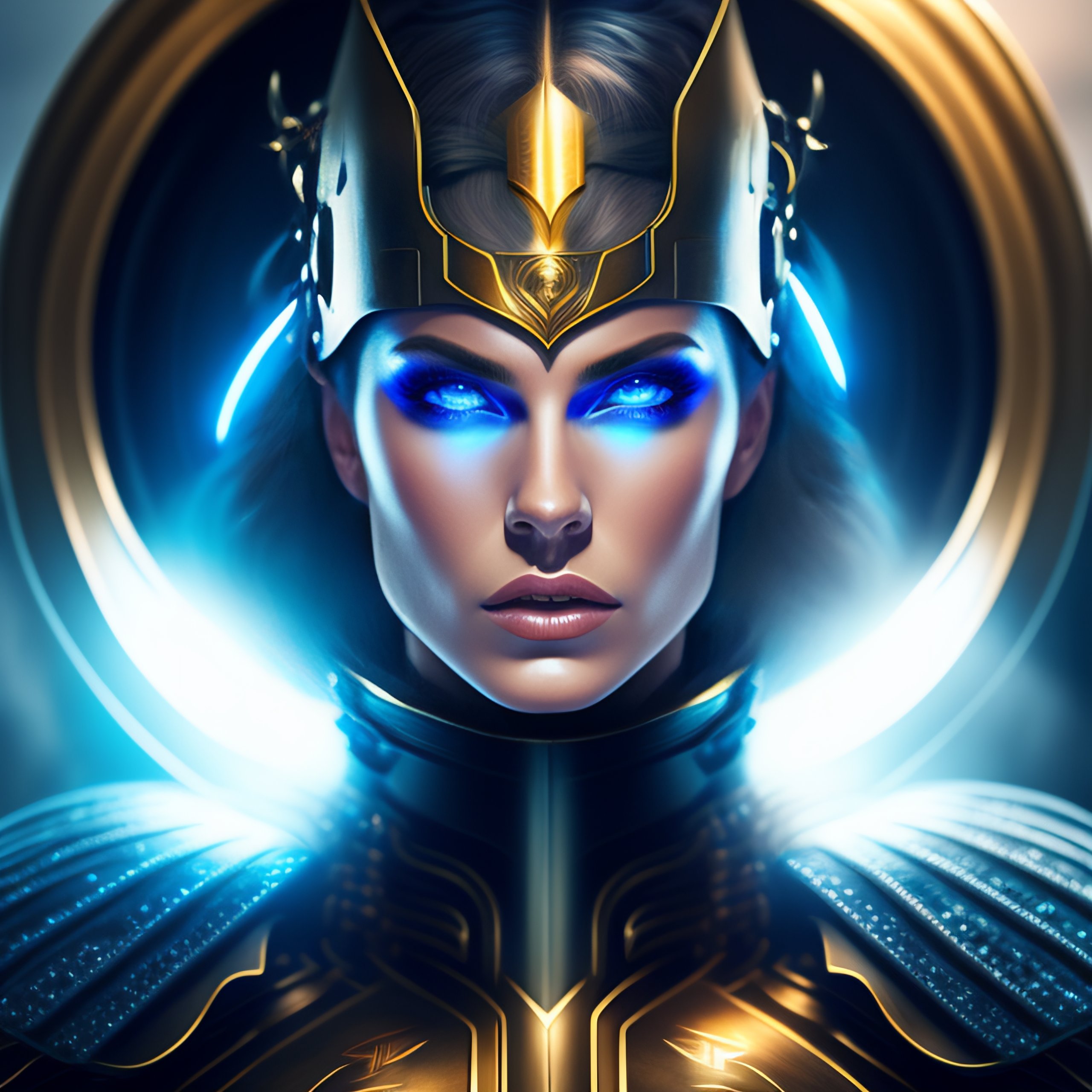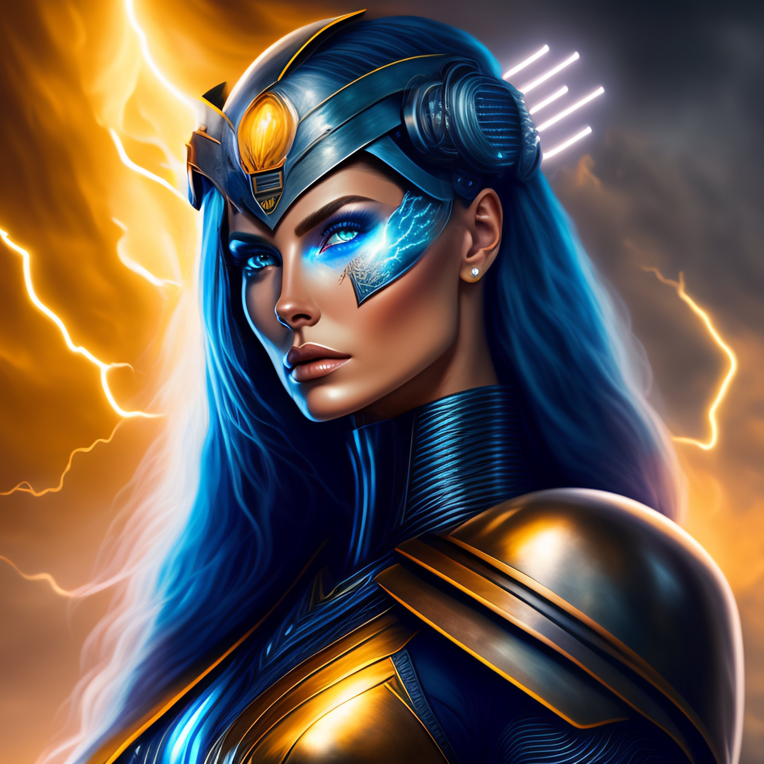 An symbolic portrait of a cyborg lady of justice with lightning blue eyes