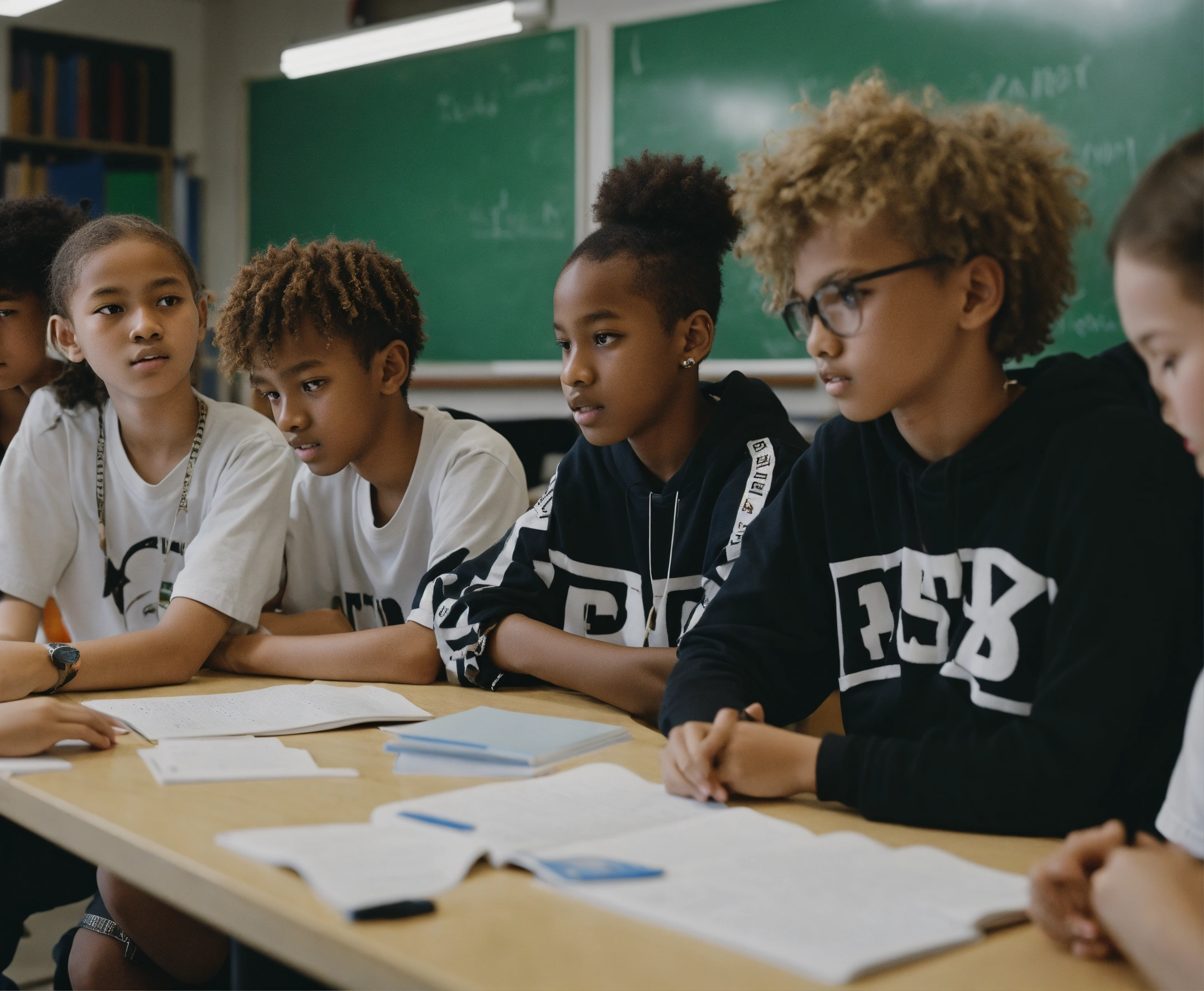 Group of white kids 12 years old learners, in class, discussing a case study, 8k resolution, hyper-realistic, mid-day, 35mm film, editorial, by virgil abloh