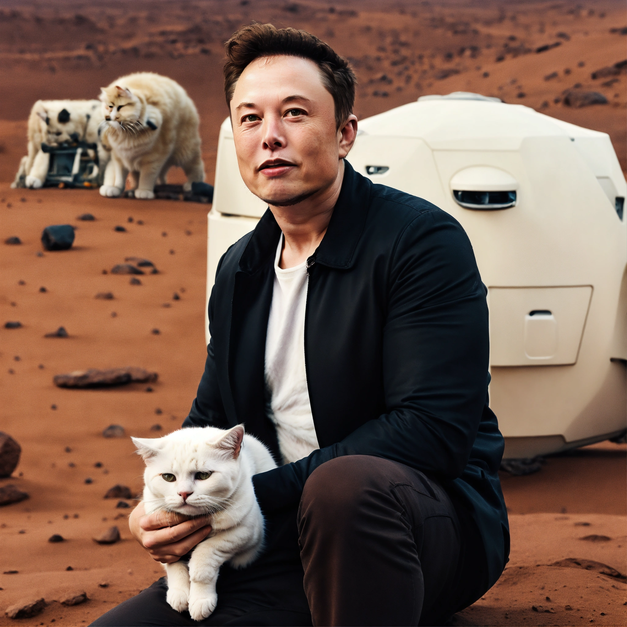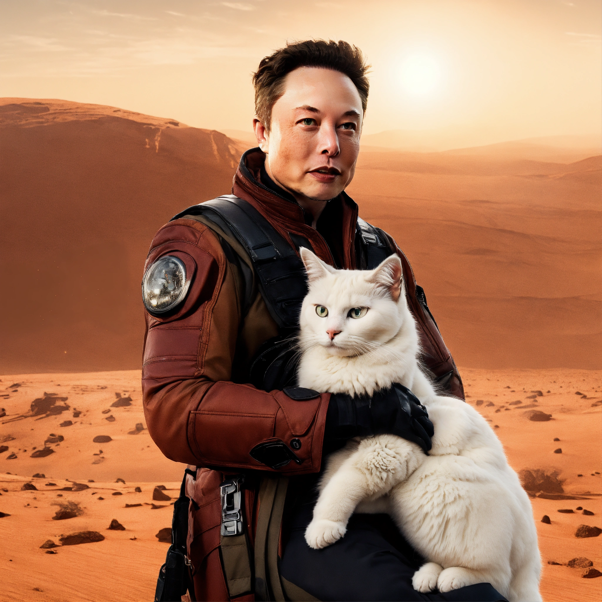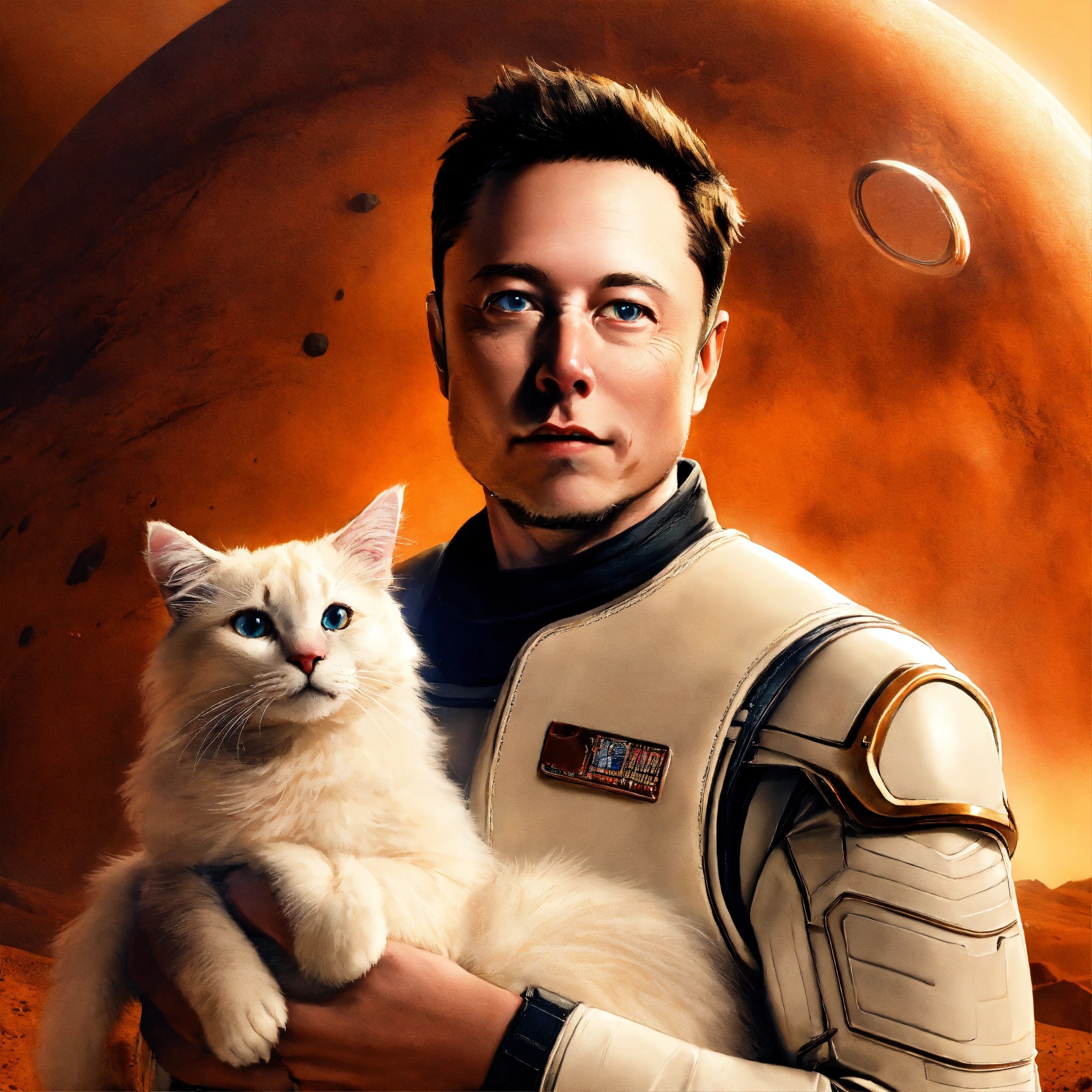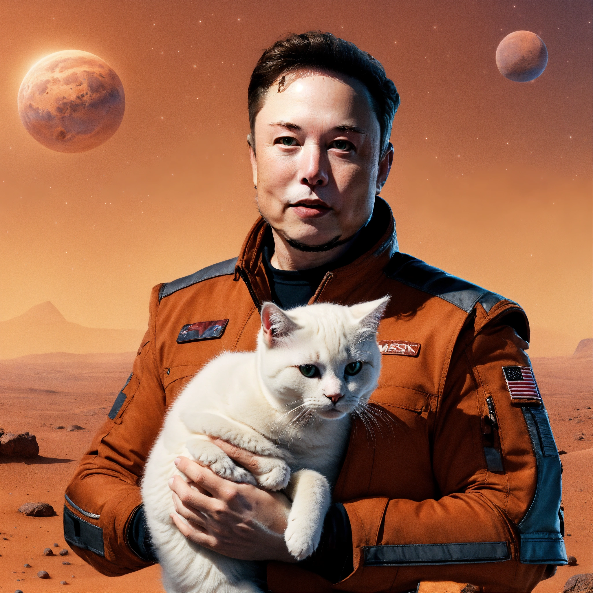 Elon musk holding a white cat with some blonde fur in mars