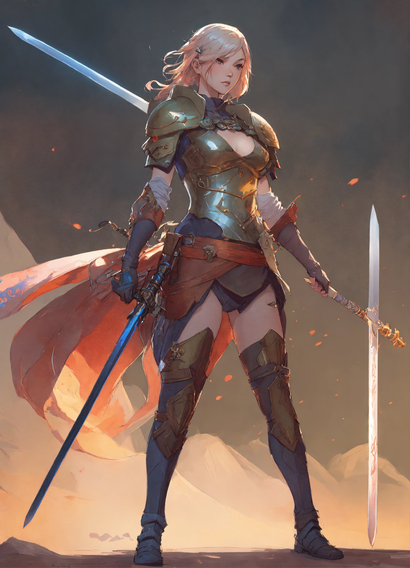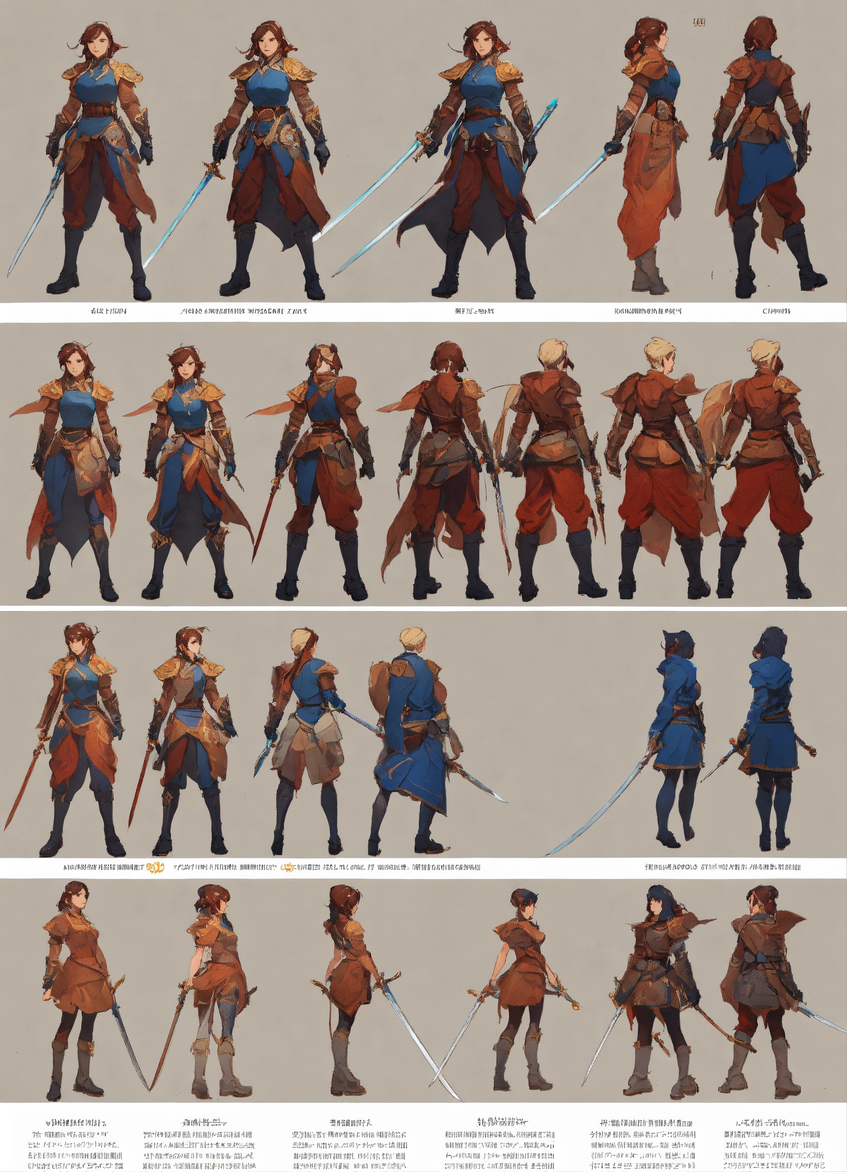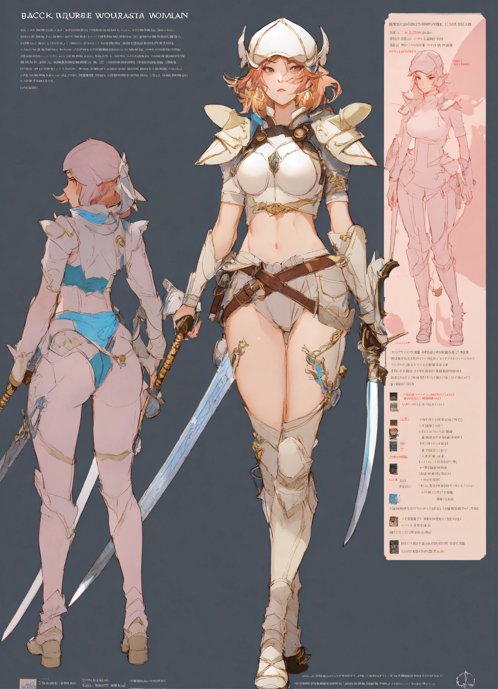 Back double sword woman warrior, character sheet, character design, chart, reference sheet, multiple views, high detail, fine details, concept art, rossdraws, james jean, sakimichan, moebius, stanley artgerm lau, jayison devadas, phuoc quan, studio ghibli