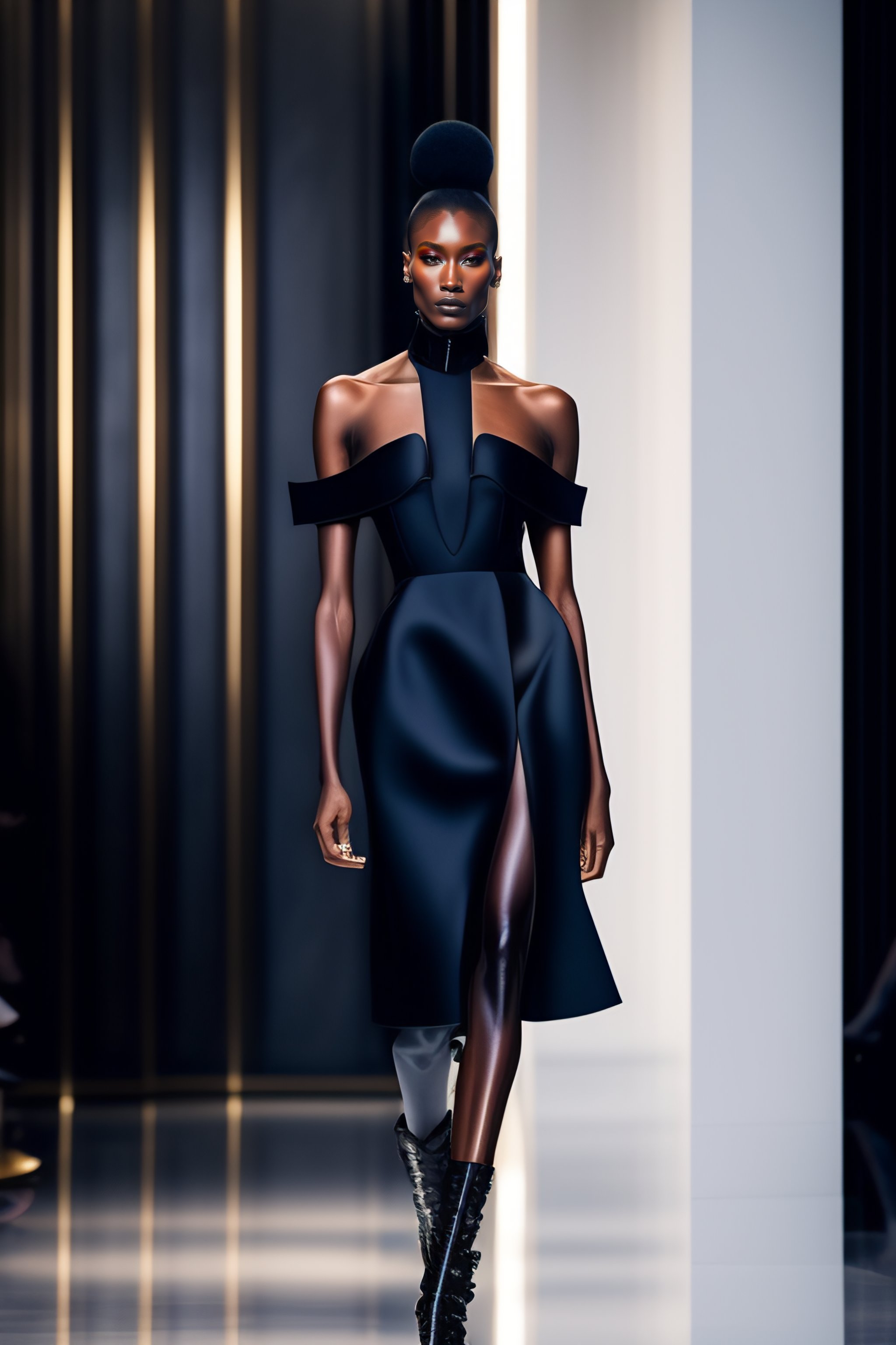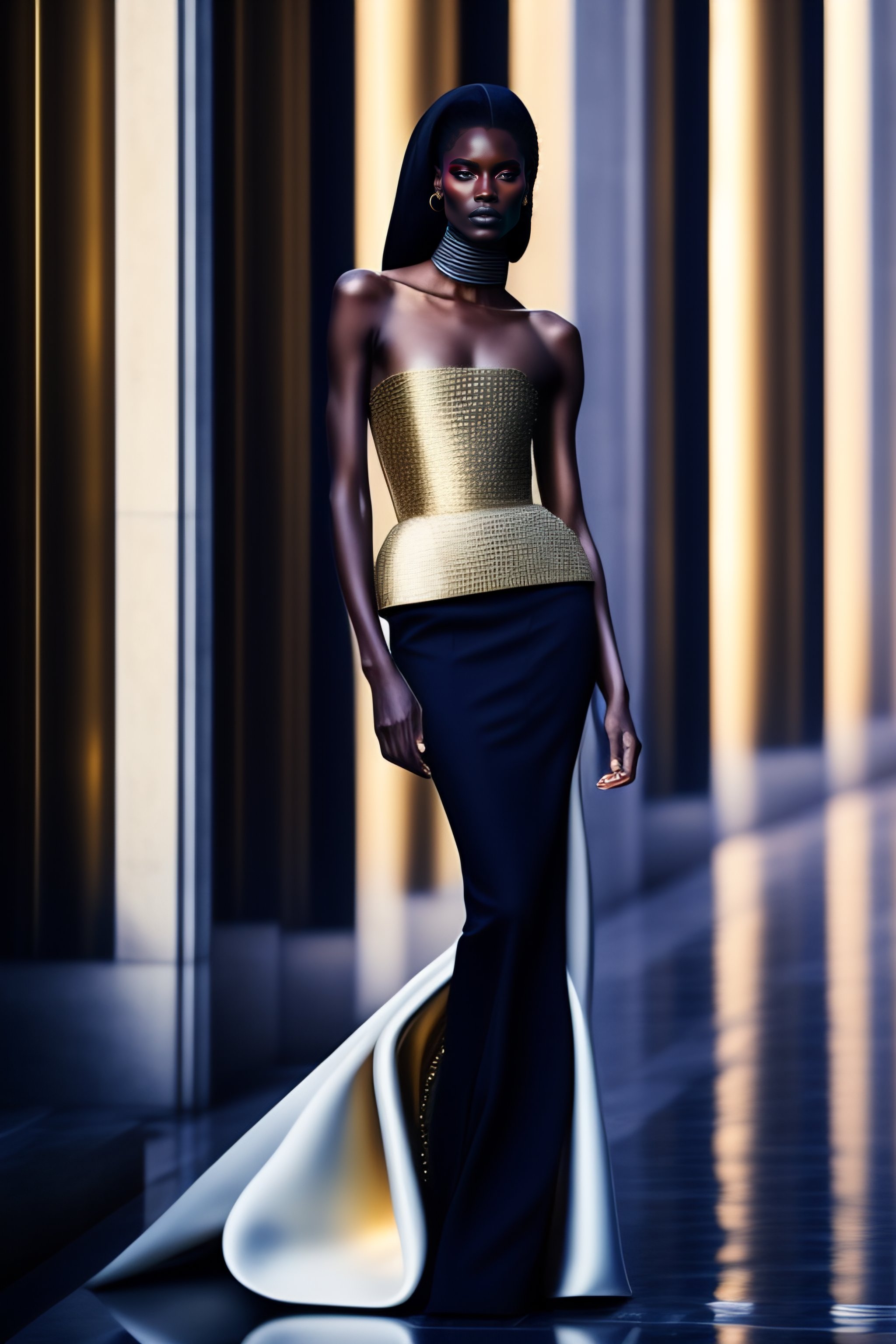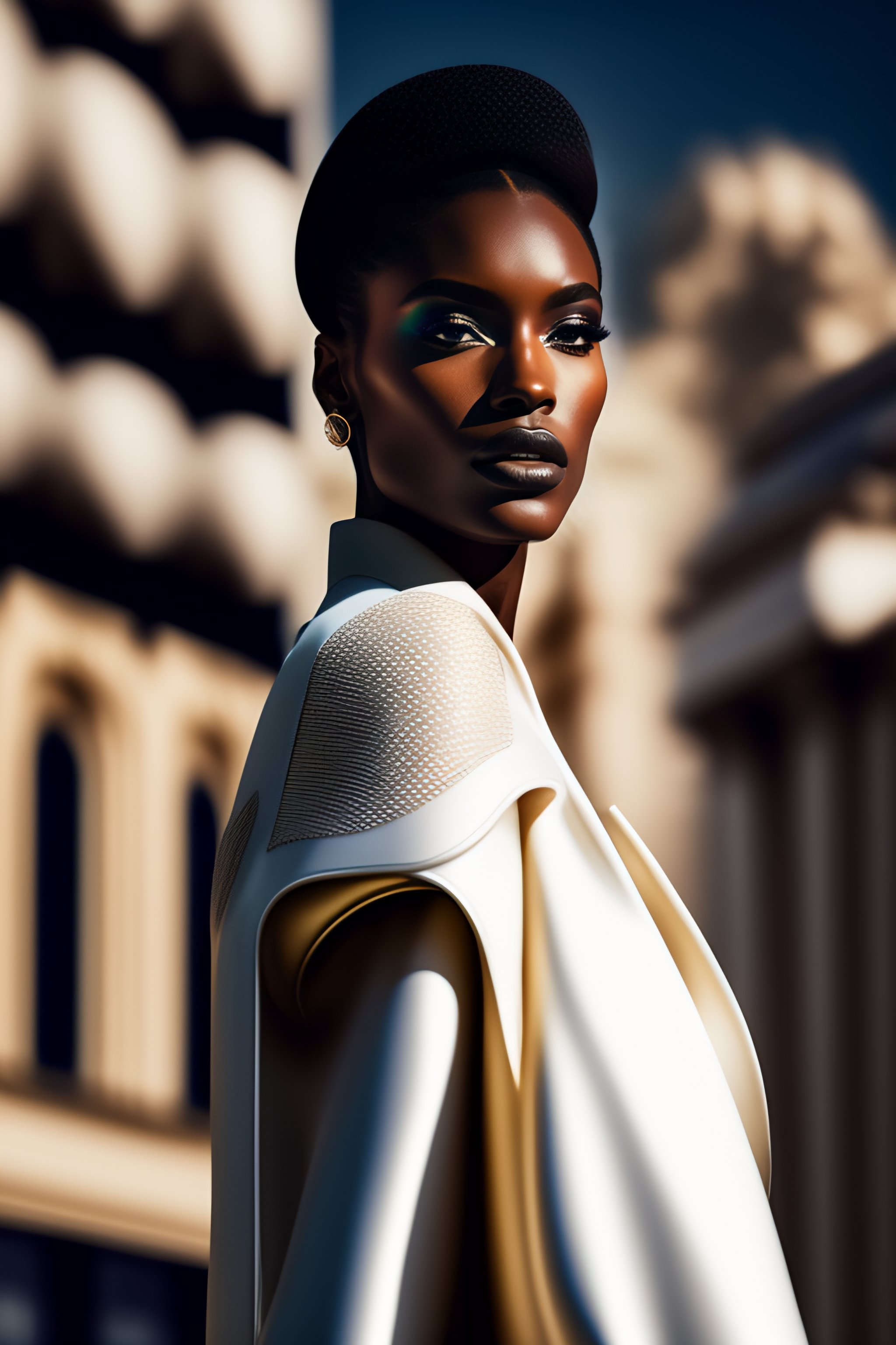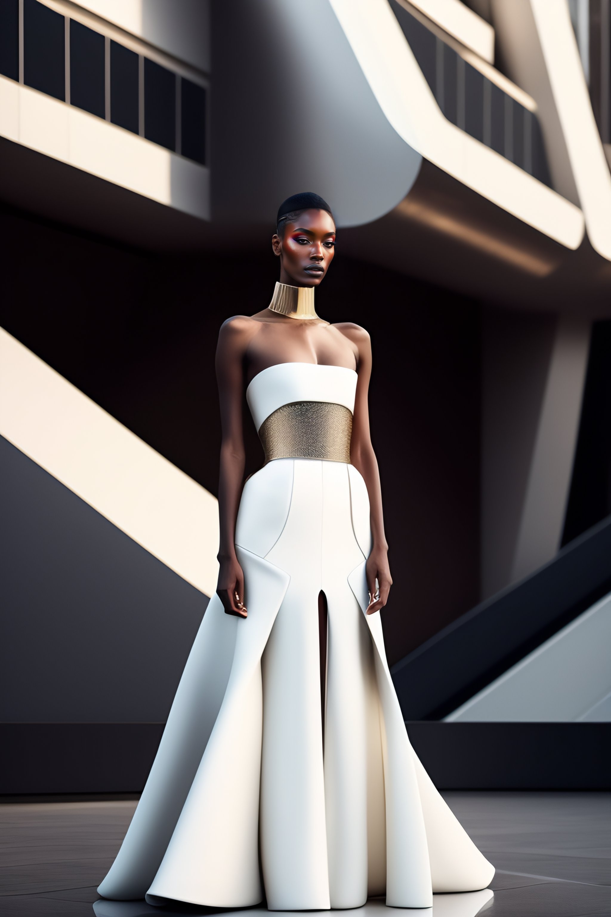 Haute couture fashion model in the style of balenciaga in front of luxury building by zaha hadid
