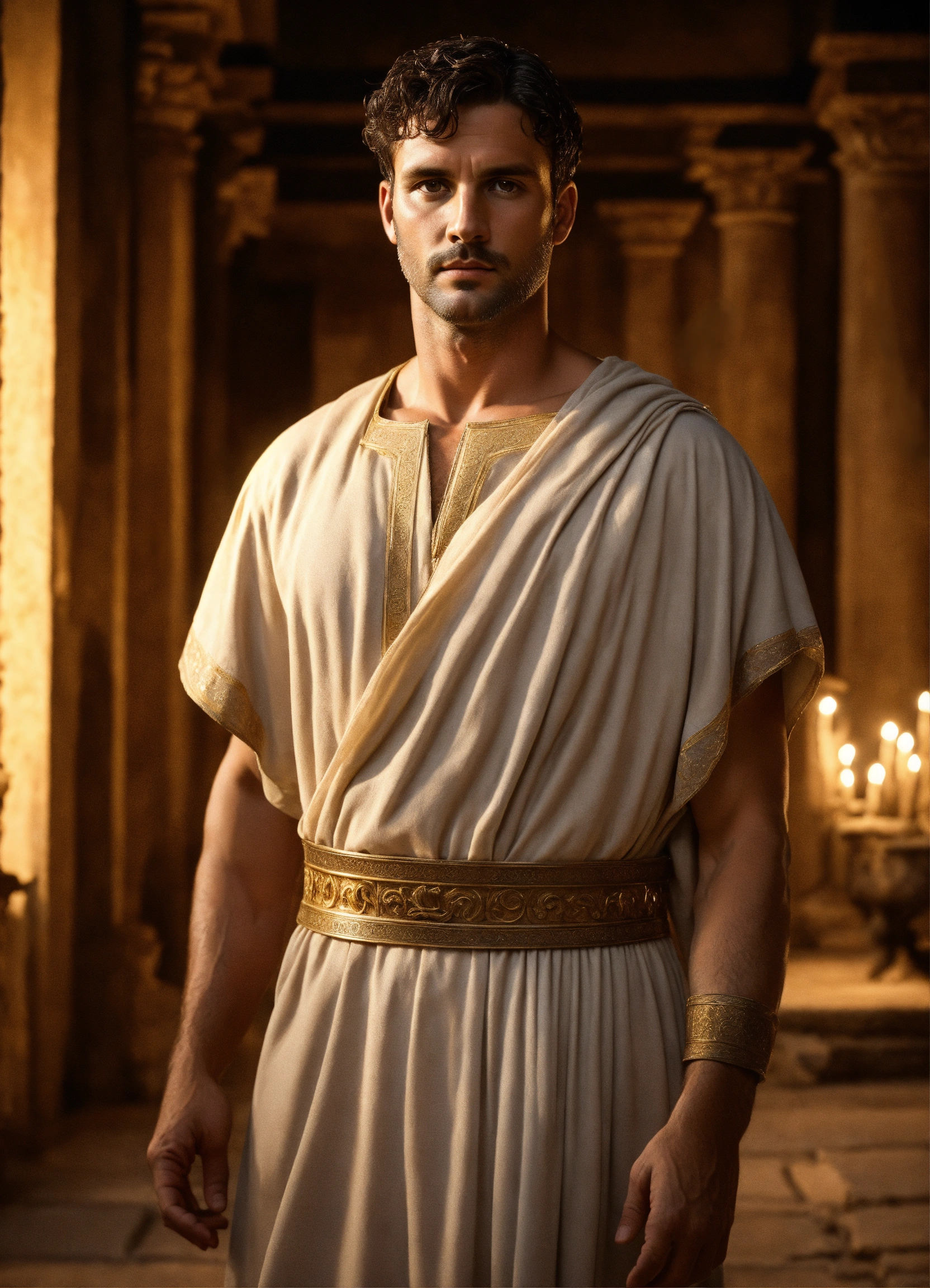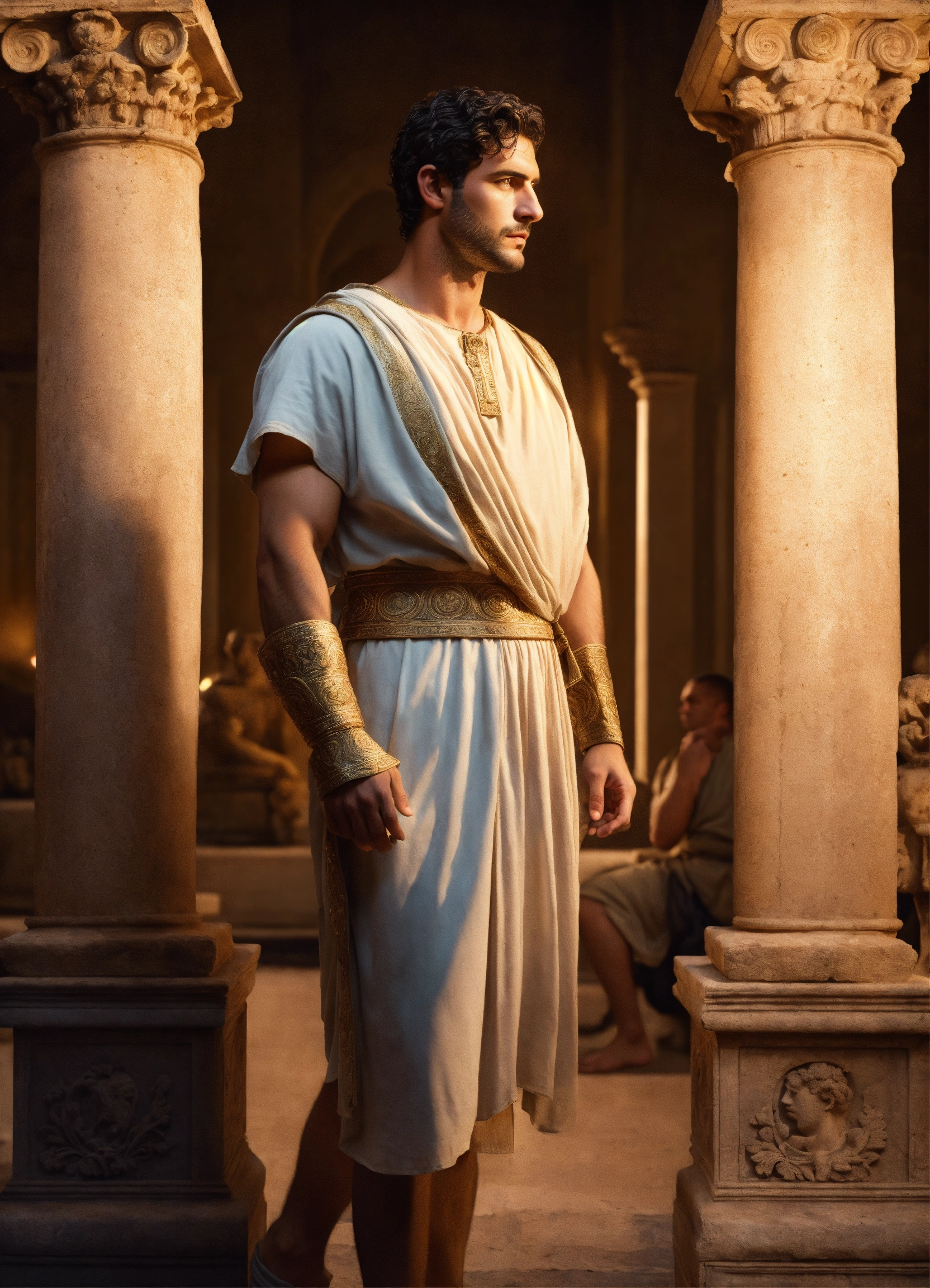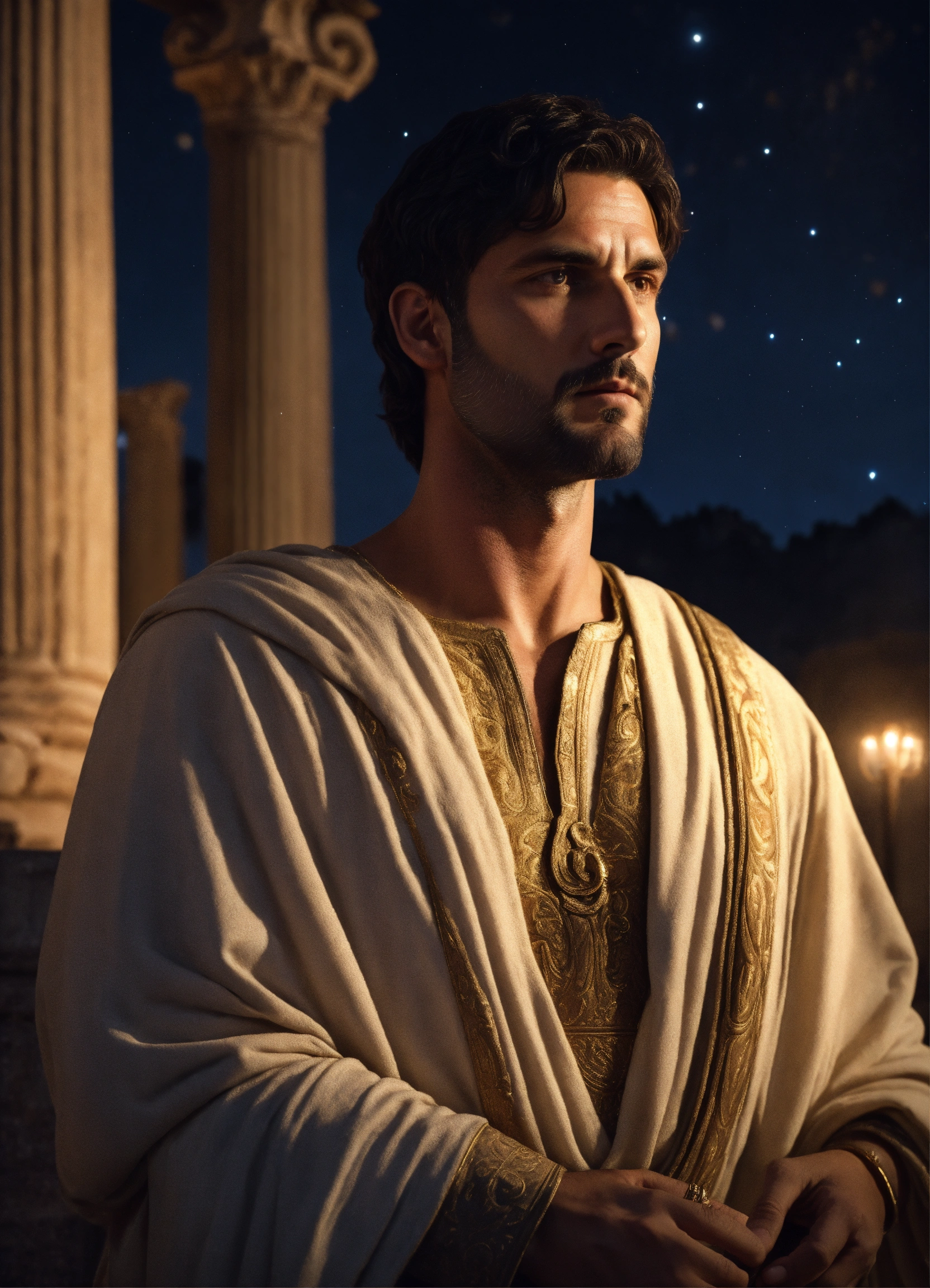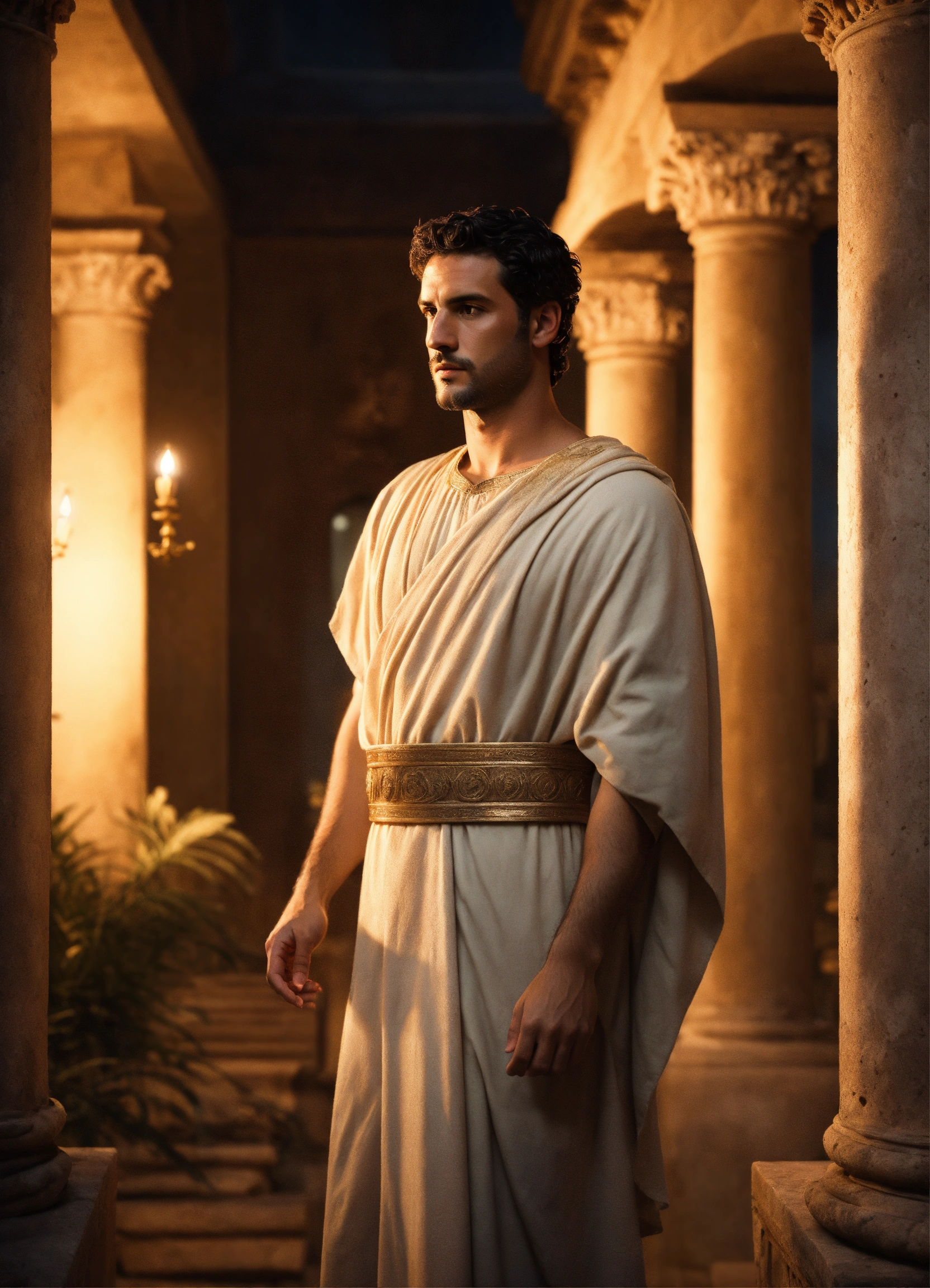 A young rich handsome roman man wearing a light-colored tunic, smart, solemn, 40 years old, dark-haired, charismatic, ancient rome, in his luxurious pompeian villa, detailed decor, at night, photorealistic, hyperdetailed, 8k